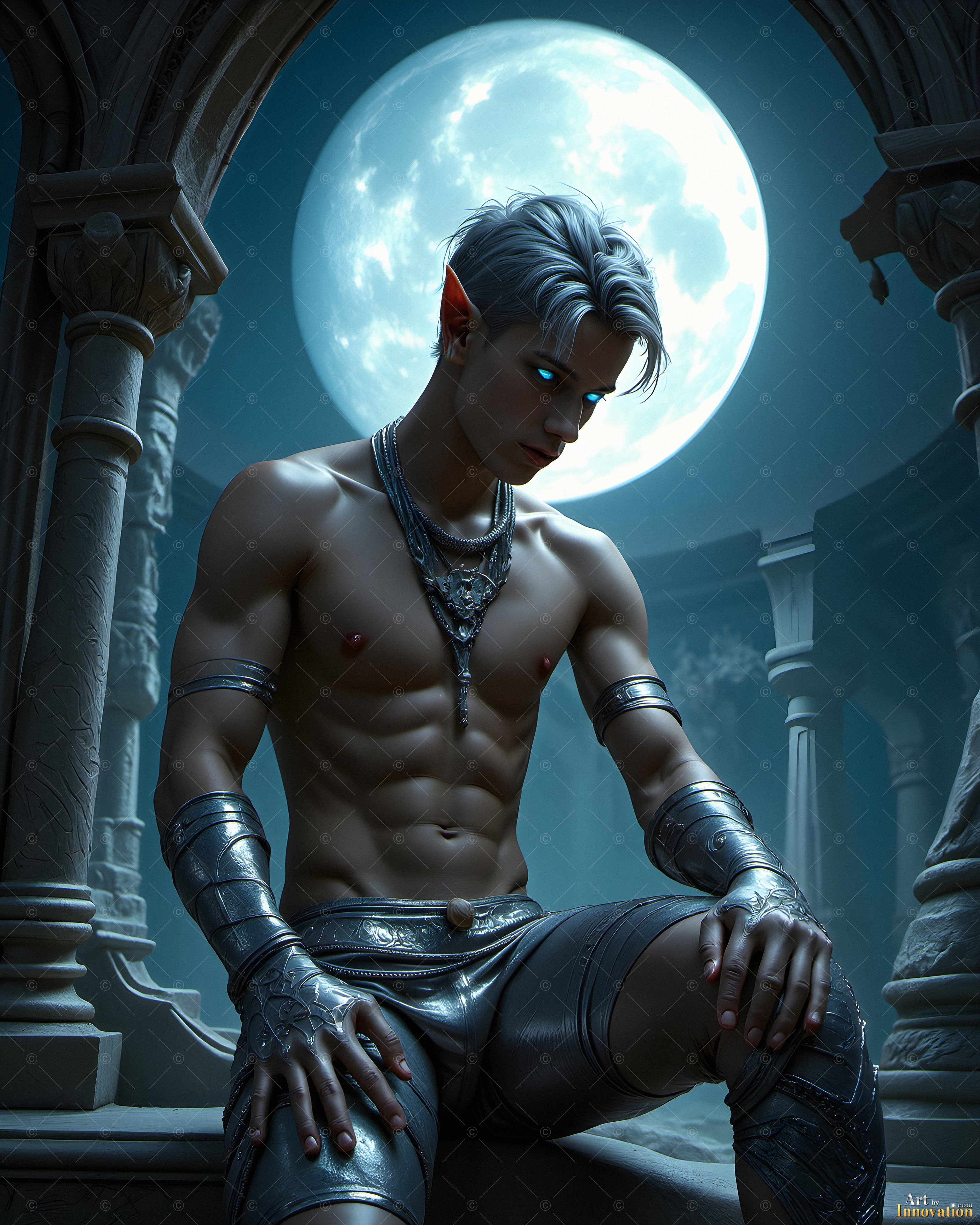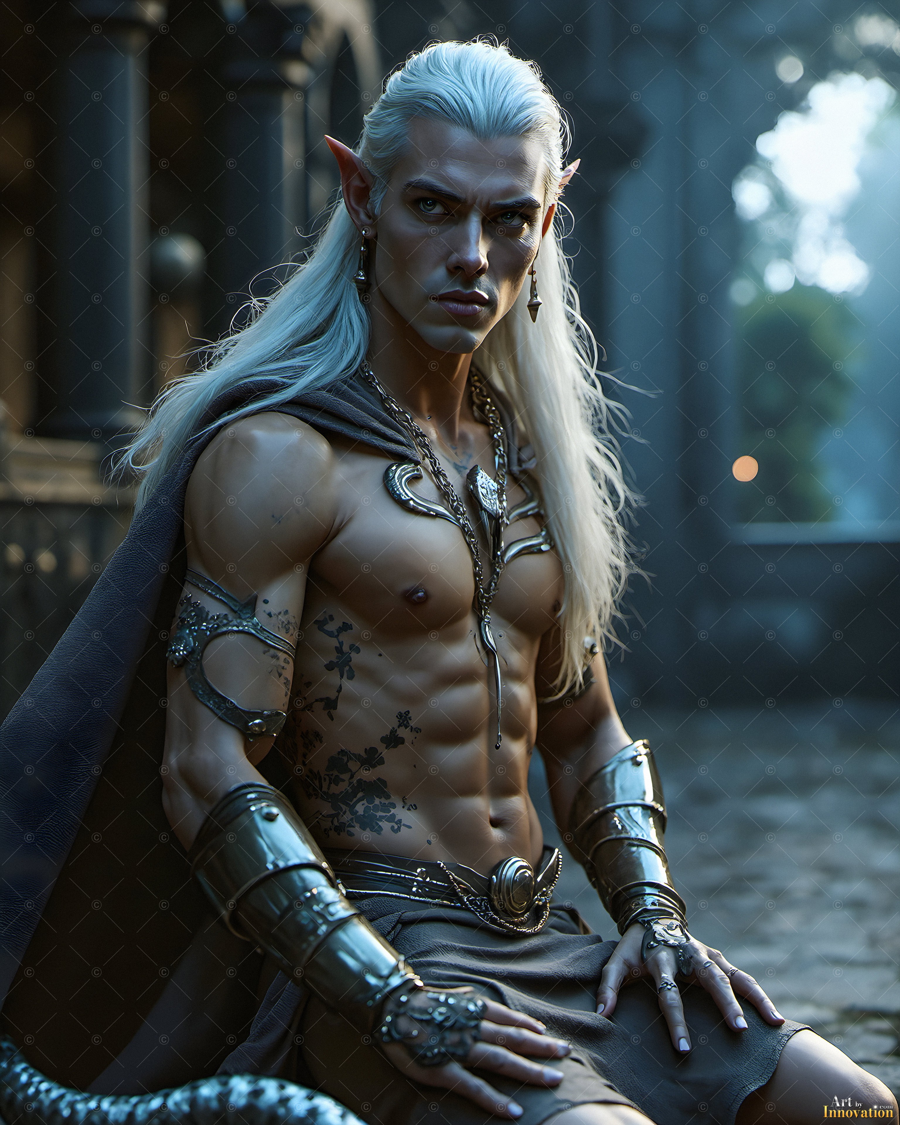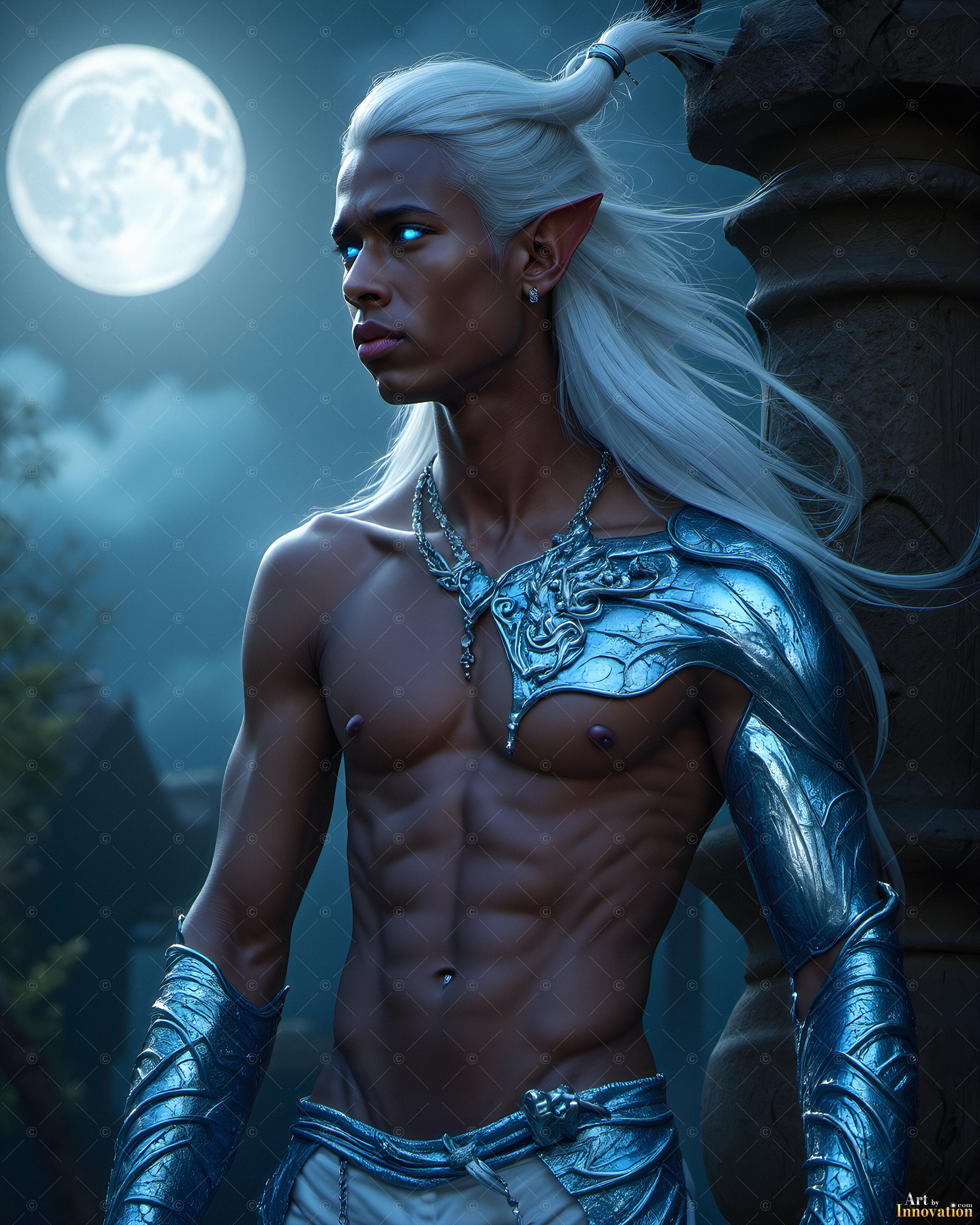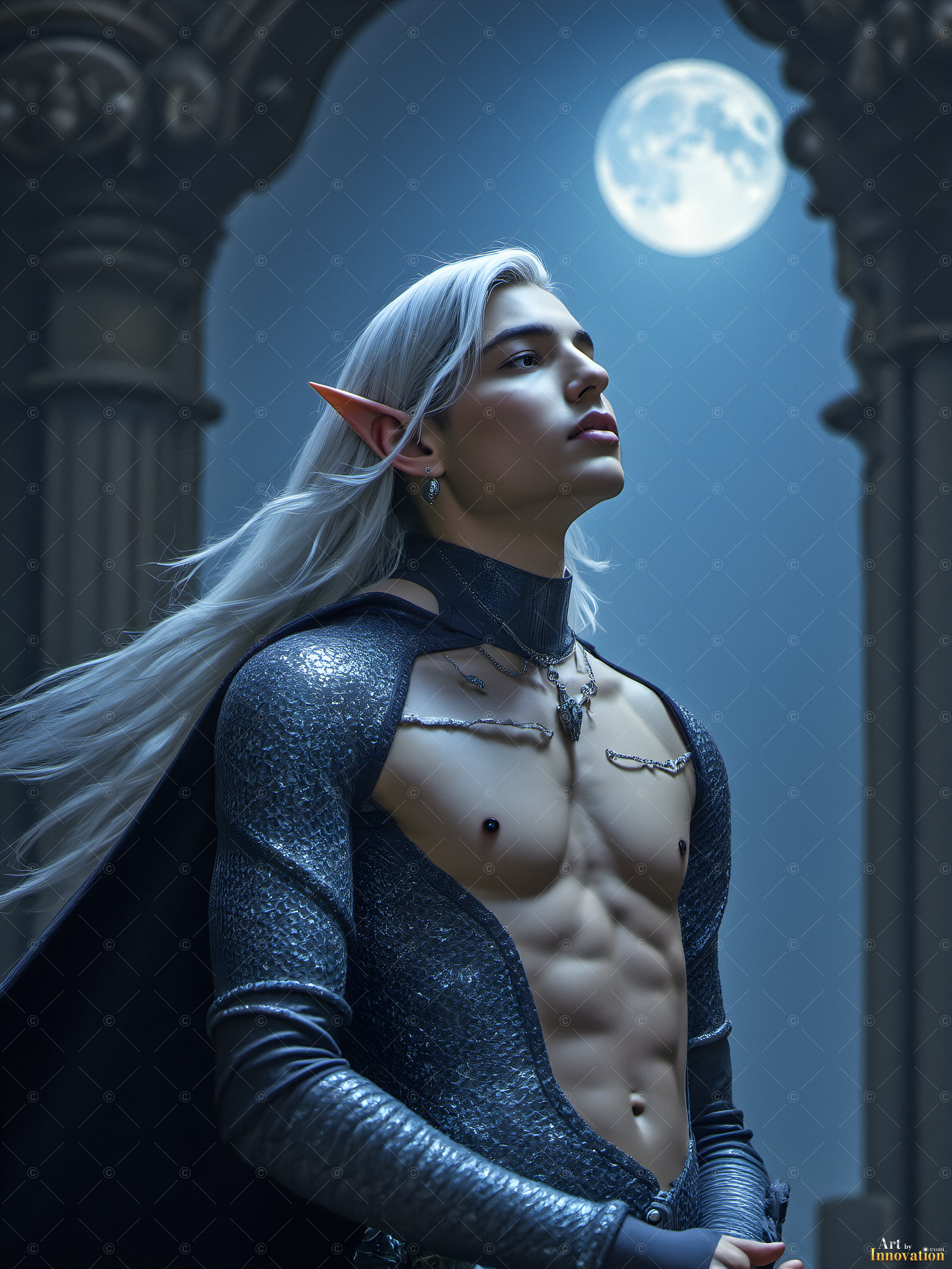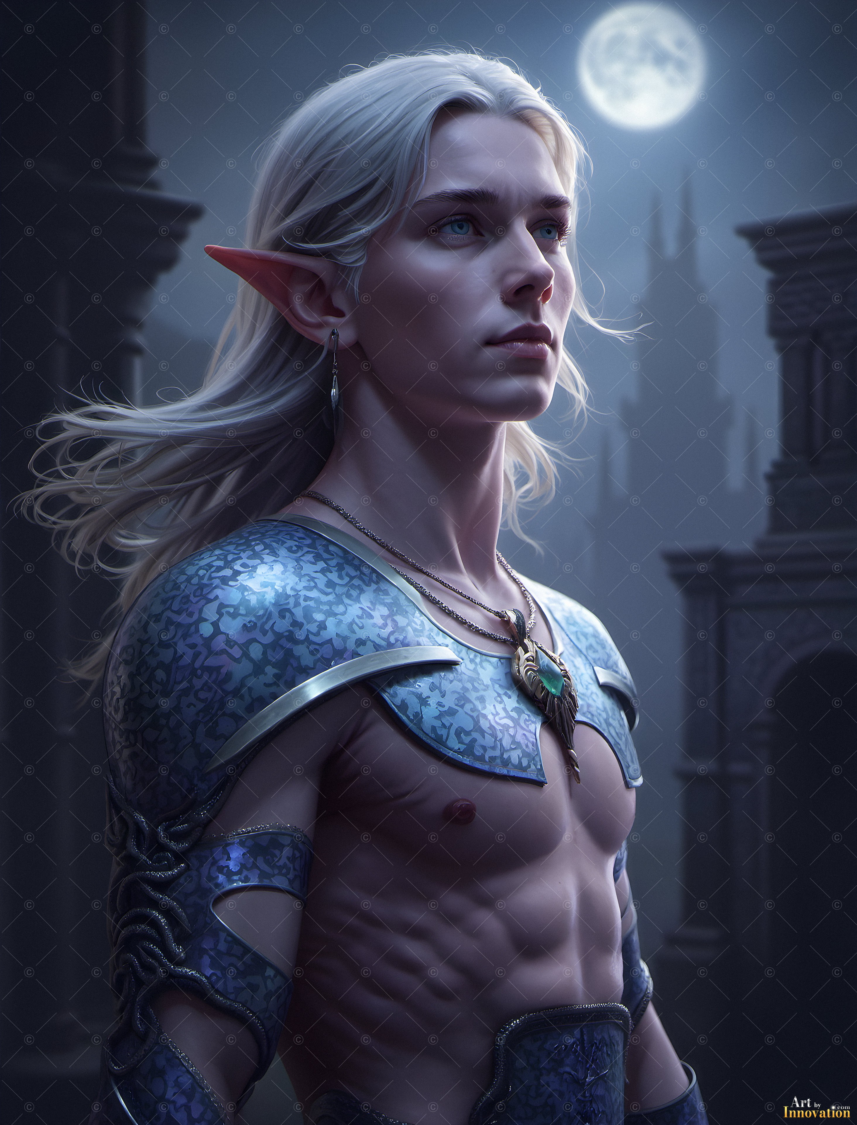 Handsome Male Elves, majestic young male elf standing in an elaborate elven background, in a dark ethereal realm. With pointed ears, wearing glamorous, luxurious, and fierce outfits is an Elven city, full of handsome, and sexy, shirtless elf men, that are adorned with shimmering, iridescent armor.