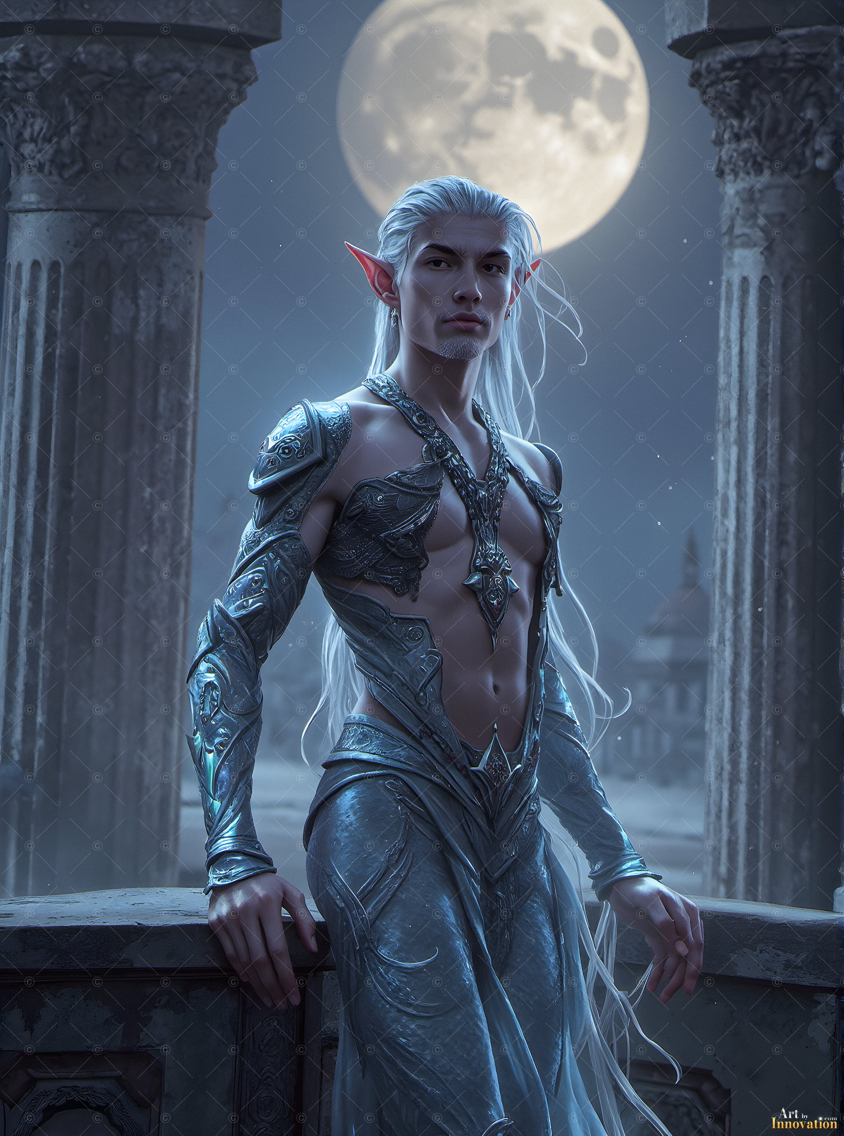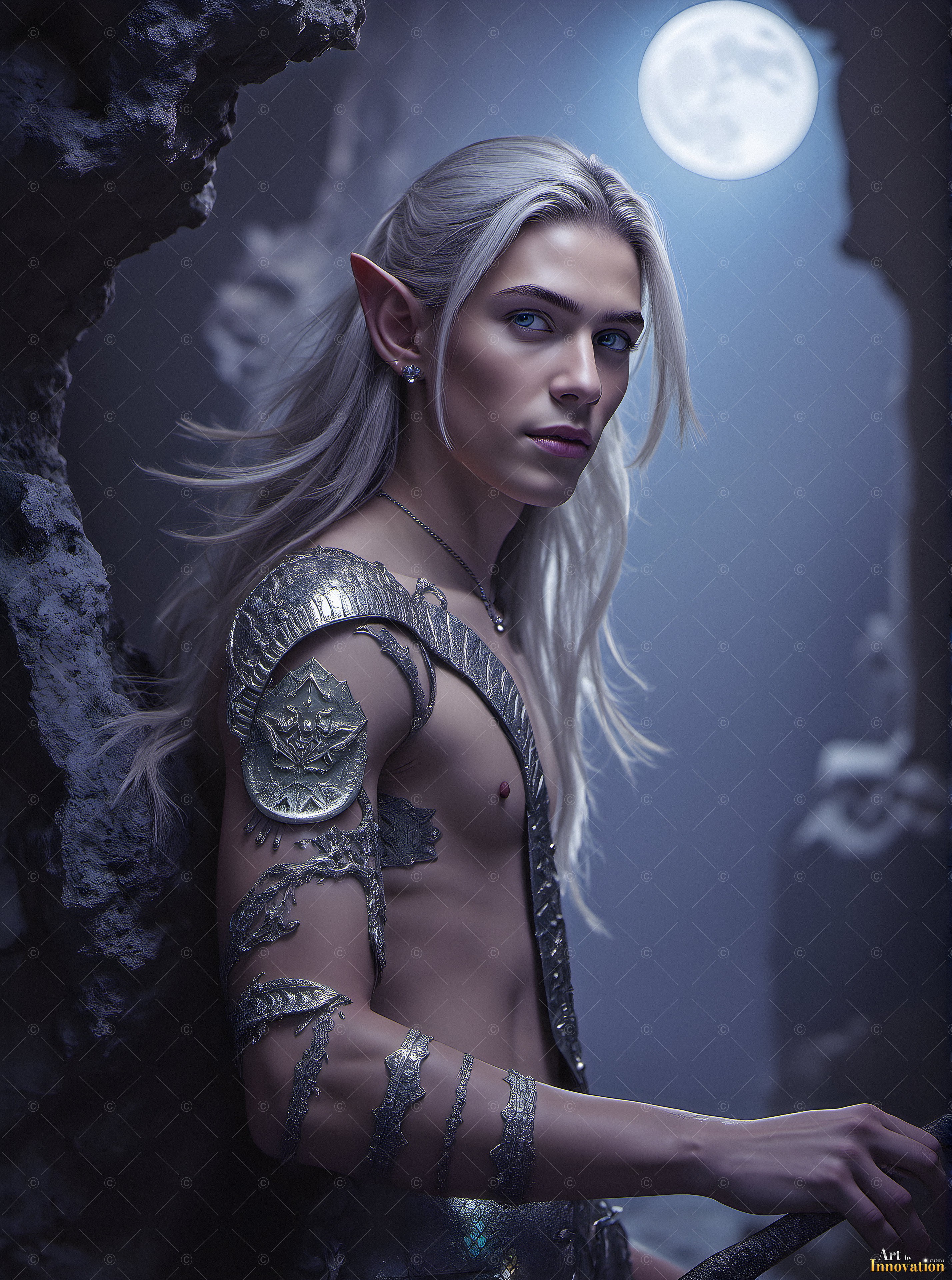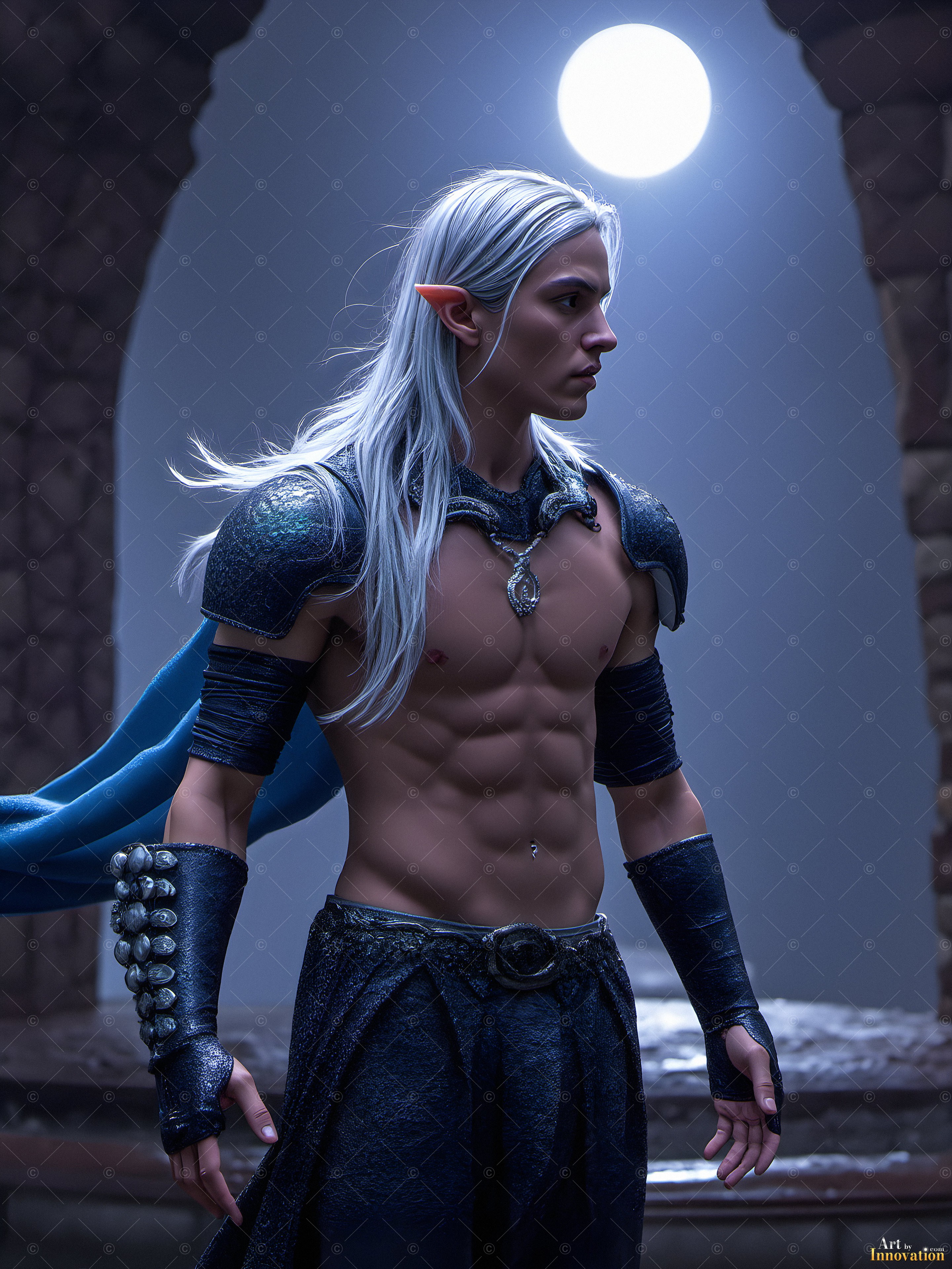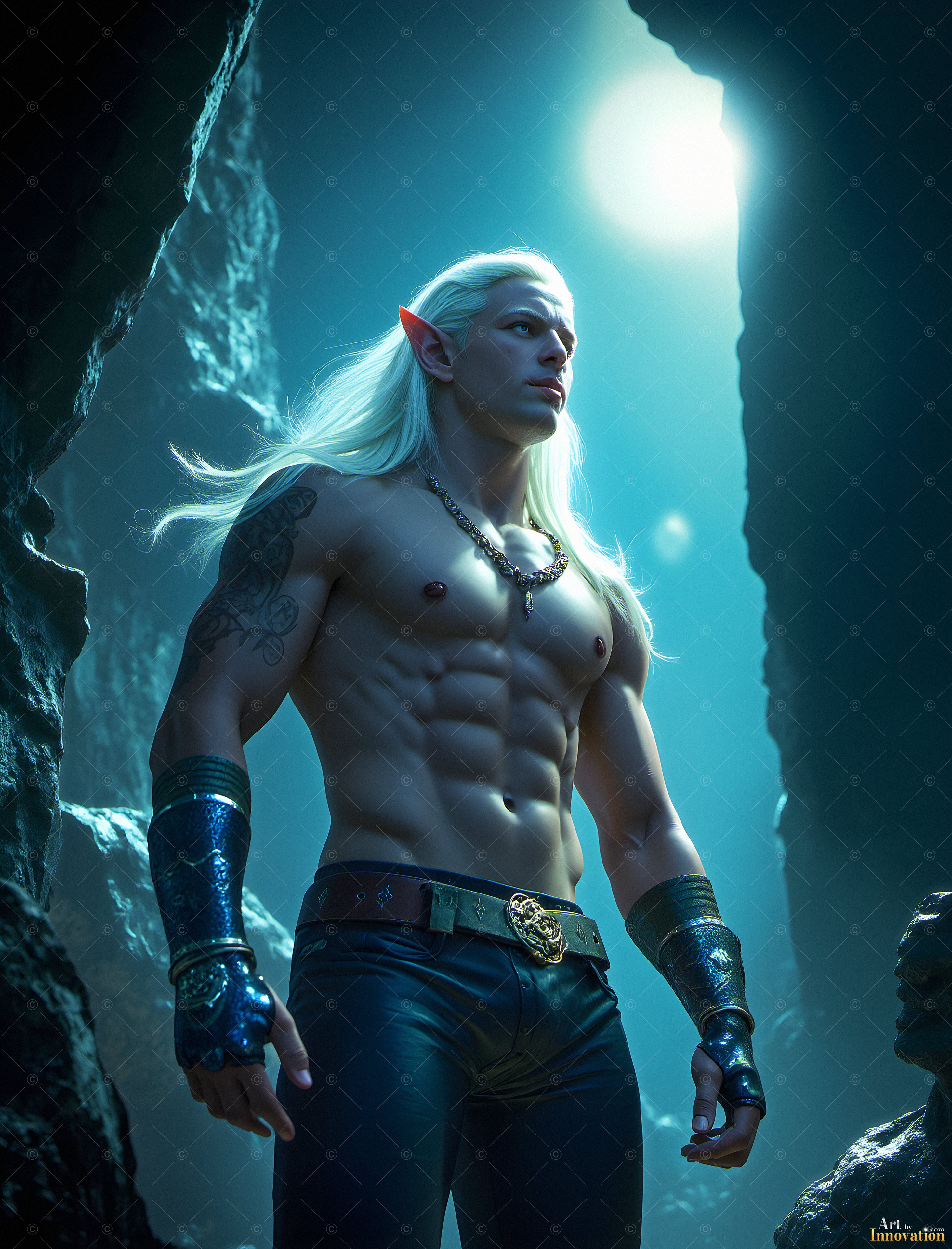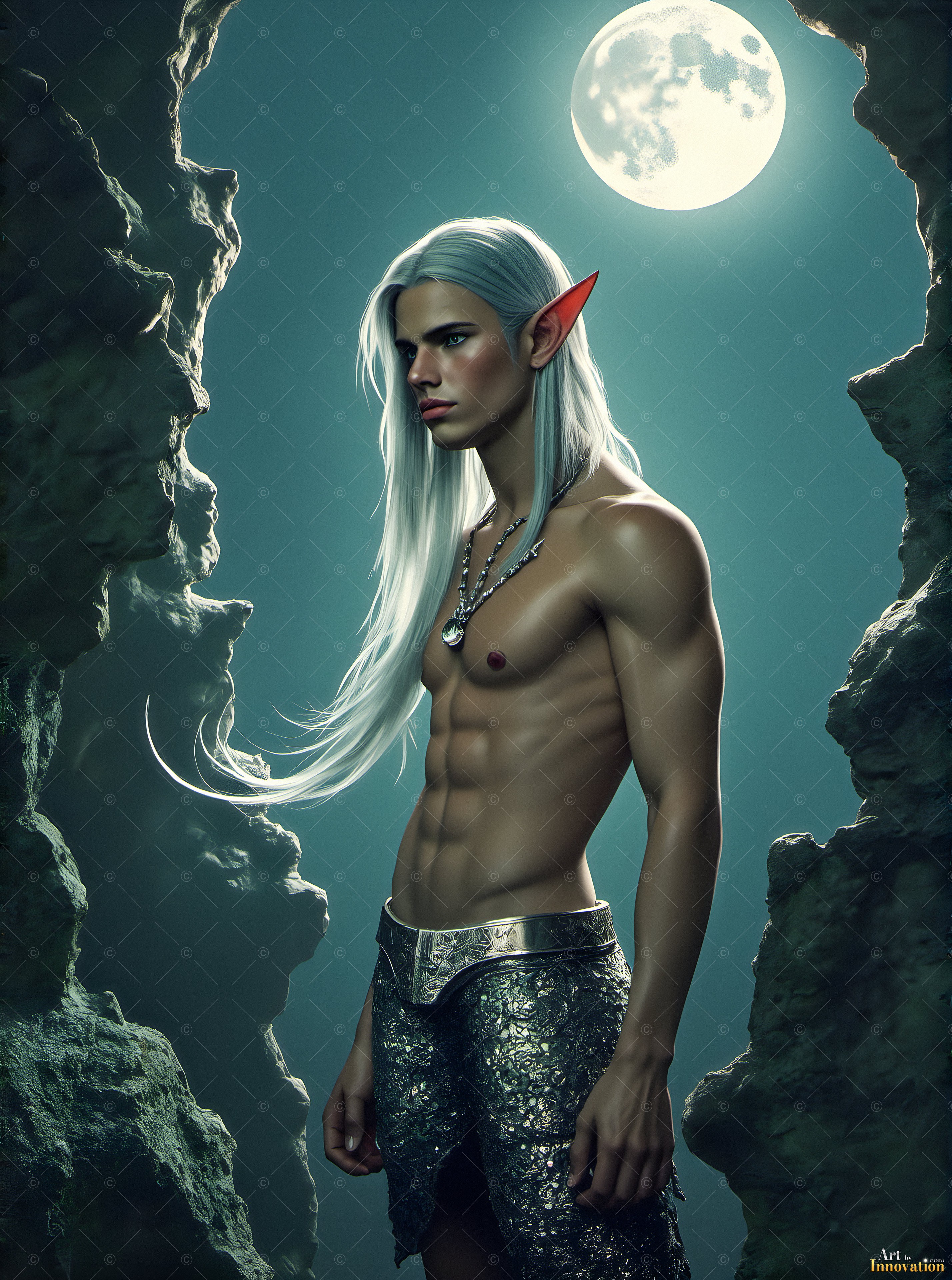 Handsome Male Elves, majestic young male elf standing in an elaborate elven background, in a dark ethereal realm. With pointed ears, wearing glamorous, luxurious, and fierce outfits is an Elven city, full of handsome, and sexy, shirtless elf men, that are adorned with shimmering, iridescent armor.
