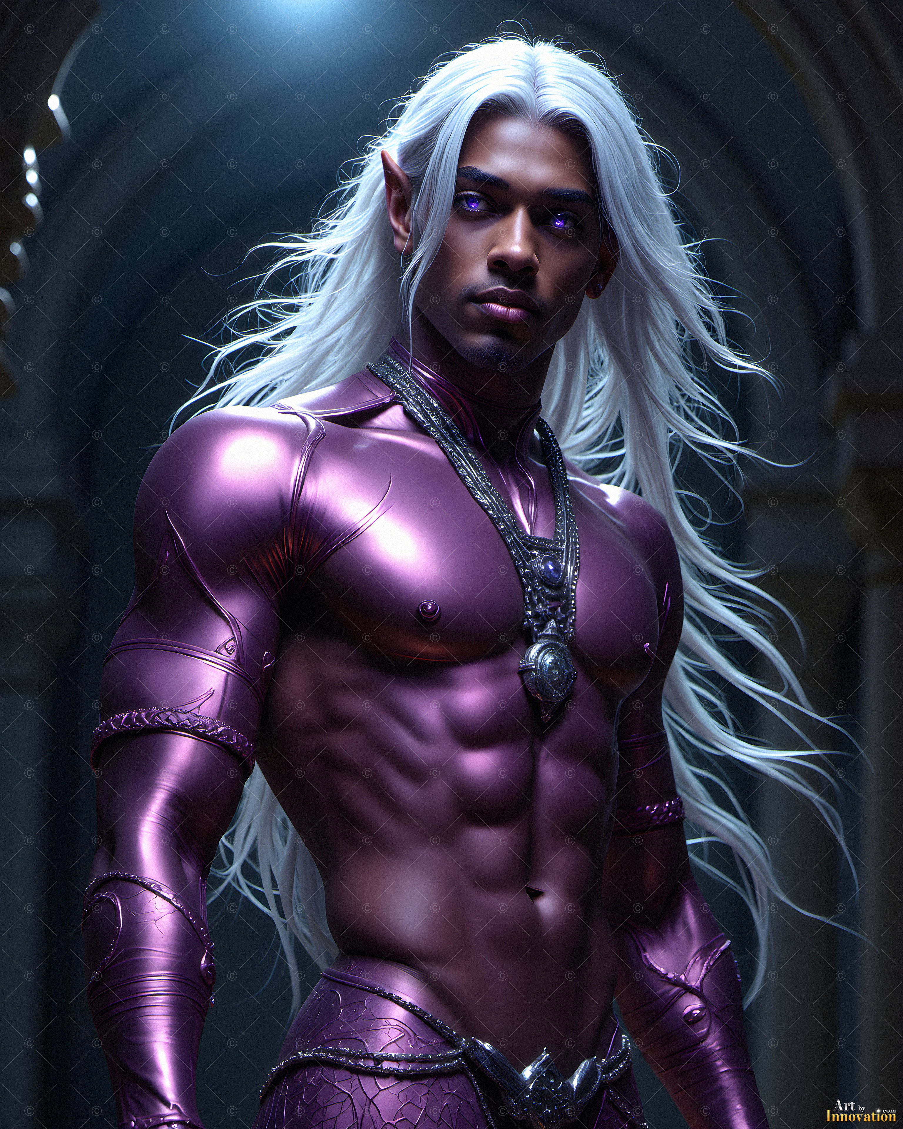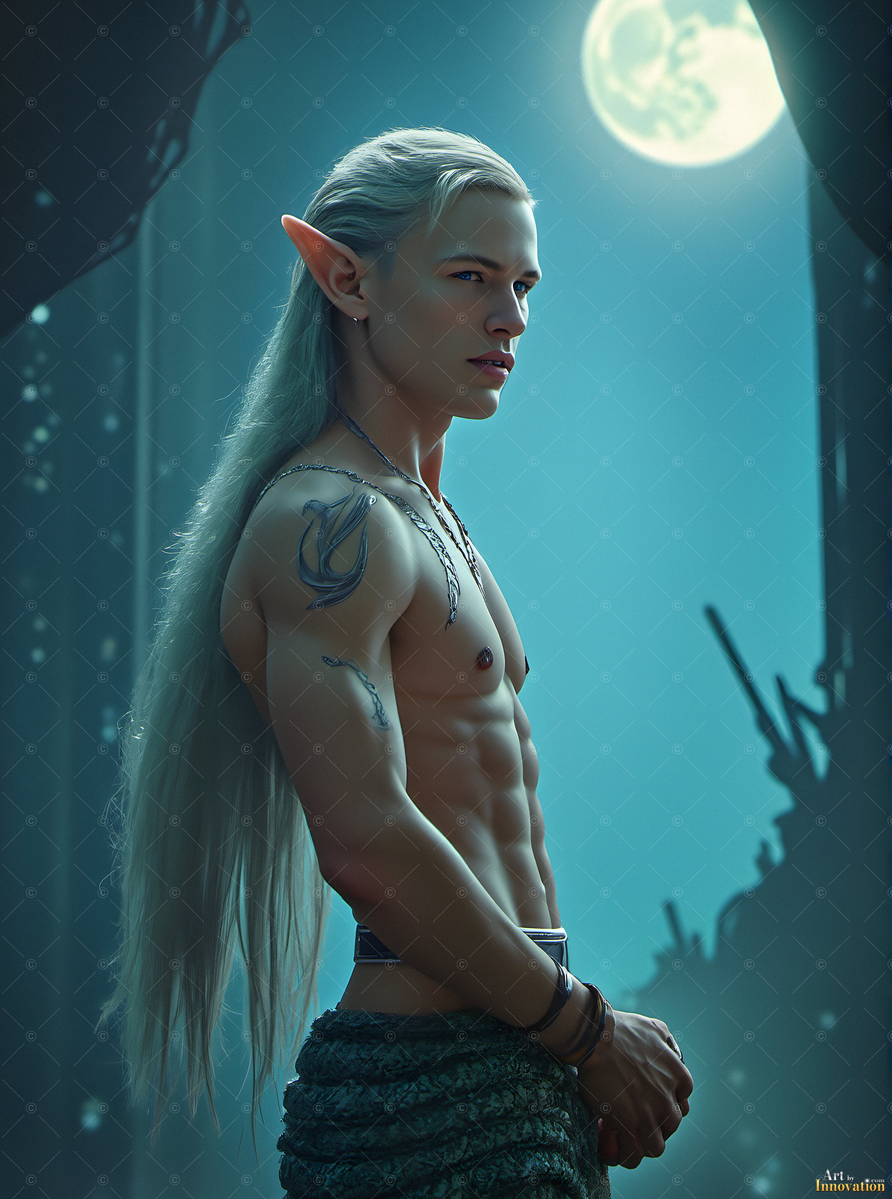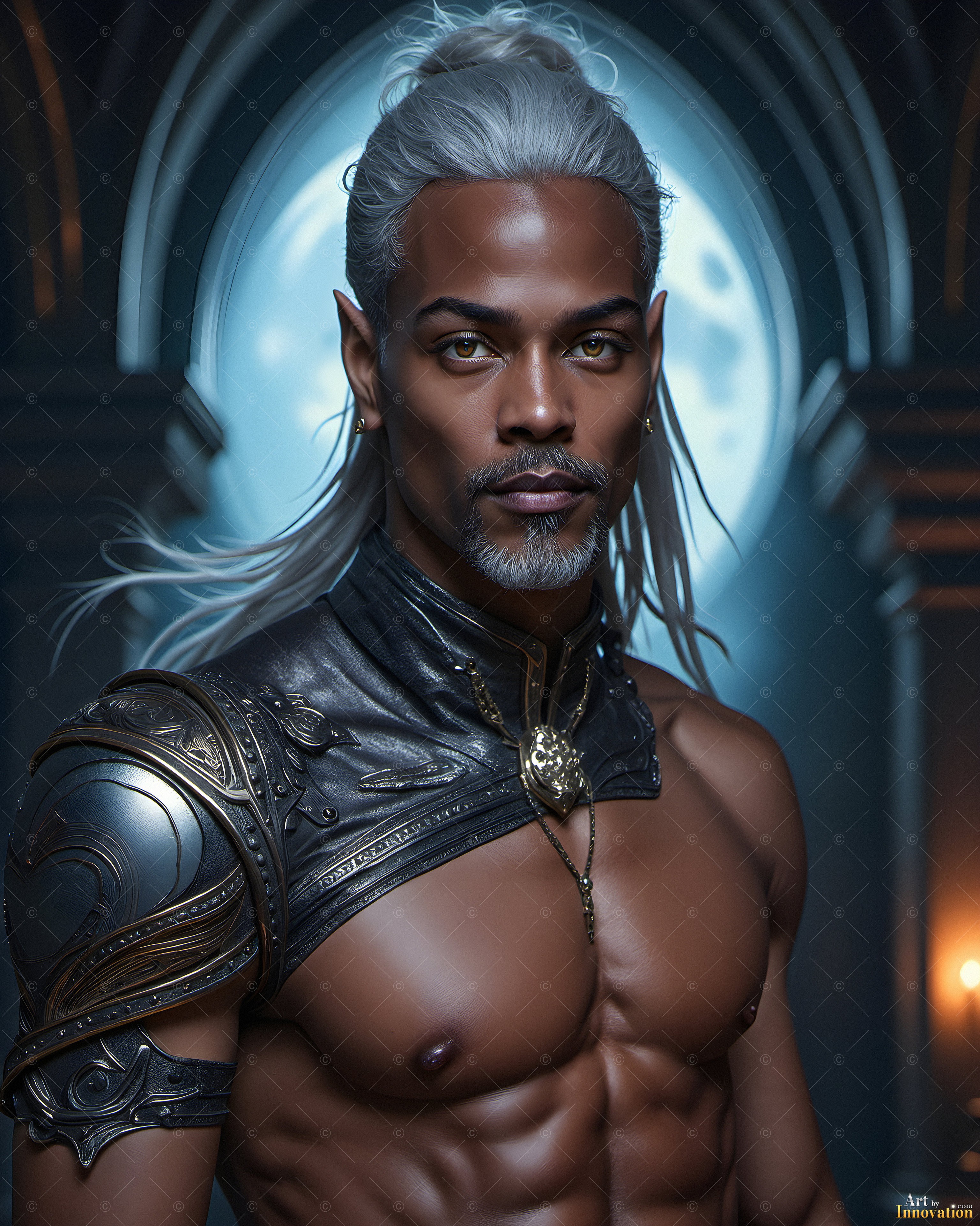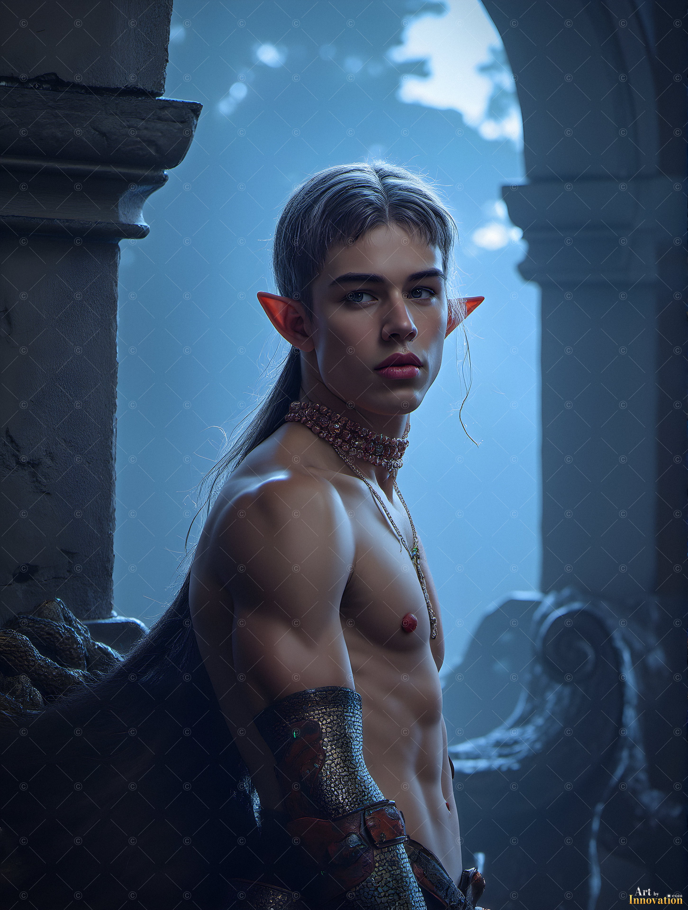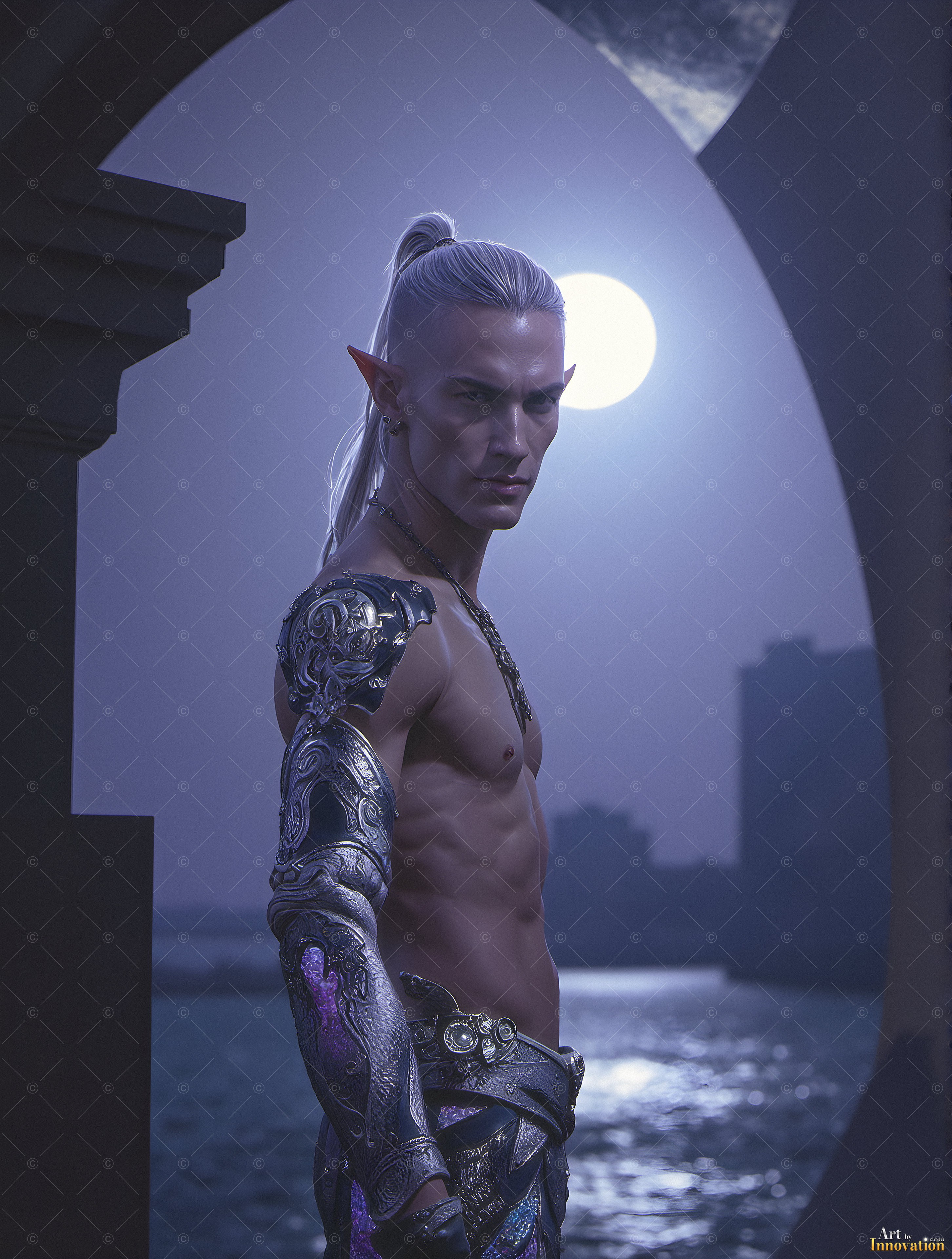 Handsome Male Elves, majestic young male elf standing in an elaborate elven background, in a dark ethereal realm. With pointed ears, wearing glamorous, luxurious, and fierce outfits is an Elven city, full of handsome, and sexy, shirtless elf men, that are adorned with shimmering, iridescent armor.
