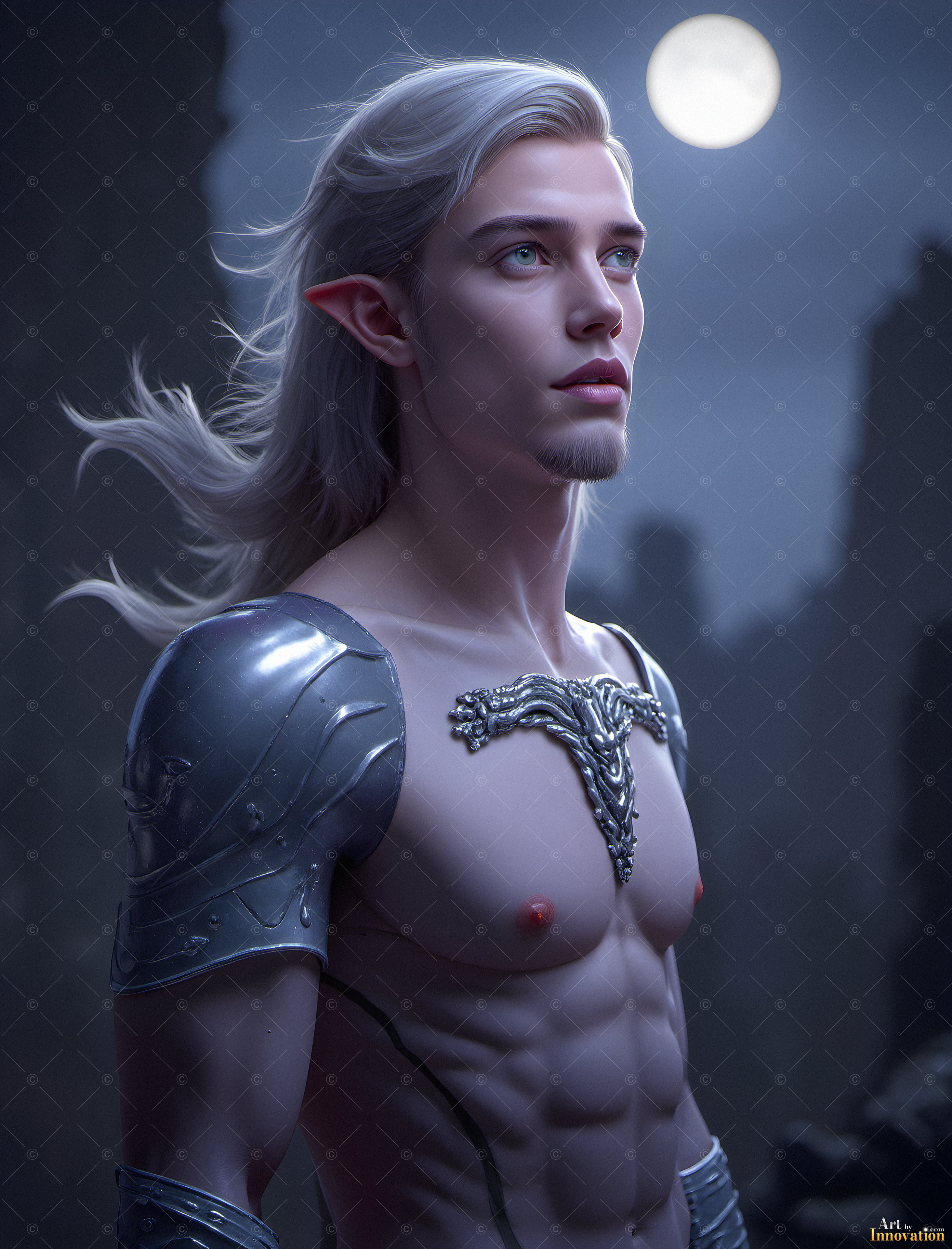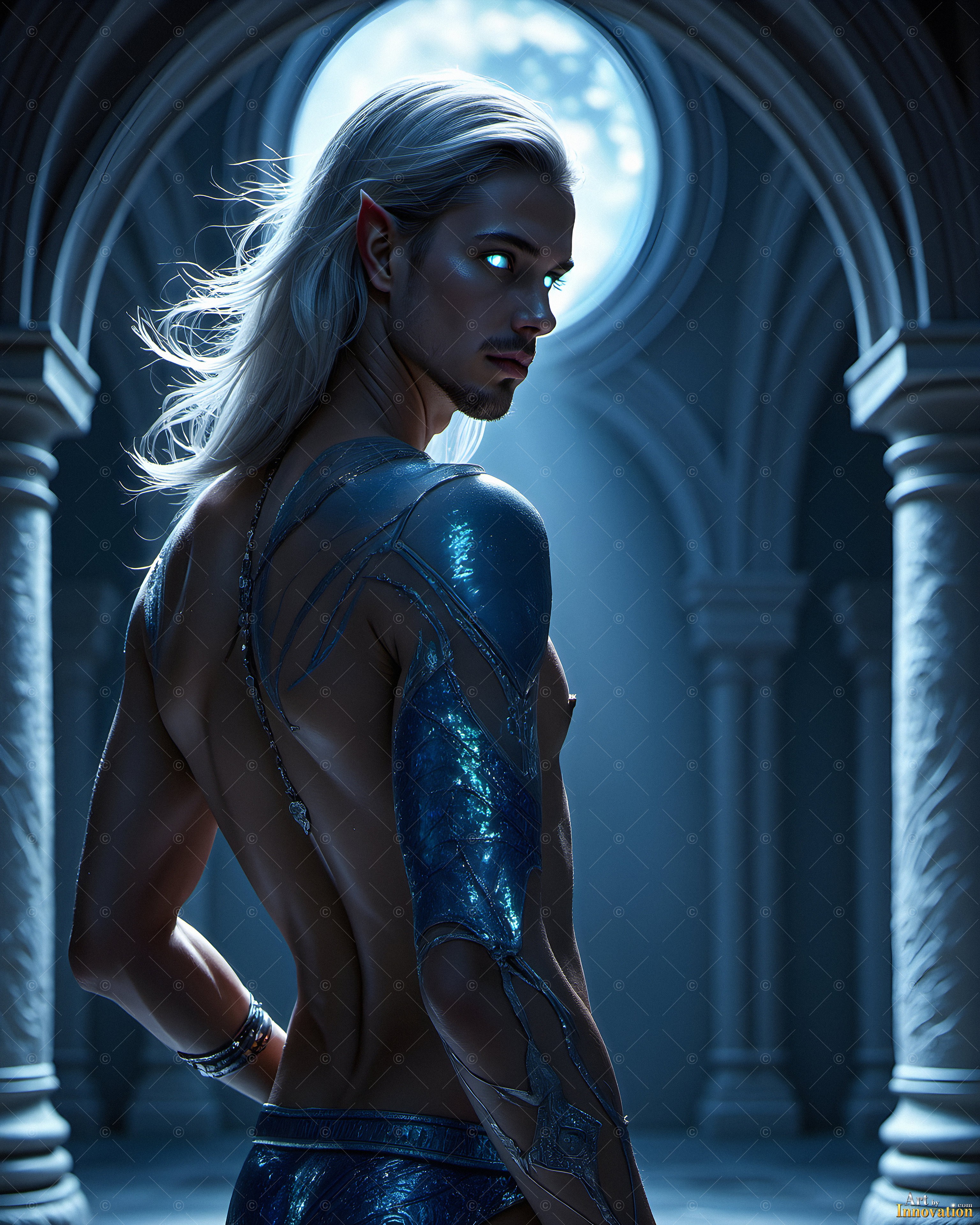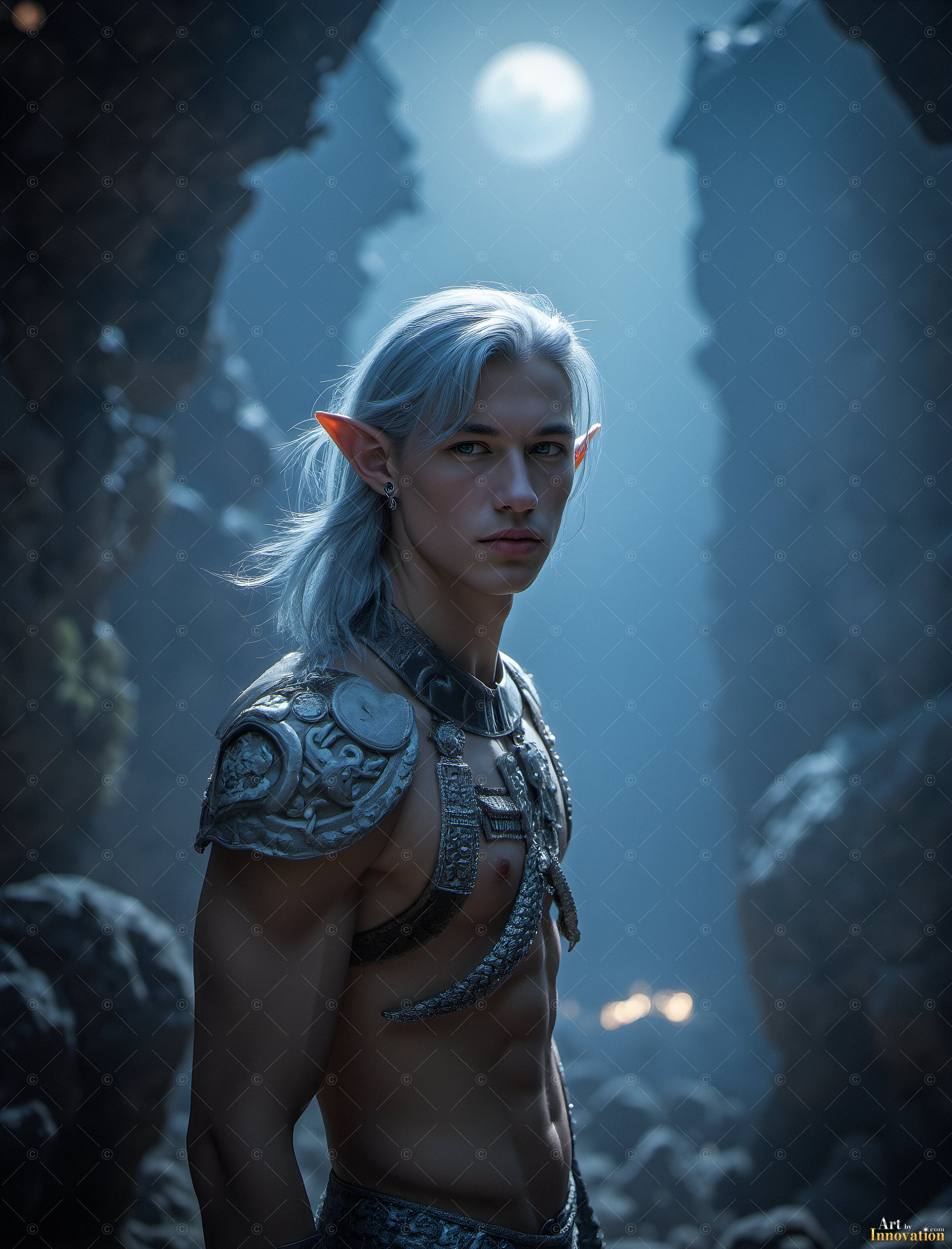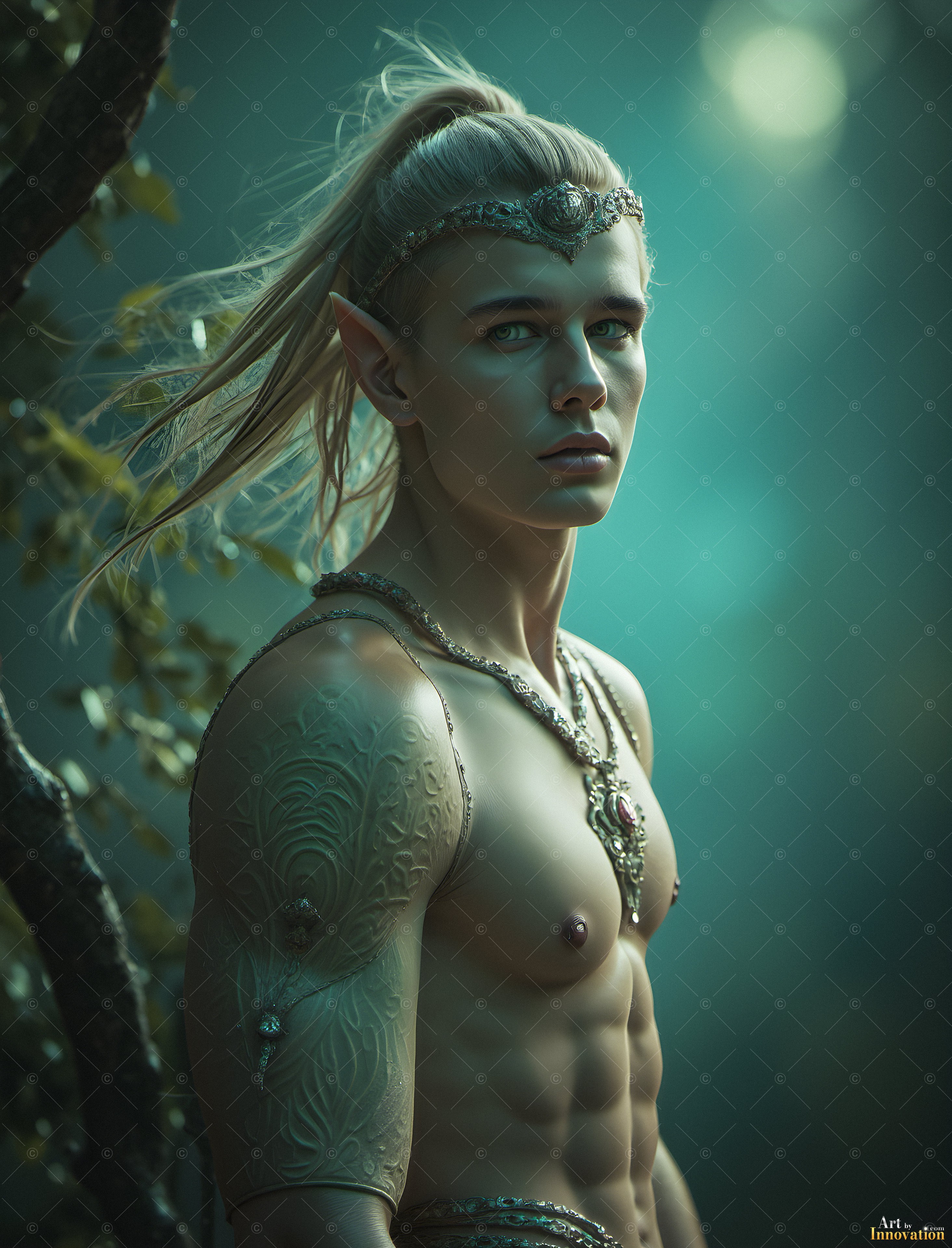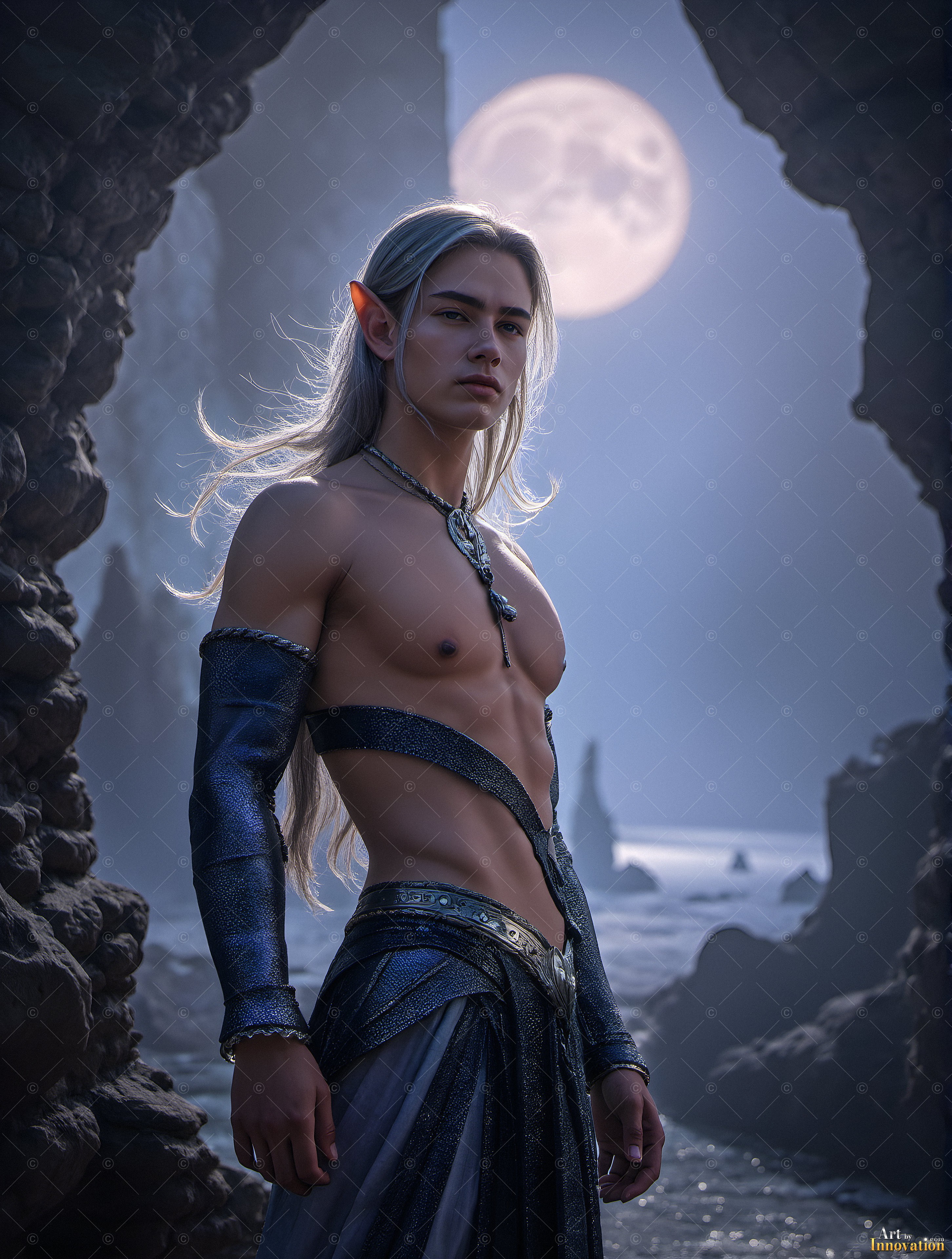 Handsome Male Elves, majestic young male elf standing in an elaborate elven background, in a dark ethereal realm. With pointed ears, wearing glamorous, luxurious, and fierce outfits is an Elven city, full of handsome, and sexy, shirtless elf men, that are adorned with shimmering, iridescent armor.