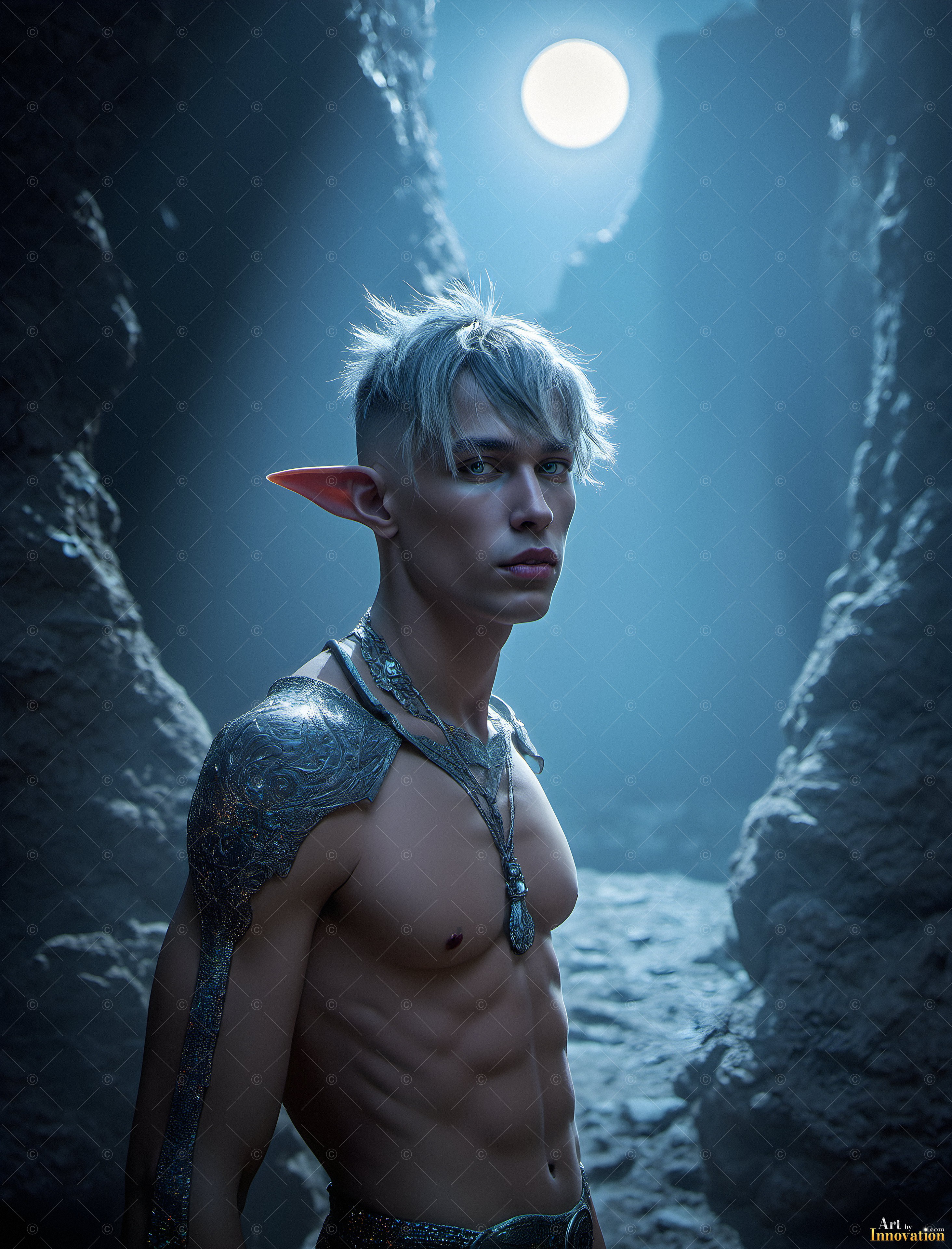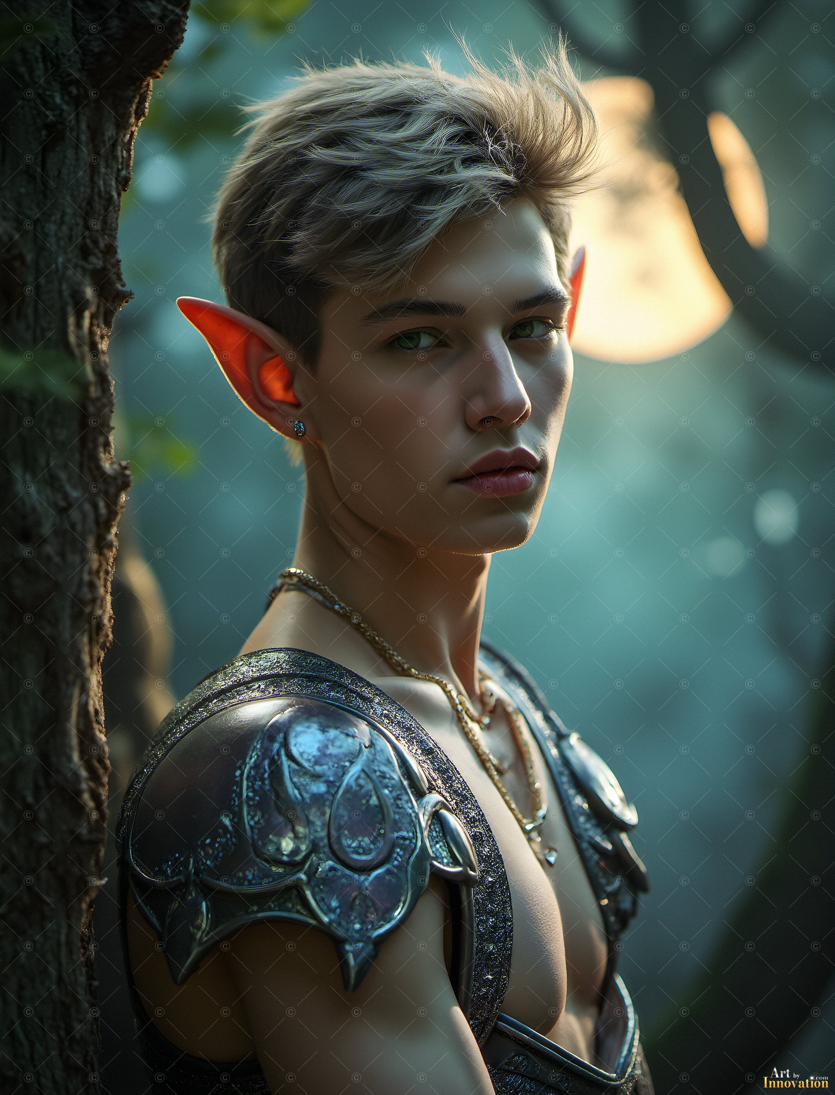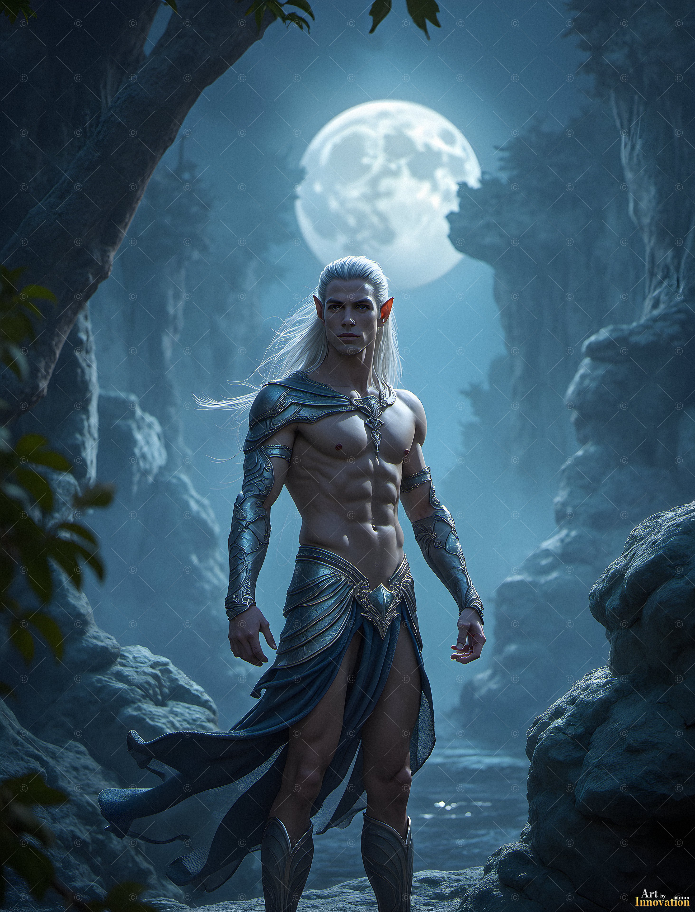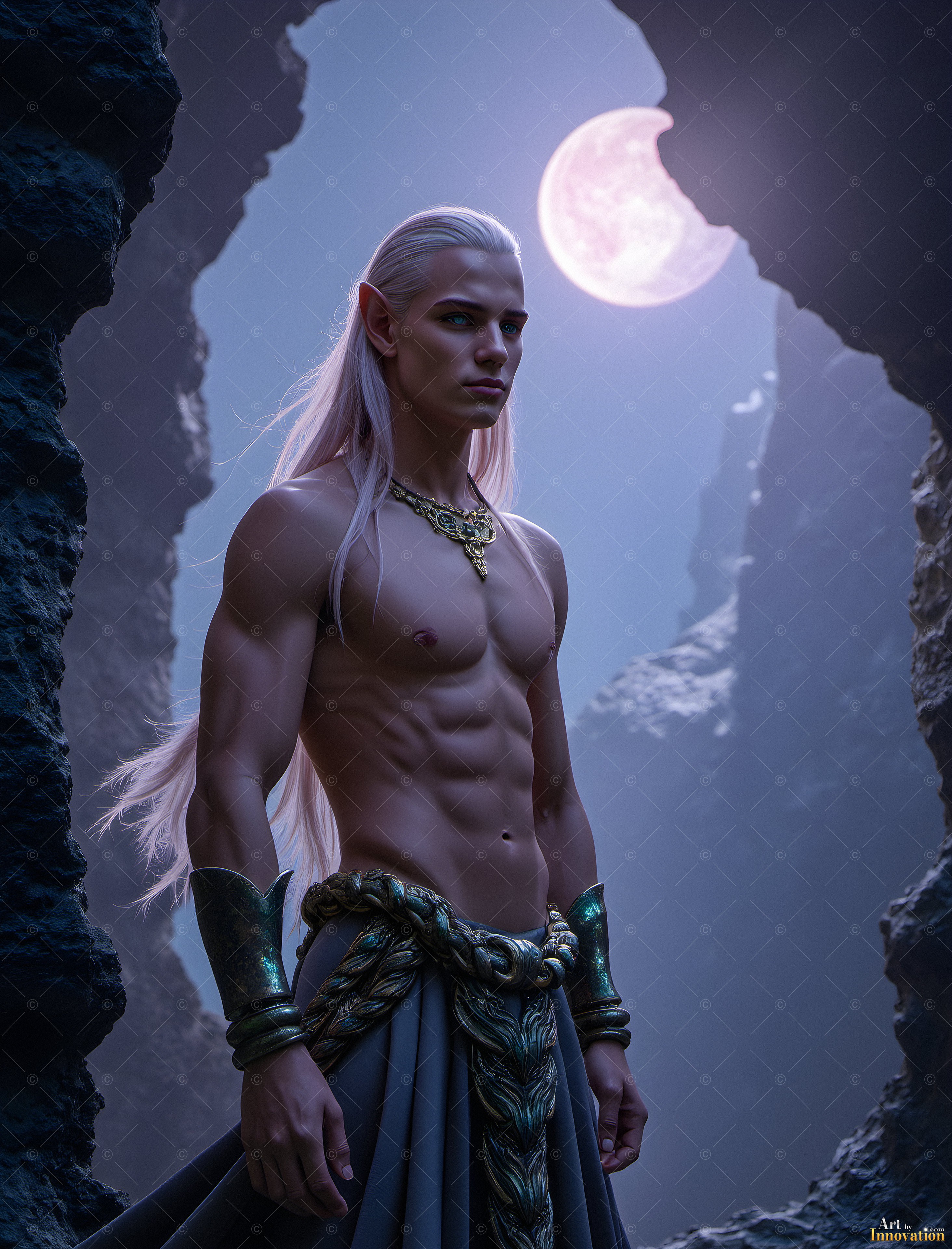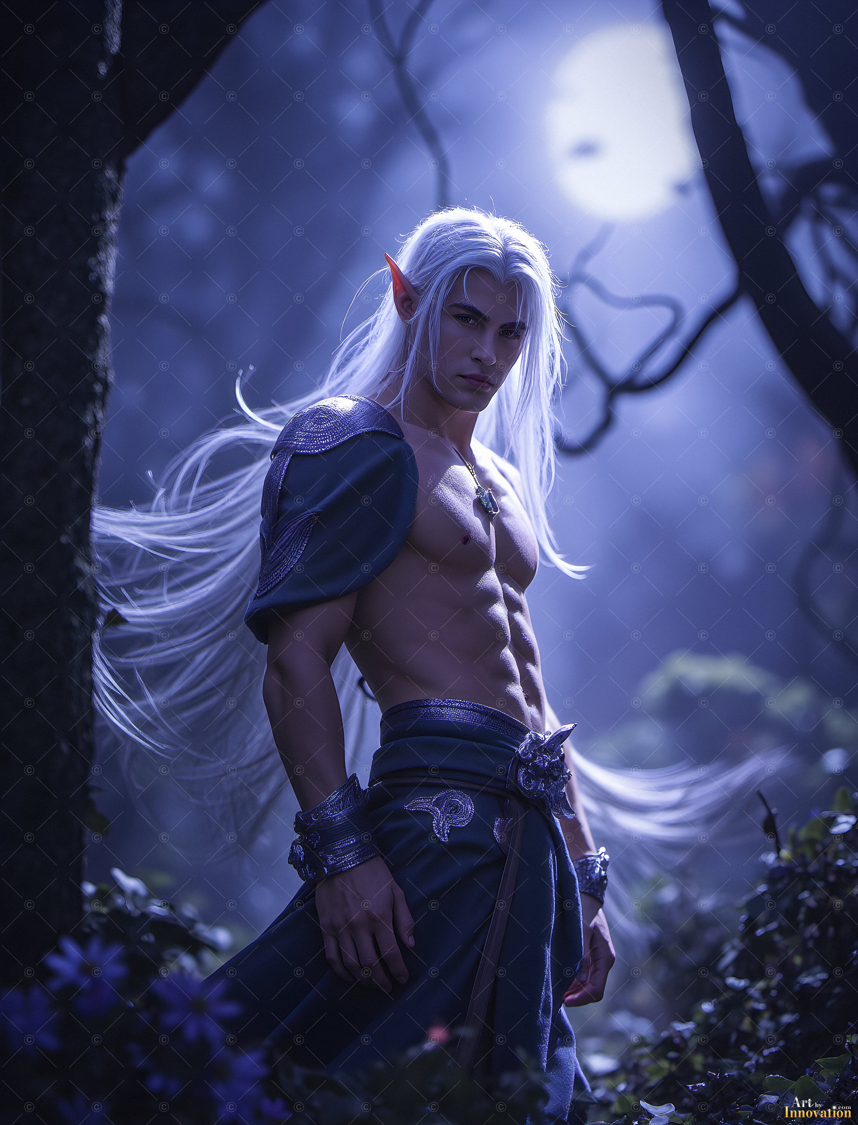 Handsome Male Elves, majestic young male elf standing in an elaborate elven background, in a dark ethereal realm. With pointed ears, wearing glamorous, luxurious, and fierce outfits is an Elven city, full of handsome, and sexy, shirtless elf men, that are adorned with shimmering, iridescent armor.