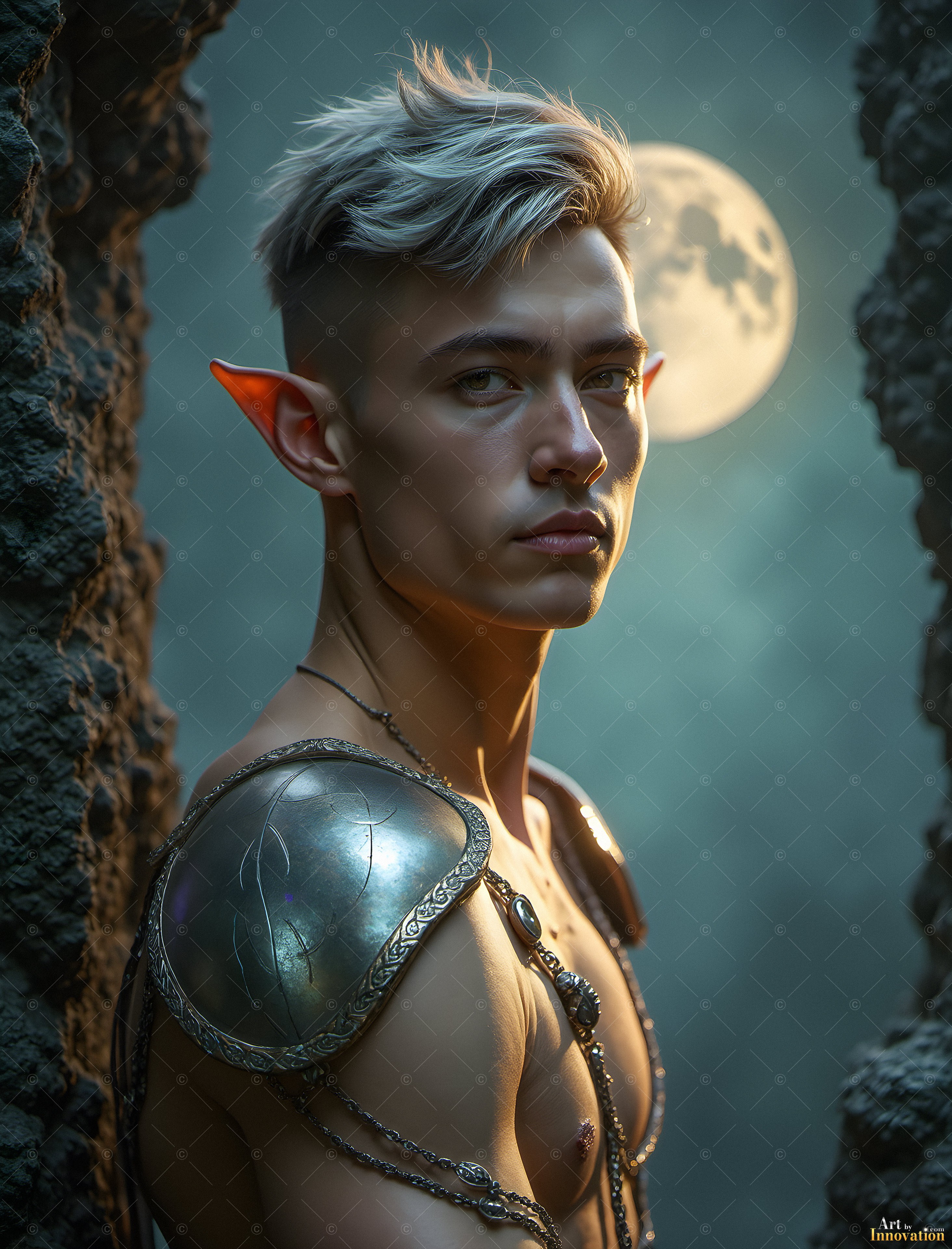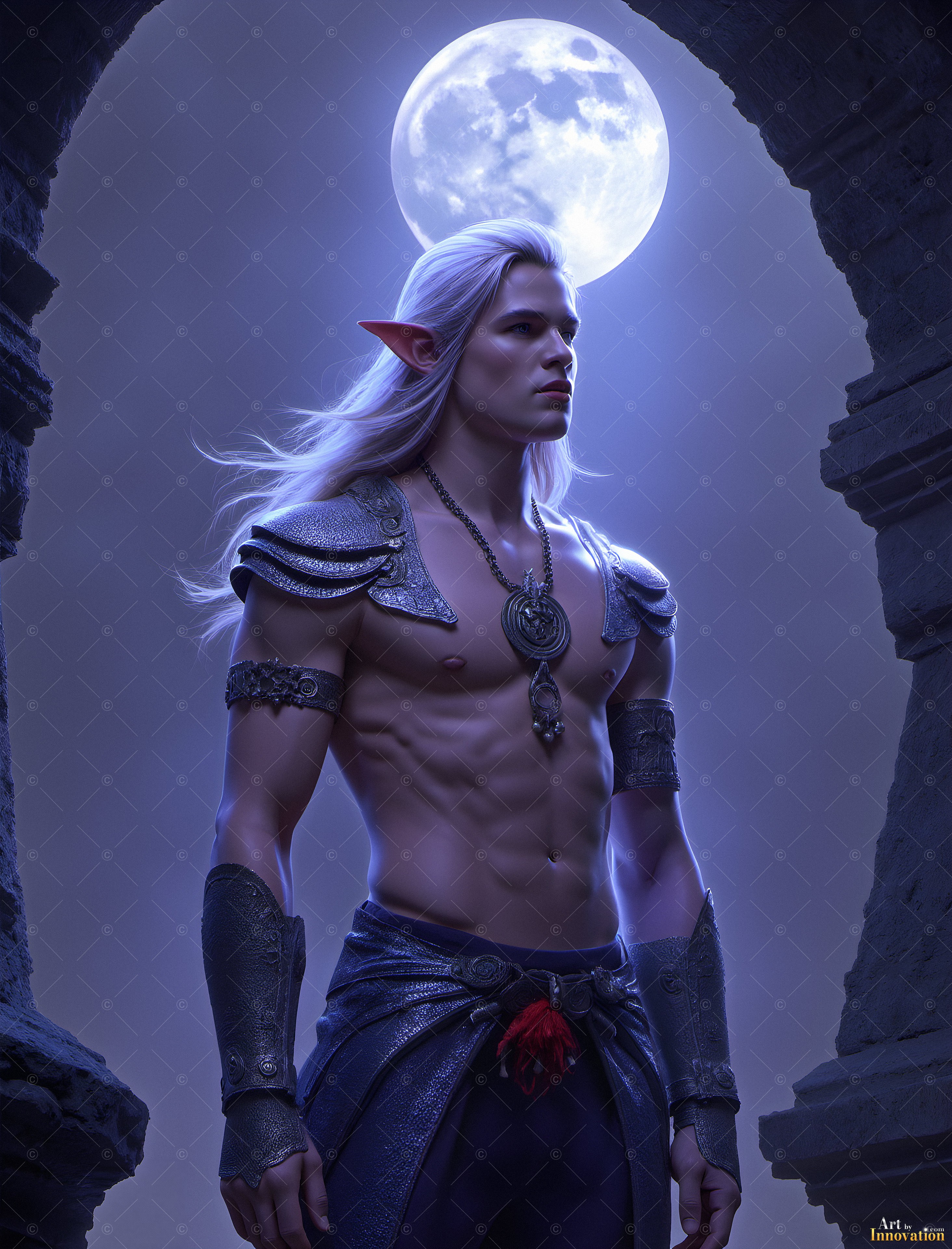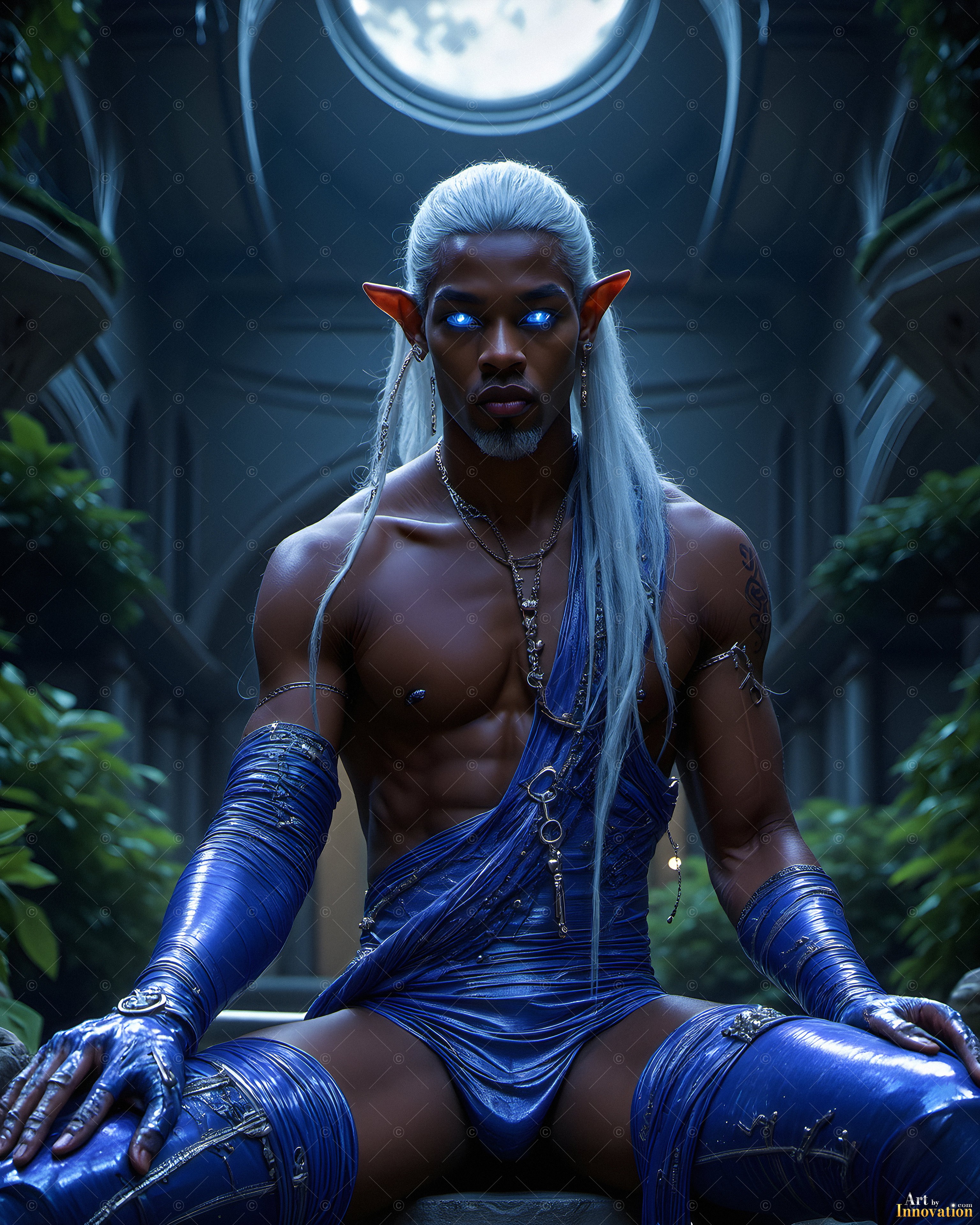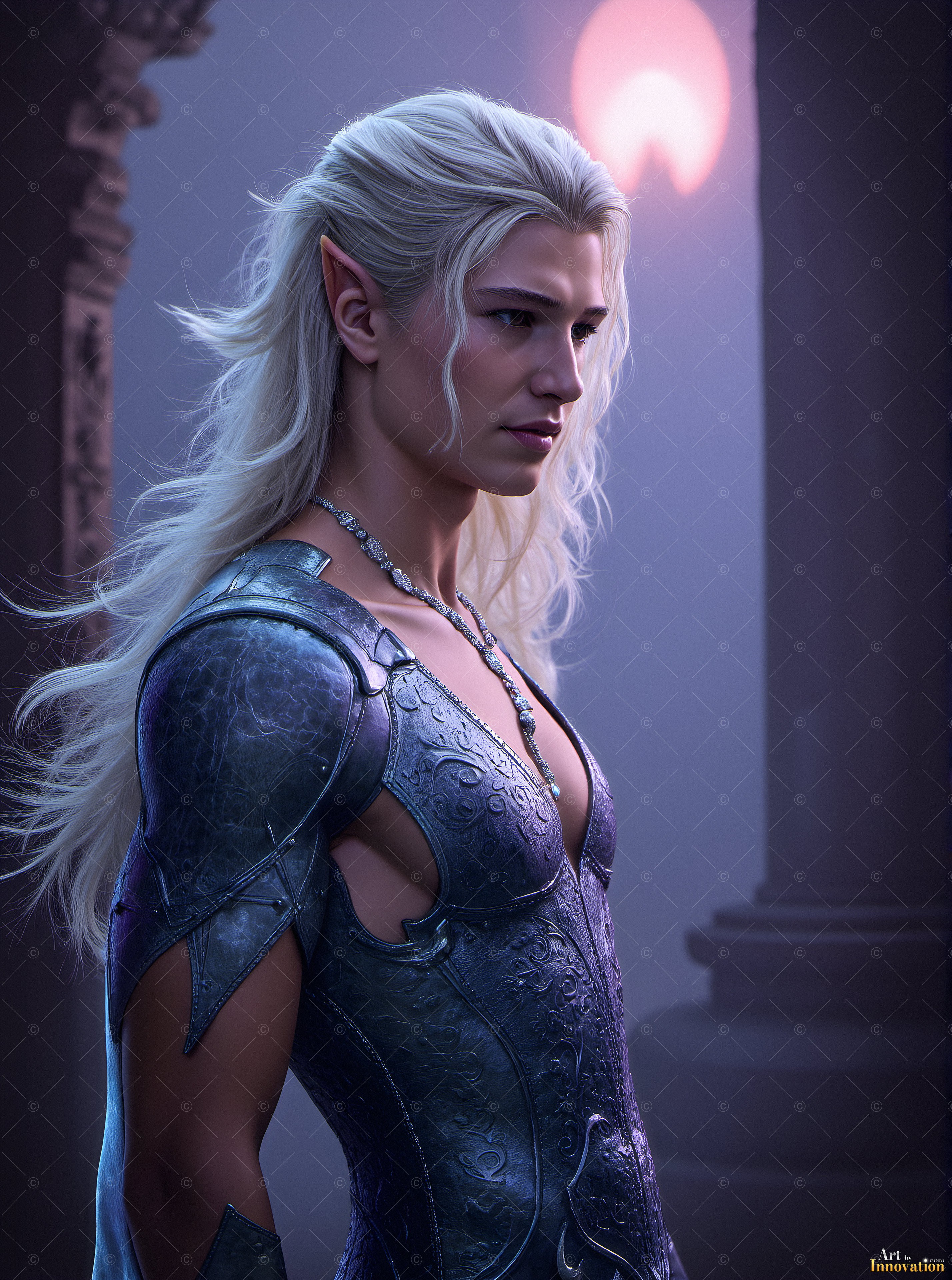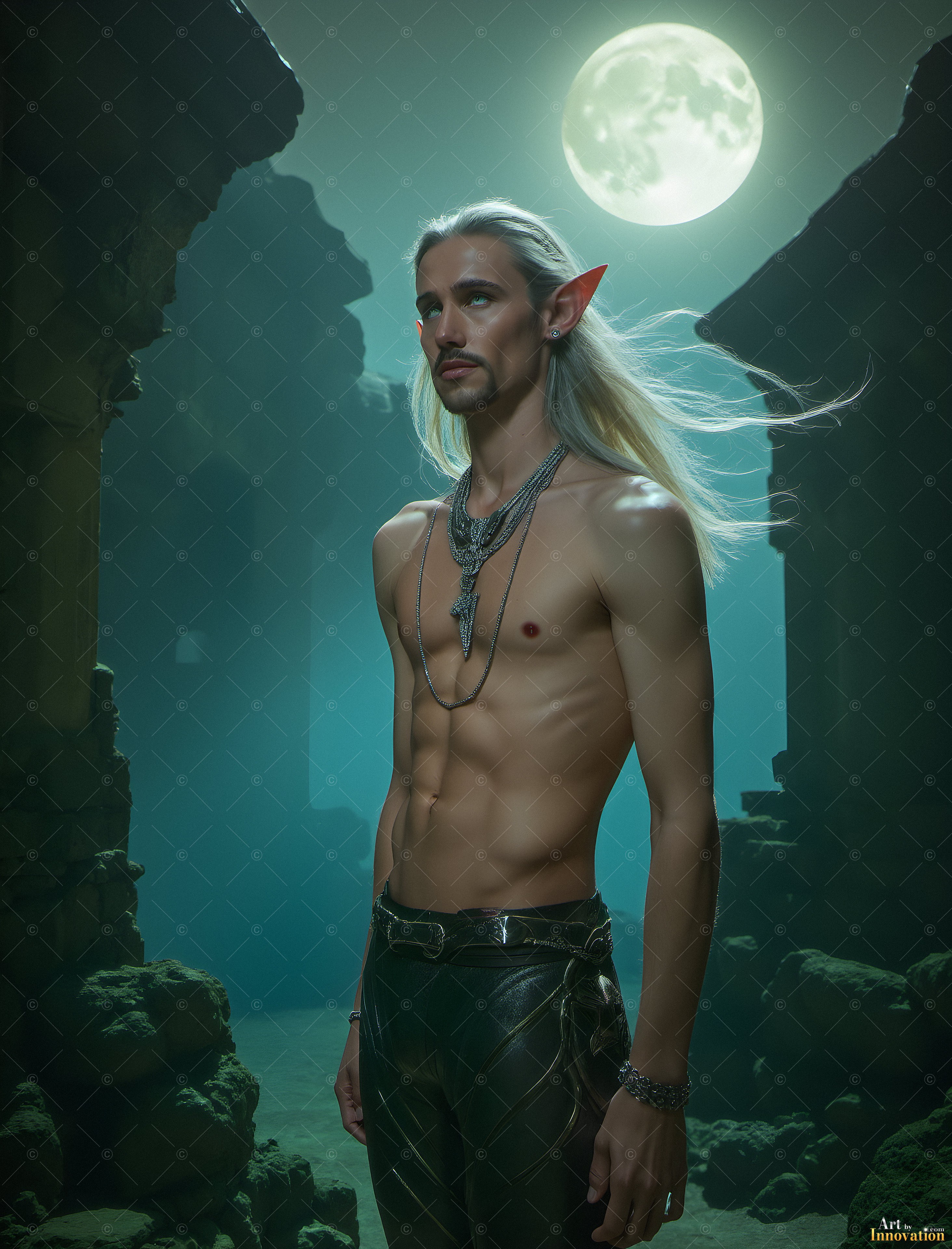 Handsome Male Elves, majestic young male elf standing in an elaborate elven background, in a dark ethereal realm. With pointed ears, wearing glamorous, luxurious, and fierce outfits is an Elven city, full of handsome, and sexy, shirtless elf men, that are adorned with shimmering, iridescent armor.