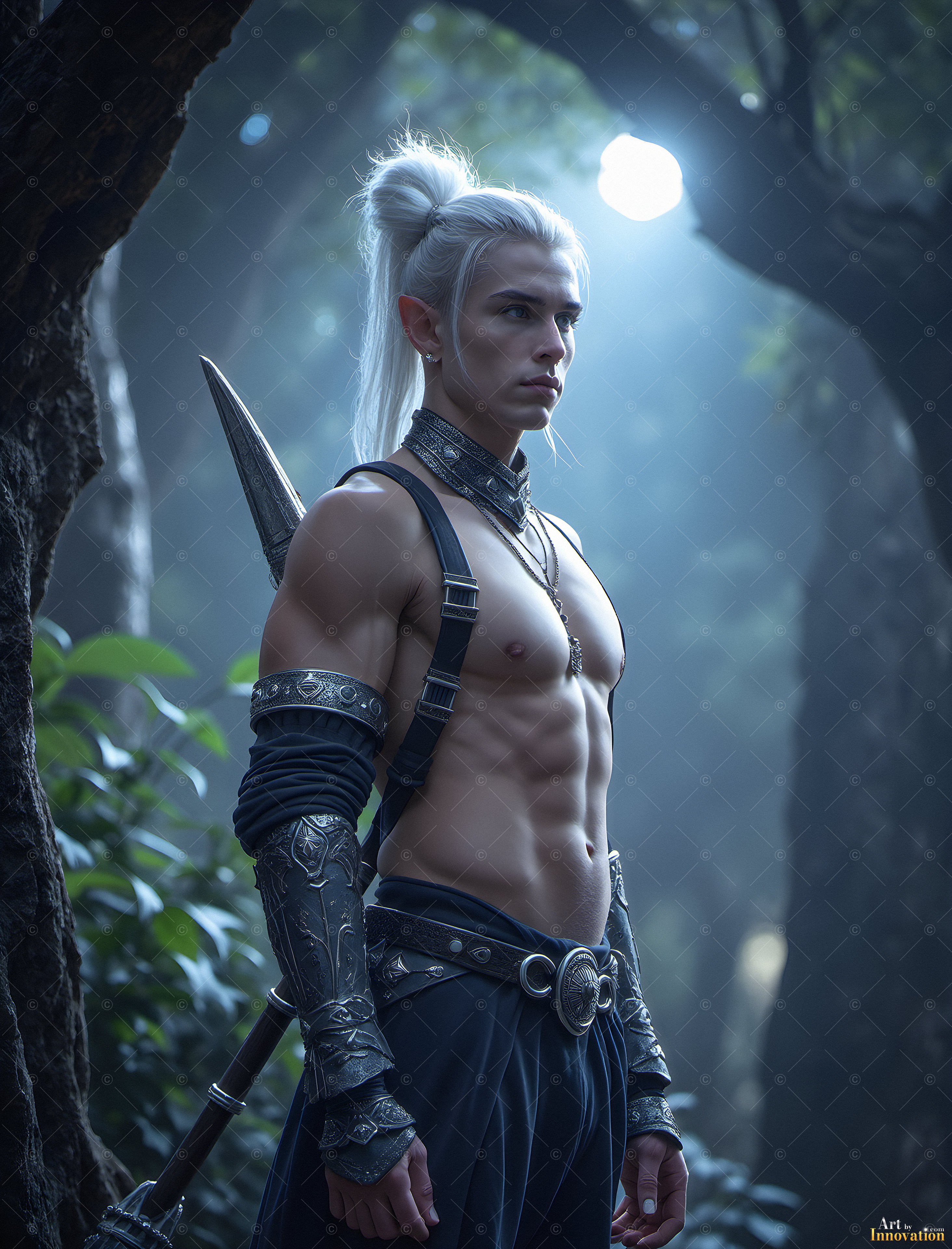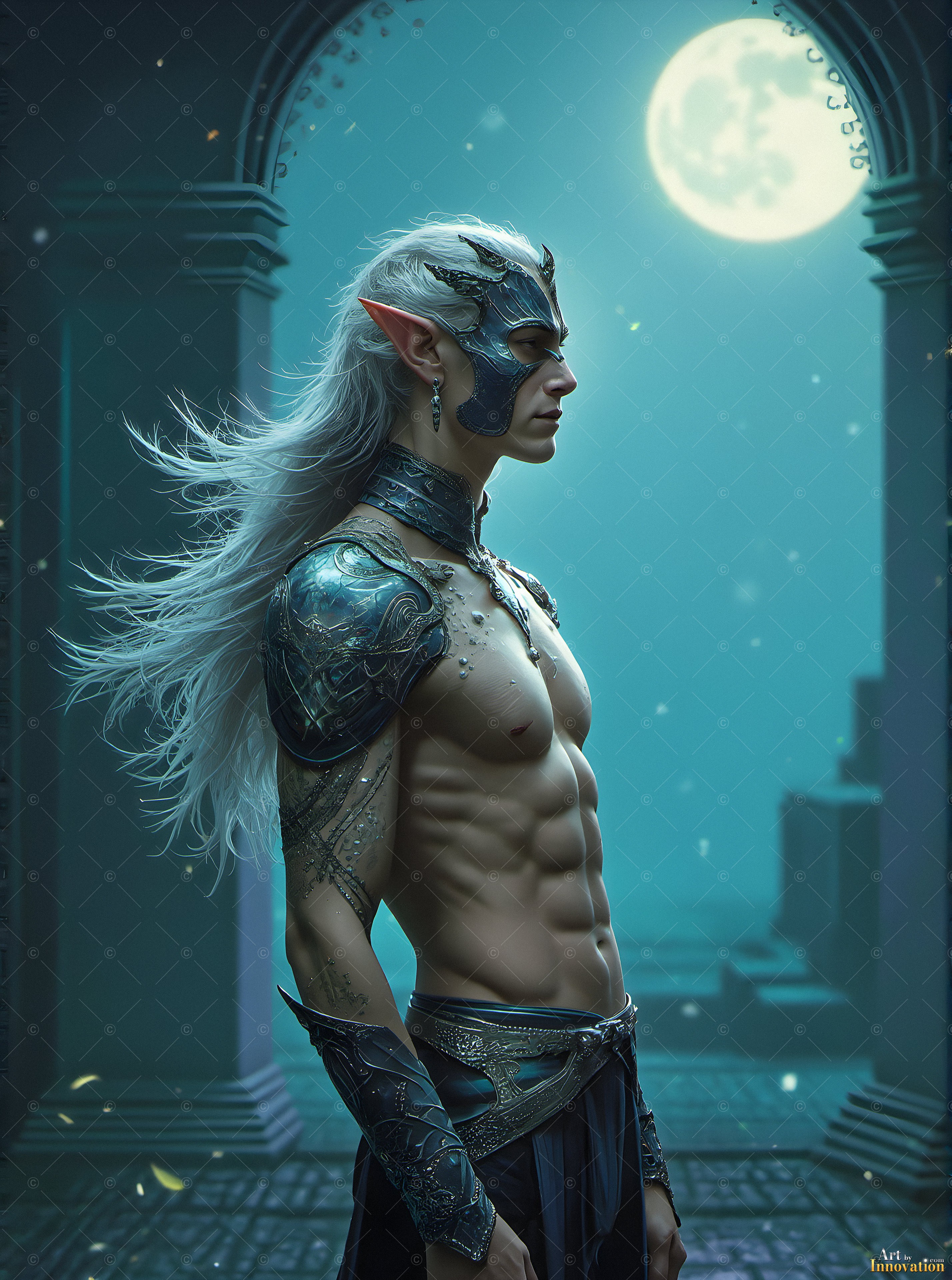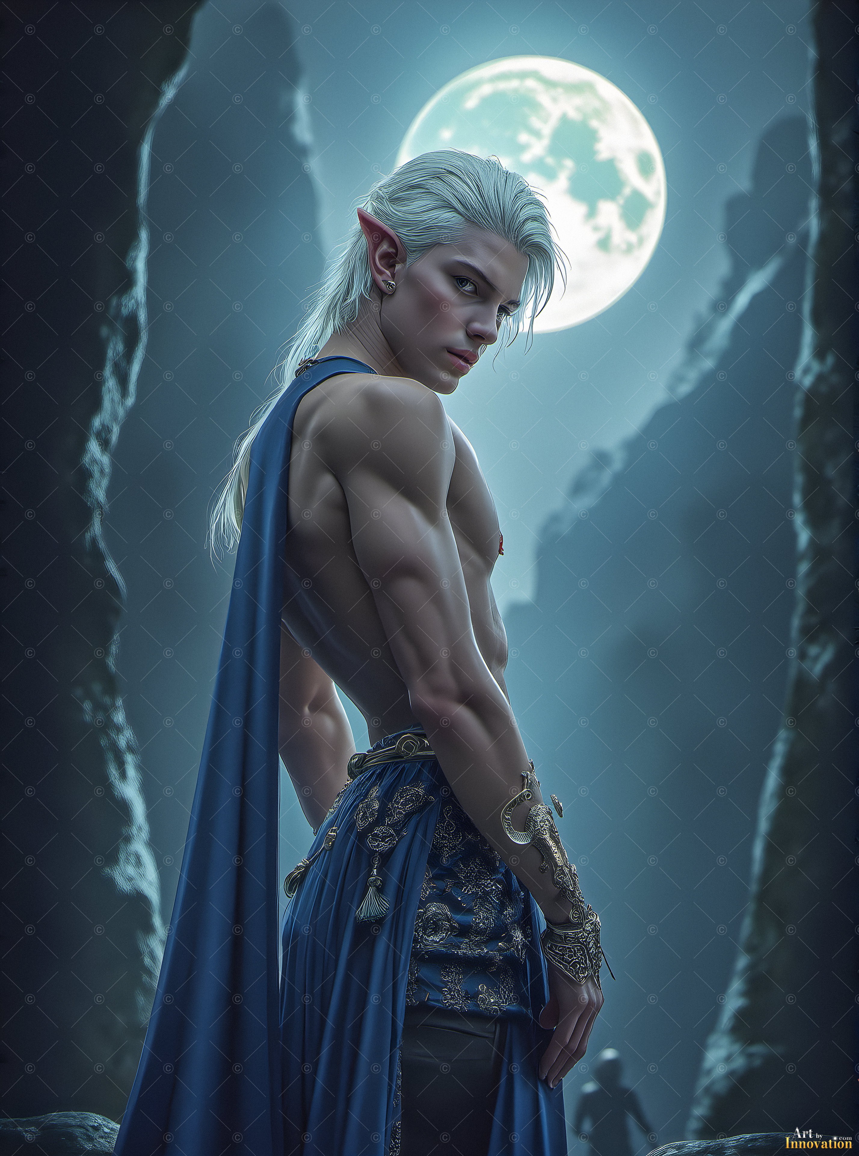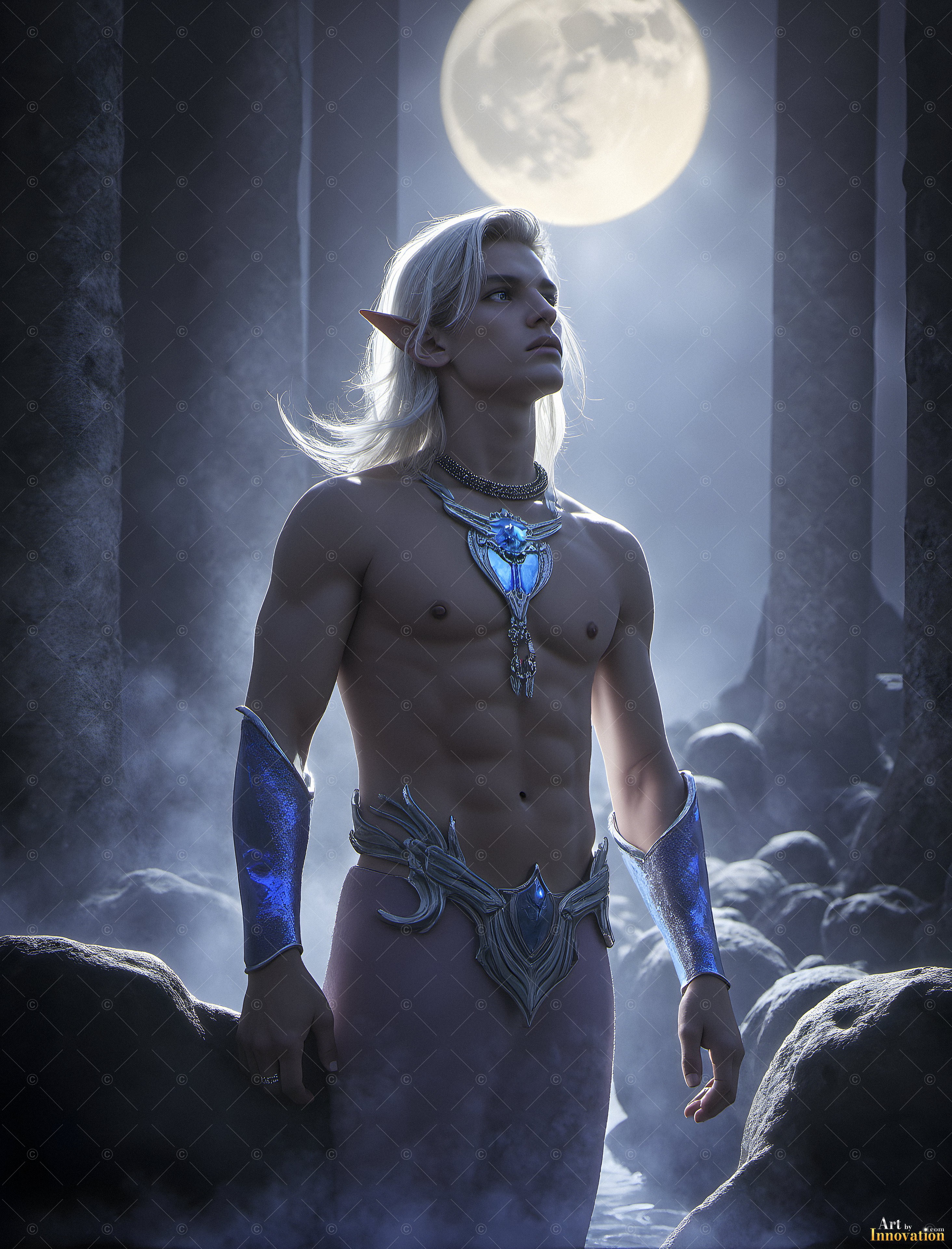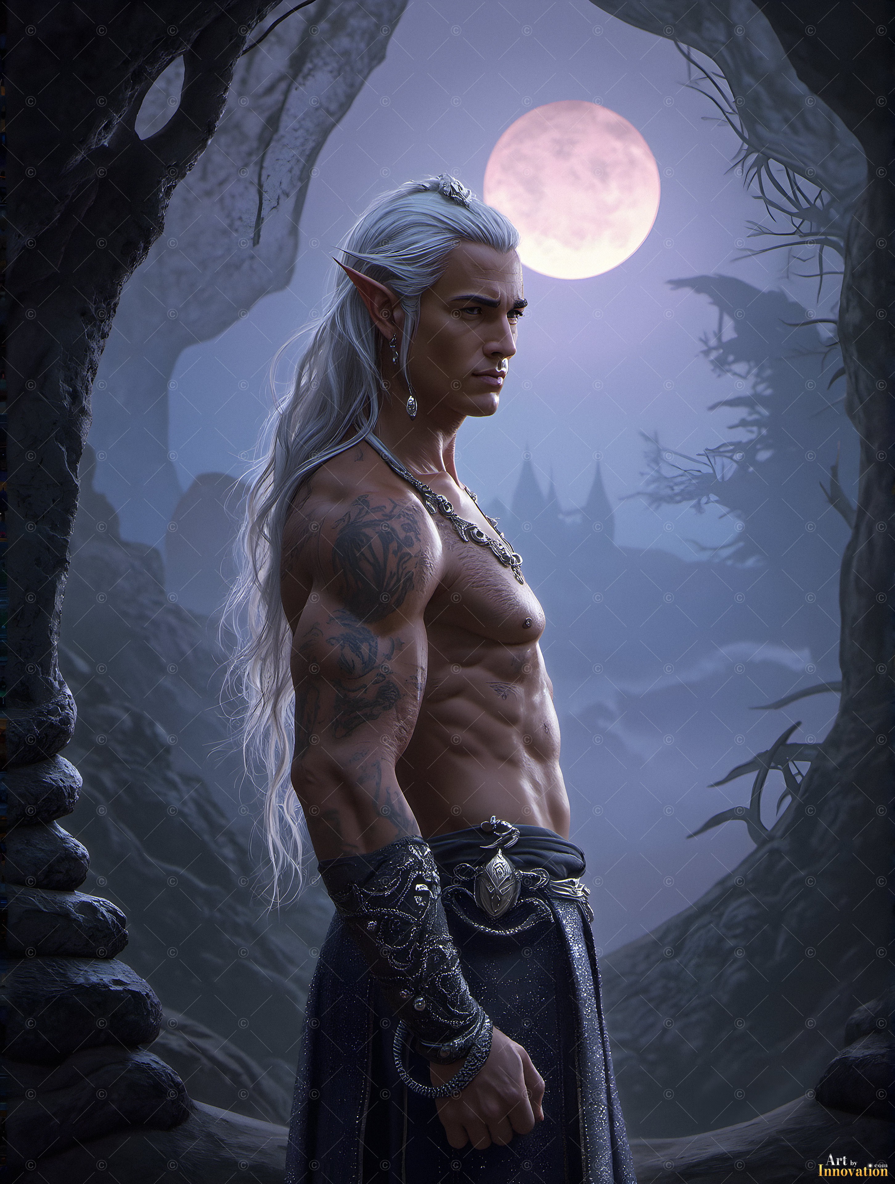 Handsome Male Elves, majestic young male elf standing in an elaborate elven background, in a dark ethereal realm. With pointed ears, wearing glamorous, luxurious, and fierce outfits is an Elven city, full of handsome, and sexy, shirtless elf men, that are adorned with shimmering, iridescent armor.