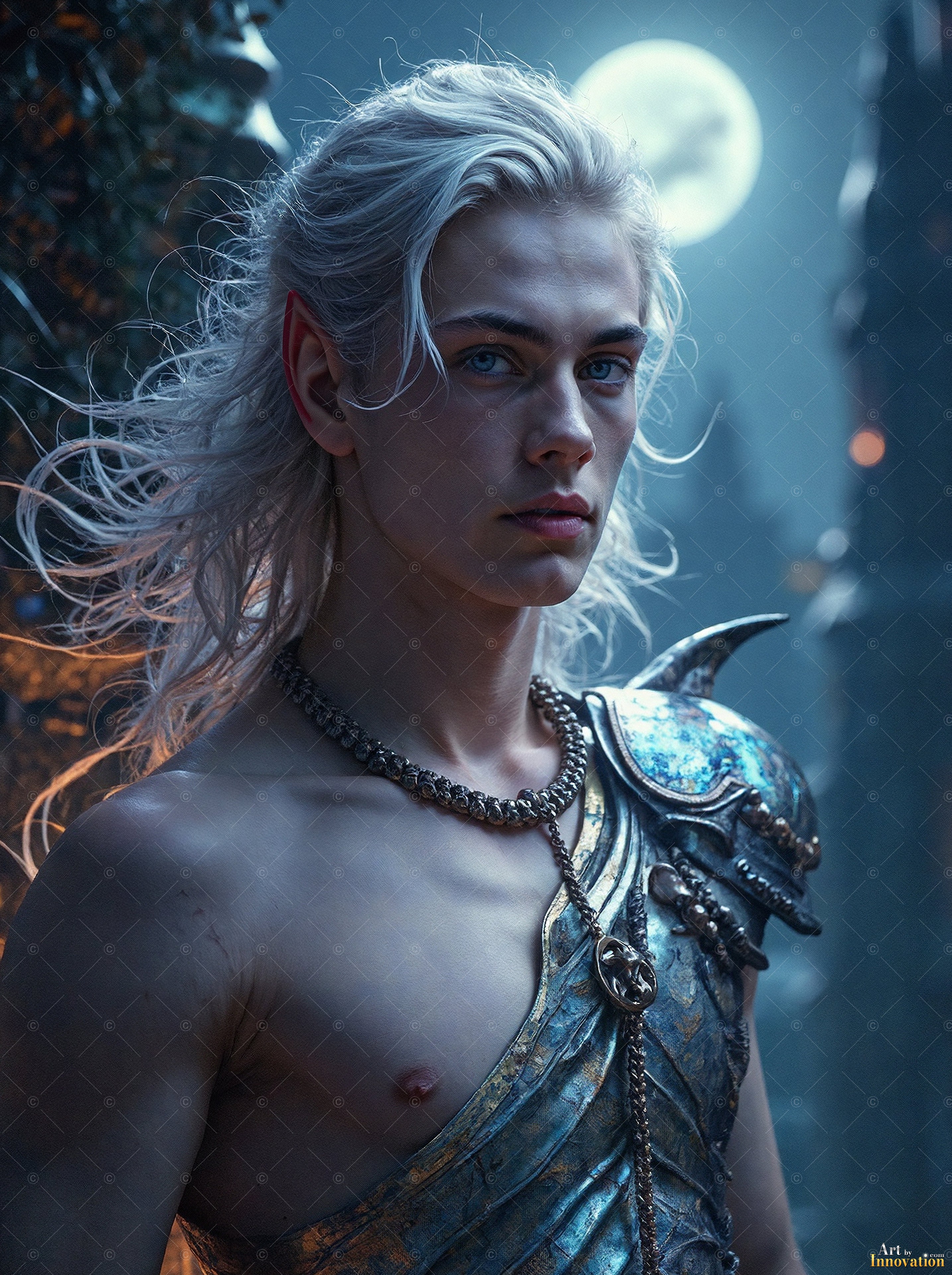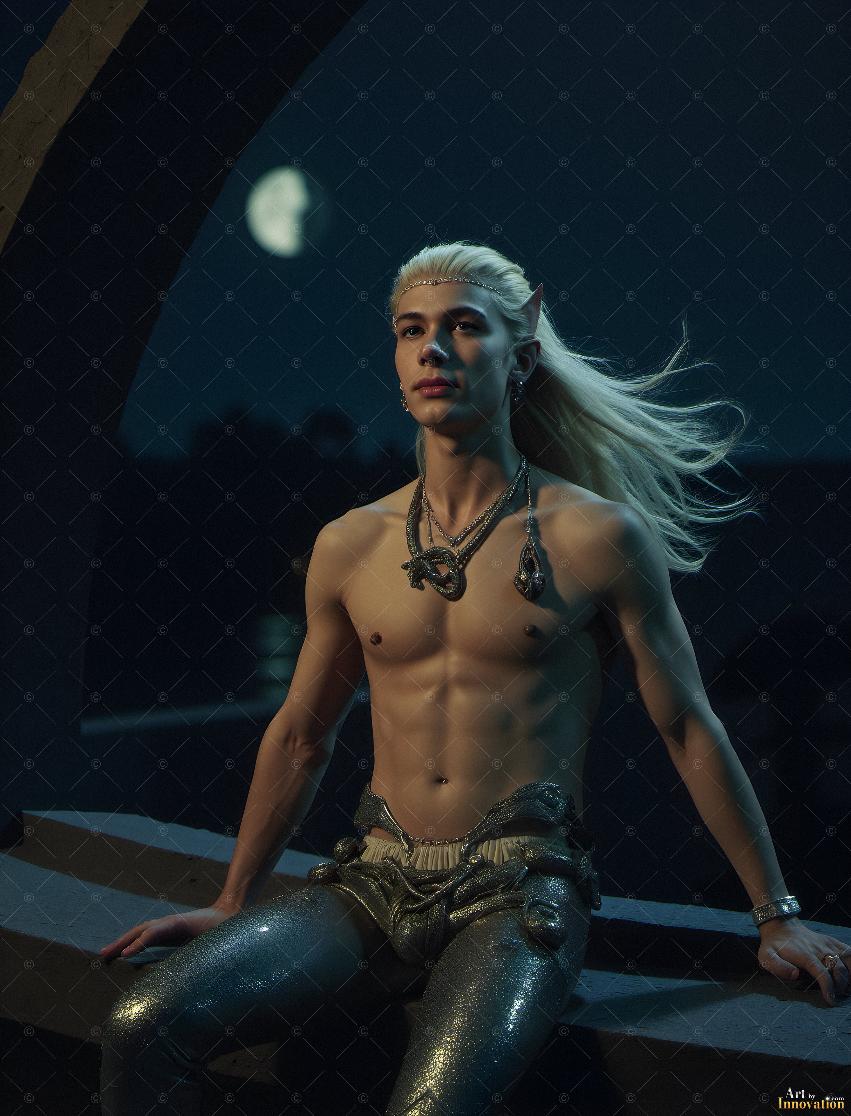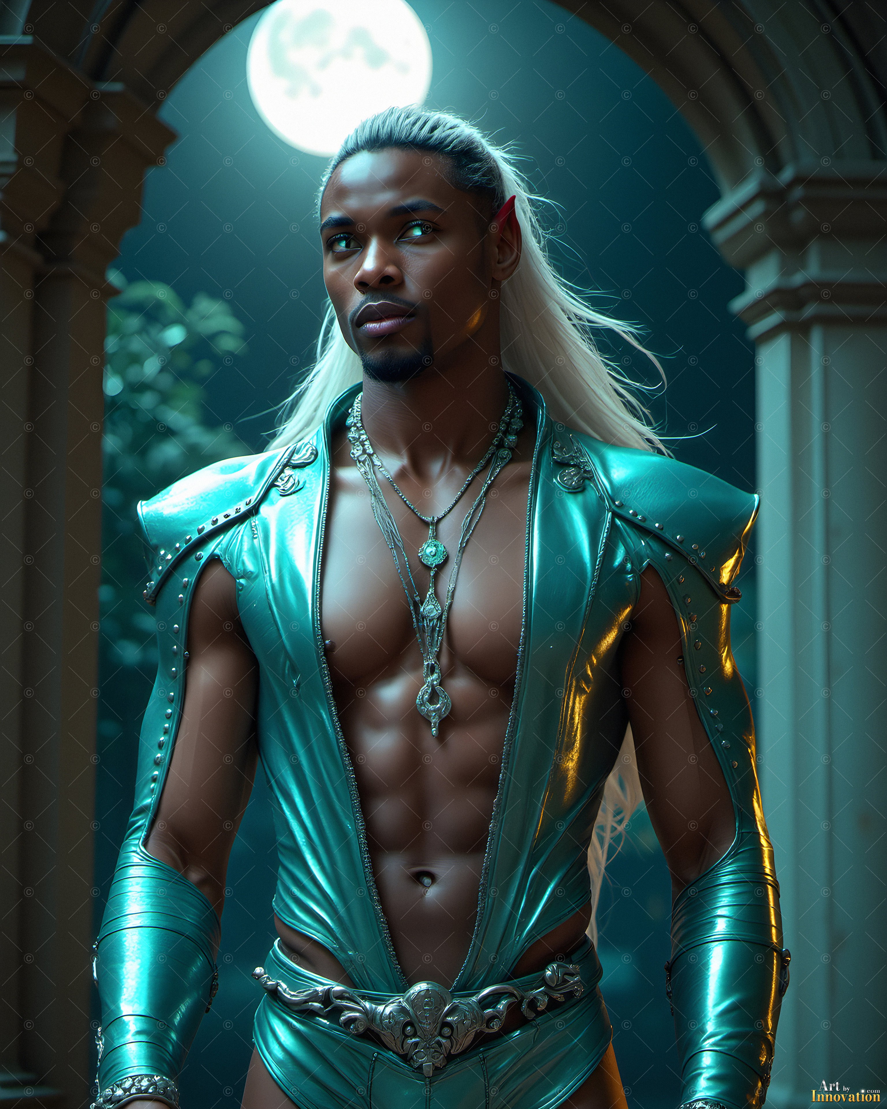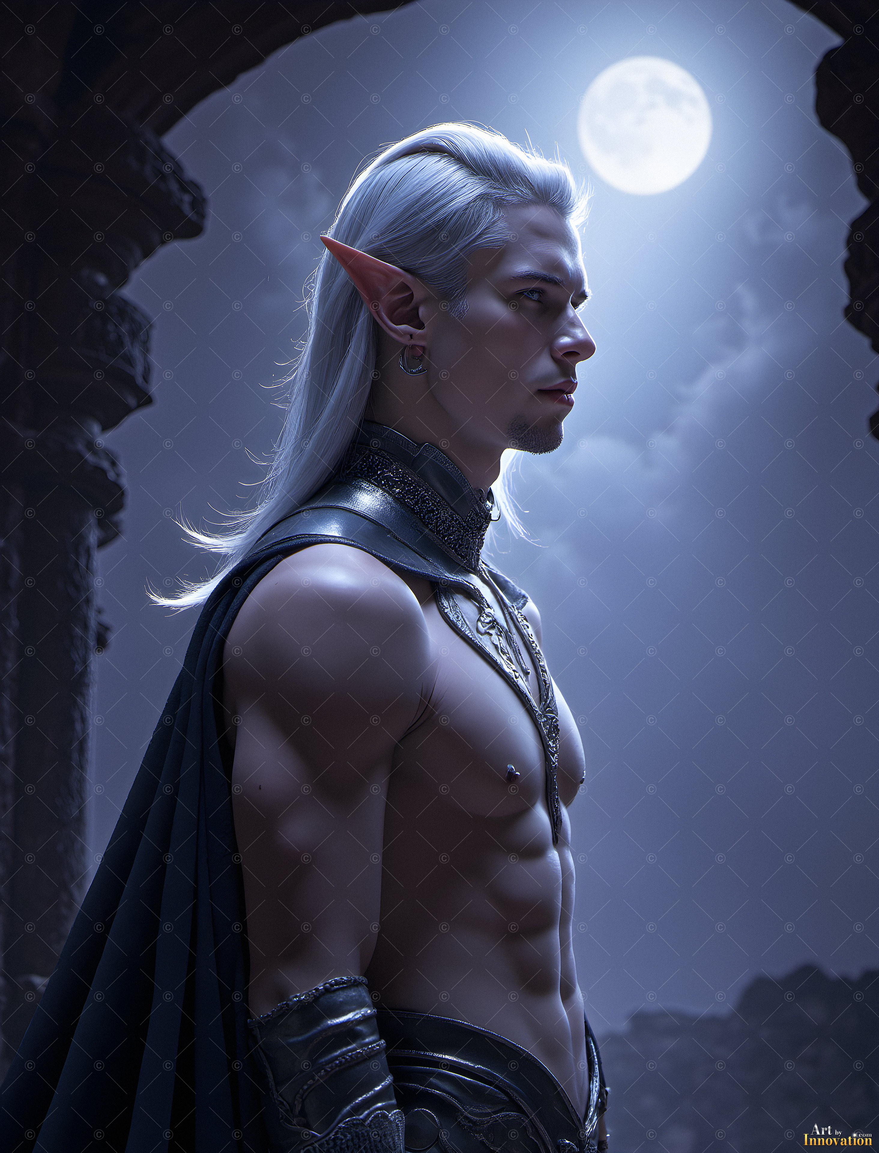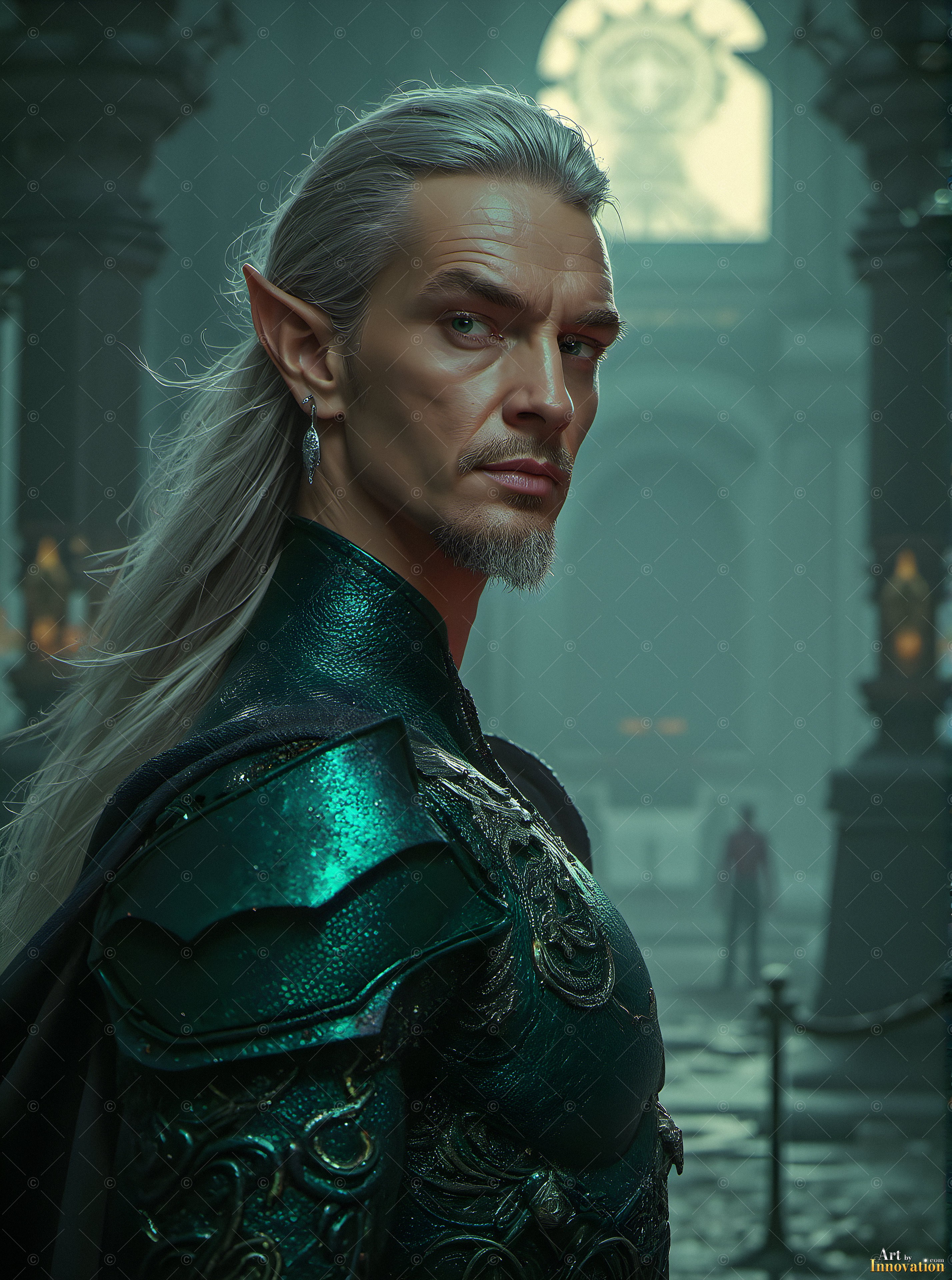 Handsome Male Elves, majestic young male elf standing in an elaborate elven background, in a dark ethereal realm. With pointed ears, wearing glamorous, luxurious, and fierce outfits is an Elven city, full of handsome, and sexy, shirtless elf men, that are adorned with shimmering, iridescent armor.