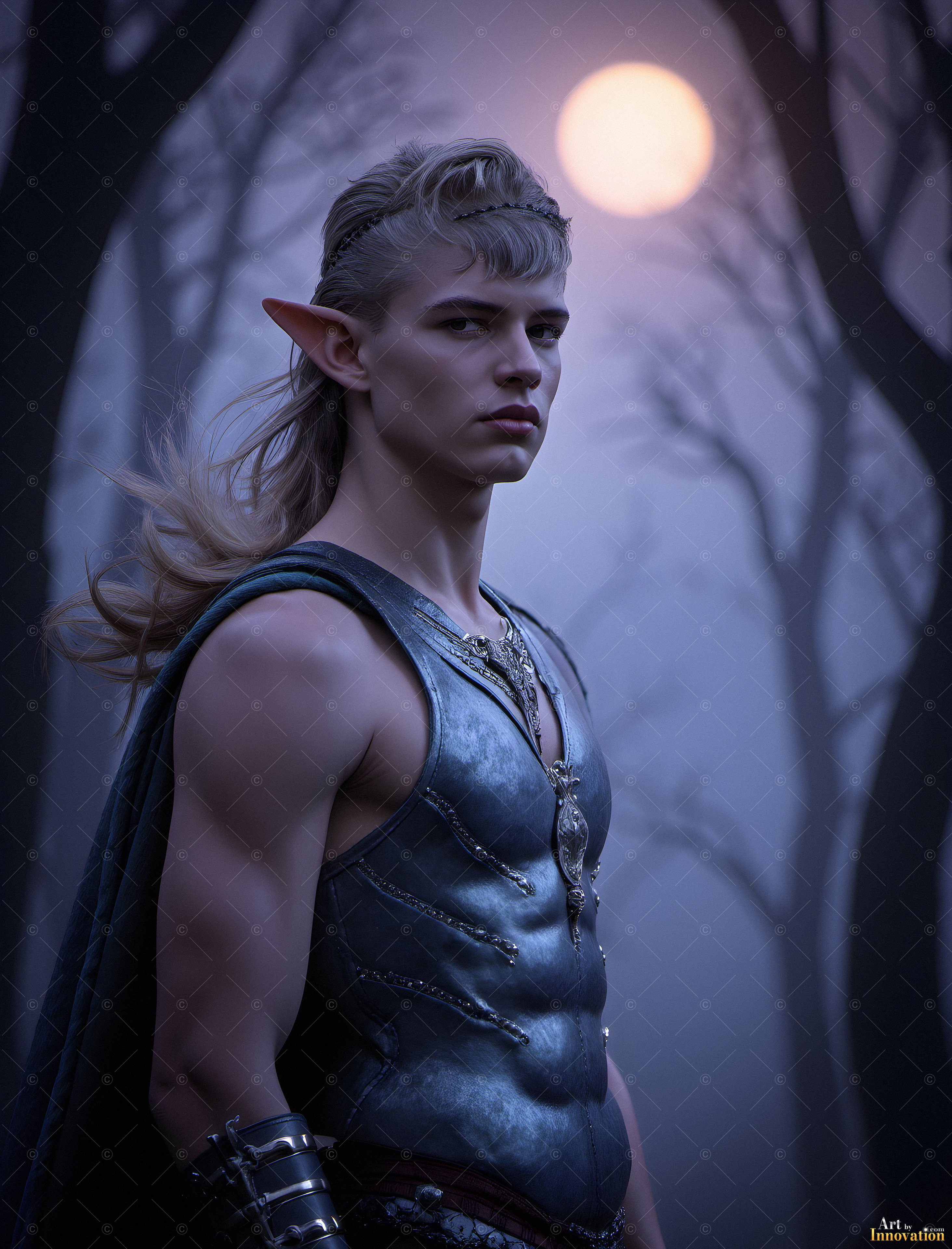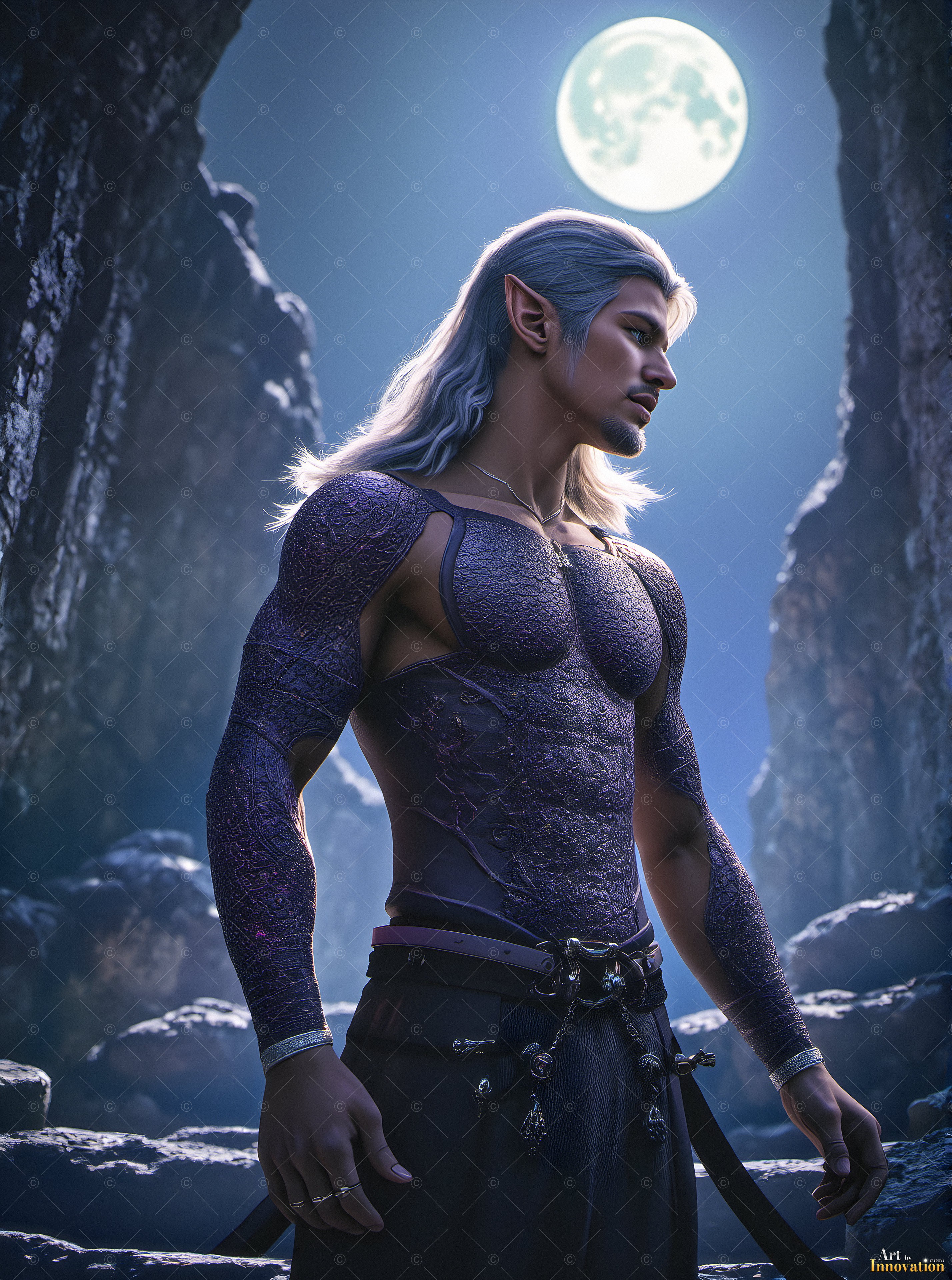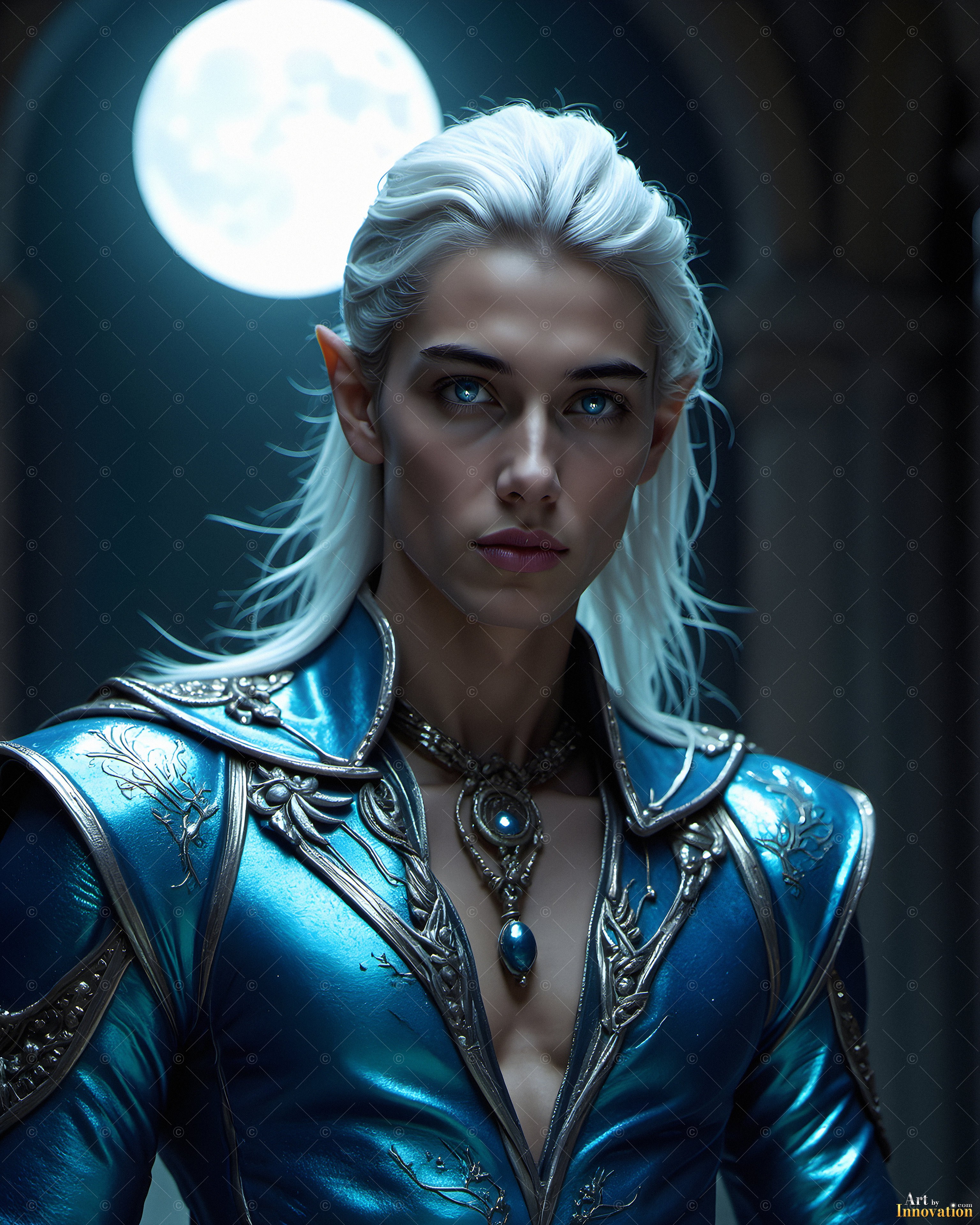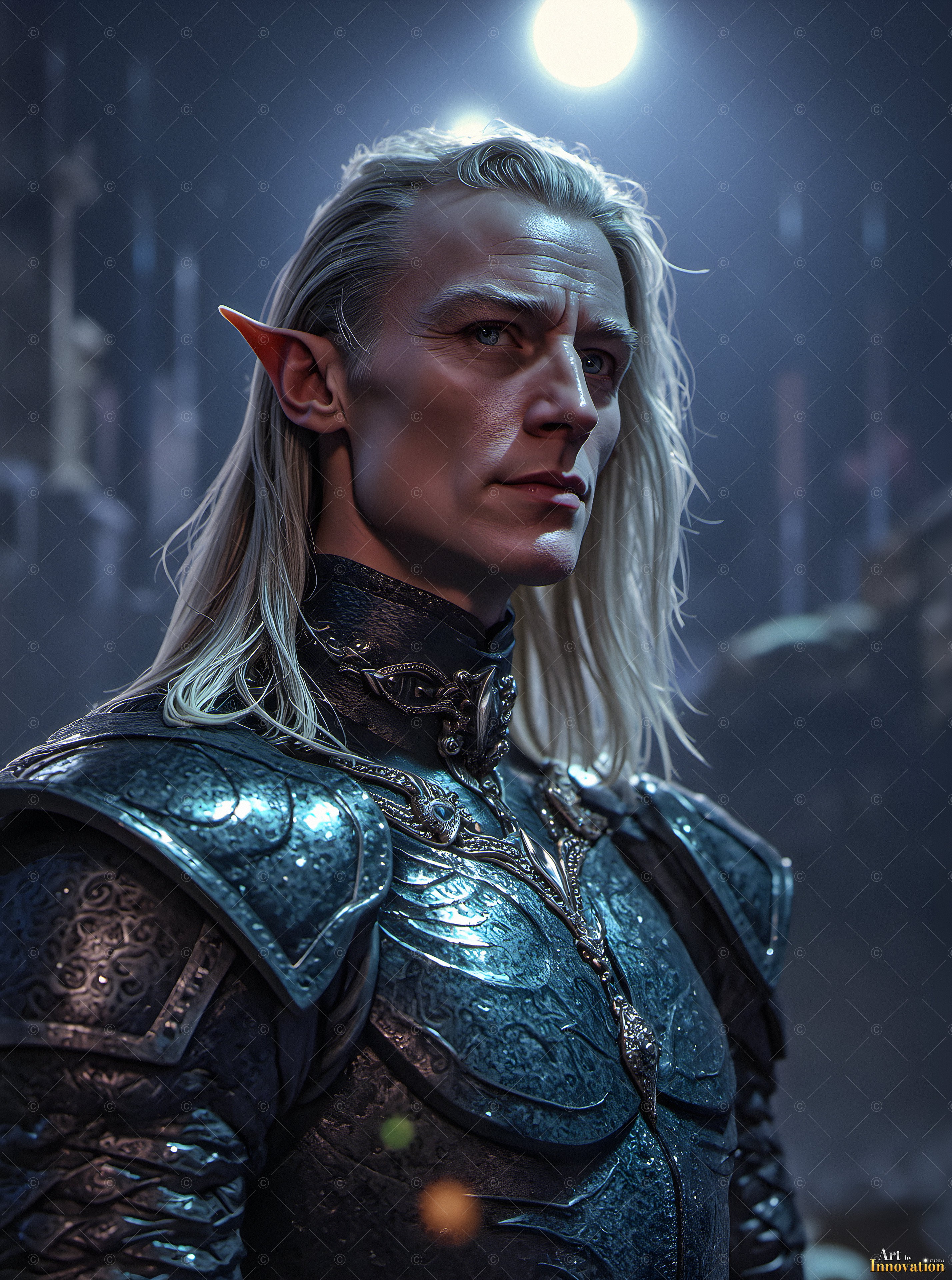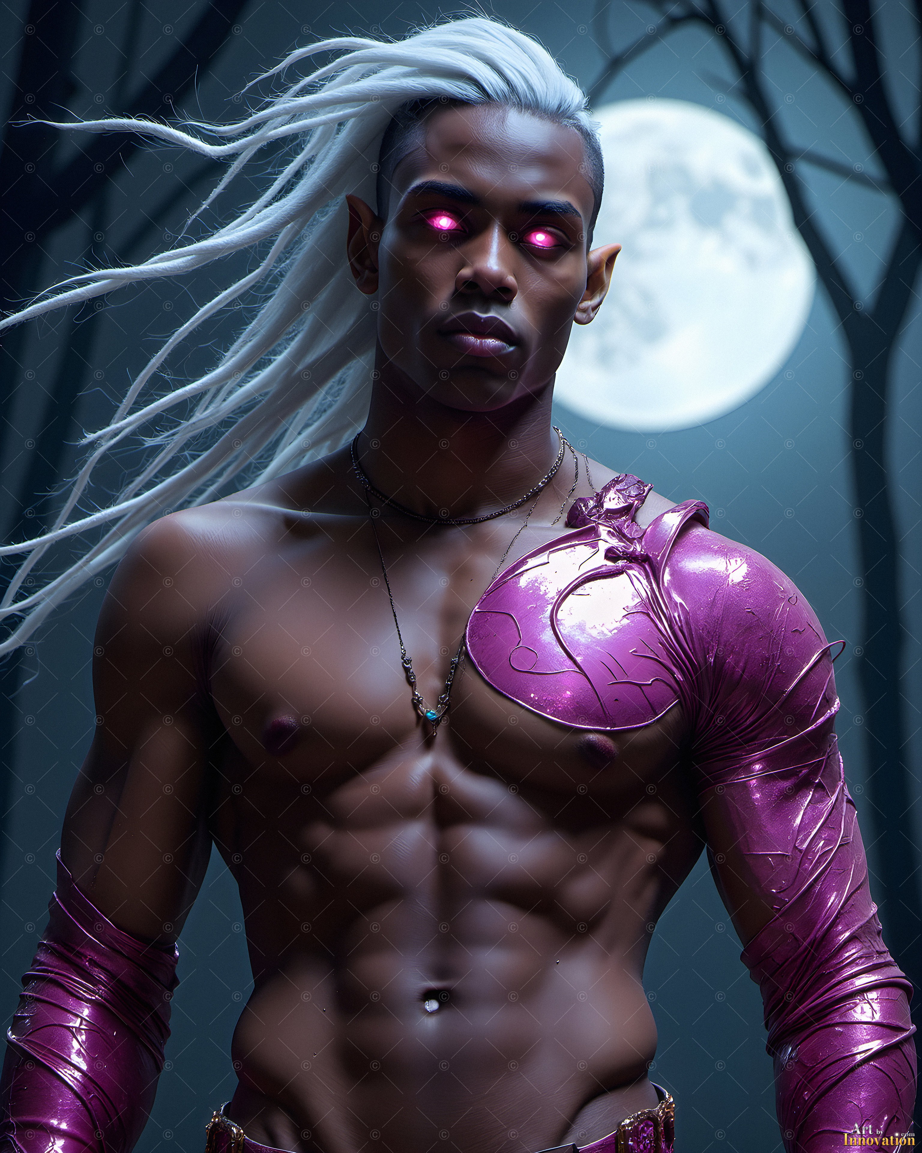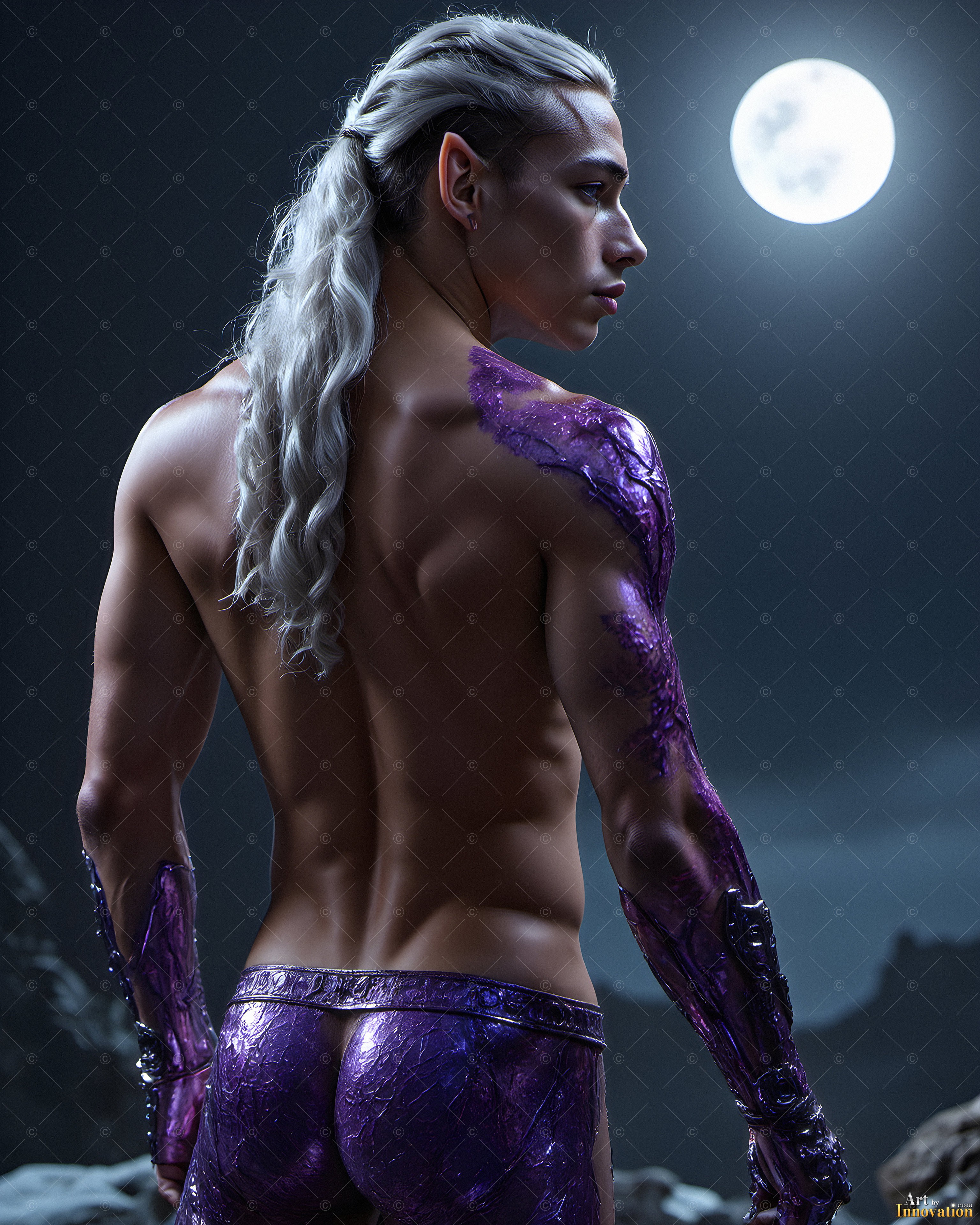 Handsome Male Elves, majestic young male elf standing in an elaborate elven background, in a dark ethereal realm. With pointed ears, wearing glamorous, luxurious, and fierce outfits is an Elven city, full of handsome, and sexy, shirtless elf men, that are adorned with shimmering, iridescent armor.