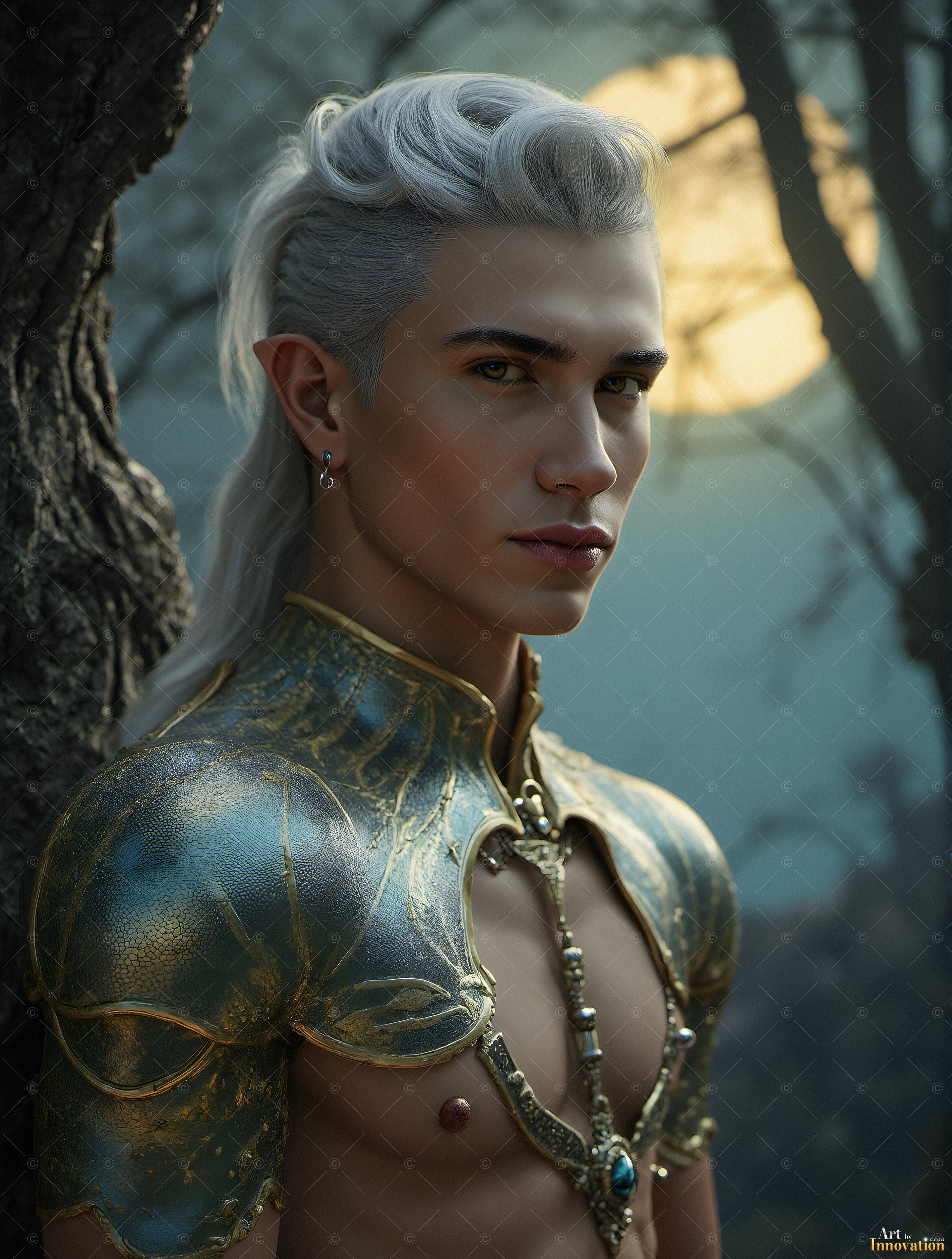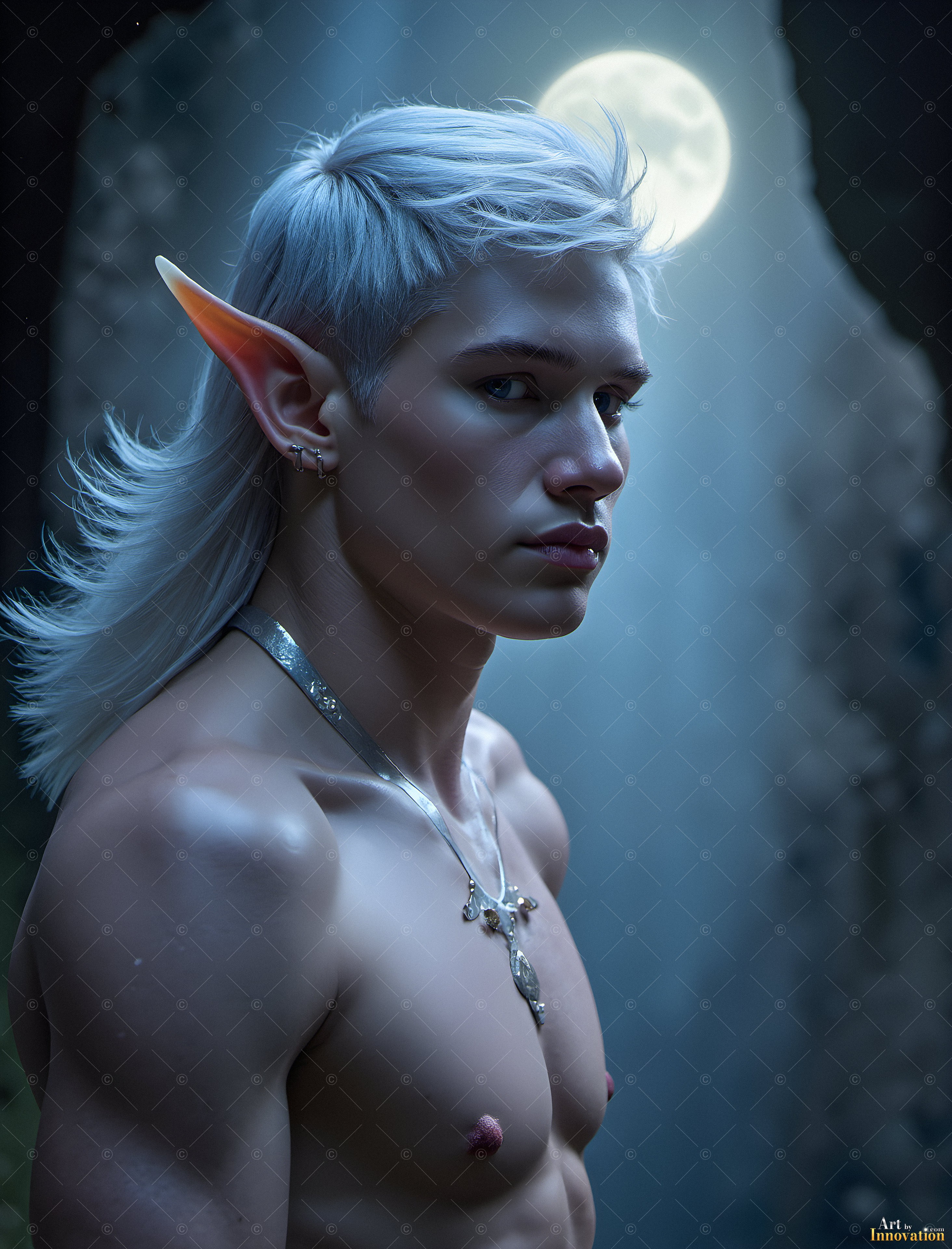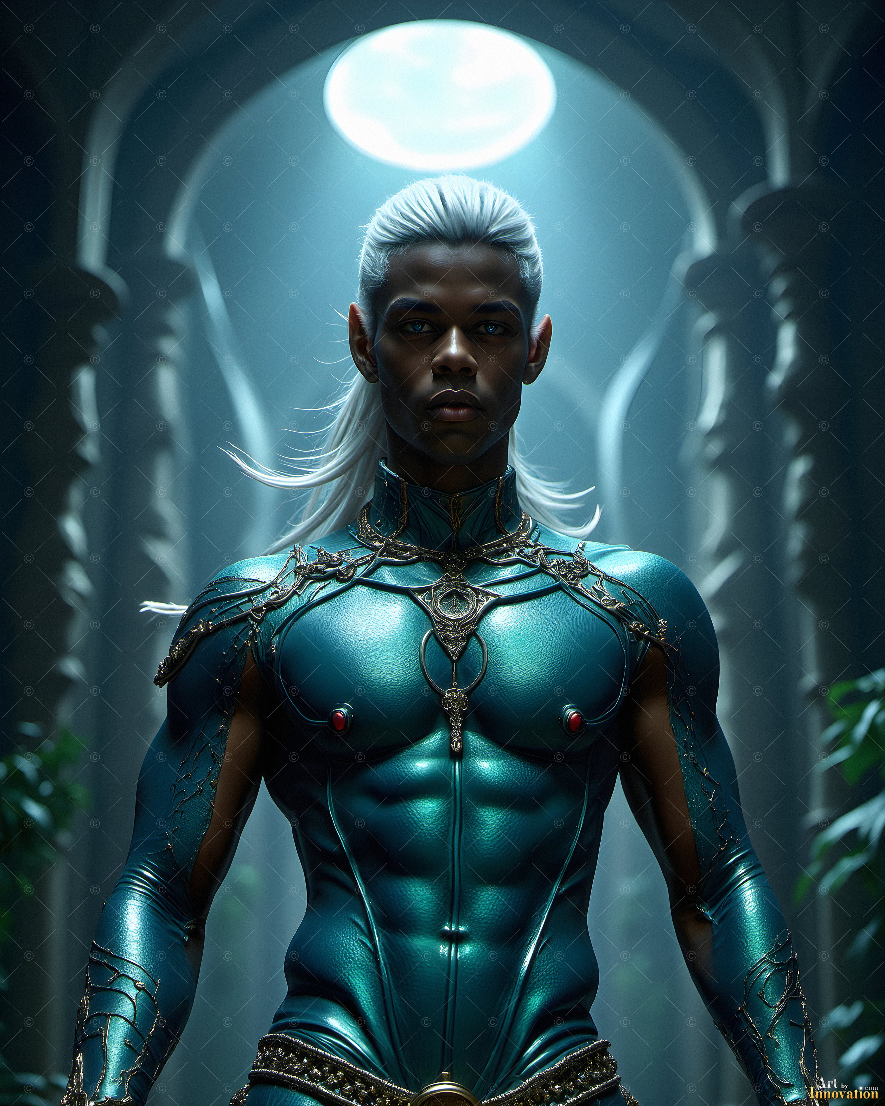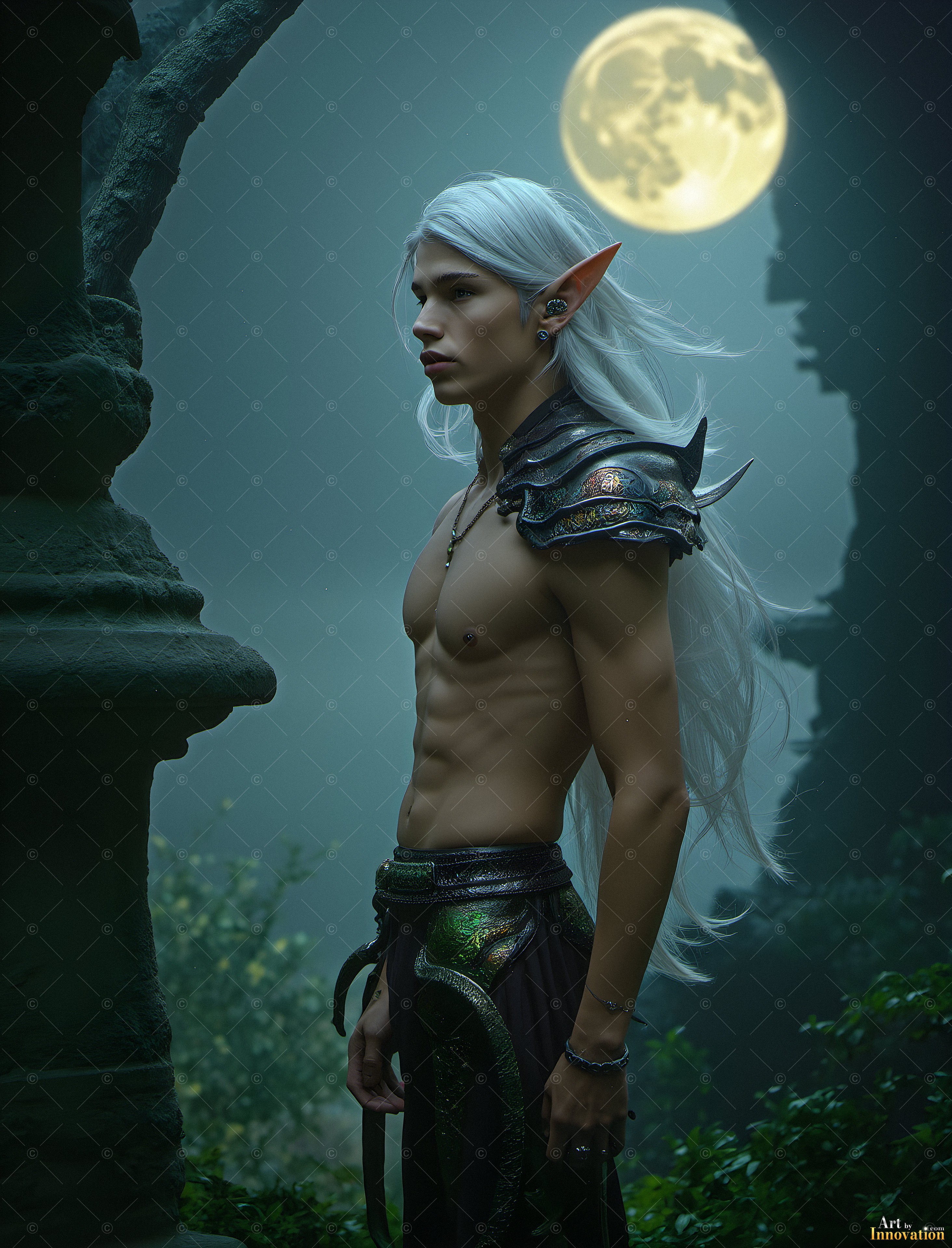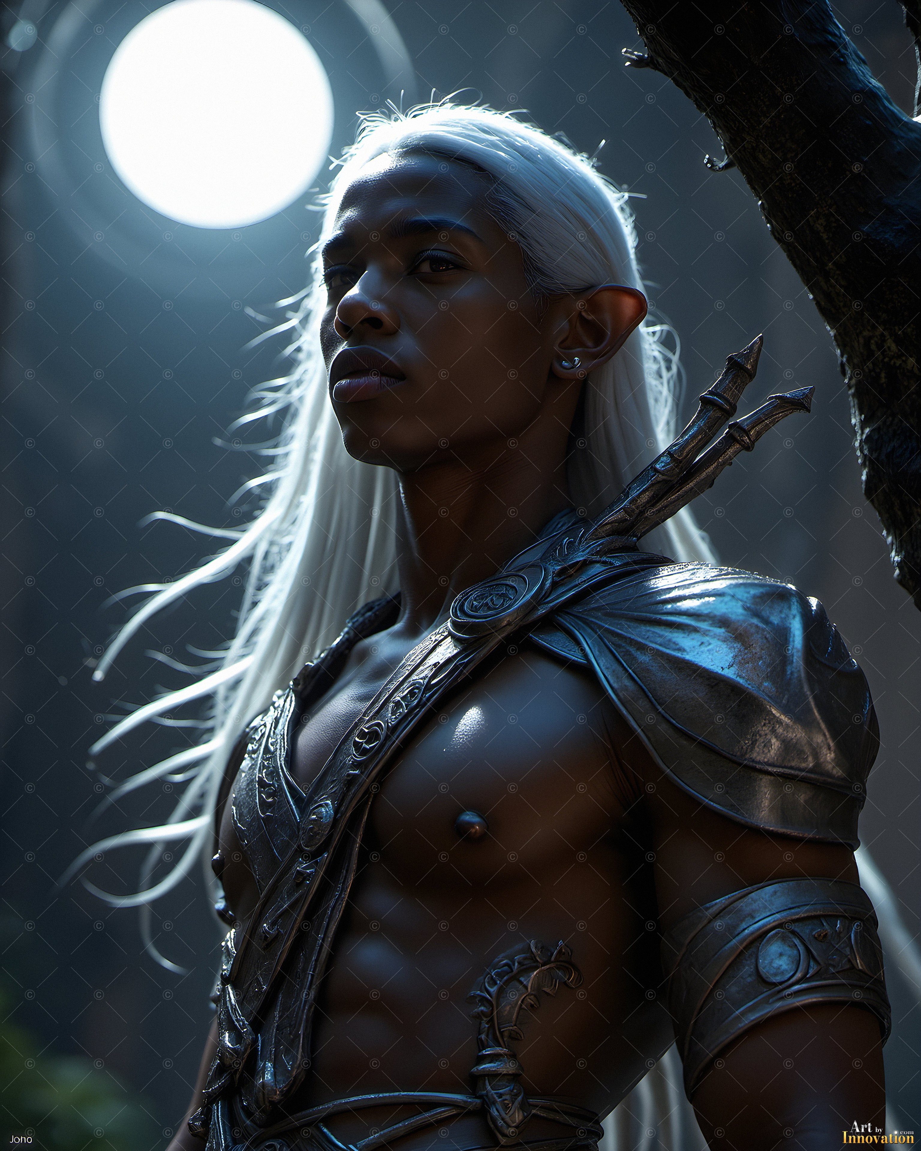 Handsome Male Elves, majestic young male elf standing in an elaborate elven background, in a dark ethereal realm. With pointed ears, wearing glamorous, luxurious, and fierce outfits is an Elven city, full of handsome, and sexy, shirtless elf men, that are adorned with shimmering, iridescent armor.