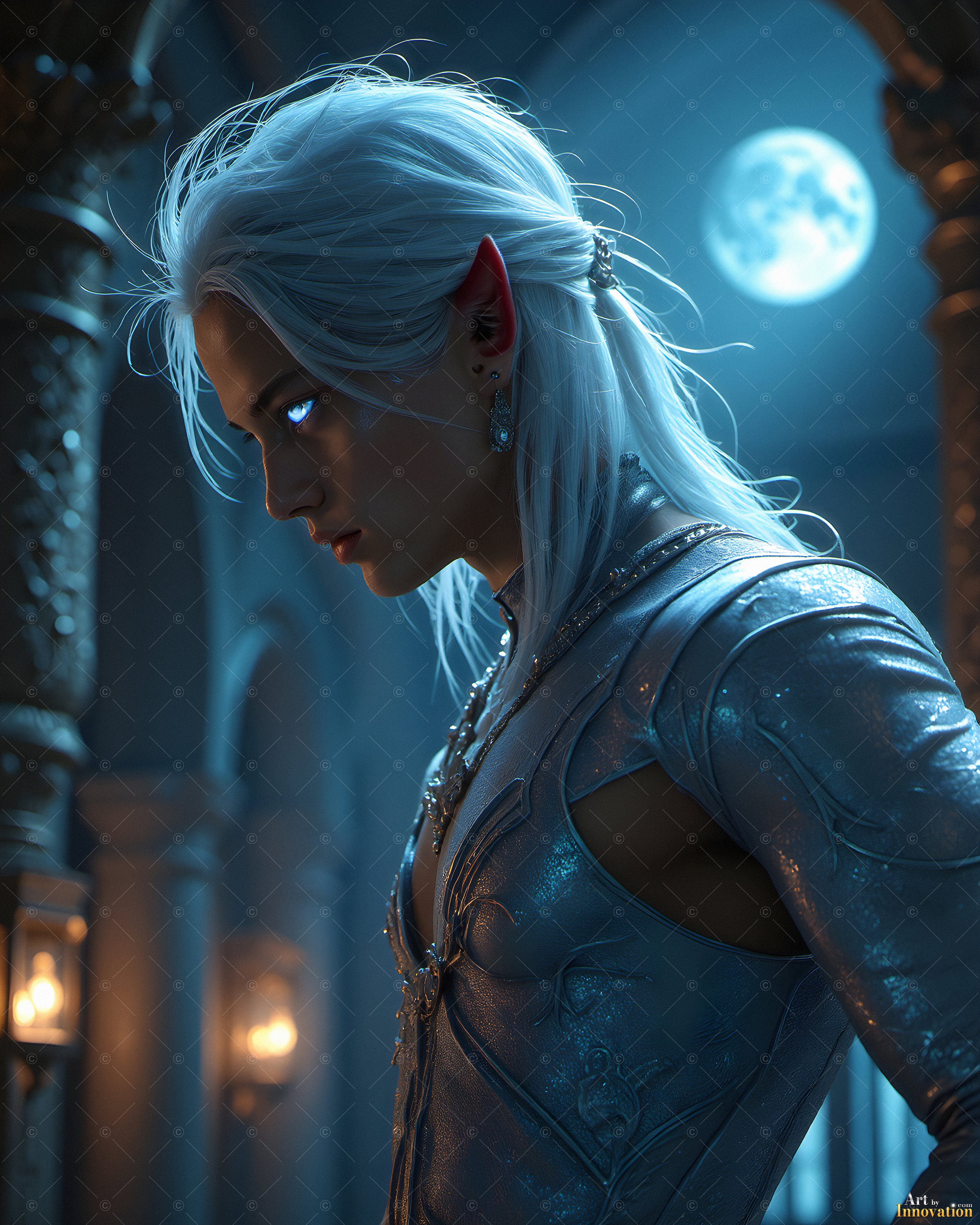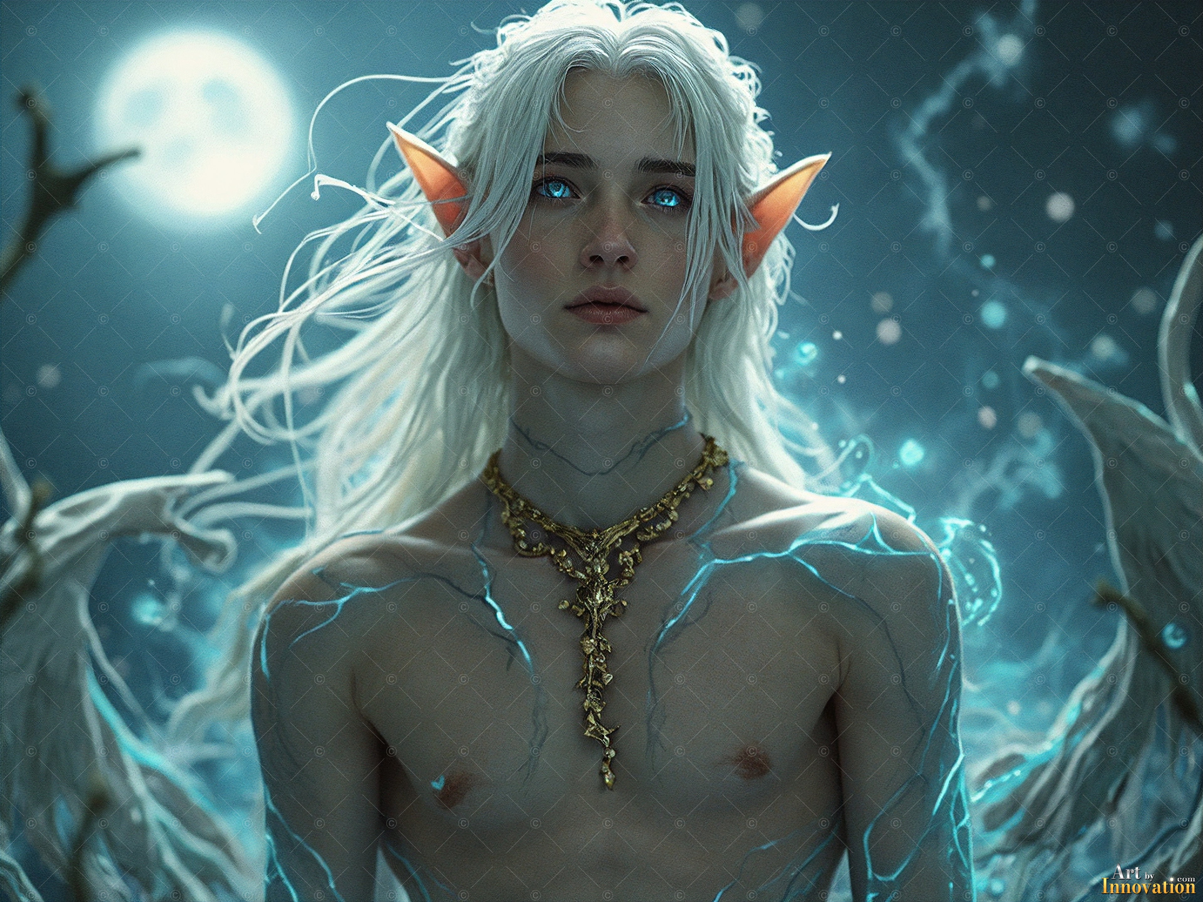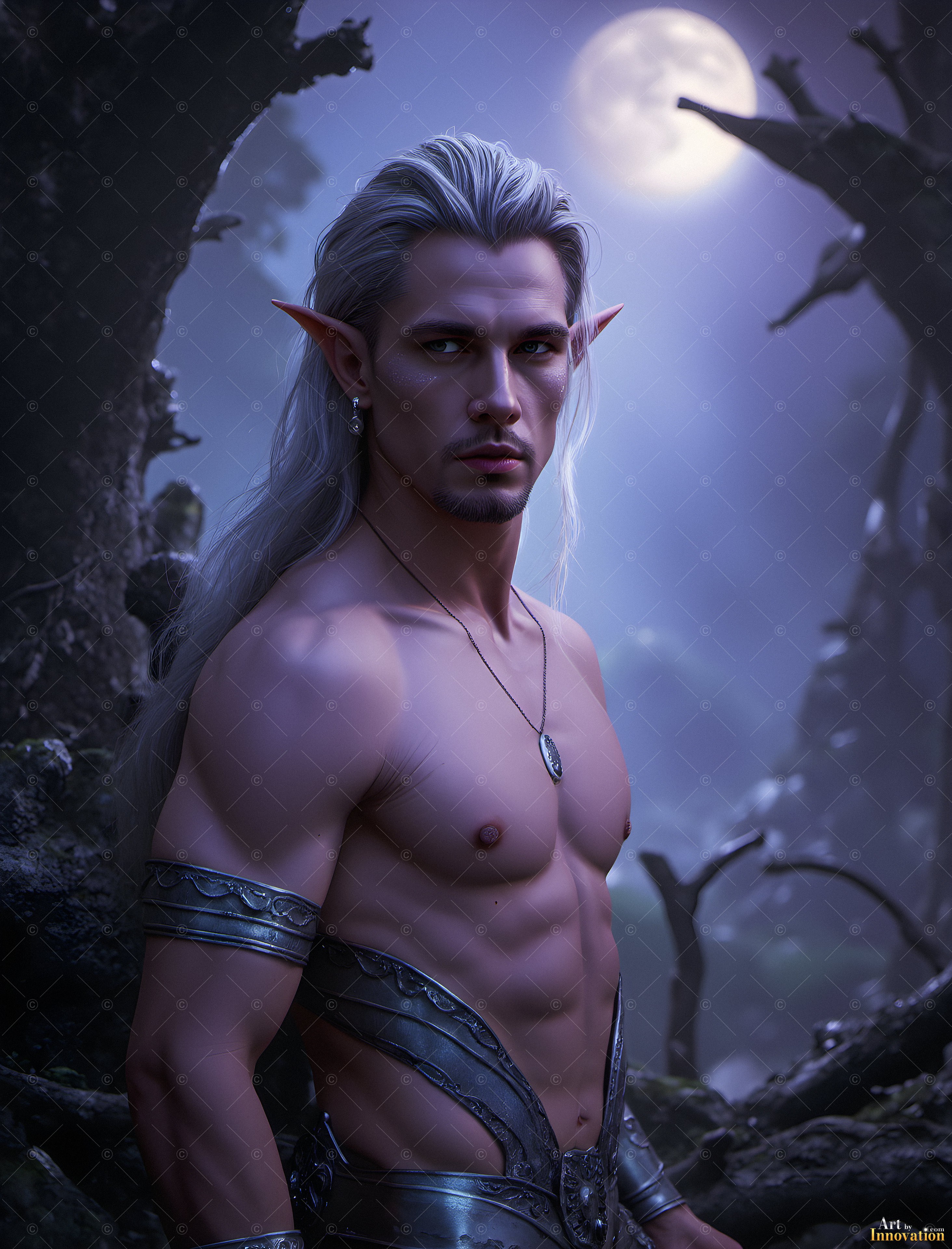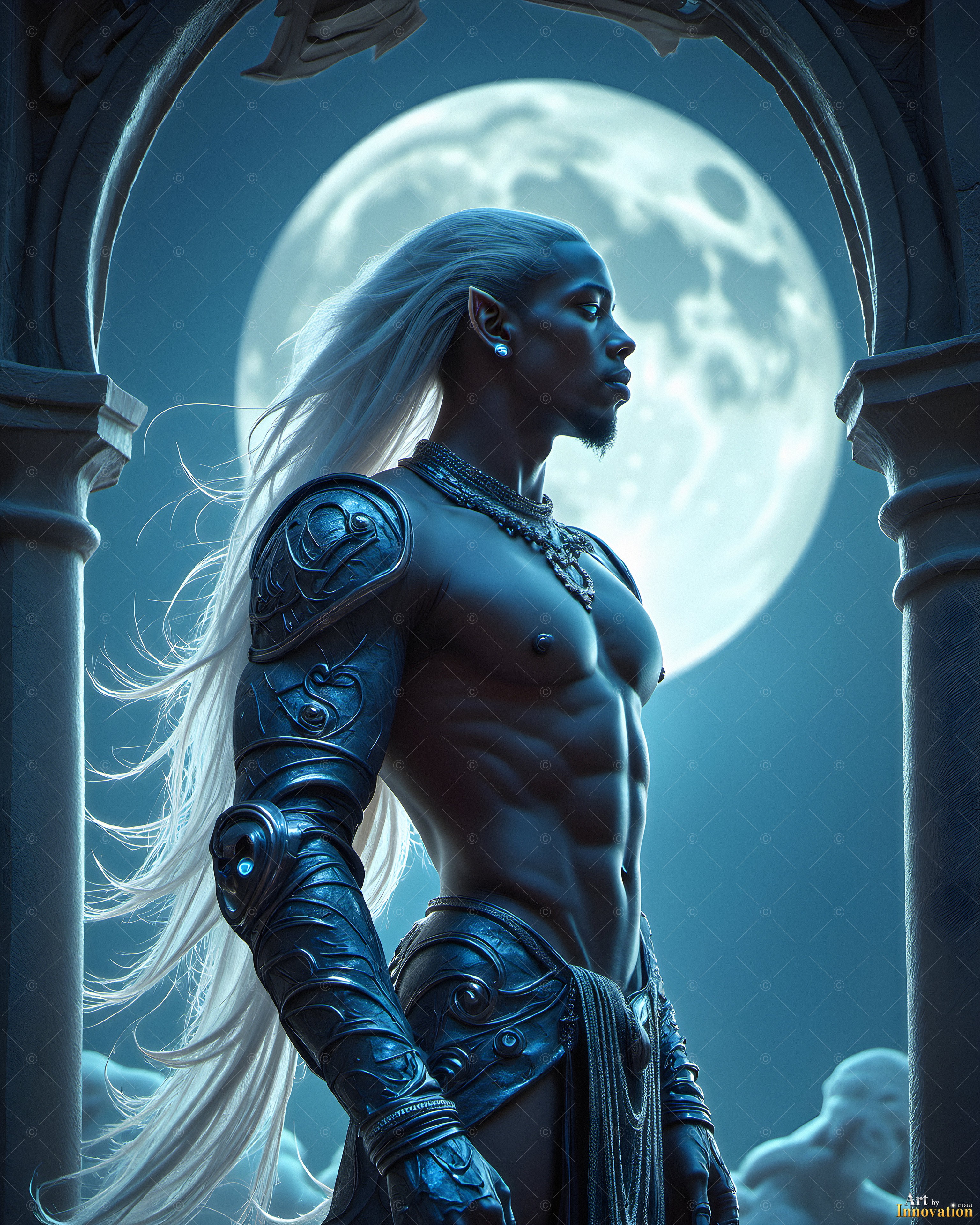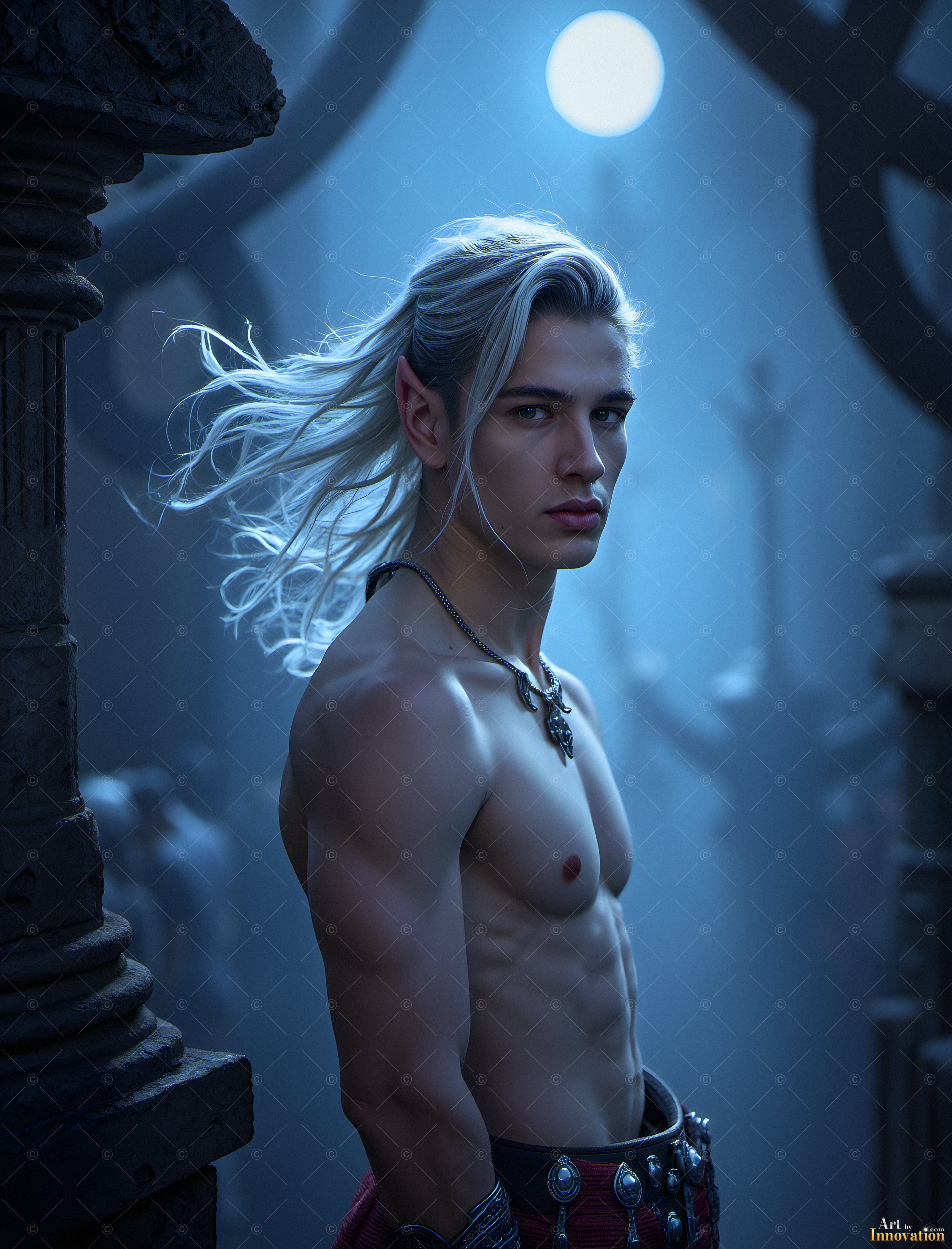 Handsome Male Elves, majestic young male elf standing in an elaborate elven background, in a dark ethereal realm. With pointed ears, wearing glamorous, luxurious, and fierce outfits is an Elven city, full of handsome, and sexy, shirtless elf men, that are adorned with shimmering, iridescent armor.