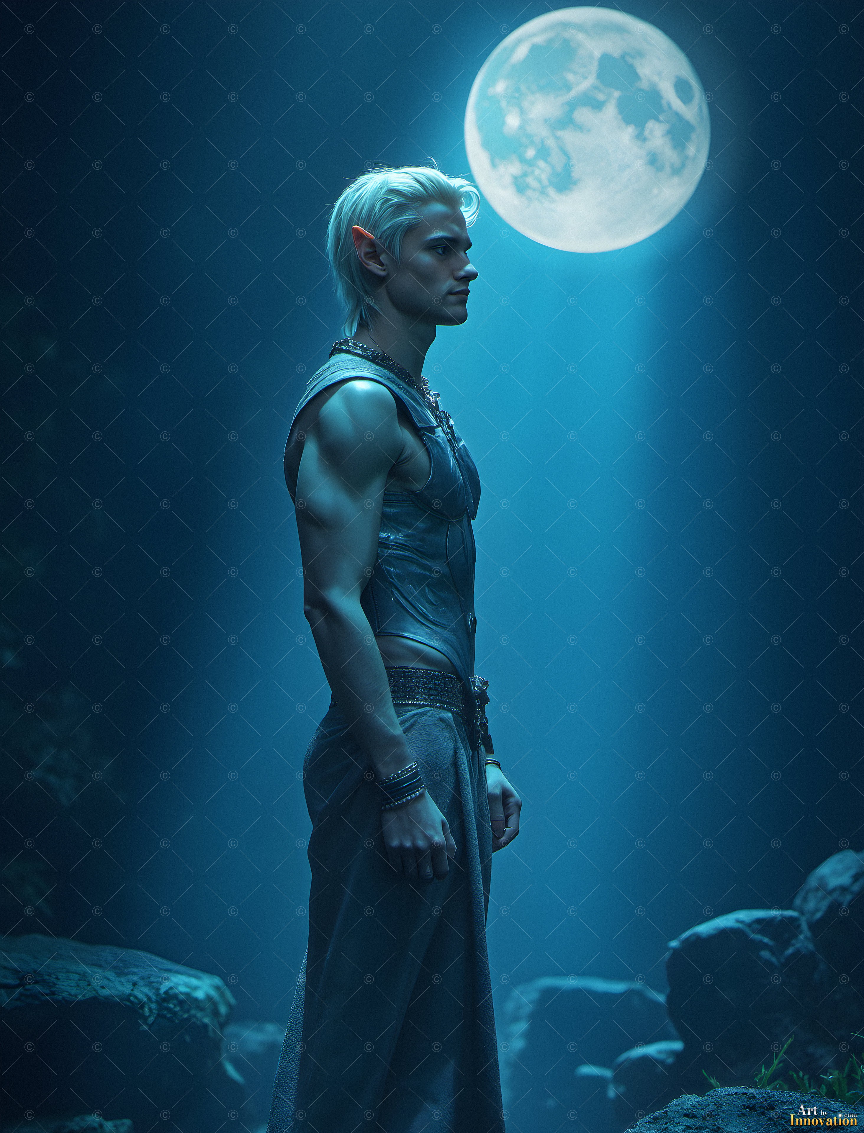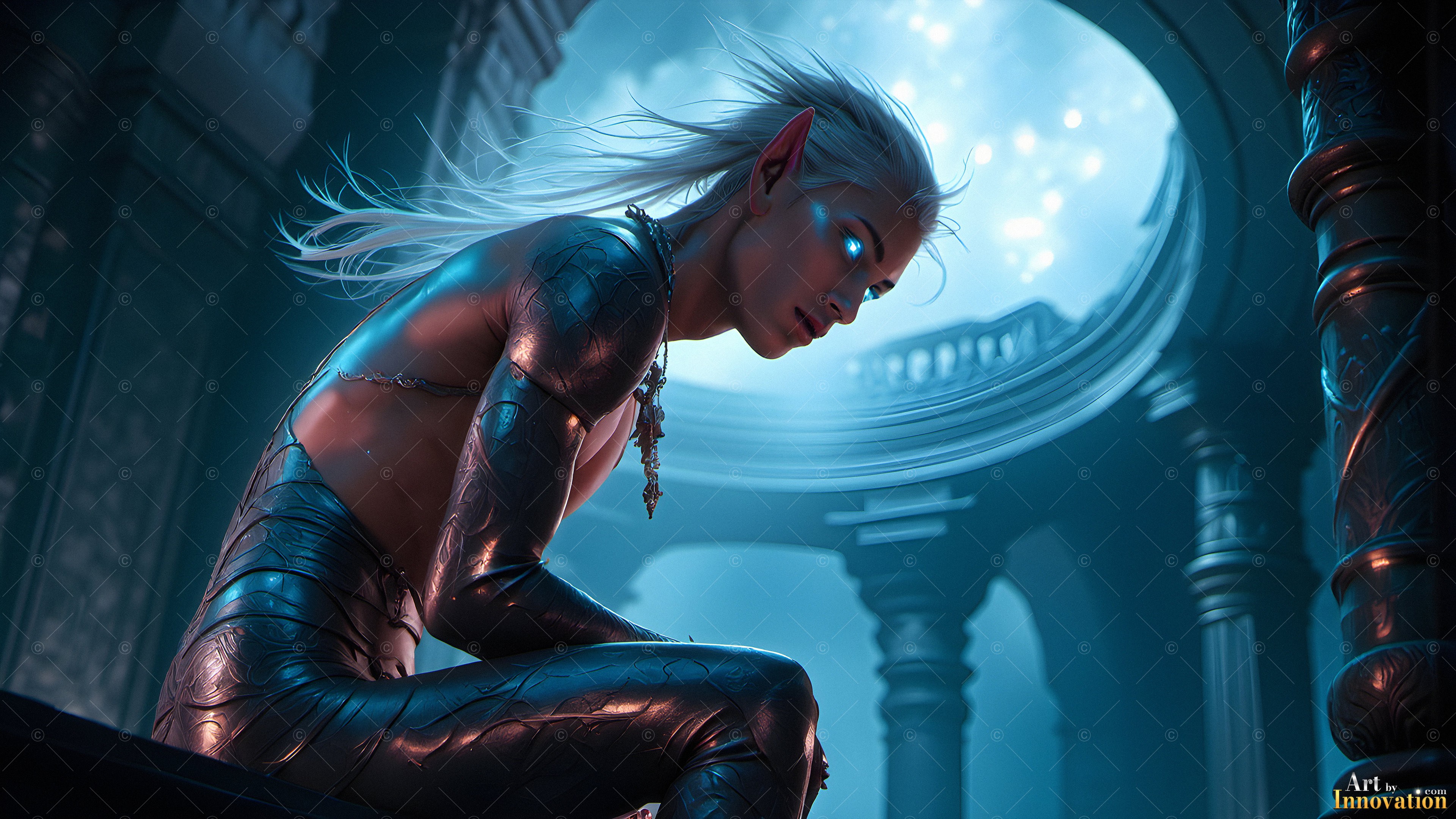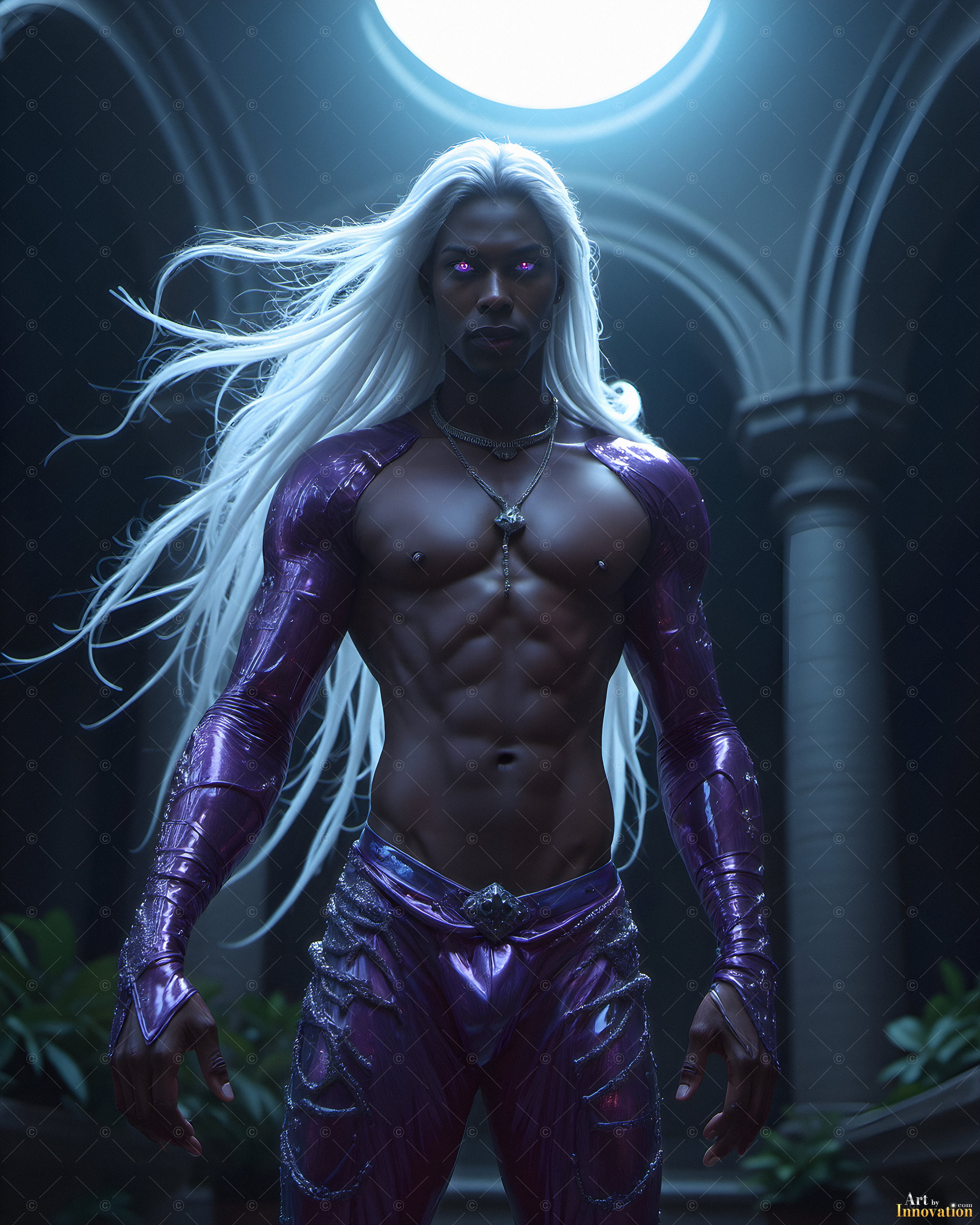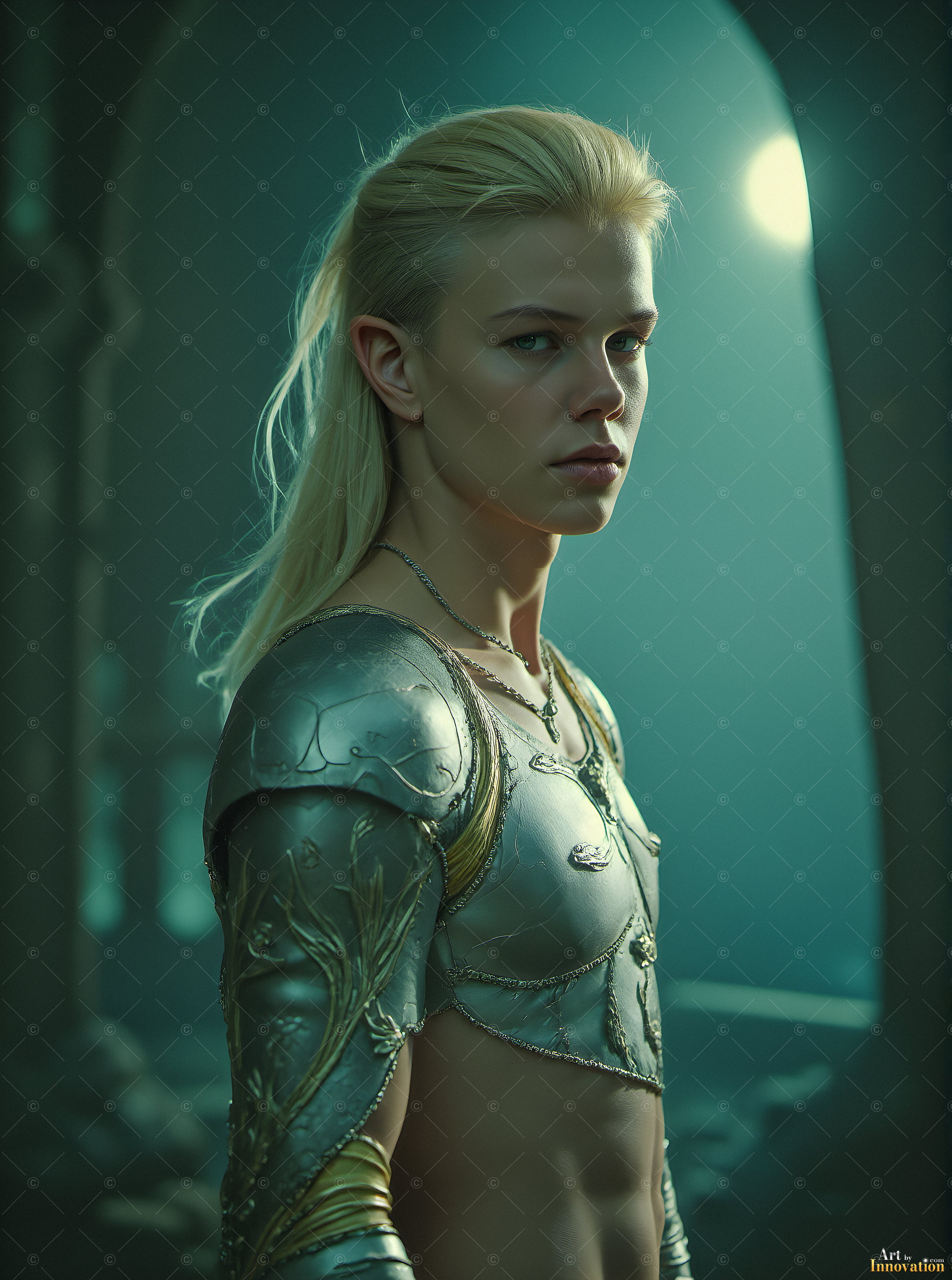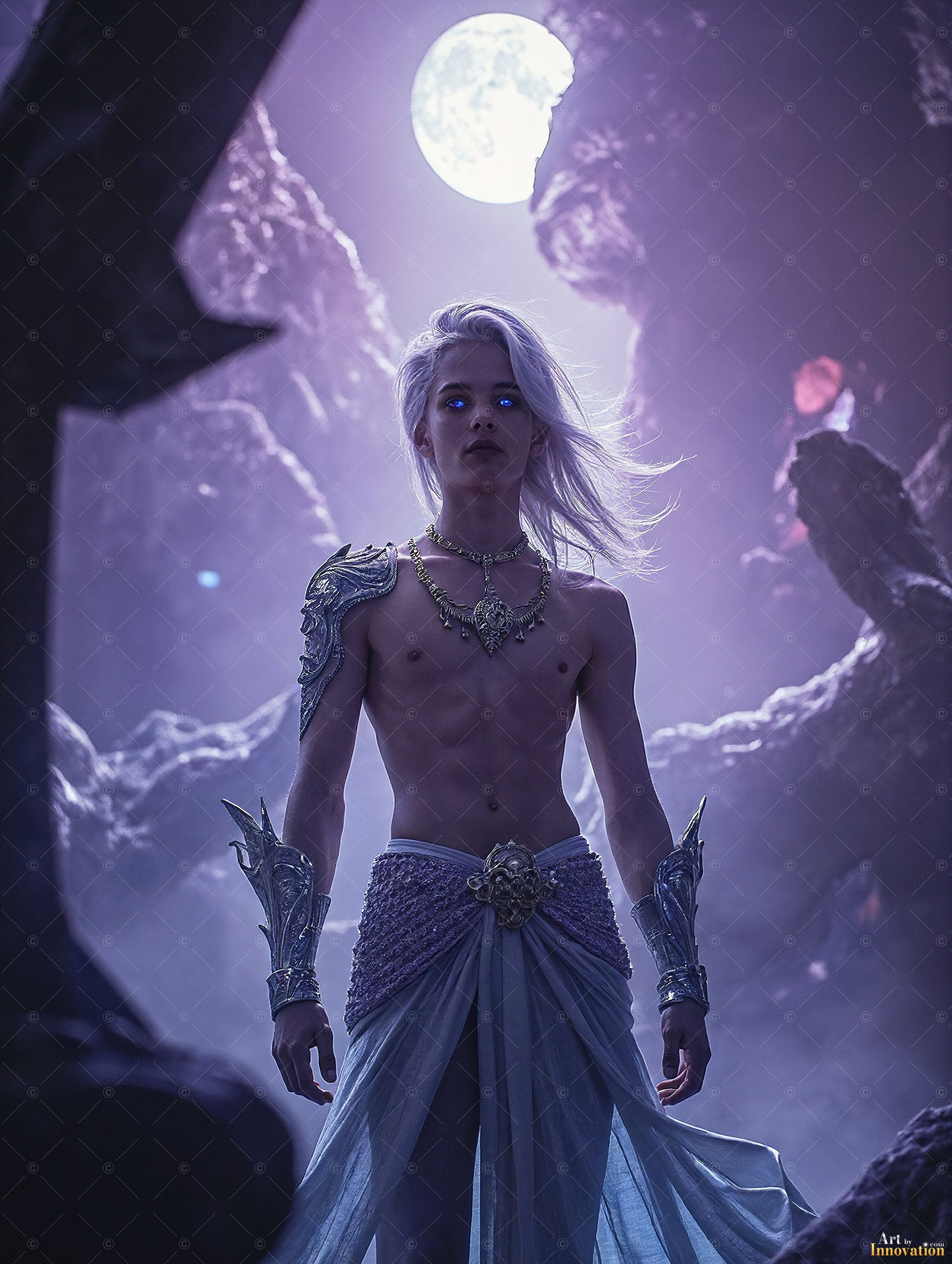 Handsome Male Elves, majestic young male elf standing in an elaborate elven background, in a dark ethereal realm. With pointed ears, wearing glamorous, luxurious, and fierce outfits is an Elven city, full of handsome, and sexy, shirtless elf men, that are adorned with shimmering, iridescent armor.