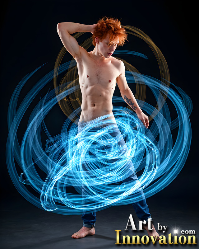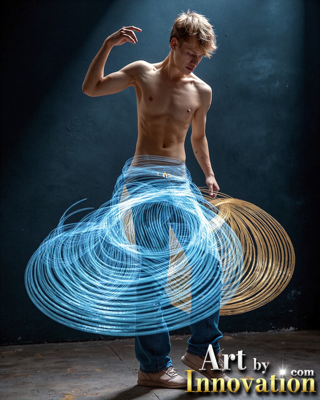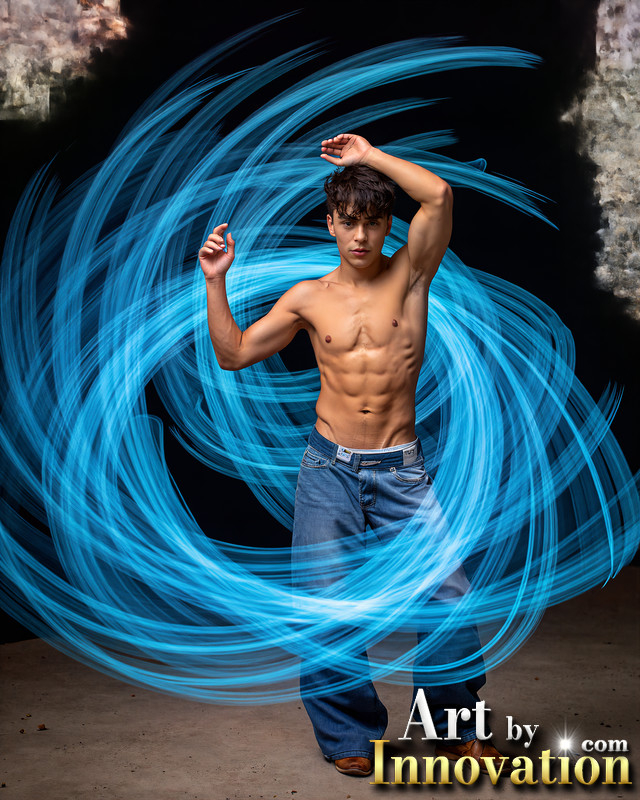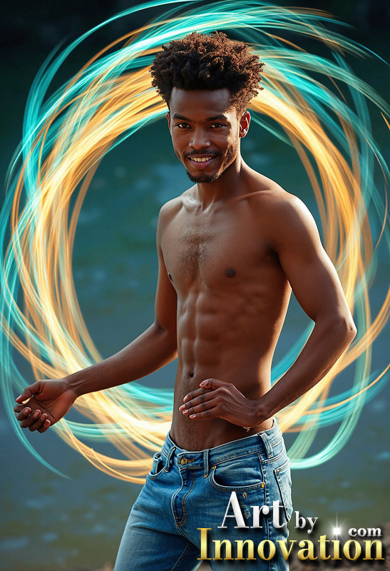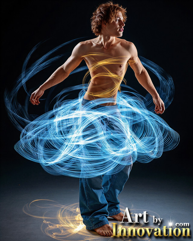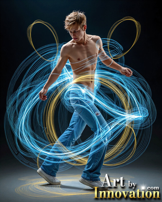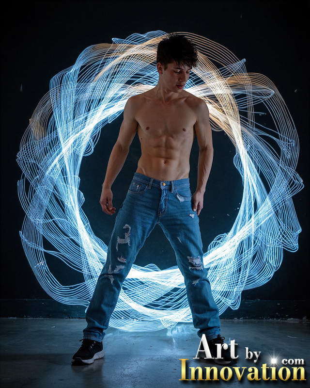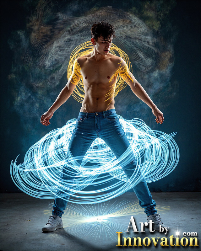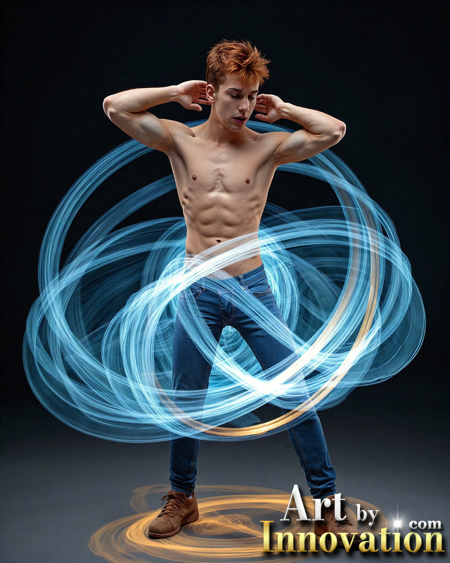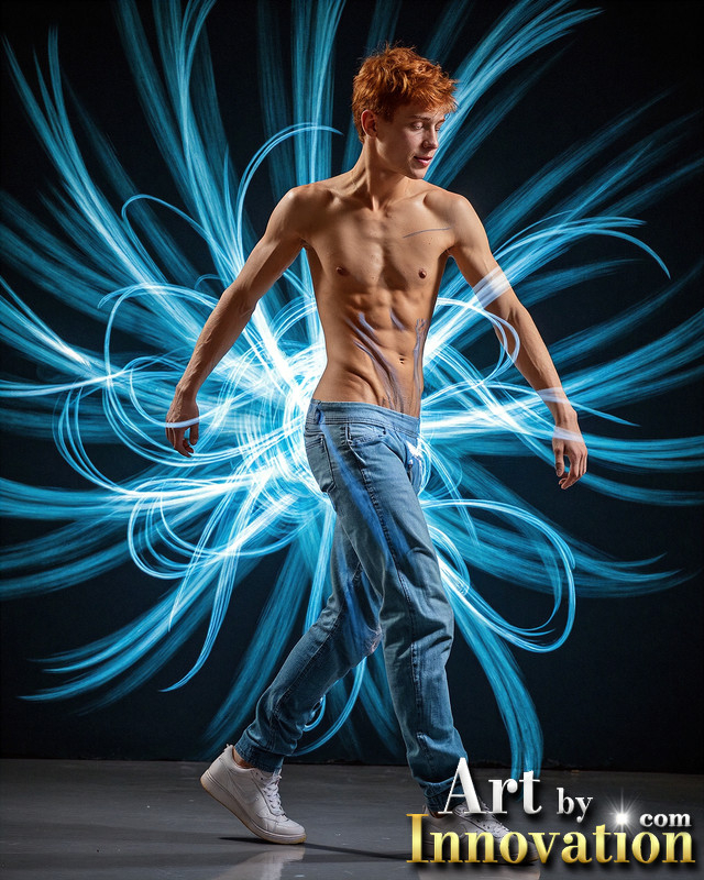 Photos of Handsome Shirtless Men Dancing with Light Rays,Colorful,in Motion.