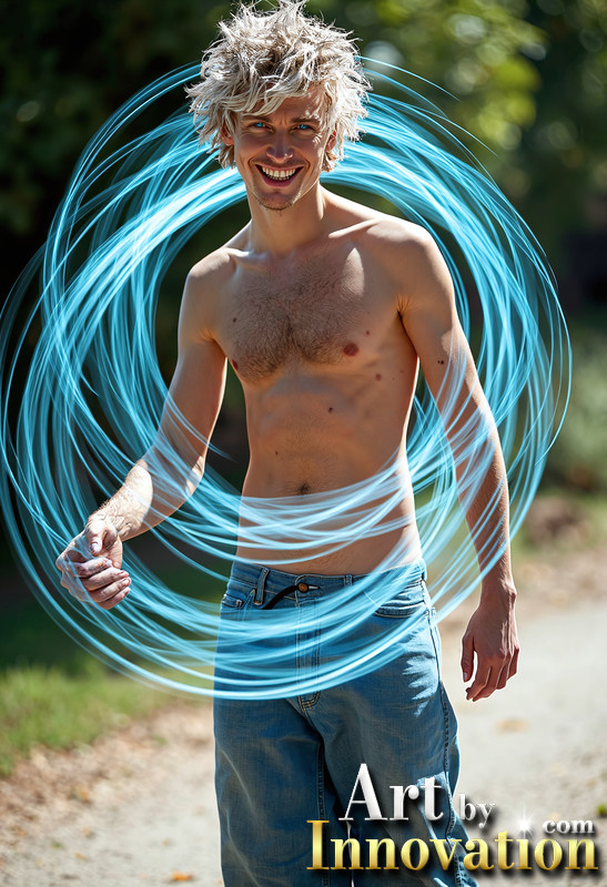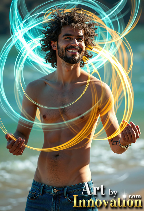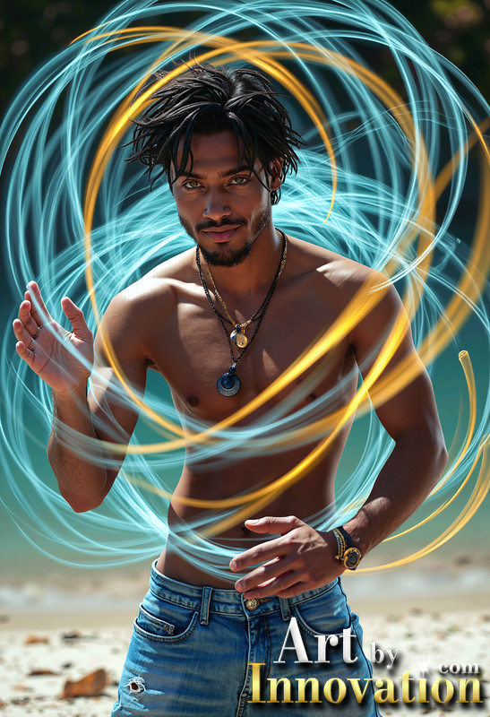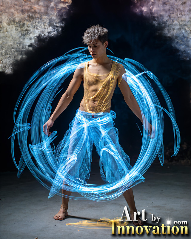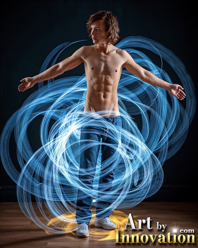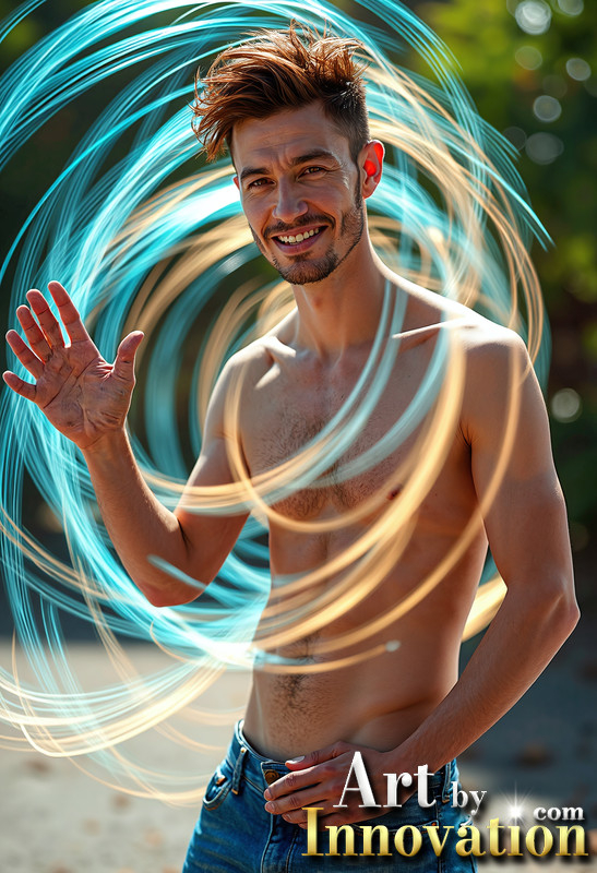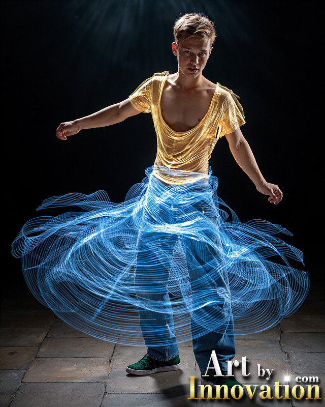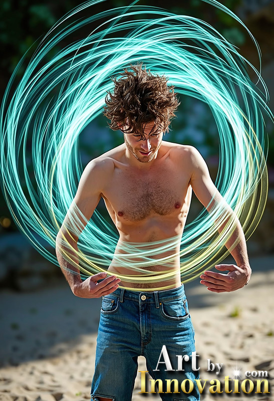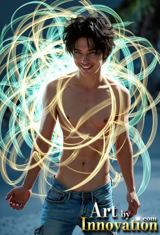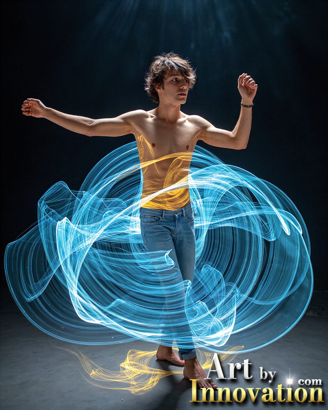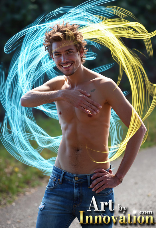 Photos of Handsome Shirtless Men Dancing with Light Rays,Colorful,in Motion.