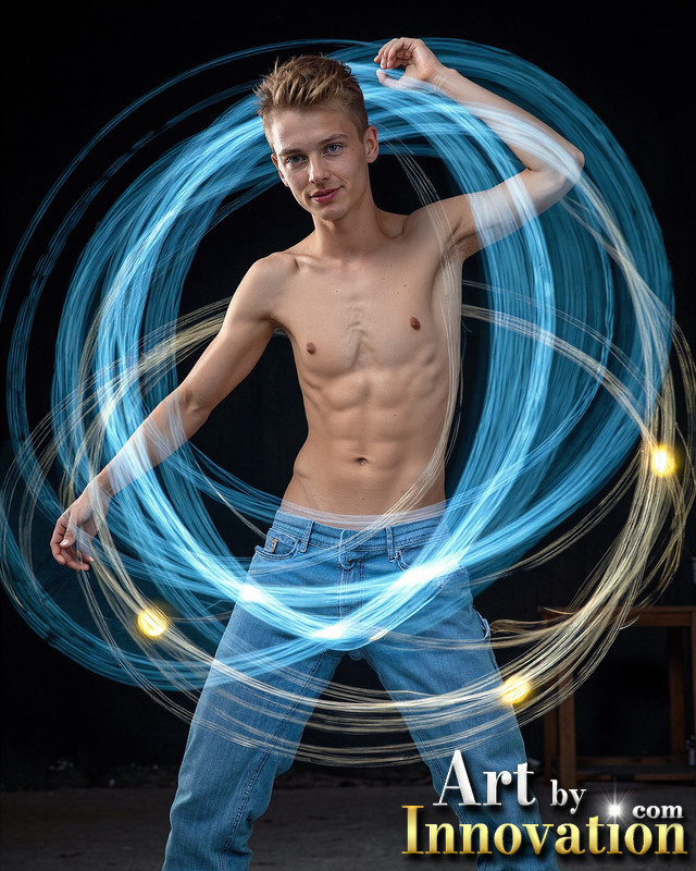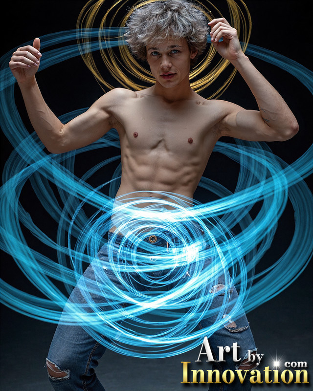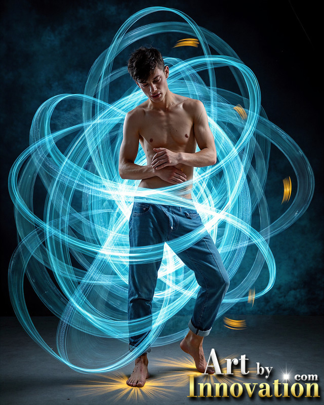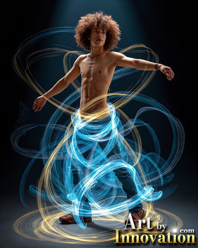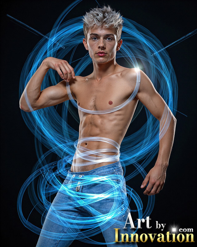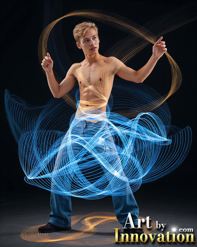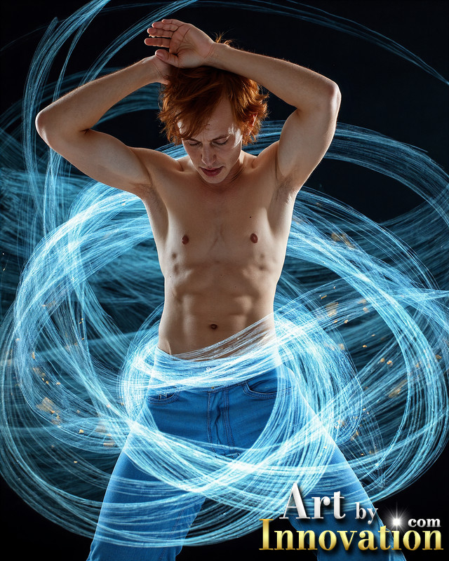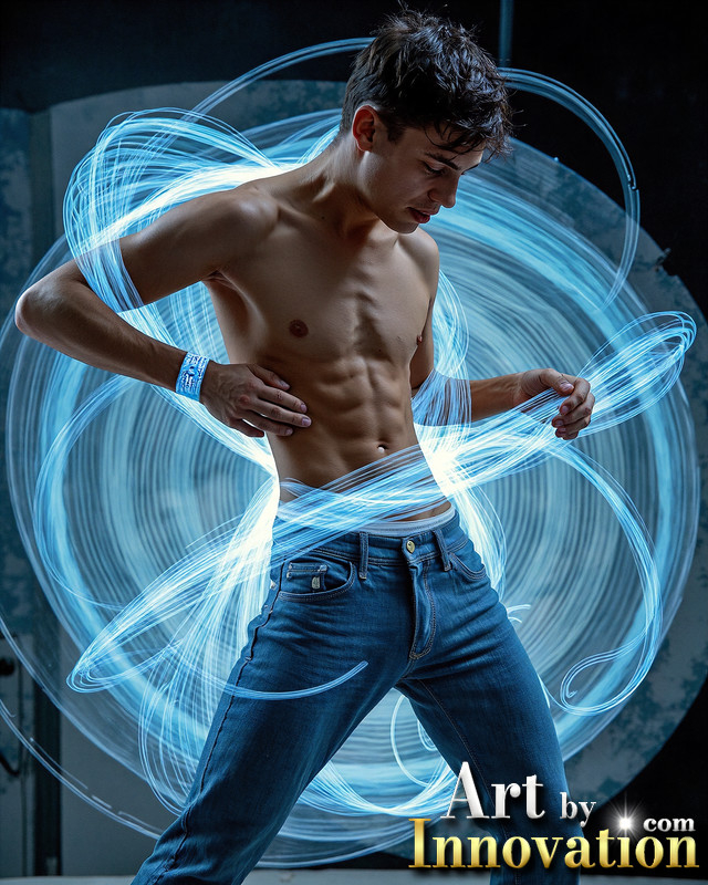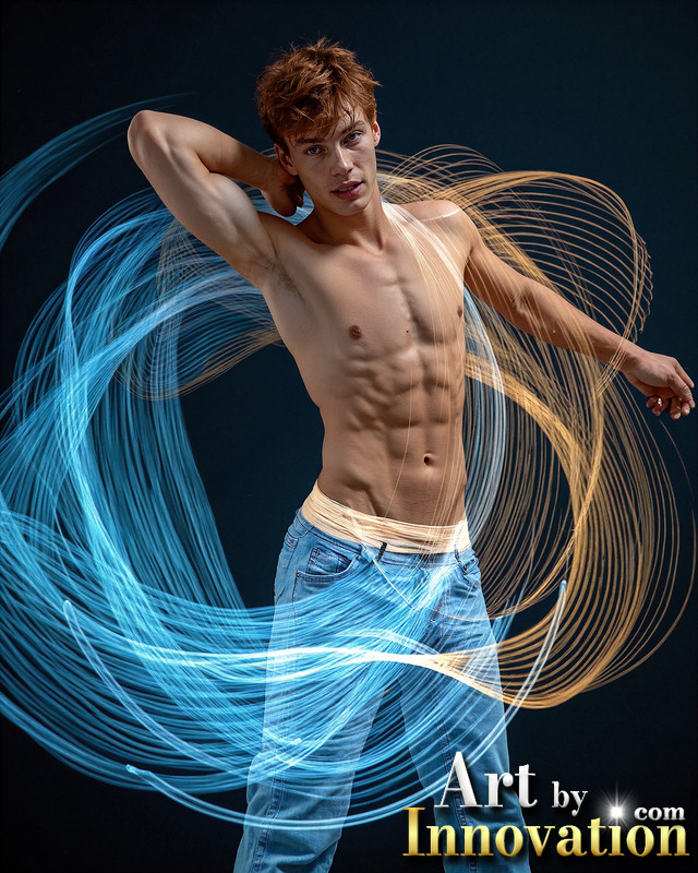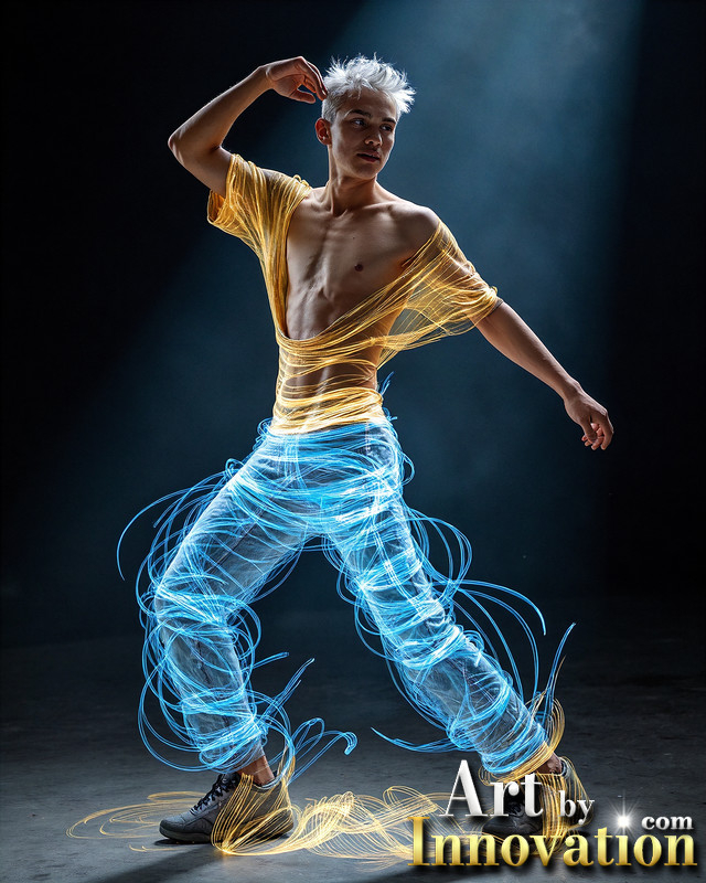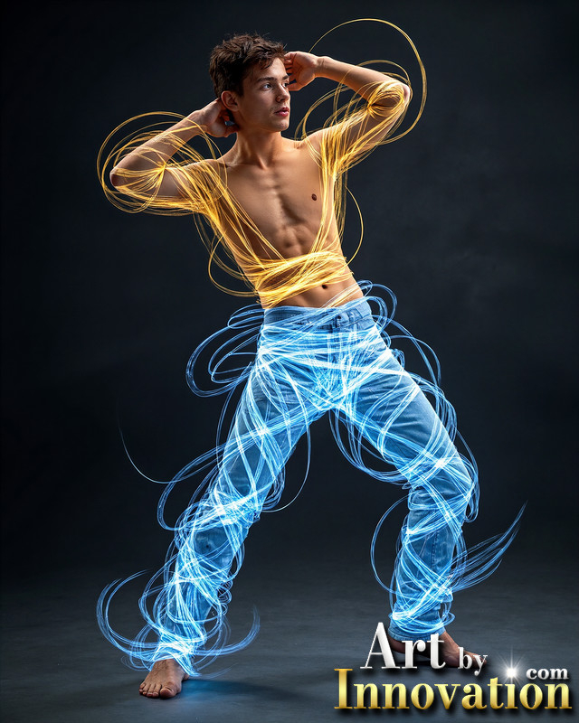 Photos of Handsome Shirtless Men Dancing with Light Rays,Colorful,in Motion.