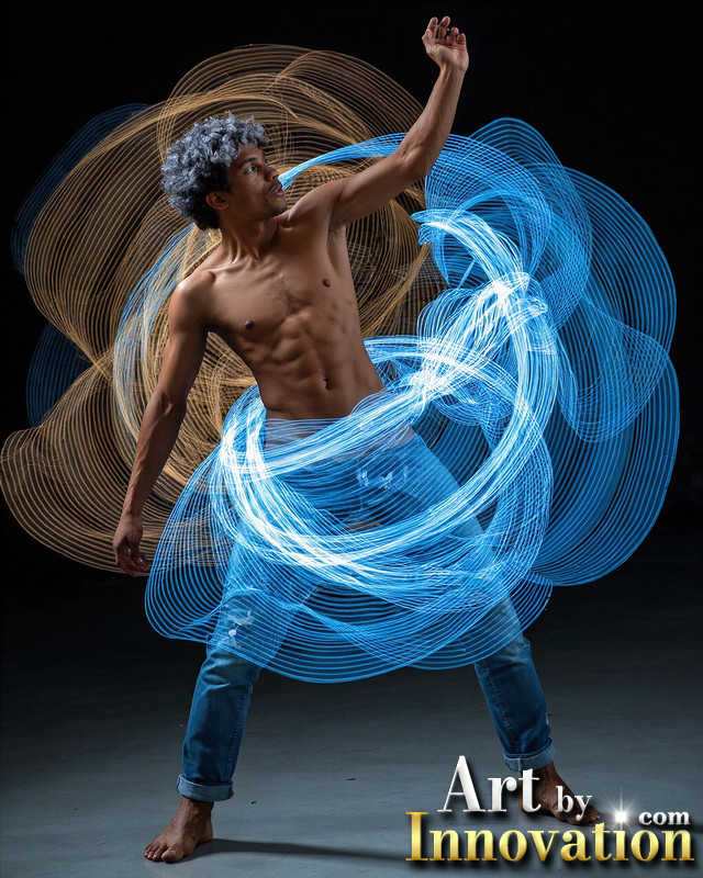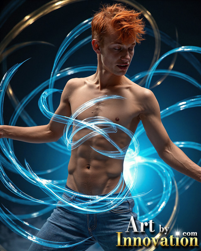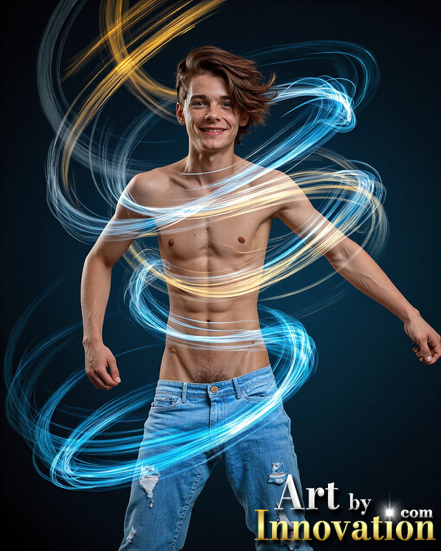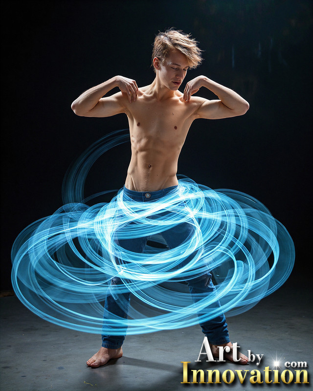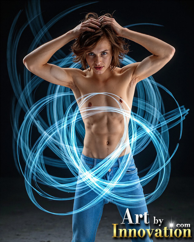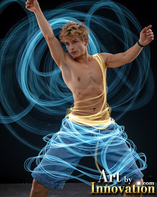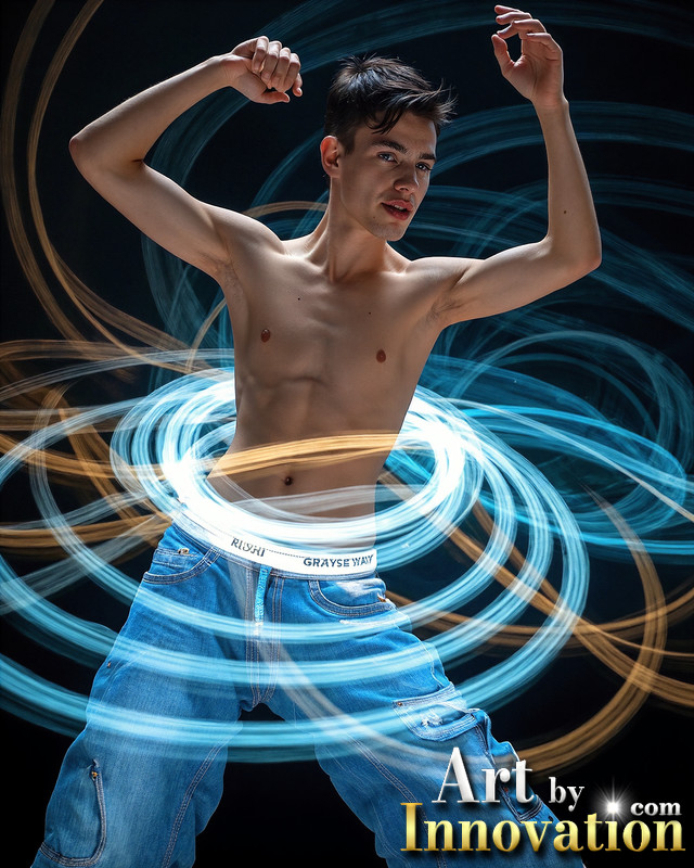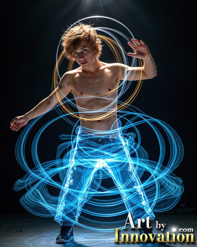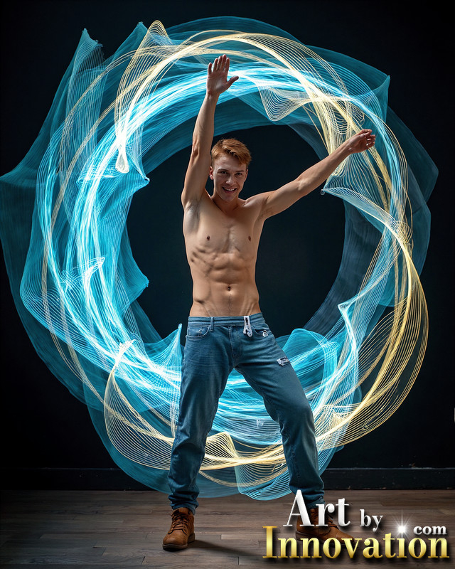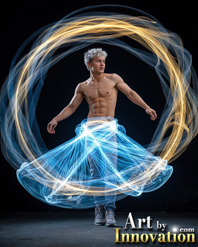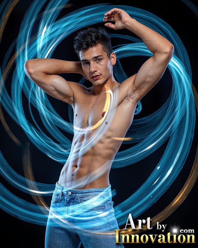 Photos of Handsome Shirtless Men Dancing with Light Rays,Colorful,in Motion.