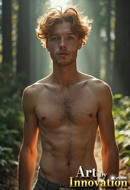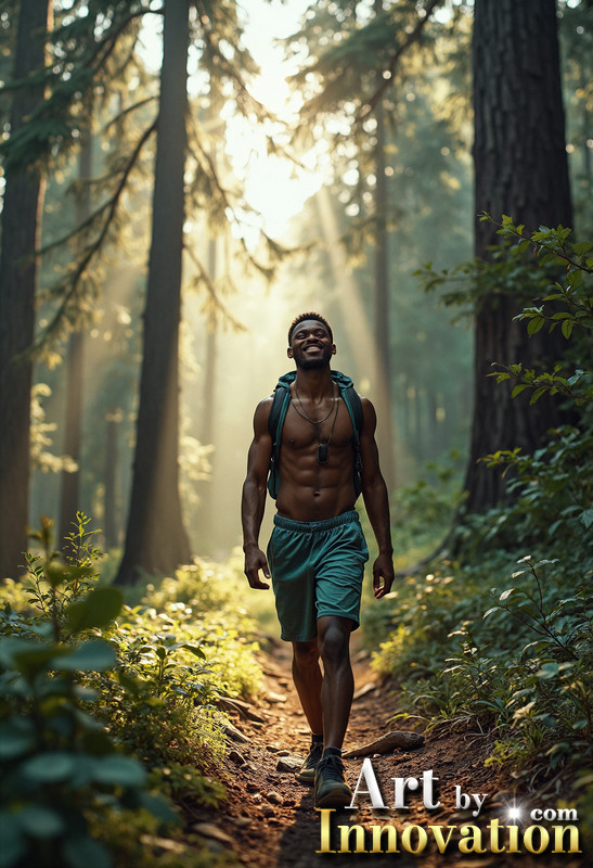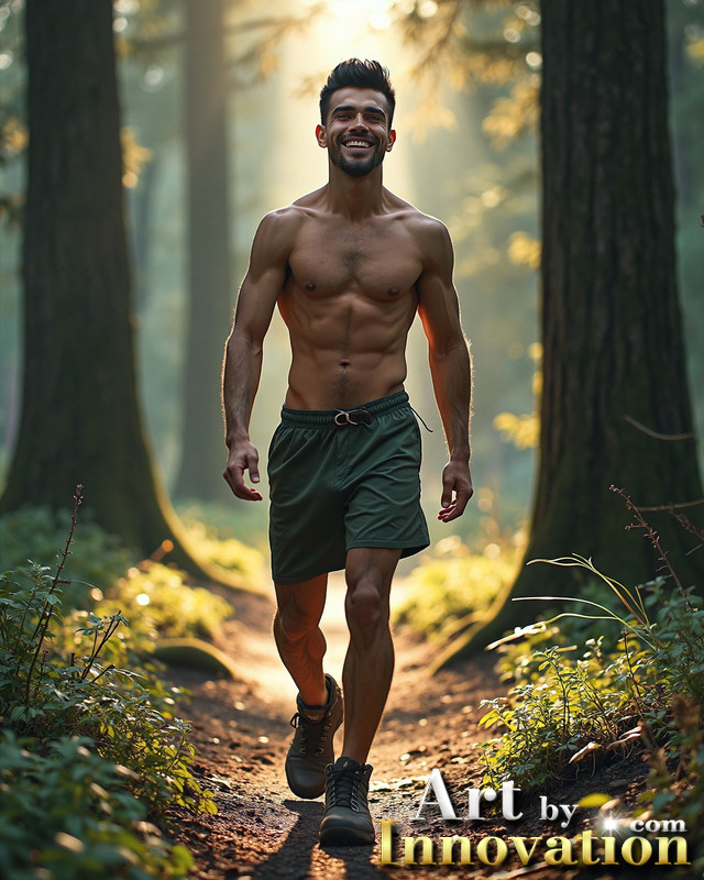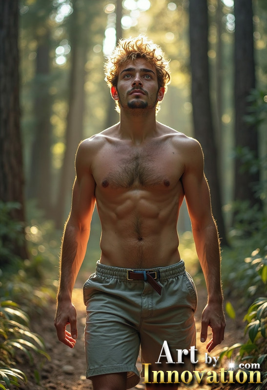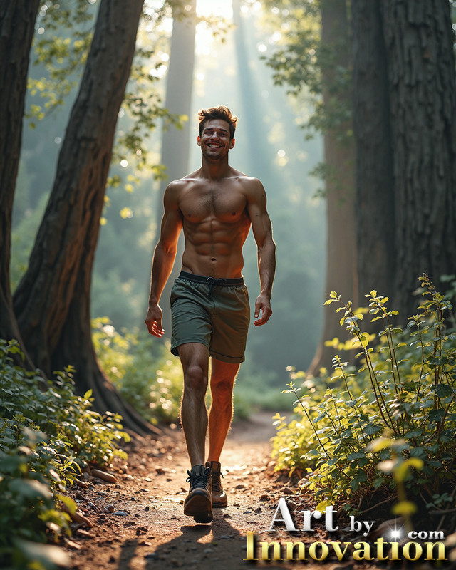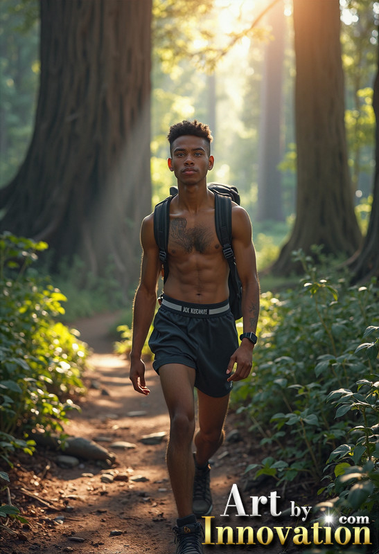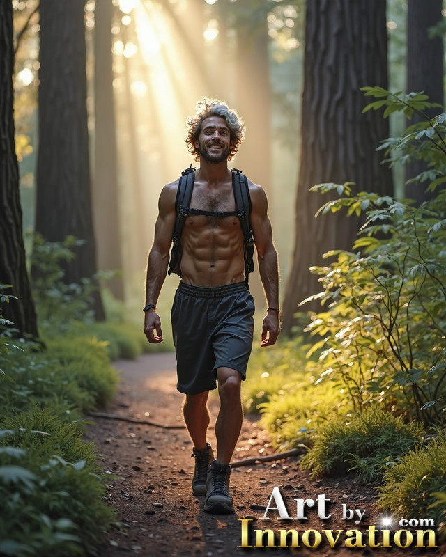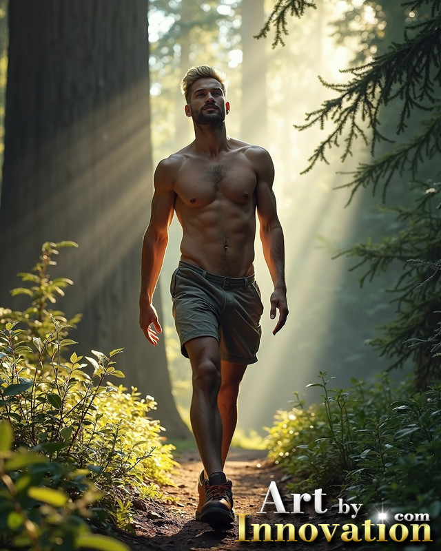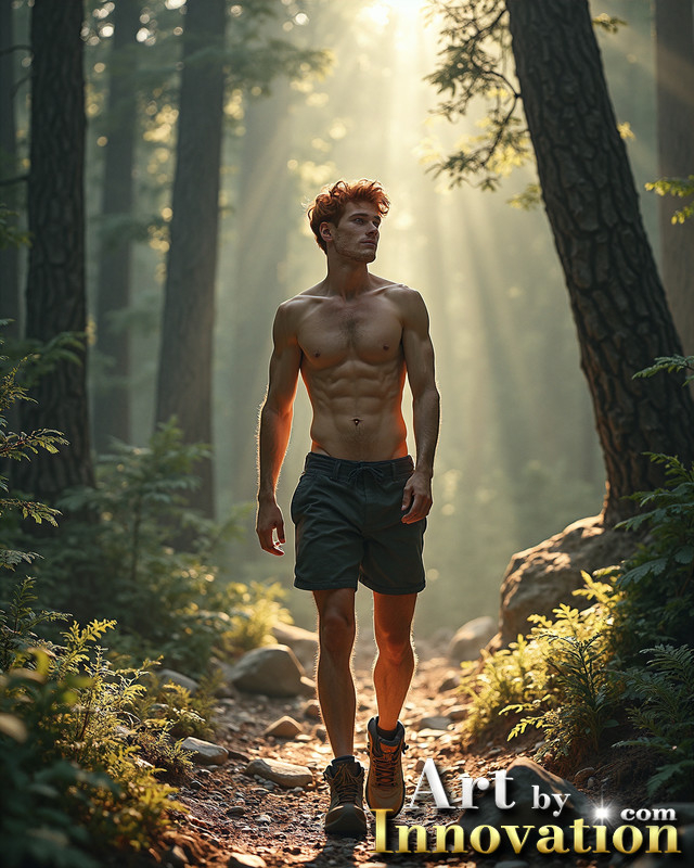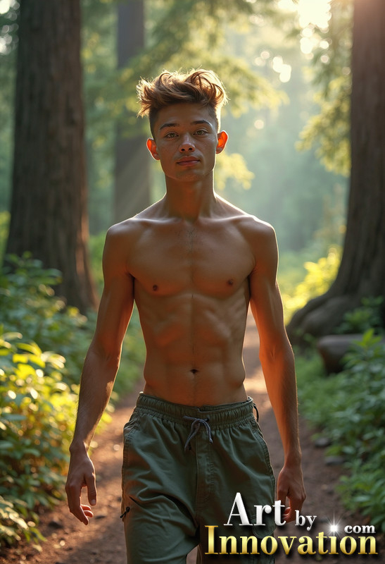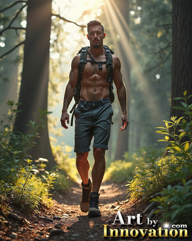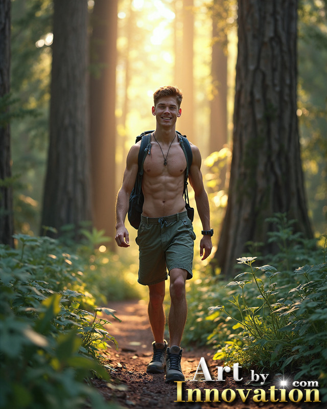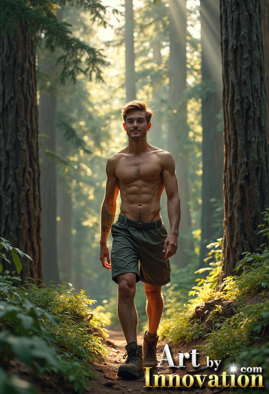Hot & Sexy Men in the Woods Hiking. A digital art AI generated photograph of a beautiful man,handsome shirtless,and muscular,hiking on a trail in a beautiful forest with large redwood trees.