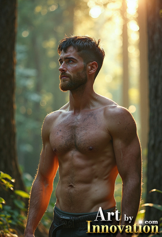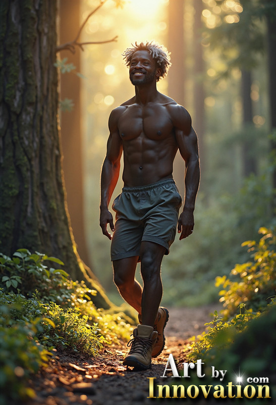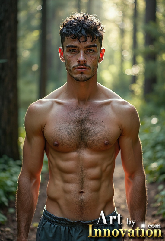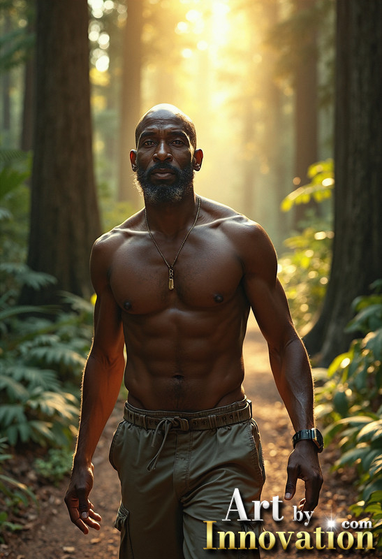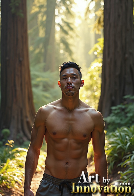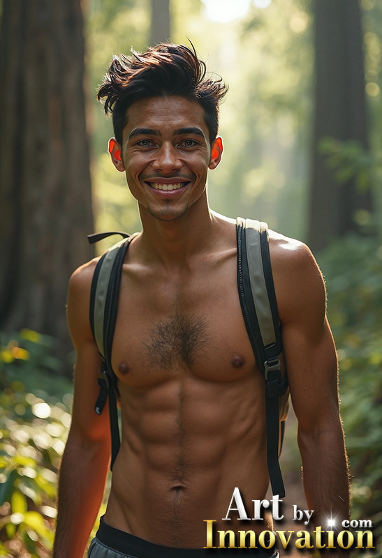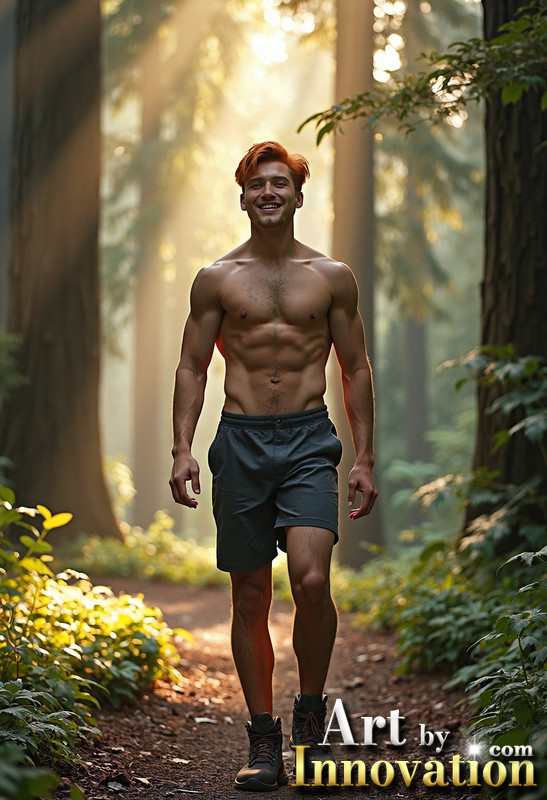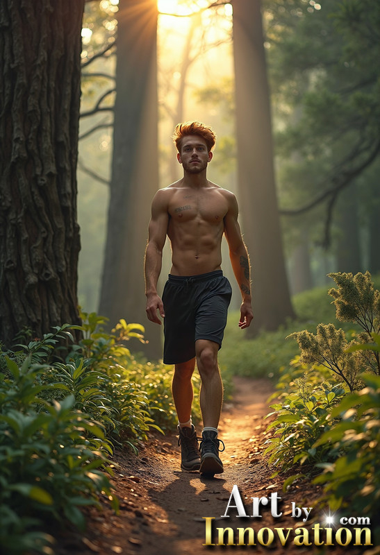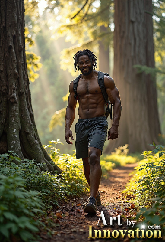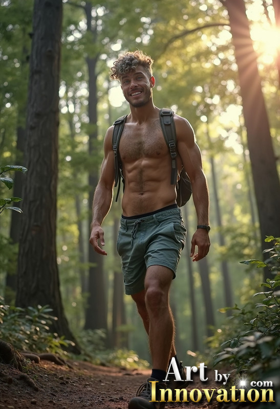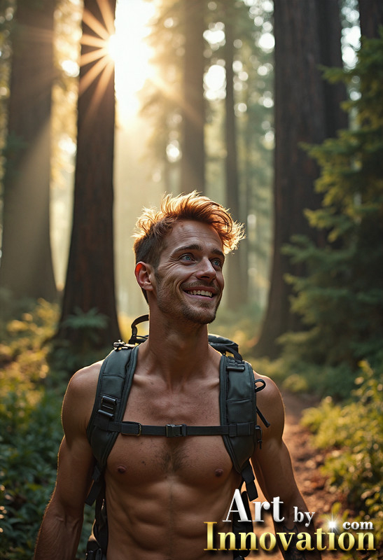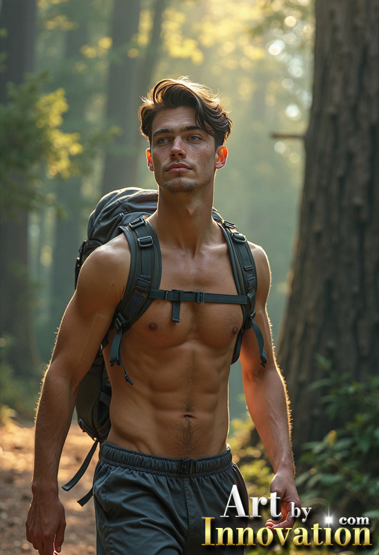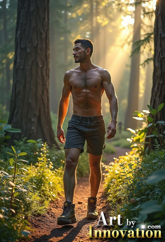 Hot & Sexy Men in the Woods Hiking. A digital art AI generated photograph of a beautiful man,handsome shirtless,and muscular,hiking on a trail in a beautiful forest with large redwood trees.