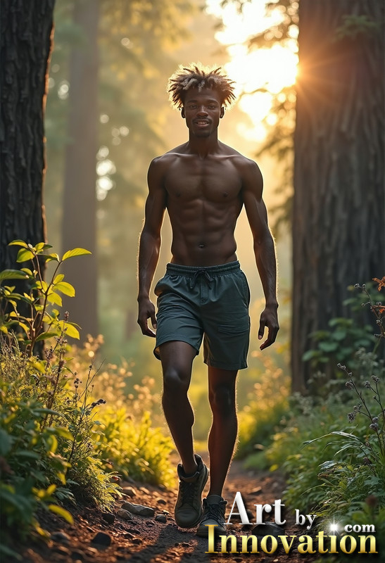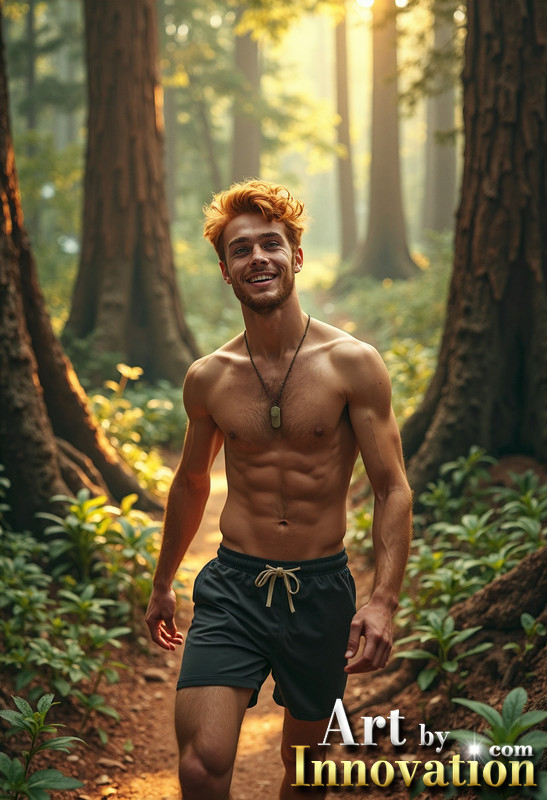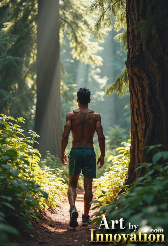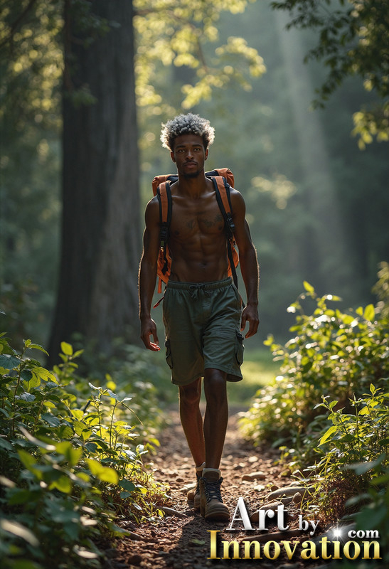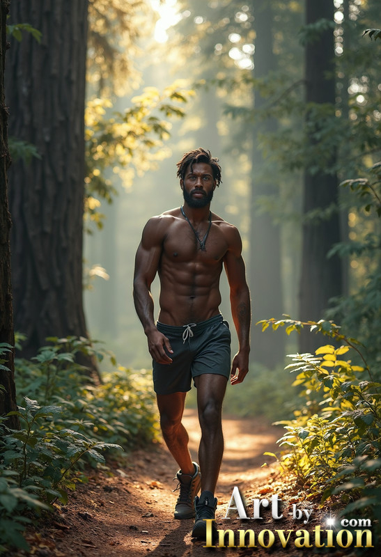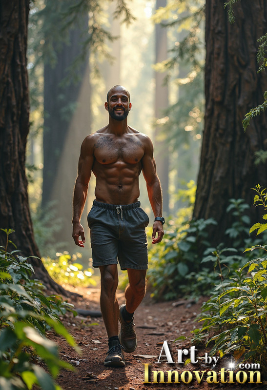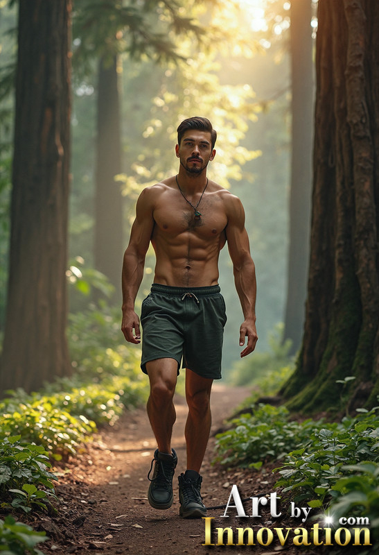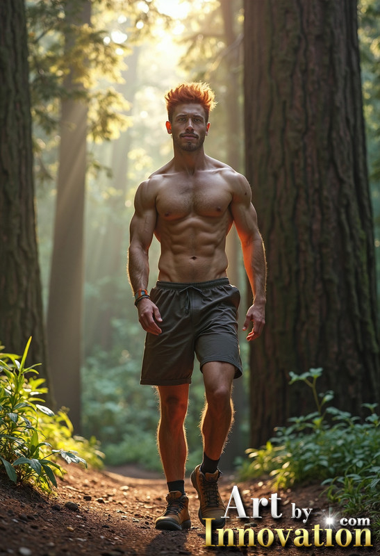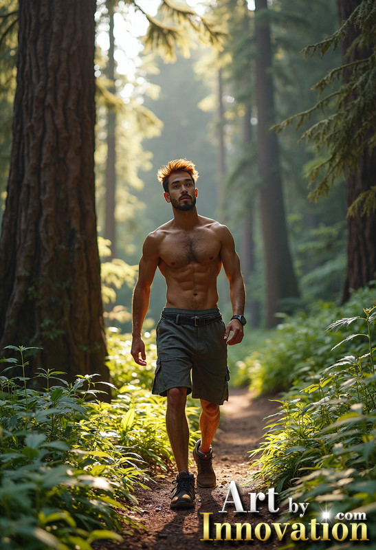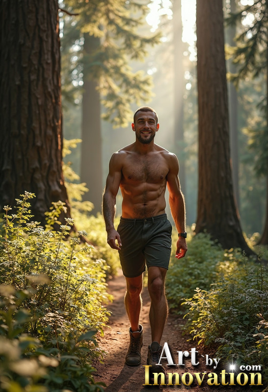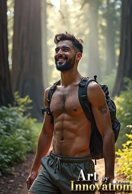 Hot & Sexy Men in the Woods Hiking. A digital art AI generated photograph of a beautiful man,handsome shirtless,and muscular,hiking on a trail in a beautiful forest with large redwood trees.