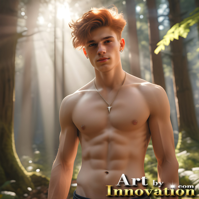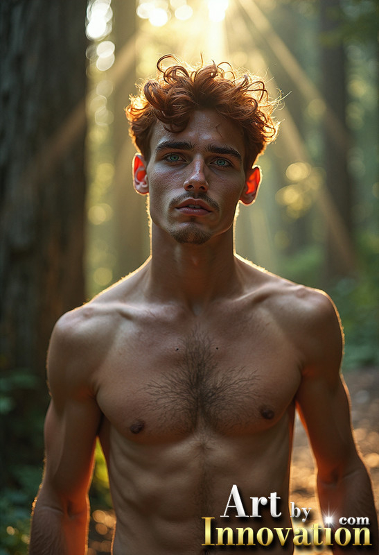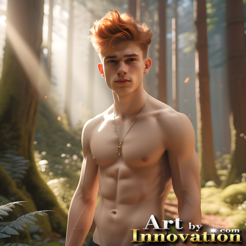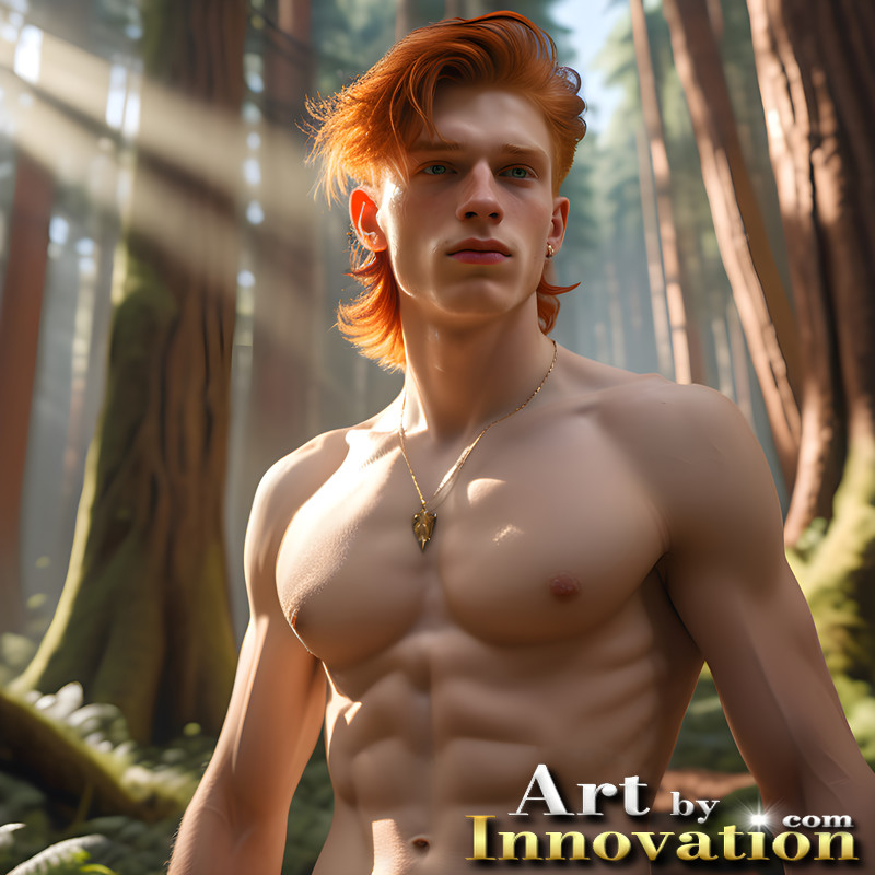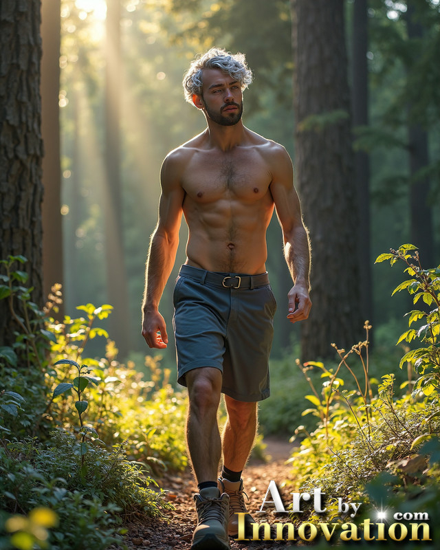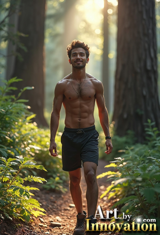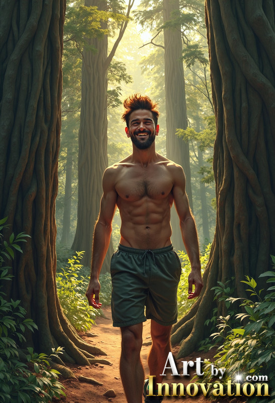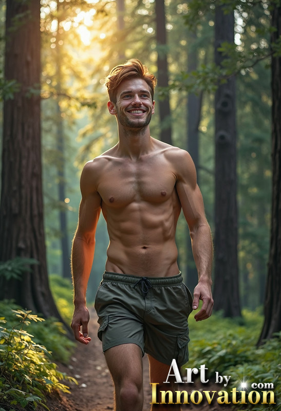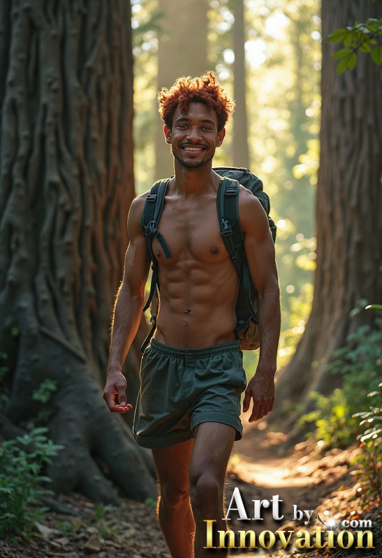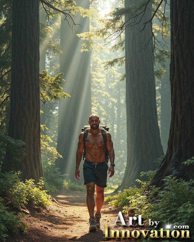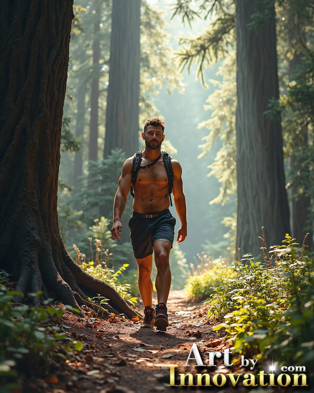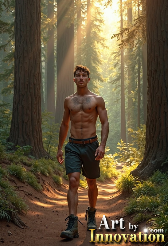 Hot & Sexy Men in the Woods Hiking. A digital art AI generated photograph of a beautiful man,handsome shirtless,and muscular,hiking on a trail in a beautiful forest with large redwood trees.