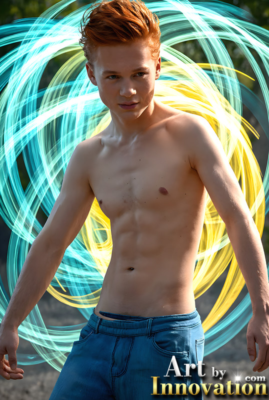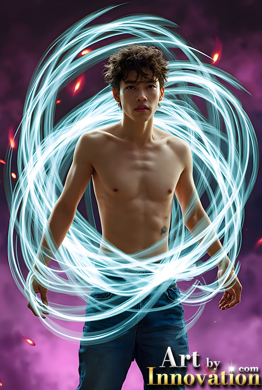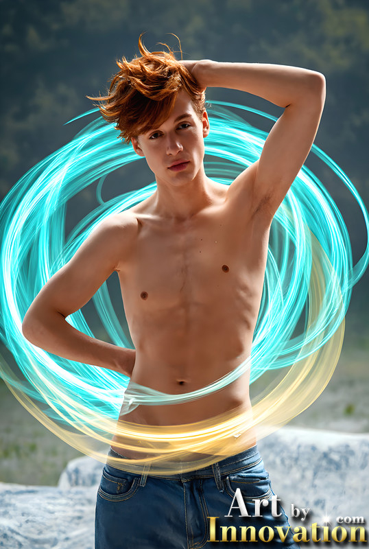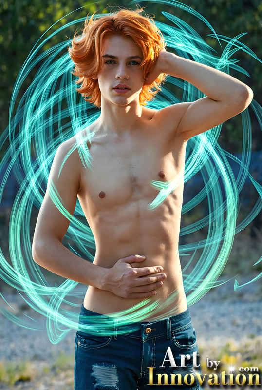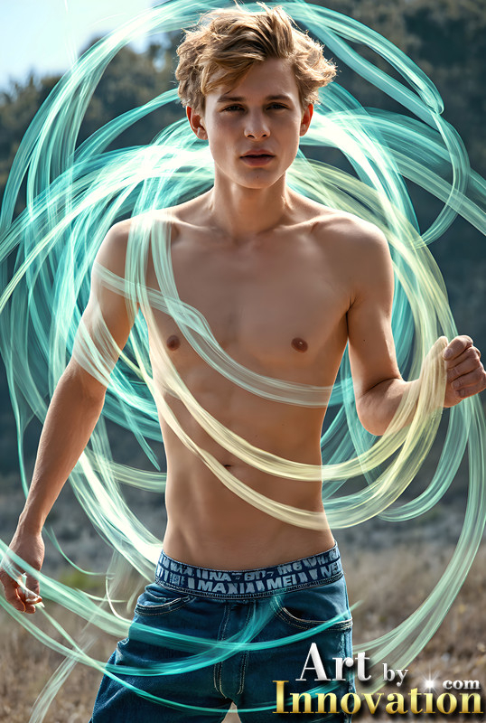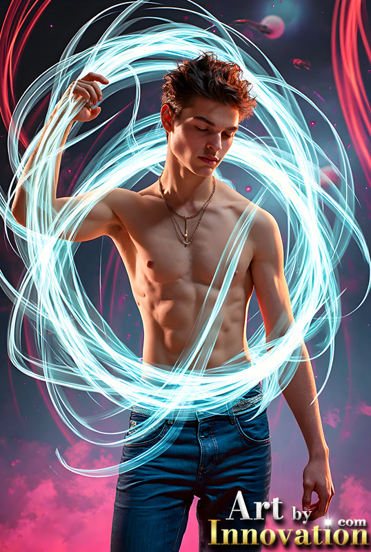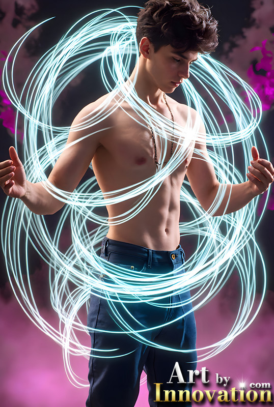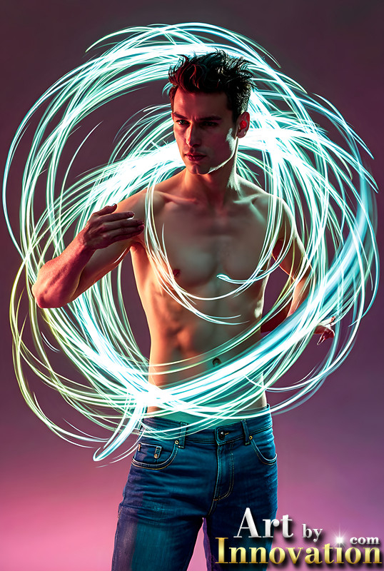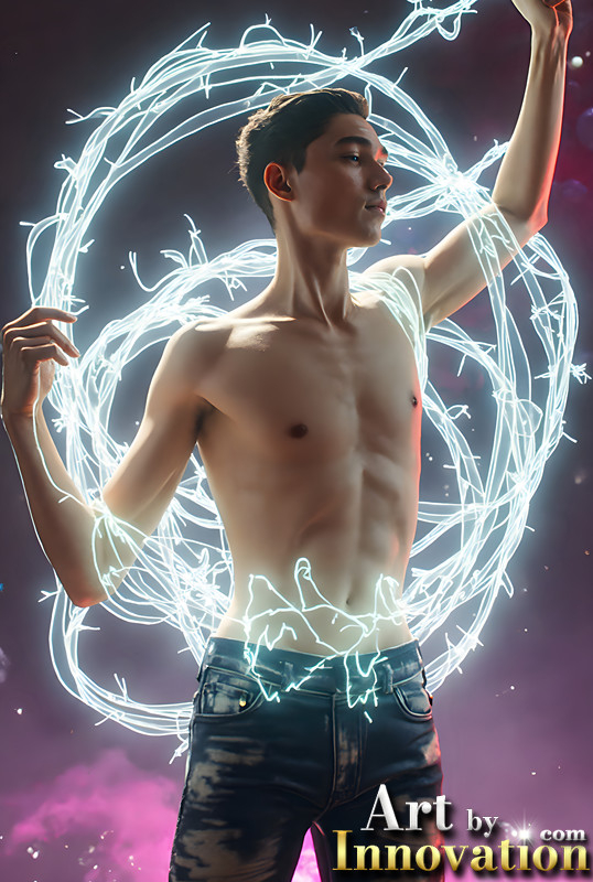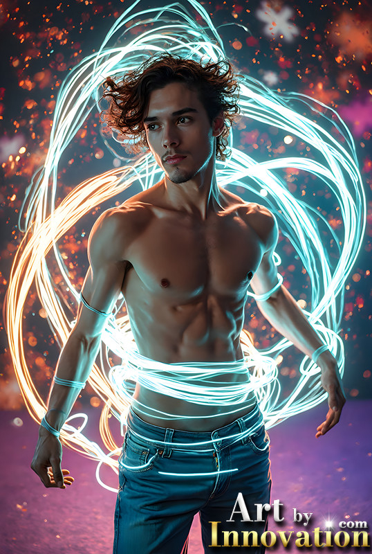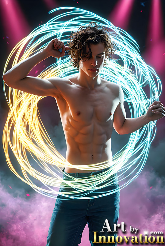 Abstract Male Art,AI Pictures of Handsome Shirtless Men,Dancing Outdoors,with Colorful Light Rays,Art in Motion Images.