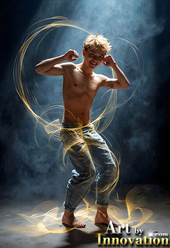 Abstract Male Art,AI Pictures of Handsome Shirtless Men,Dancing Outdoors,with Colorful Light Rays,Art in Motion Images.