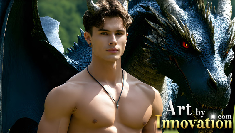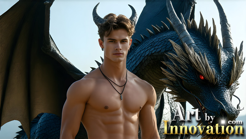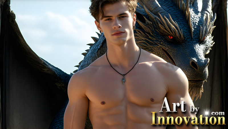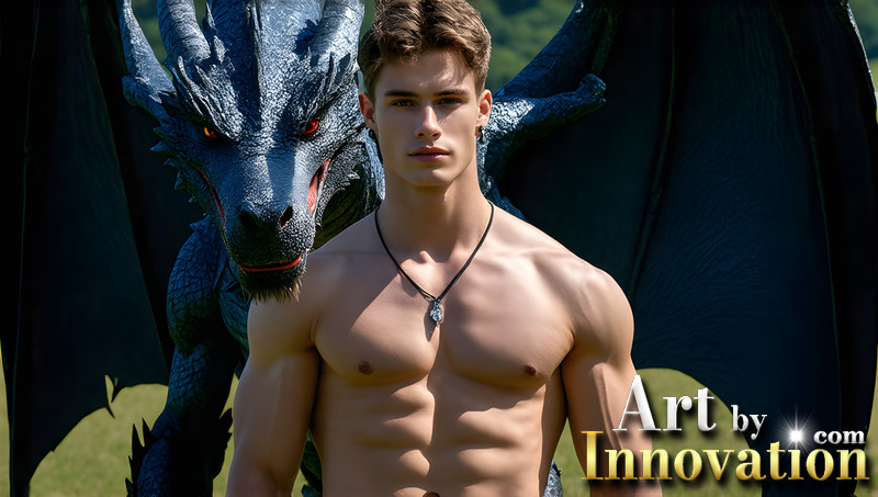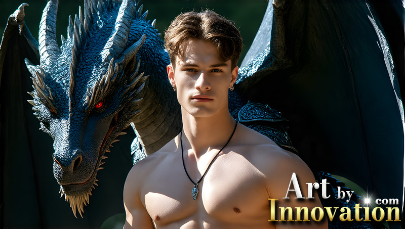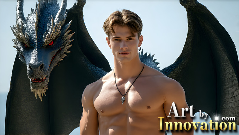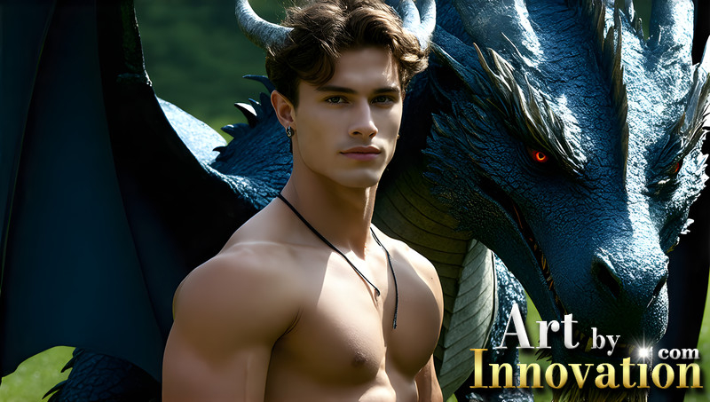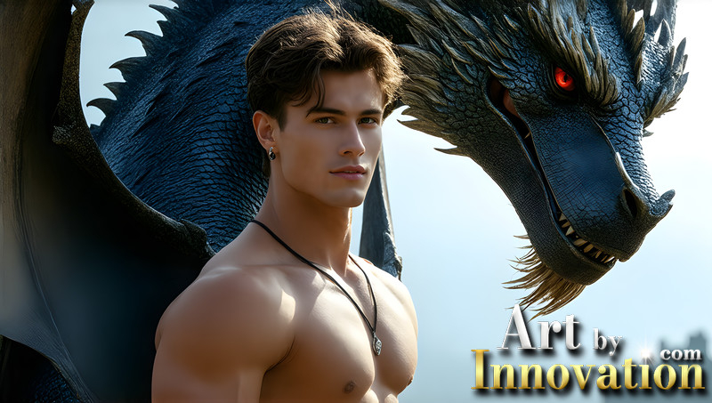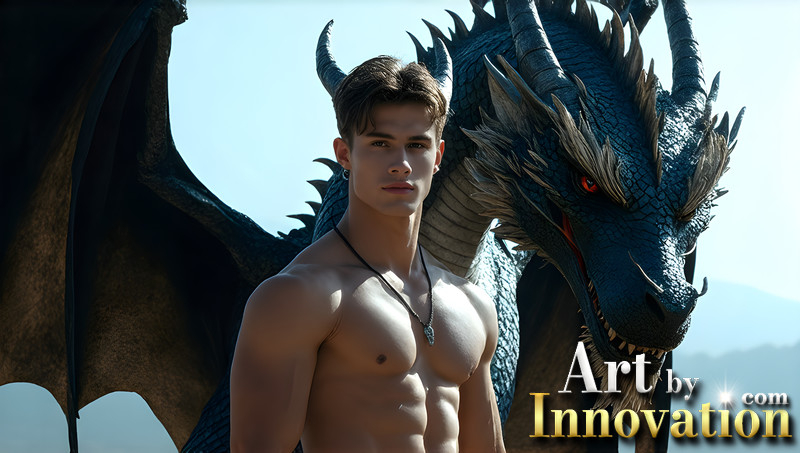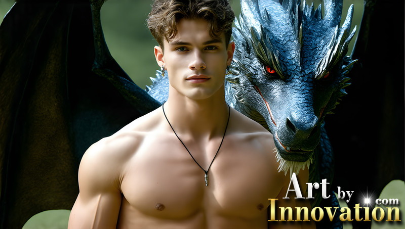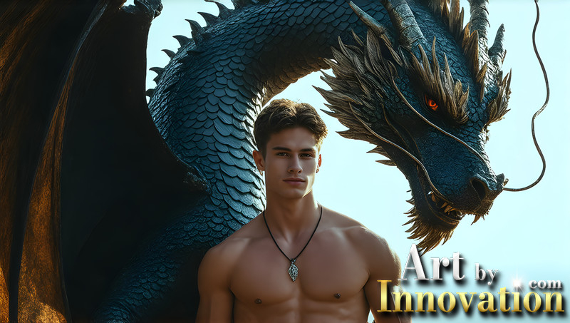 The Dragon Prince - A very attractive shirtless young male prince,with his dragon.
