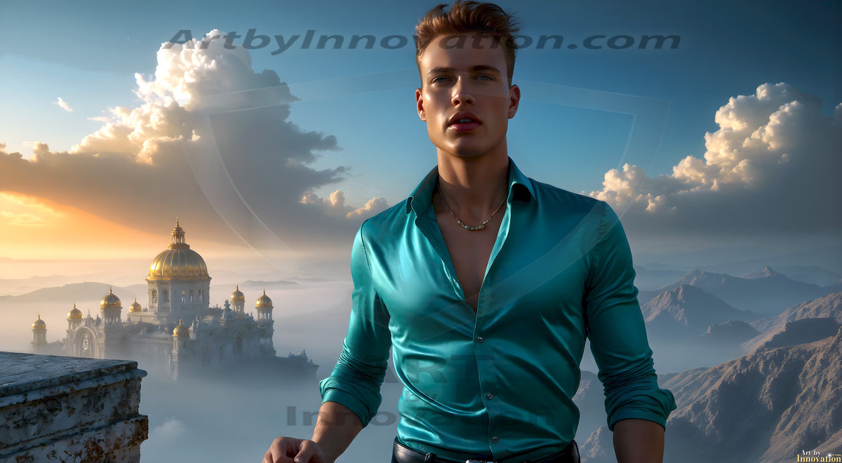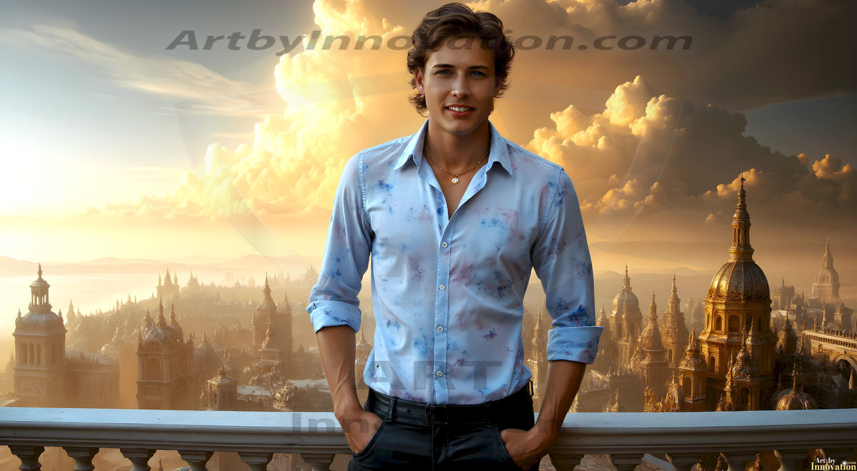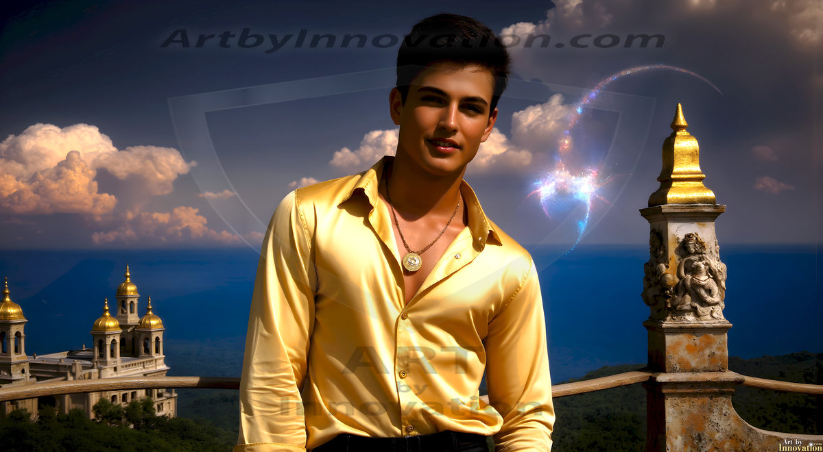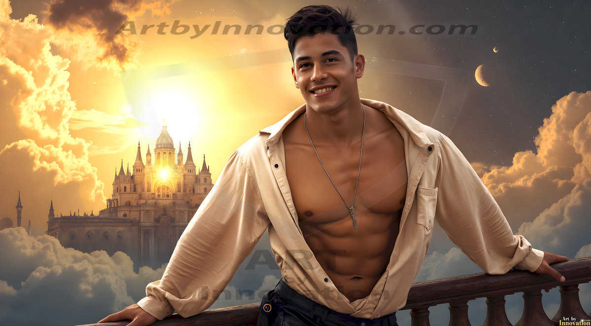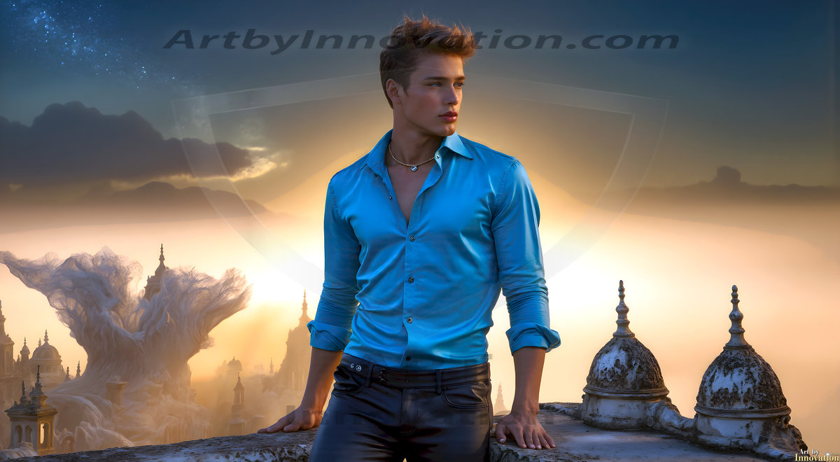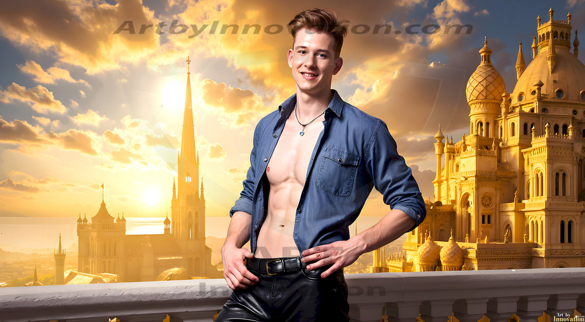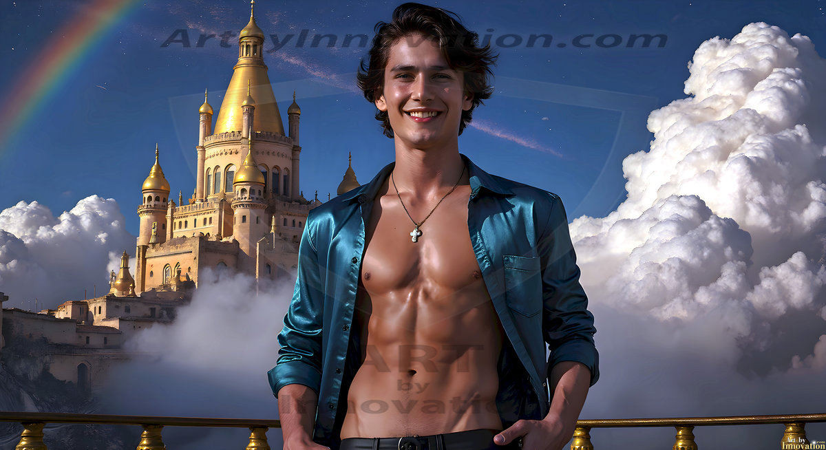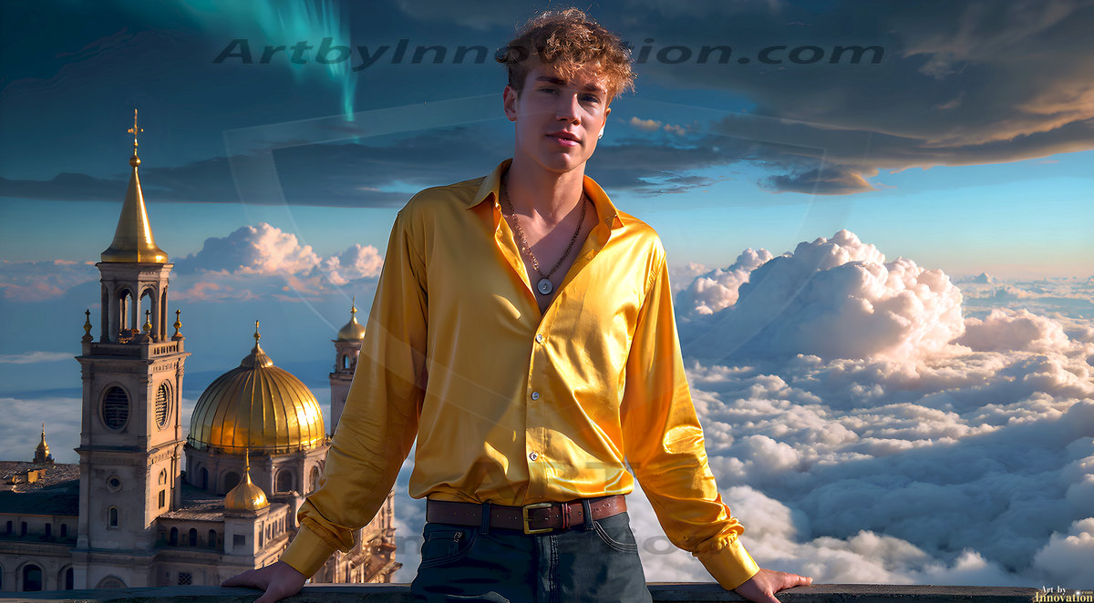 The Beautiful Young Men of the Golden City, is a collection of AI generated images of sexy, glamorous, handsome guys in the heavens. In this fantasy photograph of a young men in their late teens and 20's, overlooking a large golden city in the heavens. Generated to be as realistic as possible, in this this fantasy setting, with todays technology. Wearing jeans, an unbuttoned, vibrant, long-sleeve, button down shirt. The subject is enjoying a beautiful day outdoors. The mystical, galactic landscape, and the vibrant cosmic canopies, every detail, from the texture of the clouds, to the magnificent, majestic gothic architecture of the golden city, is crafted to create an atmosphere of reverence and divine glory. With a breathtaking scene, offering warm golden hour lighting. The heavenly landscape evokes a sense of freedom and tranquility, that is expresses through his facial features and smile, as day turns to night. The heavenly landscape evokes a sense of mysterious black space and light, with a vast galaxy that almost covers the image, the stars and constellations sparkle bright, in dark blue sky.