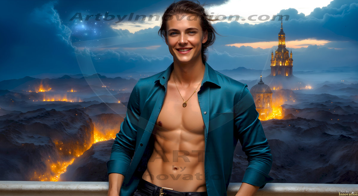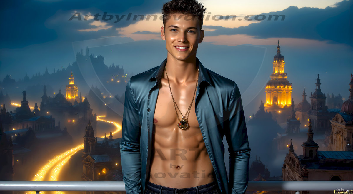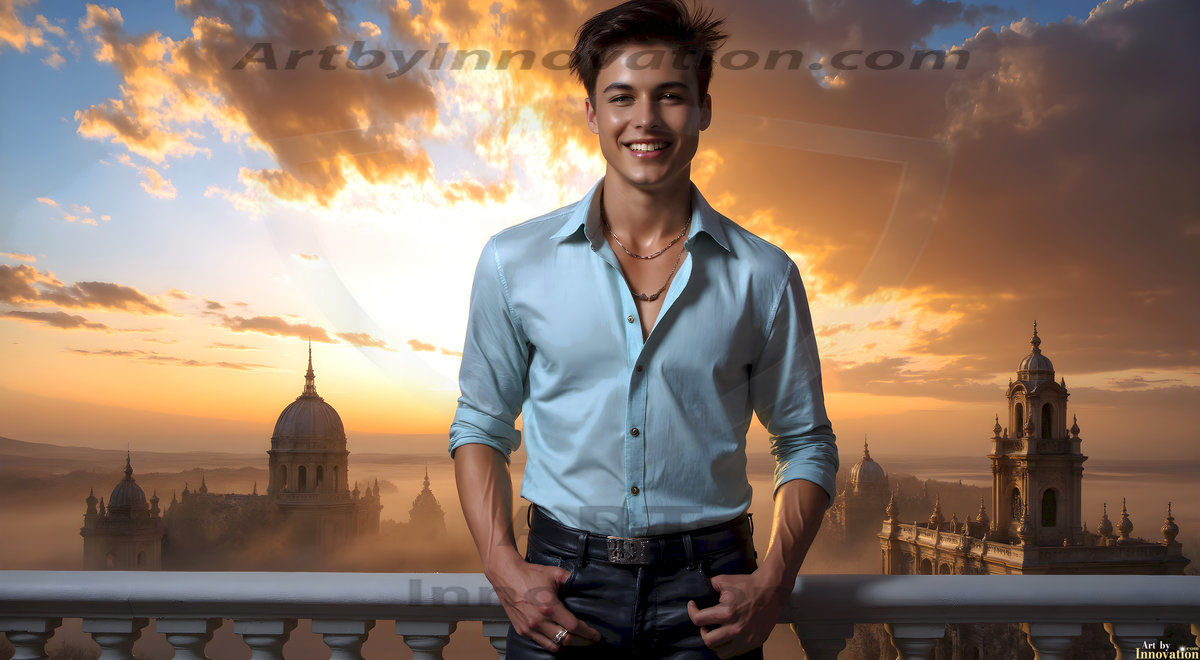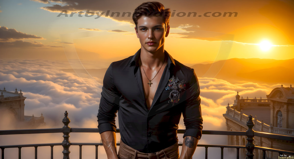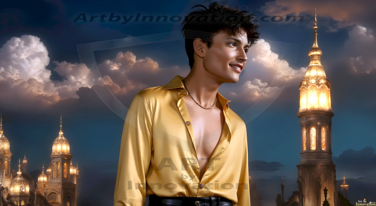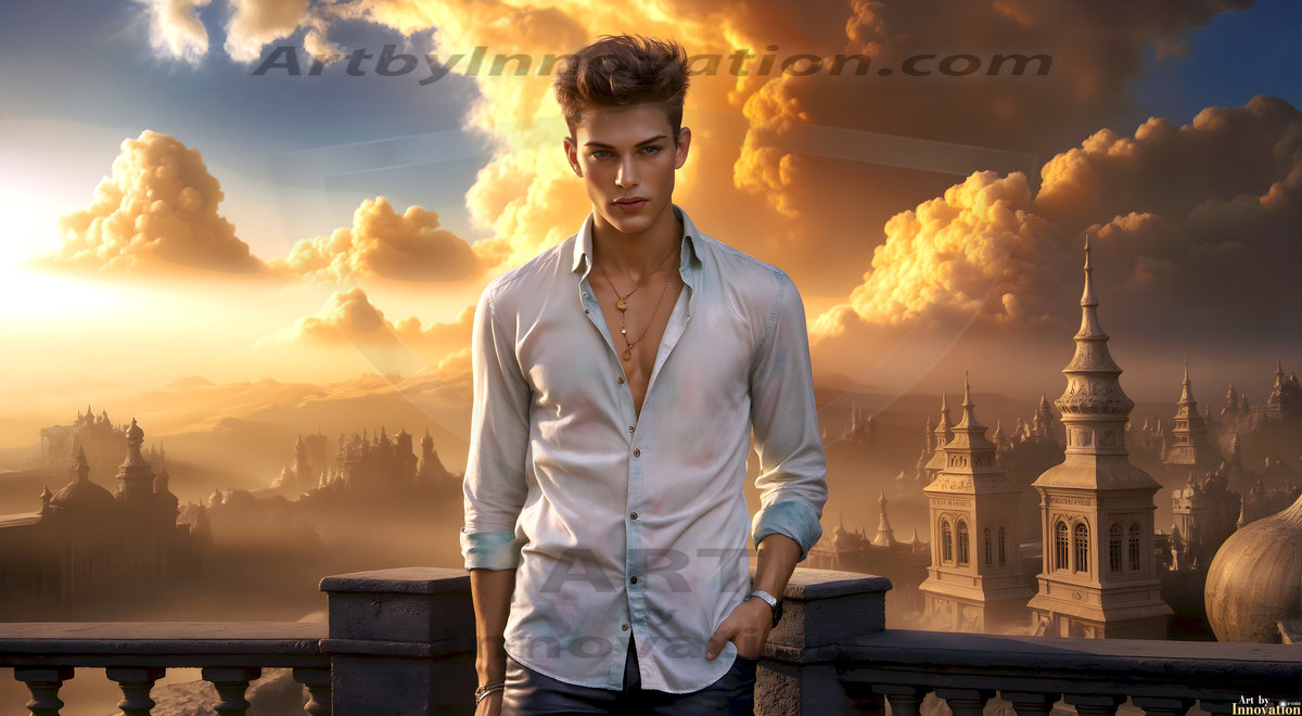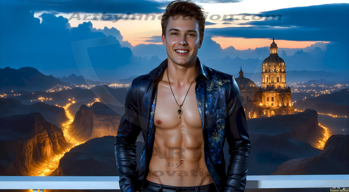 The Beautiful Young Men of the Golden City, is a collection of AI generated images of sexy, glamorous, handsome guys in the heavens. In this fantasy photograph of a young men in their late teens and 20's, overlooking a large golden city in the heavens. Generated to be as realistic as possible, in this this fantasy setting, with todays technology. Wearing jeans, an unbuttoned, vibrant, long-sleeve, button down shirt. The subject is enjoying a beautiful day outdoors. The mystical, galactic landscape, and the vibrant cosmic canopies, every detail, from the texture of the clouds, to the magnificent, majestic gothic architecture of the golden city, is crafted to create an atmosphere of reverence and divine glory. With a breathtaking scene, offering warm golden hour lighting. The heavenly landscape evokes a sense of freedom and tranquility, that is expresses through his facial features and smile, as day turns to night. The heavenly landscape evokes a sense of mysterious black space and light, with a vast galaxy that almost covers the image, the stars and constellations sparkle bright, in dark blue sky.