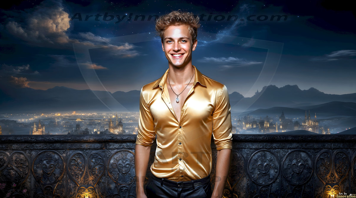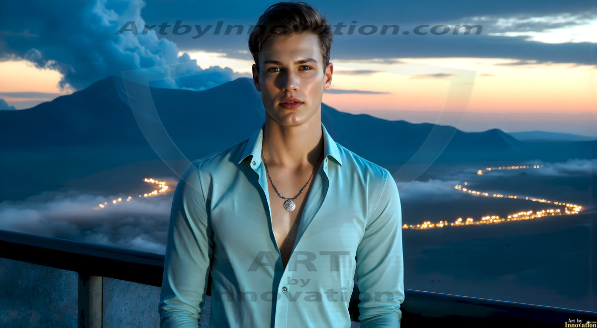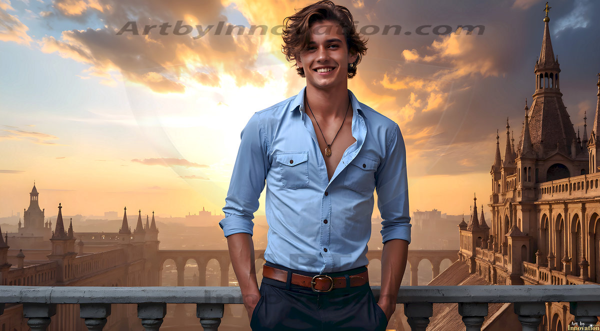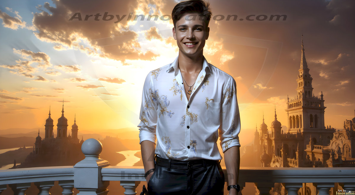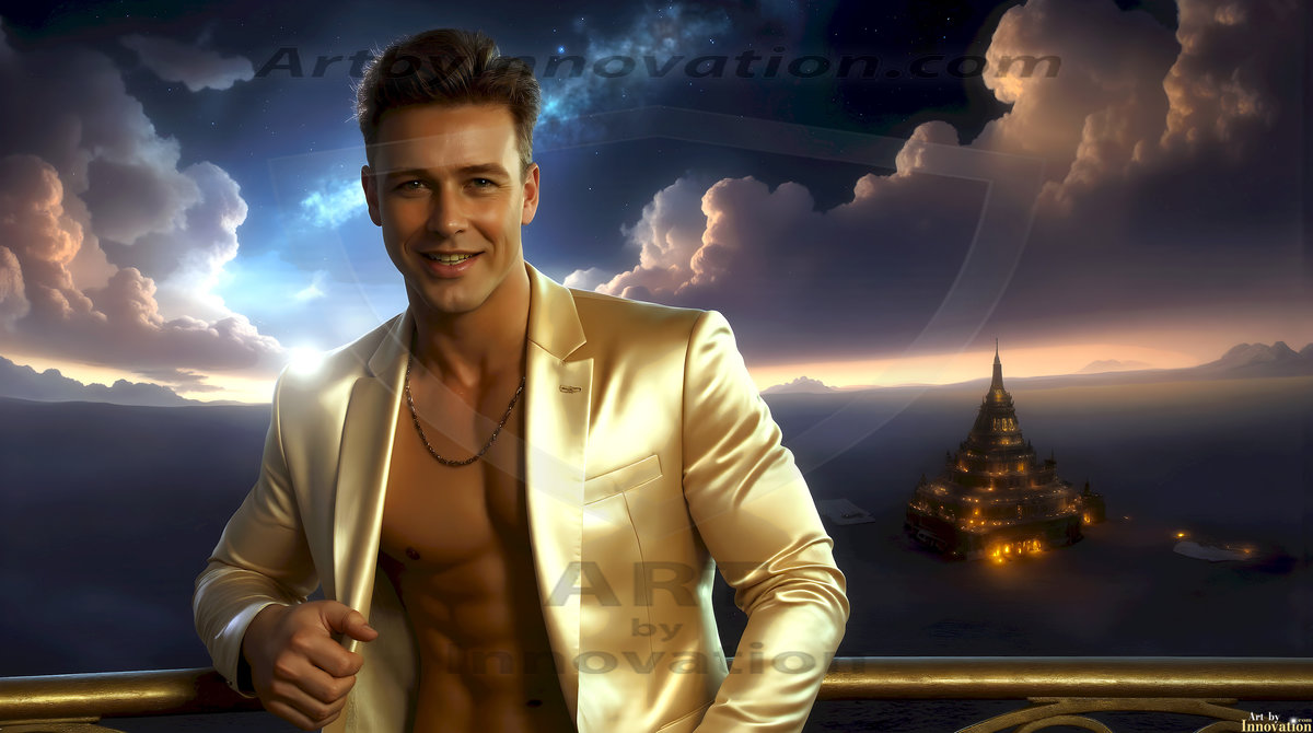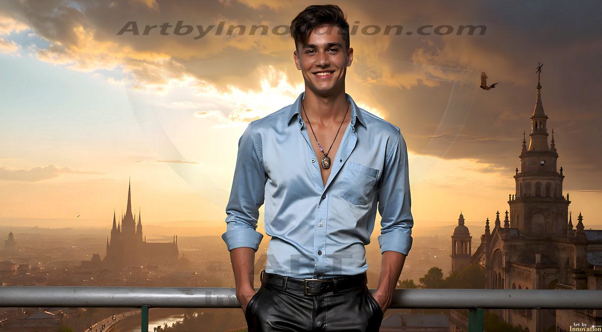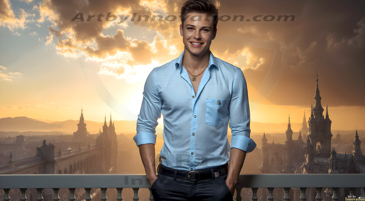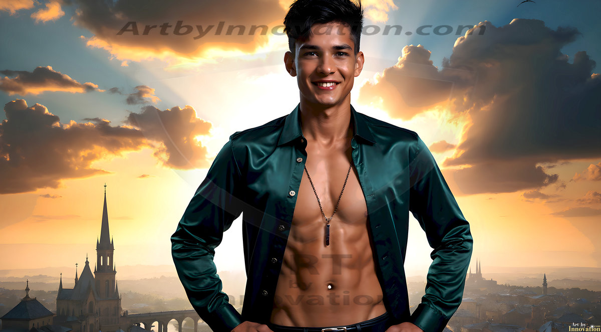 The Beautiful Young Men of the Golden City, is a collection of AI generated images of sexy, glamorous, handsome guys in the heavens. In this fantasy photograph of a young men in their late teens and 20's, overlooking a large golden city in the heavens. Generated to be as realistic as possible, in this this fantasy setting, with todays technology. Wearing jeans, an unbuttoned, vibrant, long-sleeve, button down shirt. The subject is enjoying a beautiful day outdoors. The mystical, galactic landscape, and the vibrant cosmic canopies, every detail, from the texture of the clouds, to the magnificent, majestic gothic architecture of the golden city, is crafted to create an atmosphere of reverence and divine glory. With a breathtaking scene, offering warm golden hour lighting. The heavenly landscape evokes a sense of freedom and tranquility, that is expresses through his facial features and smile, as day turns to night. The heavenly landscape evokes a sense of mysterious black space and light, with a vast galaxy that almost covers the image, the stars and constellations sparkle bright, in dark blue sky.