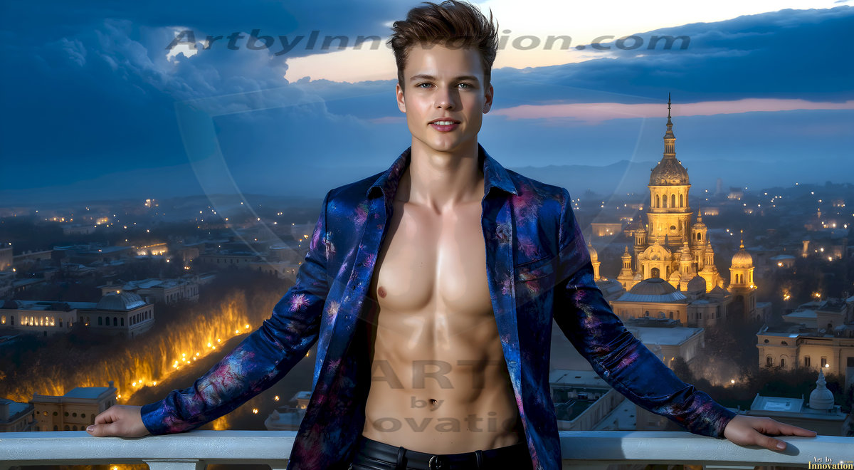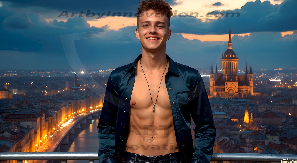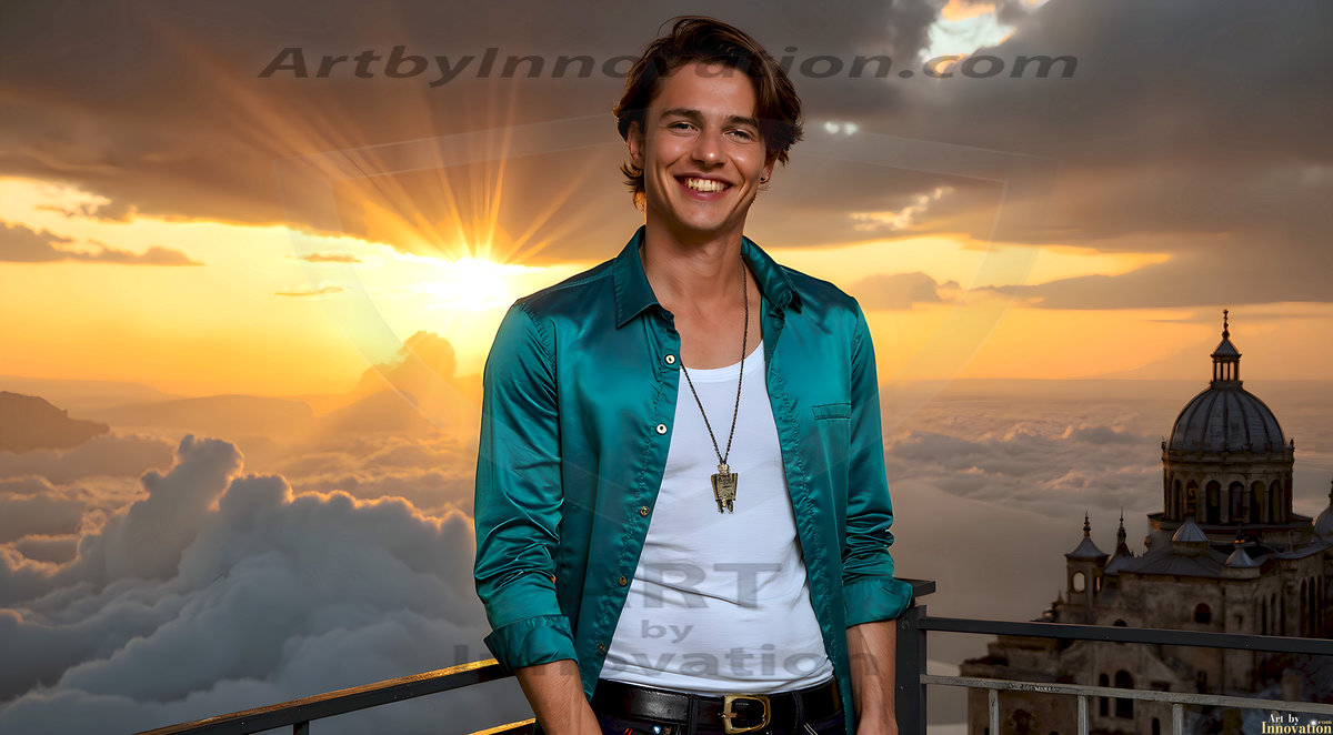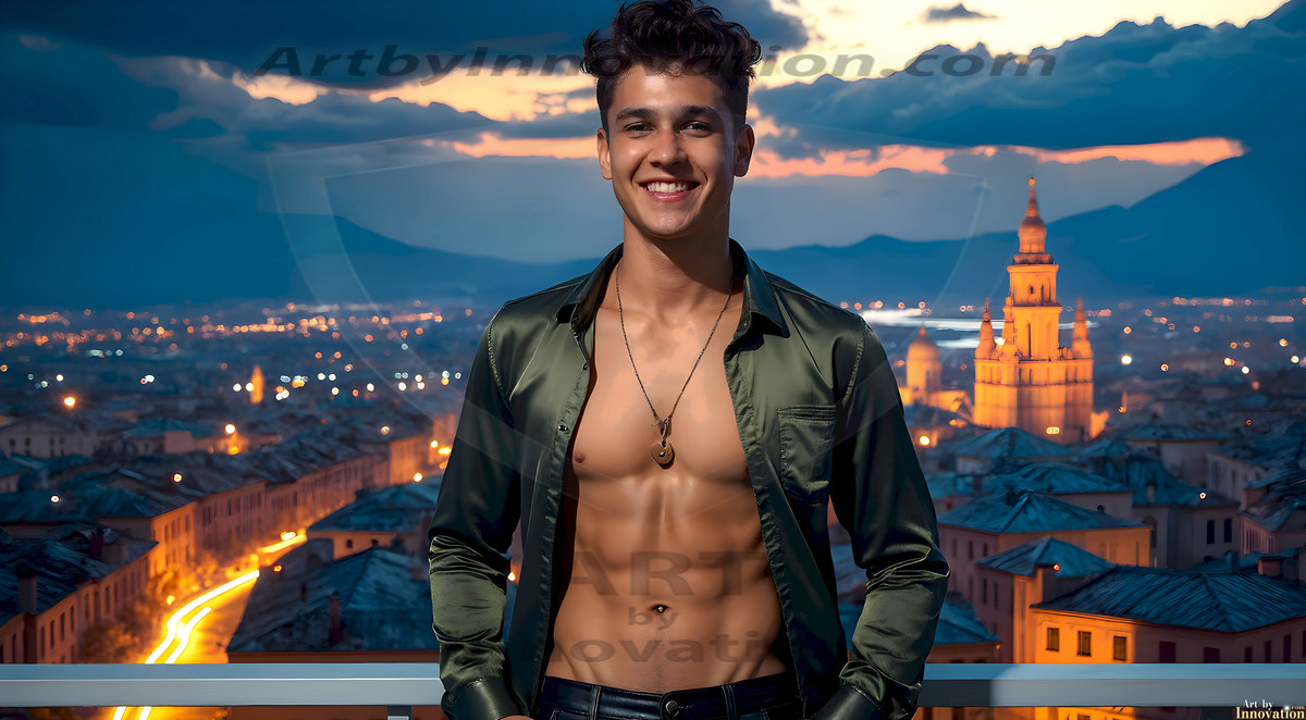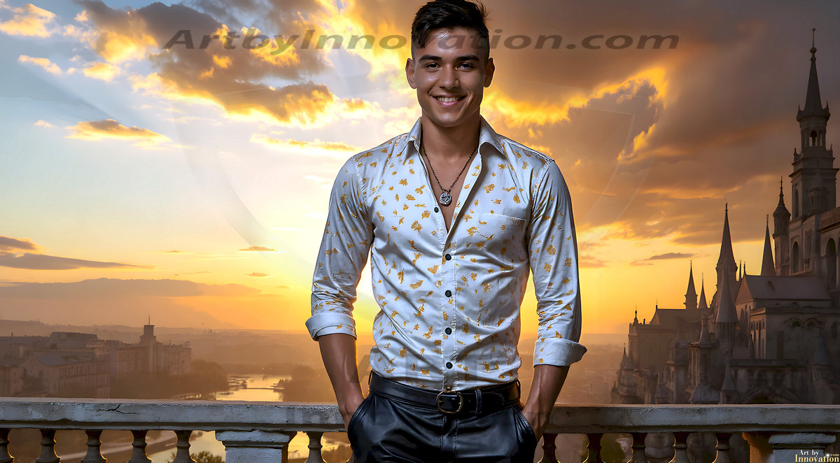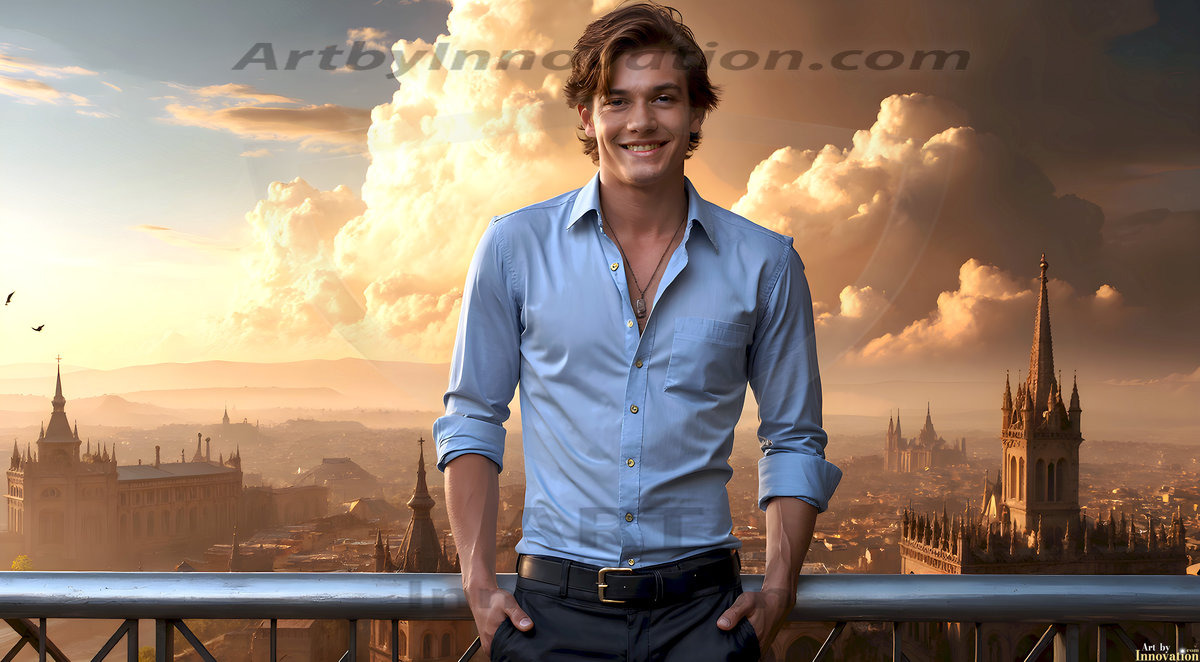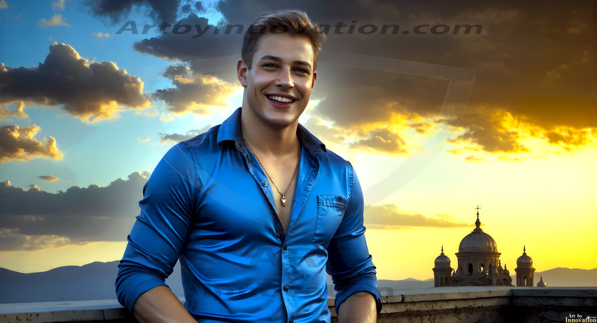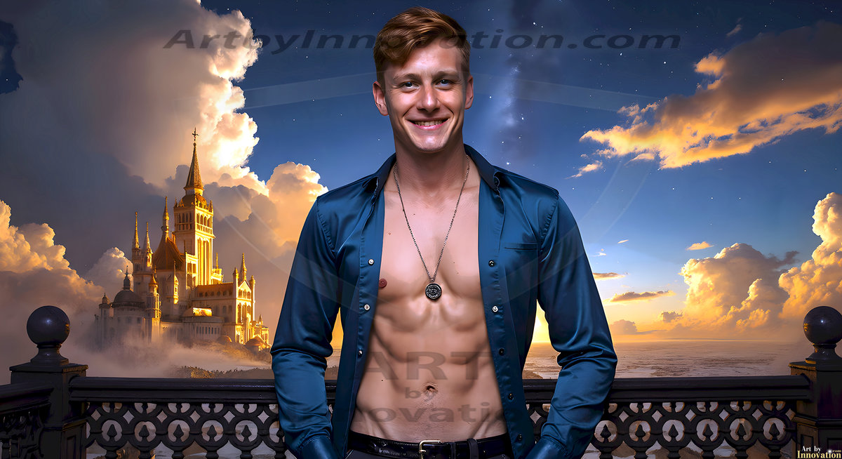 The Beautiful Young Men of the Golden City, is a collection of AI generated images of sexy, glamorous, handsome guys in the heavens. In this fantasy photograph of a young men in their late teens and 20's, overlooking a large golden city in the heavens. Generated to be as realistic as possible, in this this fantasy setting, with todays technology. Wearing jeans, an unbuttoned, vibrant, long-sleeve, button down shirt. The subject is enjoying a beautiful day outdoors. The mystical, galactic landscape, and the vibrant cosmic canopies, every detail, from the texture of the clouds, to the magnificent, majestic gothic architecture of the golden city, is crafted to create an atmosphere of reverence and divine glory. With a breathtaking scene, offering warm golden hour lighting. The heavenly landscape evokes a sense of freedom and tranquility, that is expresses through his facial features and smile, as day turns to night. The heavenly landscape evokes a sense of mysterious black space and light, with a vast galaxy that almost covers the image, the stars and constellations sparkle bright, in dark blue sky.