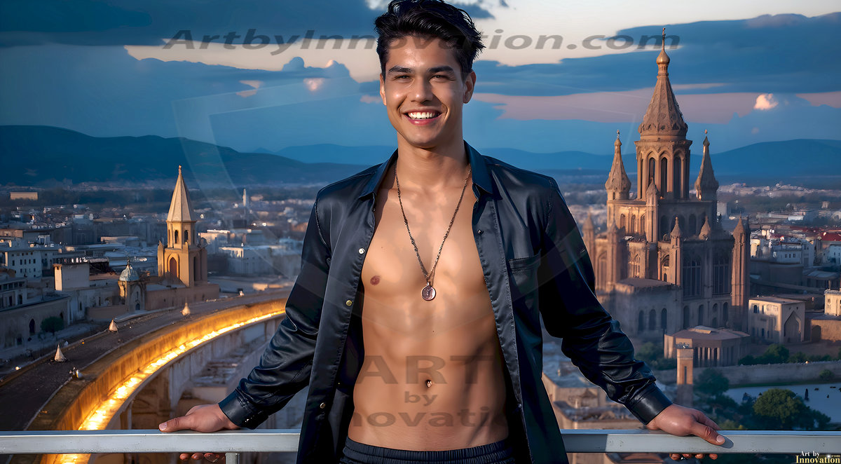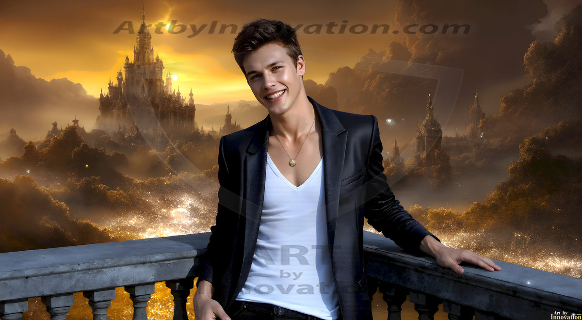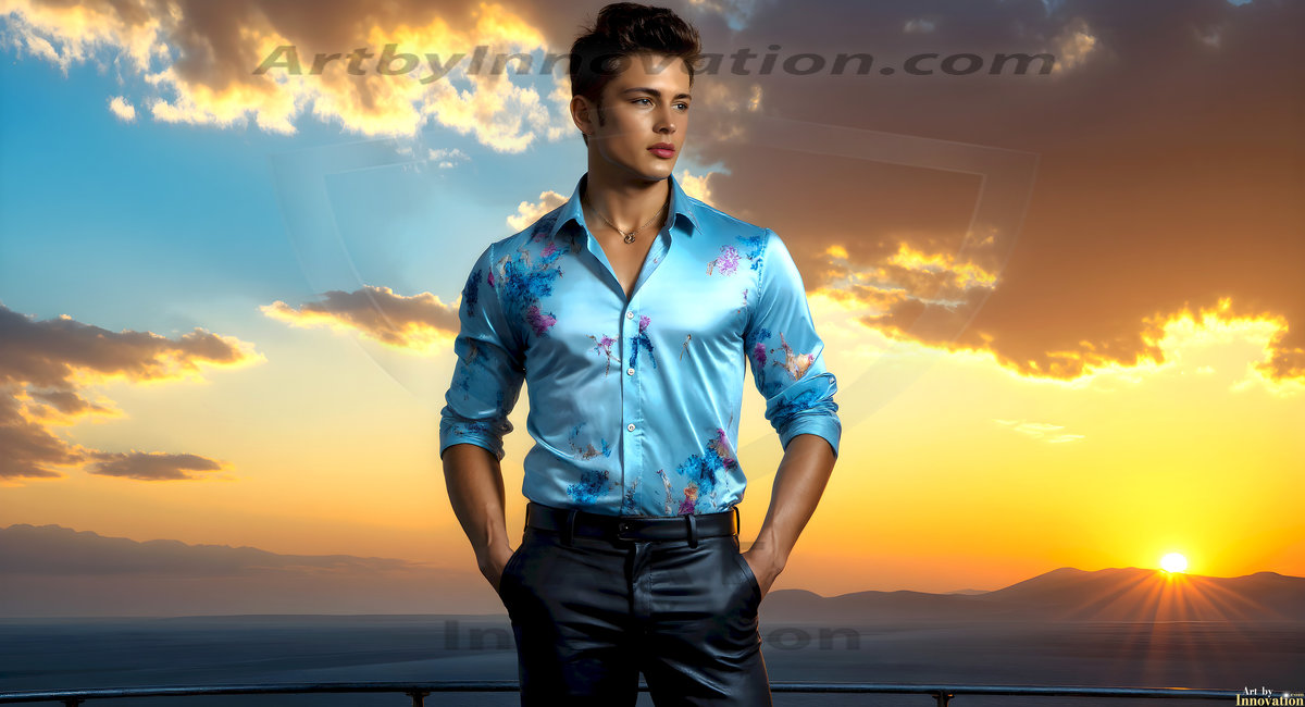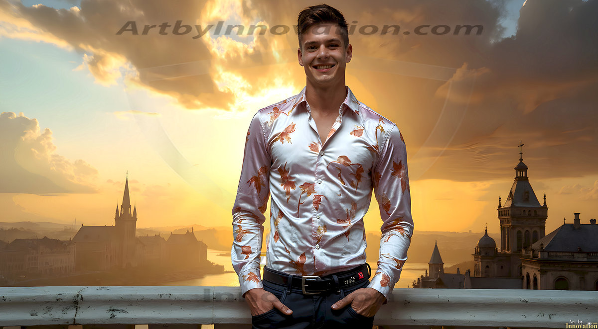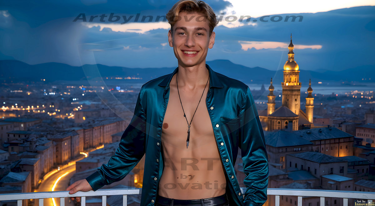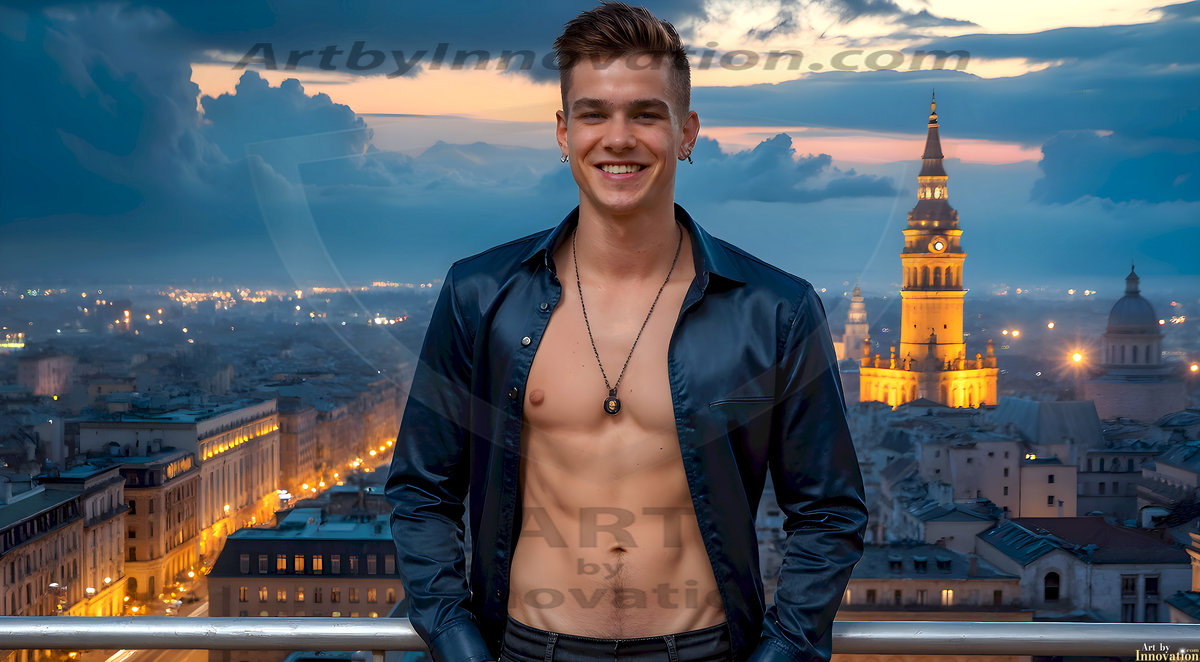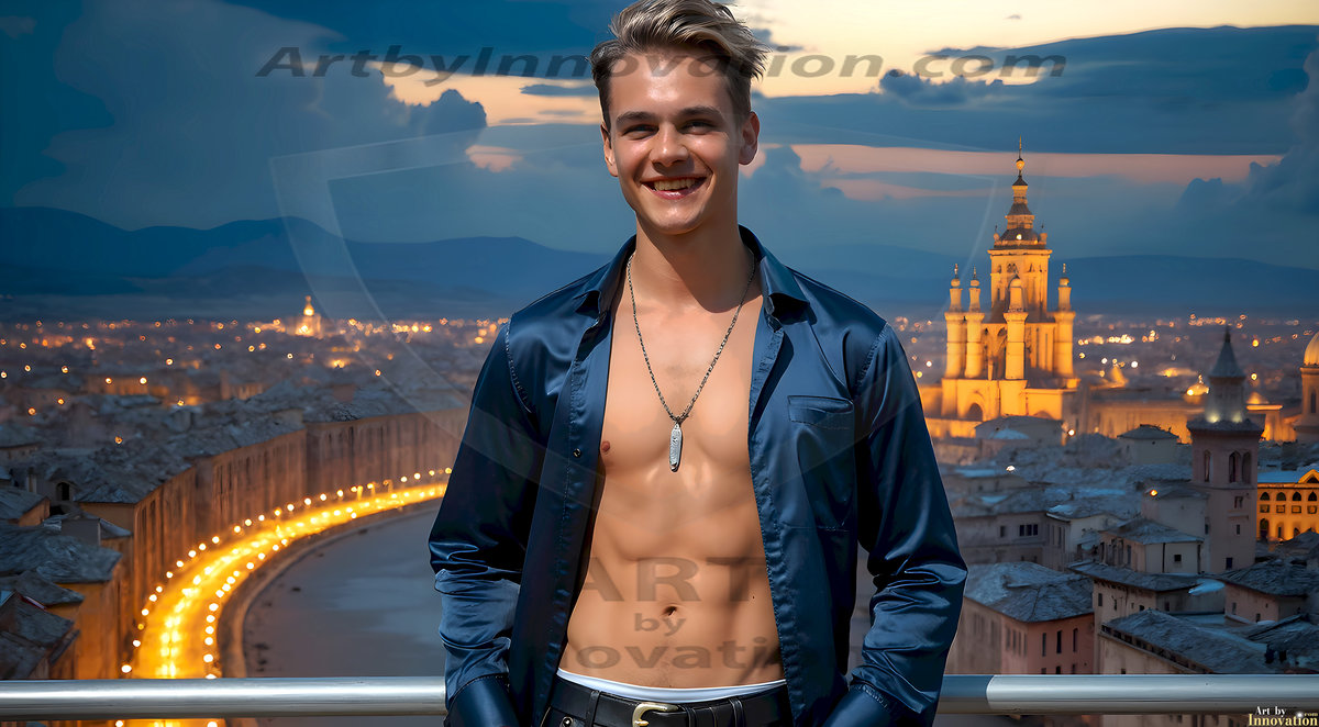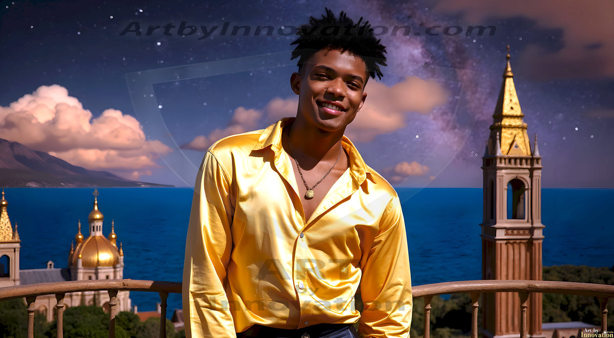 The Beautiful Young Men of the Golden City, is a collection of AI generated images of sexy, glamorous, handsome guys in the heavens. In this fantasy photograph of a young men in their late teens and 20's, overlooking a large golden city in the heavens. Generated to be as realistic as possible, in this this fantasy setting, with todays technology. Wearing jeans, an unbuttoned, vibrant, long-sleeve, button down shirt. The subject is enjoying a beautiful day outdoors. The mystical, galactic landscape, and the vibrant cosmic canopies, every detail, from the texture of the clouds, to the magnificent, majestic gothic architecture of the golden city, is crafted to create an atmosphere of reverence and divine glory. With a breathtaking scene, offering warm golden hour lighting. The heavenly landscape evokes a sense of freedom and tranquility, that is expresses through his facial features and smile, as day turns to night. The heavenly landscape evokes a sense of mysterious black space and light, with a vast galaxy that almost covers the image, the stars and constellations sparkle bright, in dark blue sky.