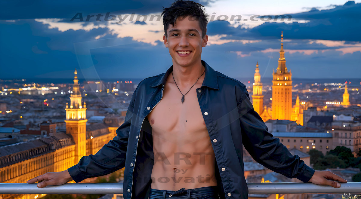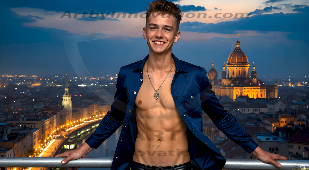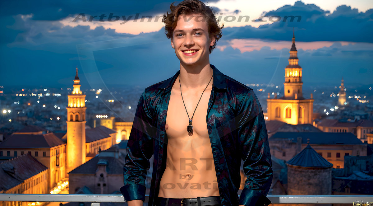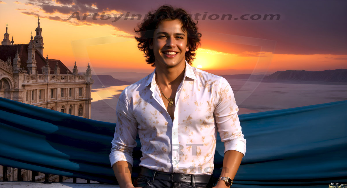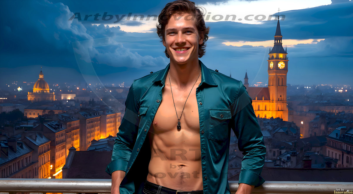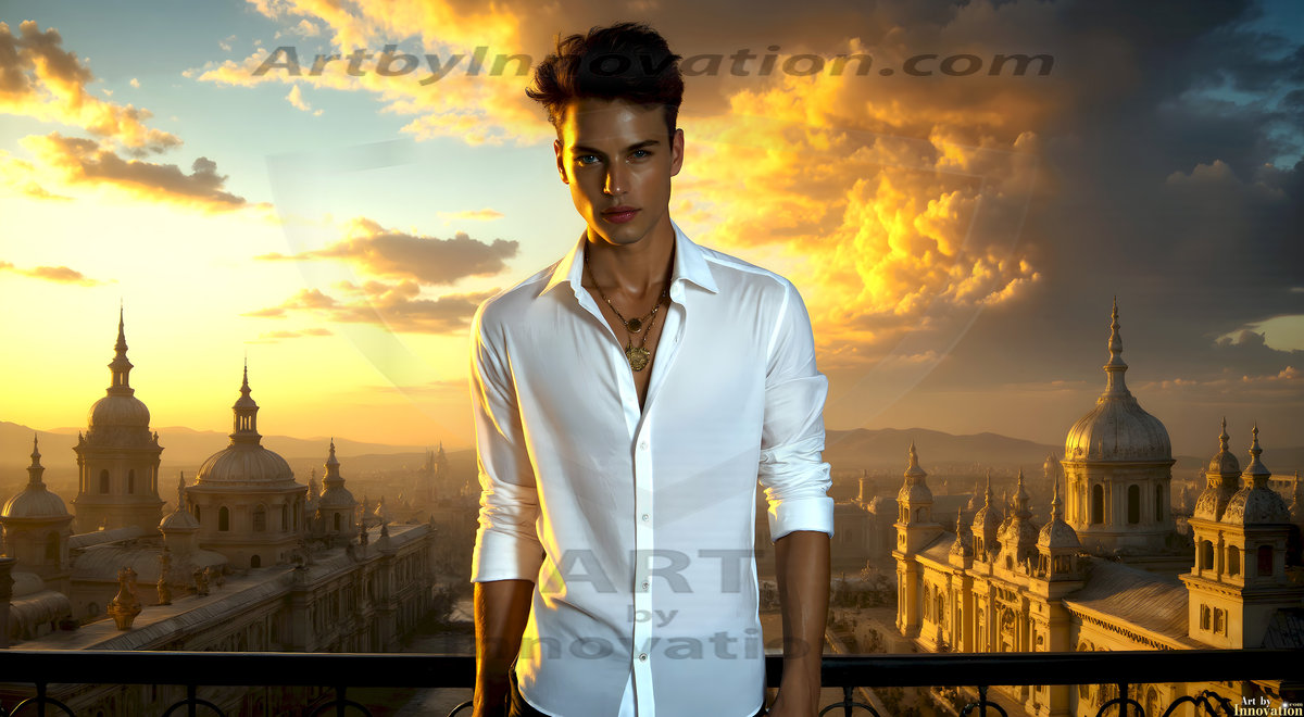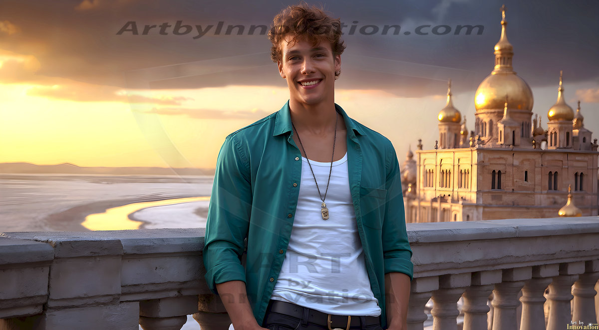 The Beautiful Young Men of the Golden City, is a collection of AI generated images of sexy, glamorous, handsome guys in the heavens. In this fantasy photograph of a young men in their late teens and 20's, overlooking a large golden city in the heavens. Generated to be as realistic as possible, in this this fantasy setting, with todays technology. Wearing jeans, an unbuttoned, vibrant, long-sleeve, button down shirt. The subject is enjoying a beautiful day outdoors. The mystical, galactic landscape, and the vibrant cosmic canopies, every detail, from the texture of the clouds, to the magnificent, majestic gothic architecture of the golden city, is crafted to create an atmosphere of reverence and divine glory. With a breathtaking scene, offering warm golden hour lighting. The heavenly landscape evokes a sense of freedom and tranquility, that is expresses through his facial features and smile, as day turns to night. The heavenly landscape evokes a sense of mysterious black space and light, with a vast galaxy that almost covers the image, the stars and constellations sparkle bright, in dark blue sky.