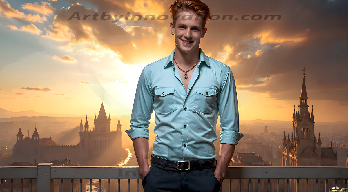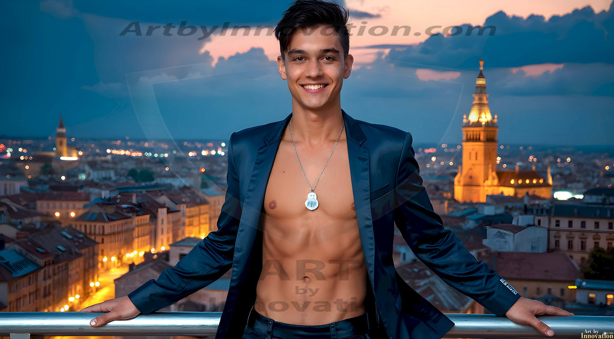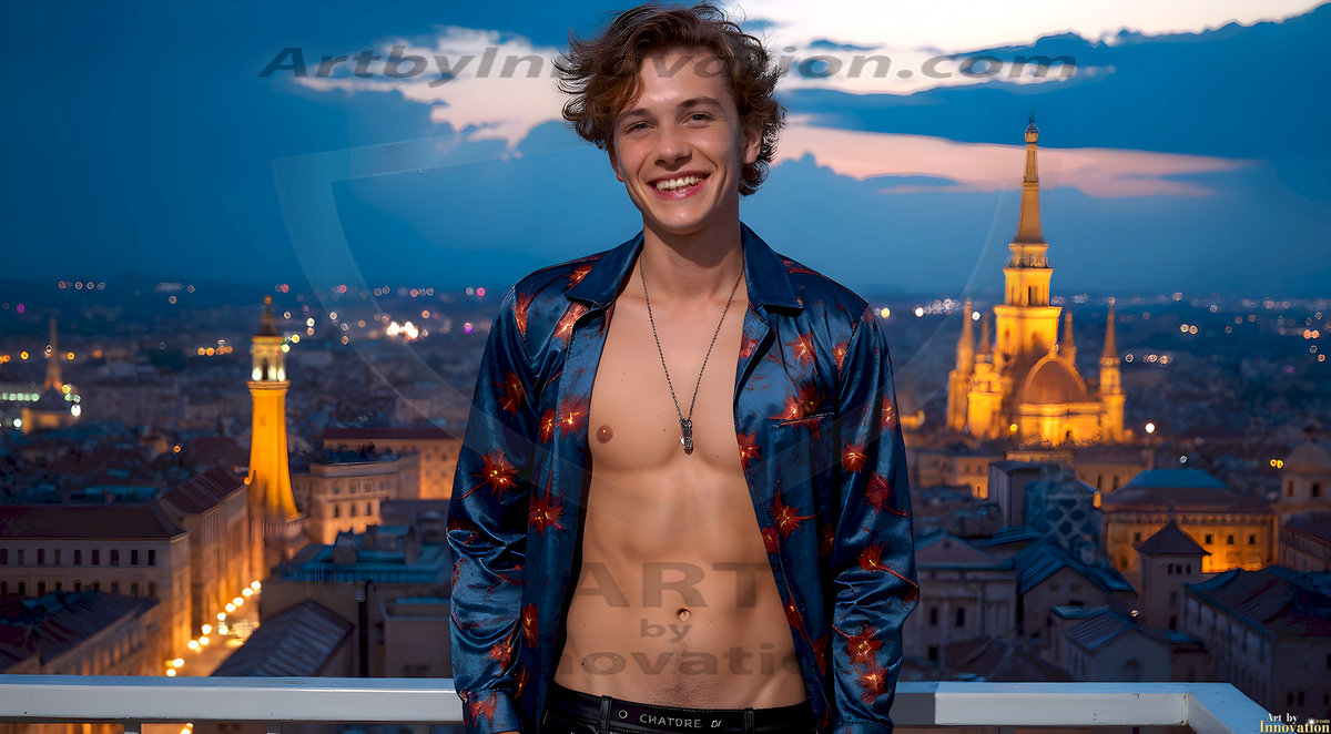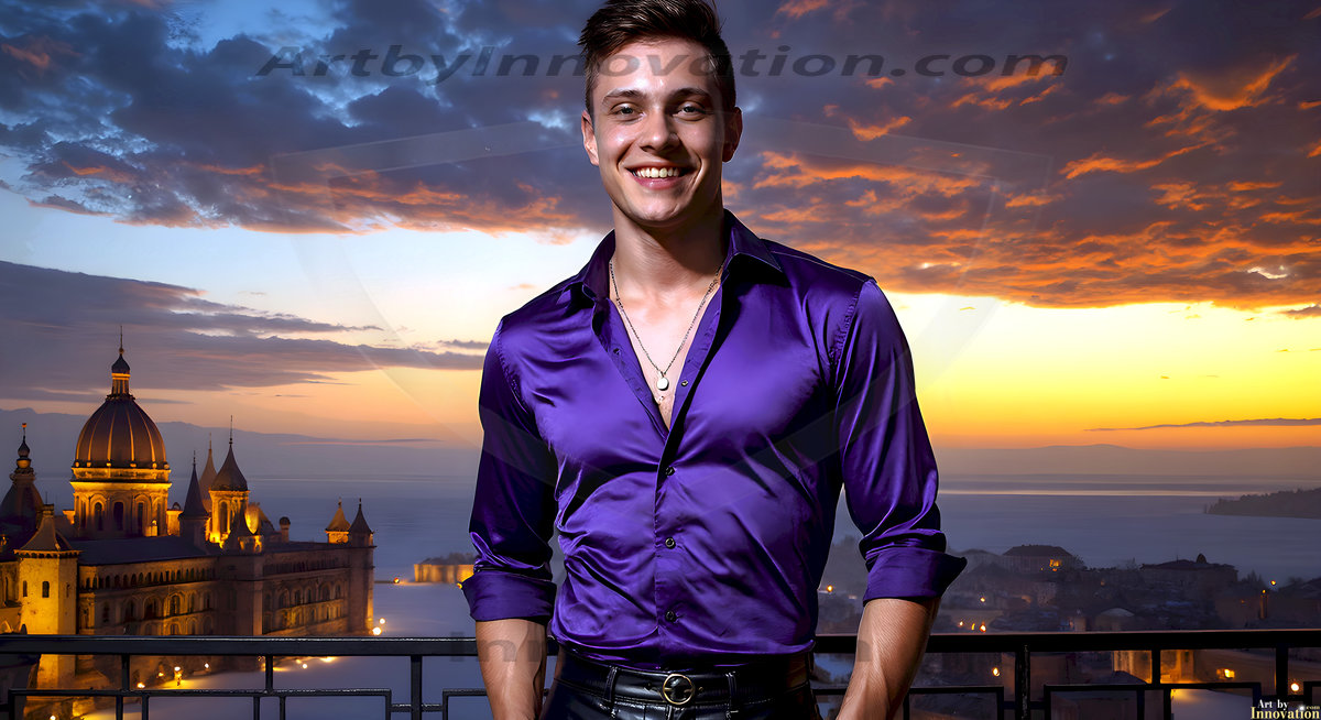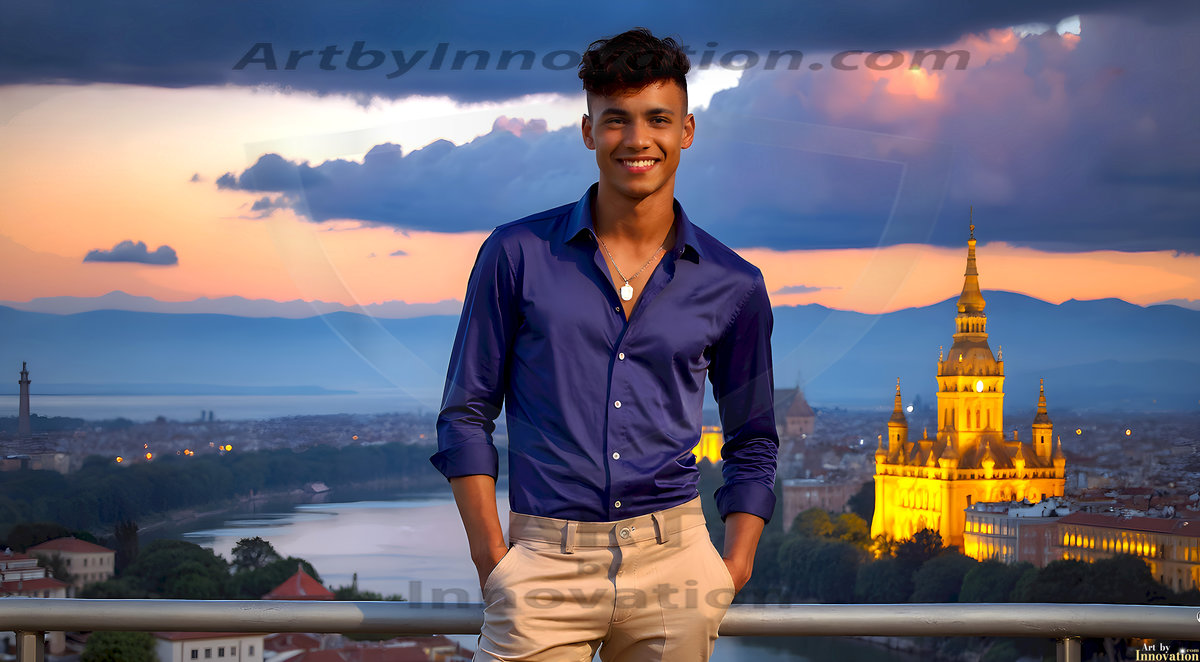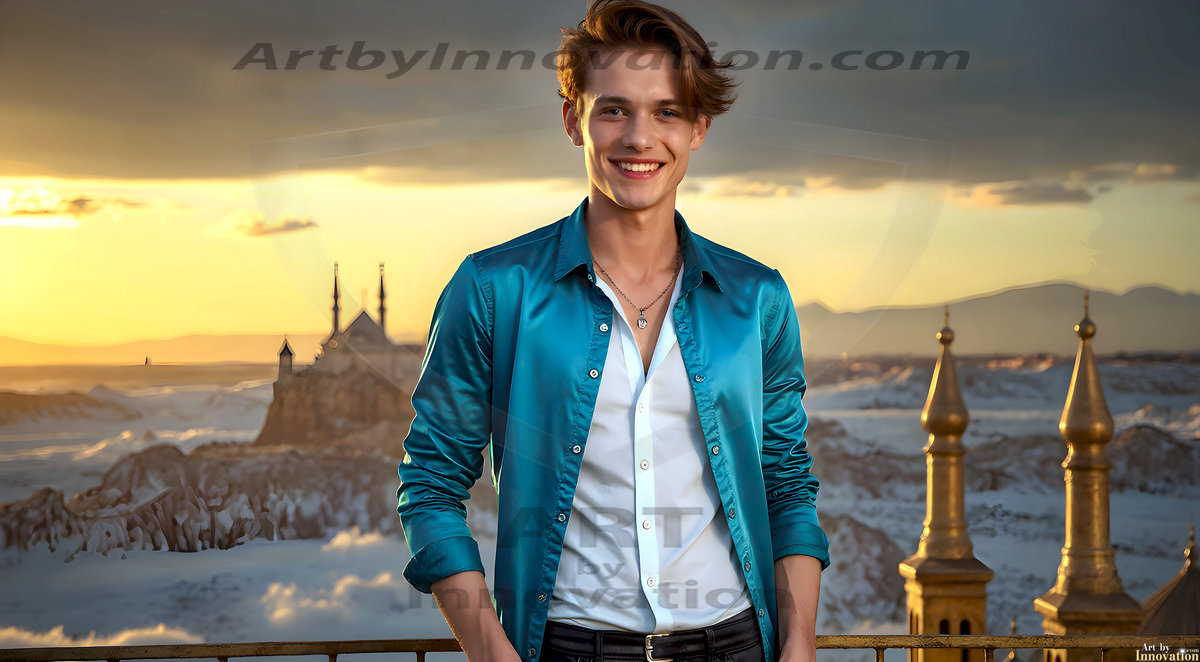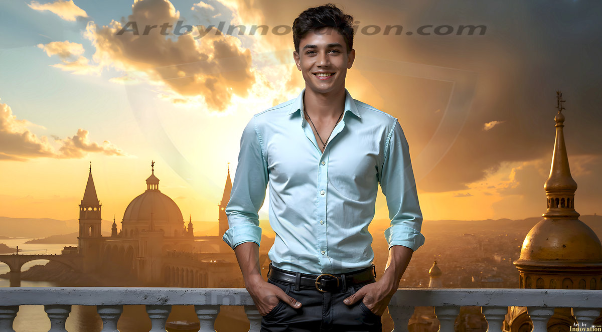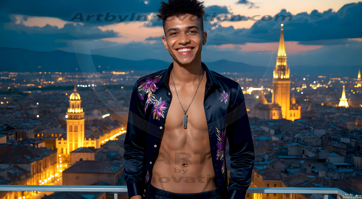 The Beautiful Young Men of the Golden City, is a collection of AI generated images of sexy, glamorous, handsome guys in the heavens. In this fantasy photograph of a young men in their late teens and 20's, overlooking a large golden city in the heavens. Generated to be as realistic as possible, in this this fantasy setting, with todays technology. Wearing jeans, an unbuttoned, vibrant, long-sleeve, button down shirt. The subject is enjoying a beautiful day outdoors. The mystical, galactic landscape, and the vibrant cosmic canopies, every detail, from the texture of the clouds, to the magnificent, majestic gothic architecture of the golden city, is crafted to create an atmosphere of reverence and divine glory. With a breathtaking scene, offering warm golden hour lighting. The heavenly landscape evokes a sense of freedom and tranquility, that is expresses through his facial features and smile, as day turns to night. The heavenly landscape evokes a sense of mysterious black space and light, with a vast galaxy that almost covers the image, the stars and constellations sparkle bright, in dark blue sky.
