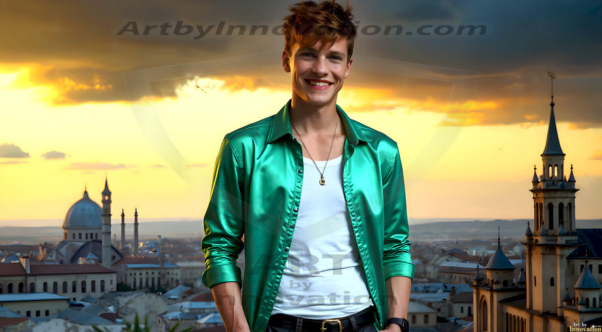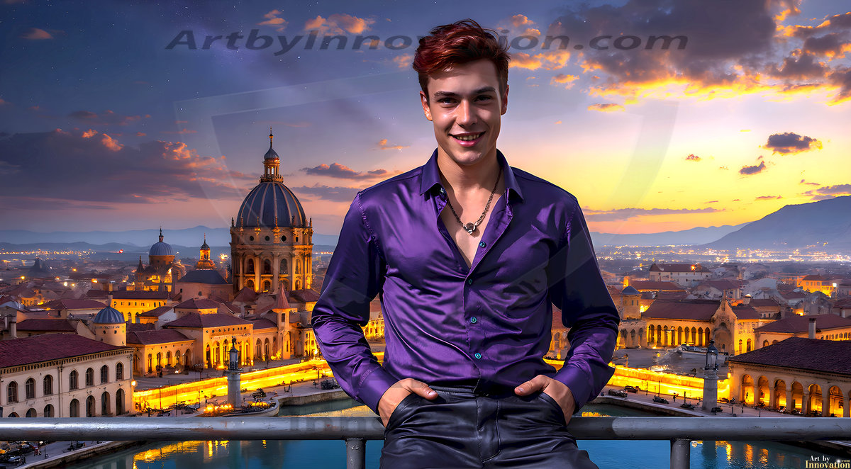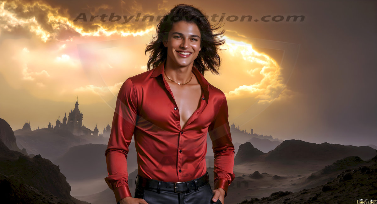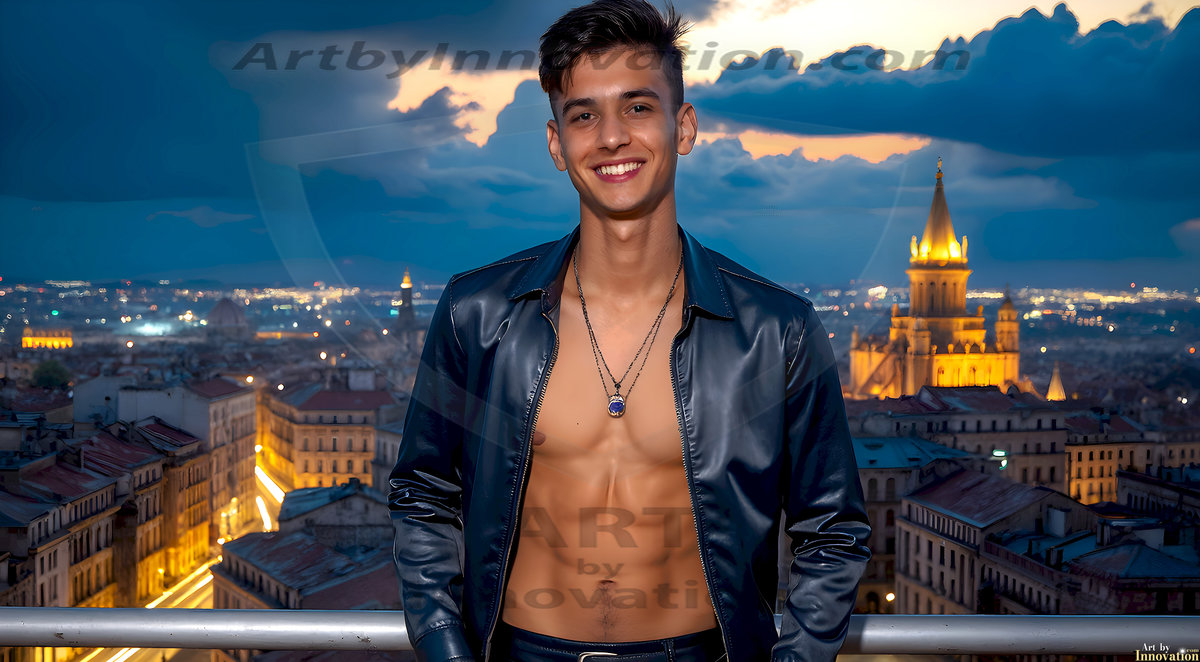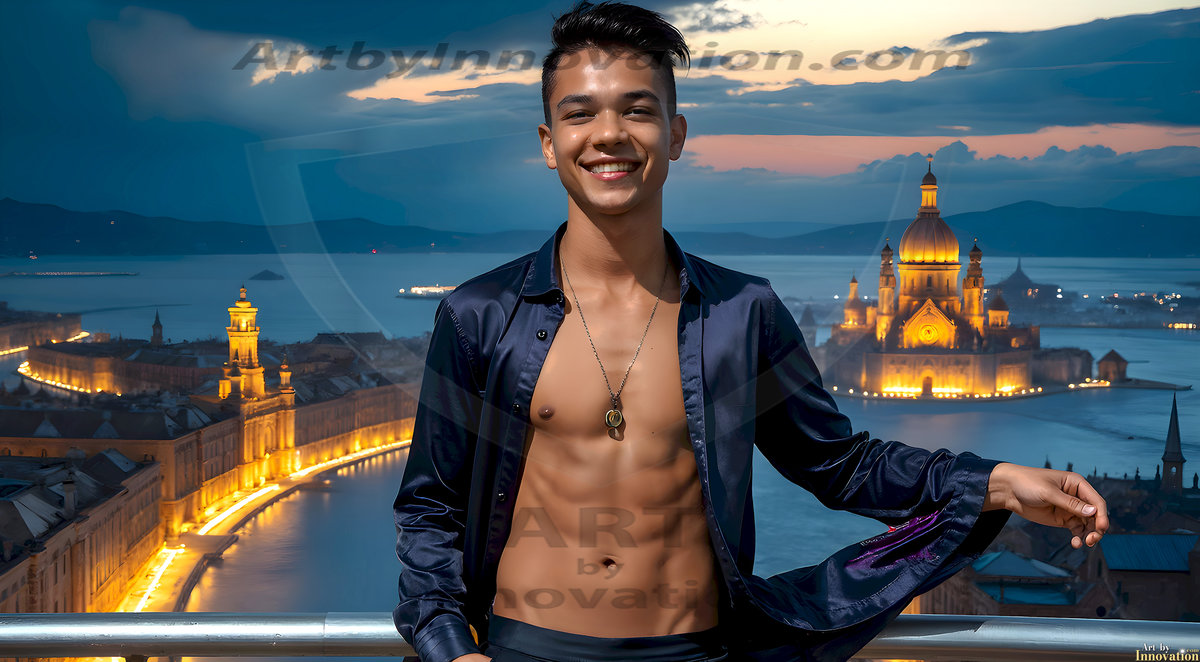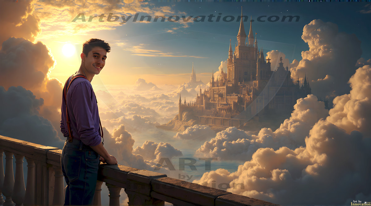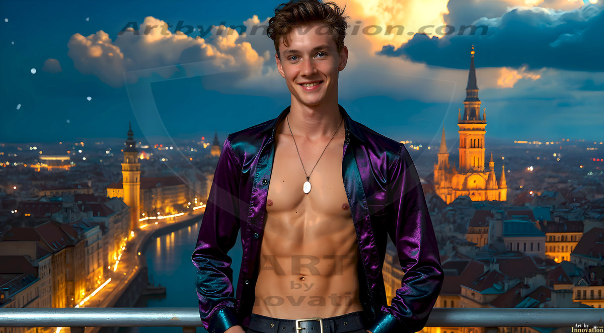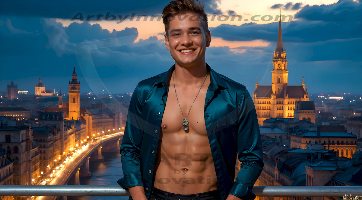 The Beautiful Young Men of the Golden City, is a collection of AI generated images of sexy, glamorous, handsome guys in the heavens. In this fantasy photograph of a young men in their late teens and 20's, overlooking a large golden city in the heavens. Generated to be as realistic as possible, in this this fantasy setting, with todays technology. Wearing jeans, an unbuttoned, vibrant, long-sleeve, button down shirt. The subject is enjoying a beautiful day outdoors. The mystical, galactic landscape, and the vibrant cosmic canopies, every detail, from the texture of the clouds, to the magnificent, majestic gothic architecture of the golden city, is crafted to create an atmosphere of reverence and divine glory. With a breathtaking scene, offering warm golden hour lighting. The heavenly landscape evokes a sense of freedom and tranquility, that is expresses through his facial features and smile, as day turns to night. The heavenly landscape evokes a sense of mysterious black space and light, with a vast galaxy that almost covers the image, the stars and constellations sparkle bright, in dark blue sky.