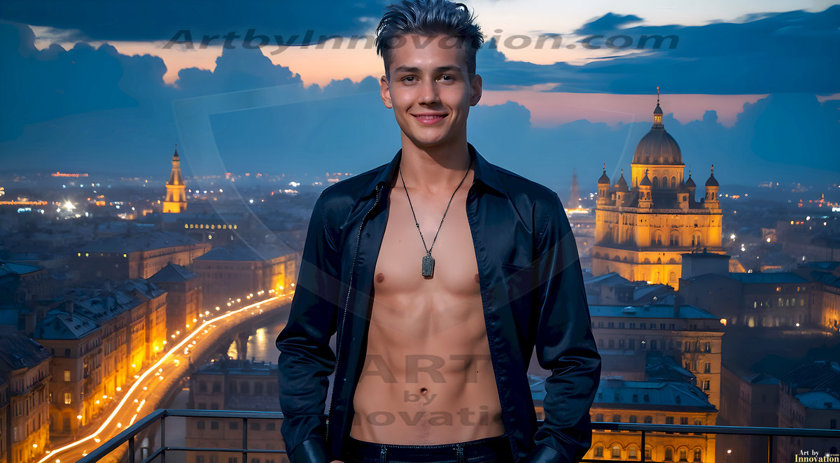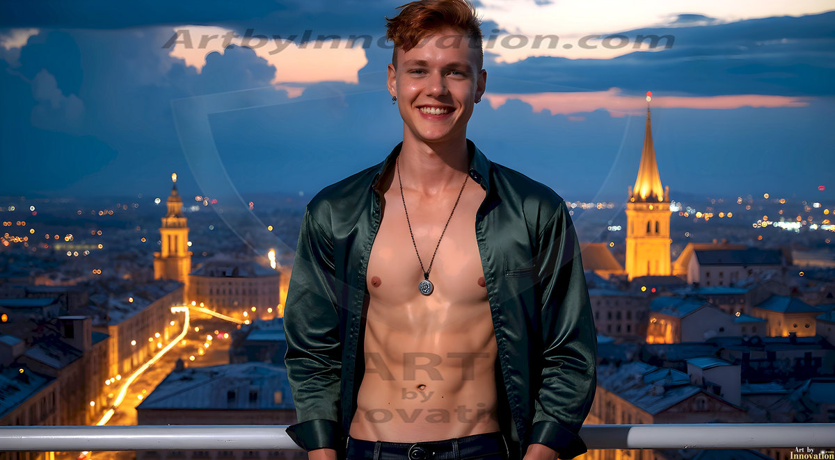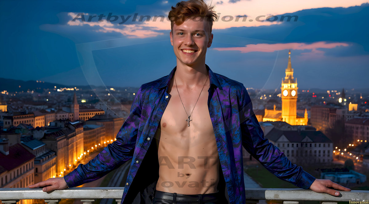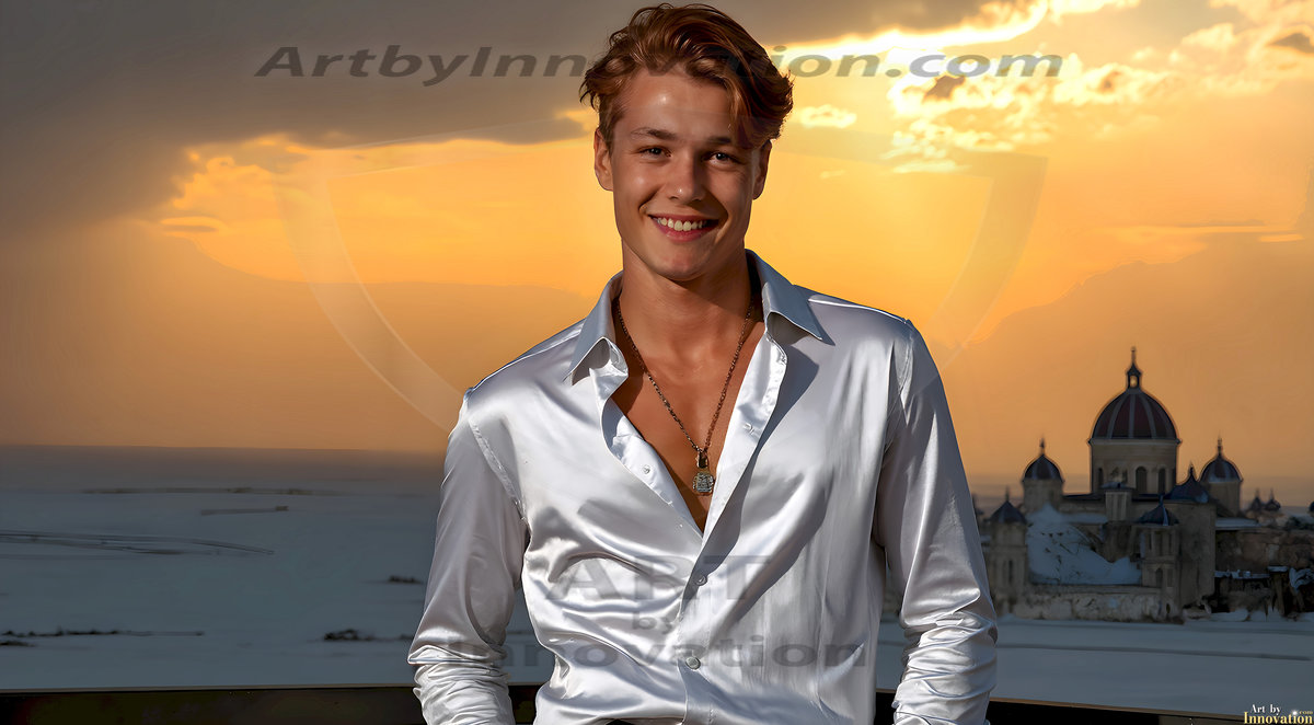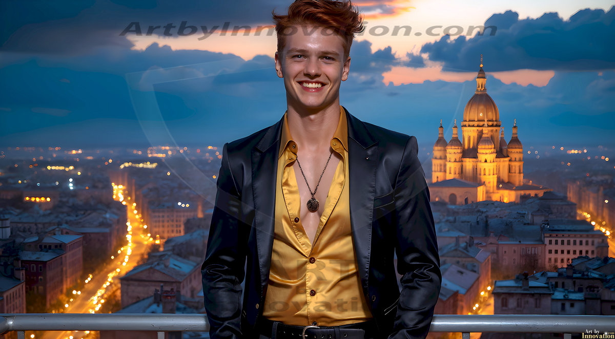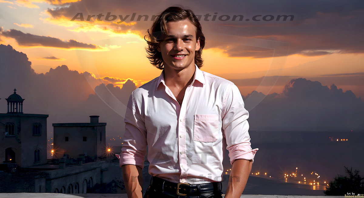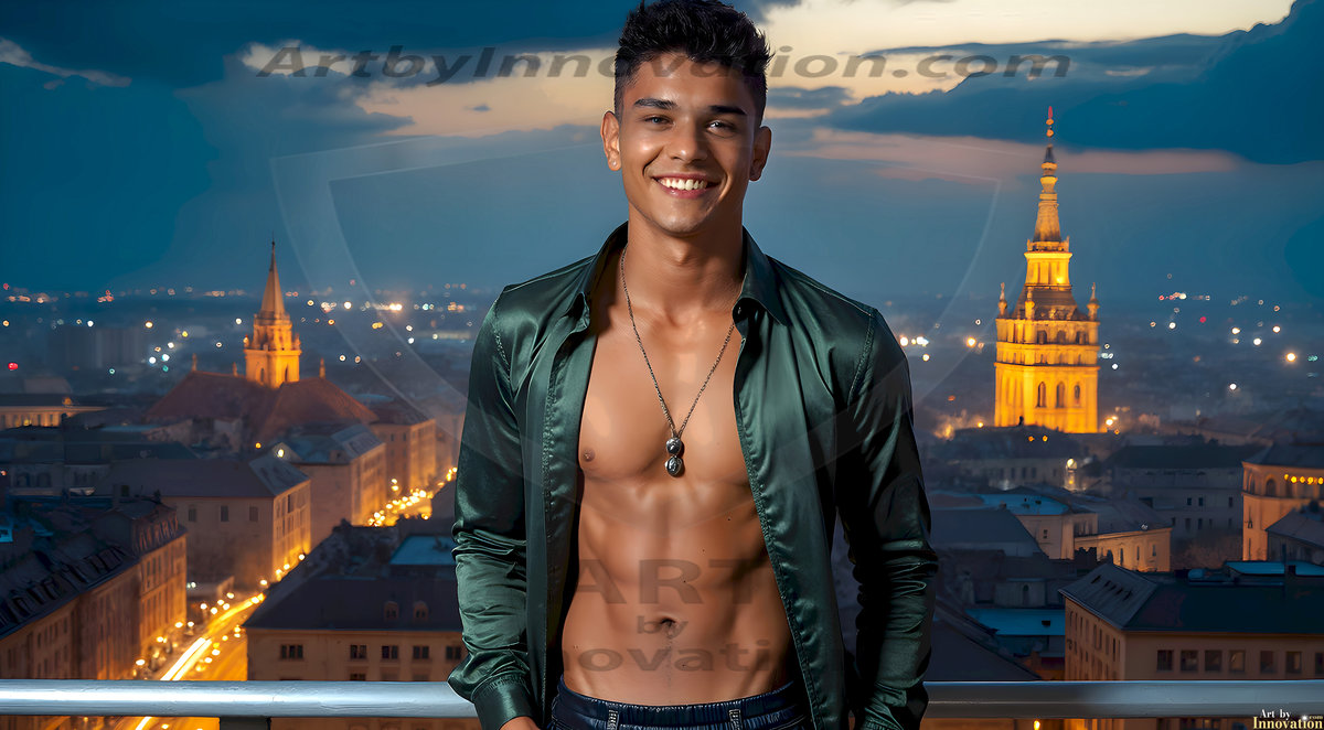 The Beautiful Young Men of the Golden City, is a collection of AI generated images of sexy, glamorous, handsome guys in the heavens. In this fantasy photograph of a young men in their late teens and 20's, overlooking a large golden city in the heavens. Generated to be as realistic as possible, in this this fantasy setting, with todays technology. Wearing jeans, an unbuttoned, vibrant, long-sleeve, button down shirt. The subject is enjoying a beautiful day outdoors. The mystical, galactic landscape, and the vibrant cosmic canopies, every detail, from the texture of the clouds, to the magnificent, majestic gothic architecture of the golden city, is crafted to create an atmosphere of reverence and divine glory. With a breathtaking scene, offering warm golden hour lighting. The heavenly landscape evokes a sense of freedom and tranquility, that is expresses through his facial features and smile, as day turns to night. The heavenly landscape evokes a sense of mysterious black space and light, with a vast galaxy that almost covers the image, the stars and constellations sparkle bright, in dark blue sky.