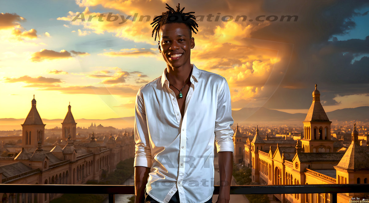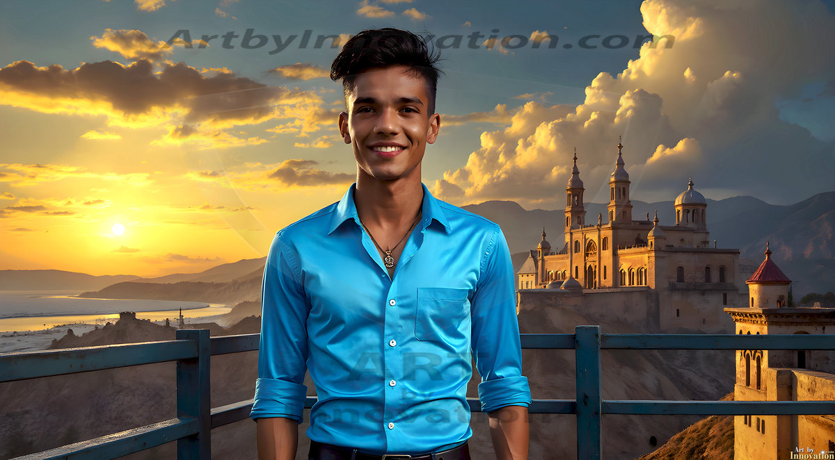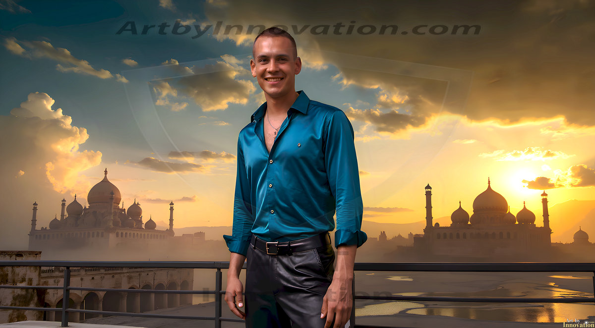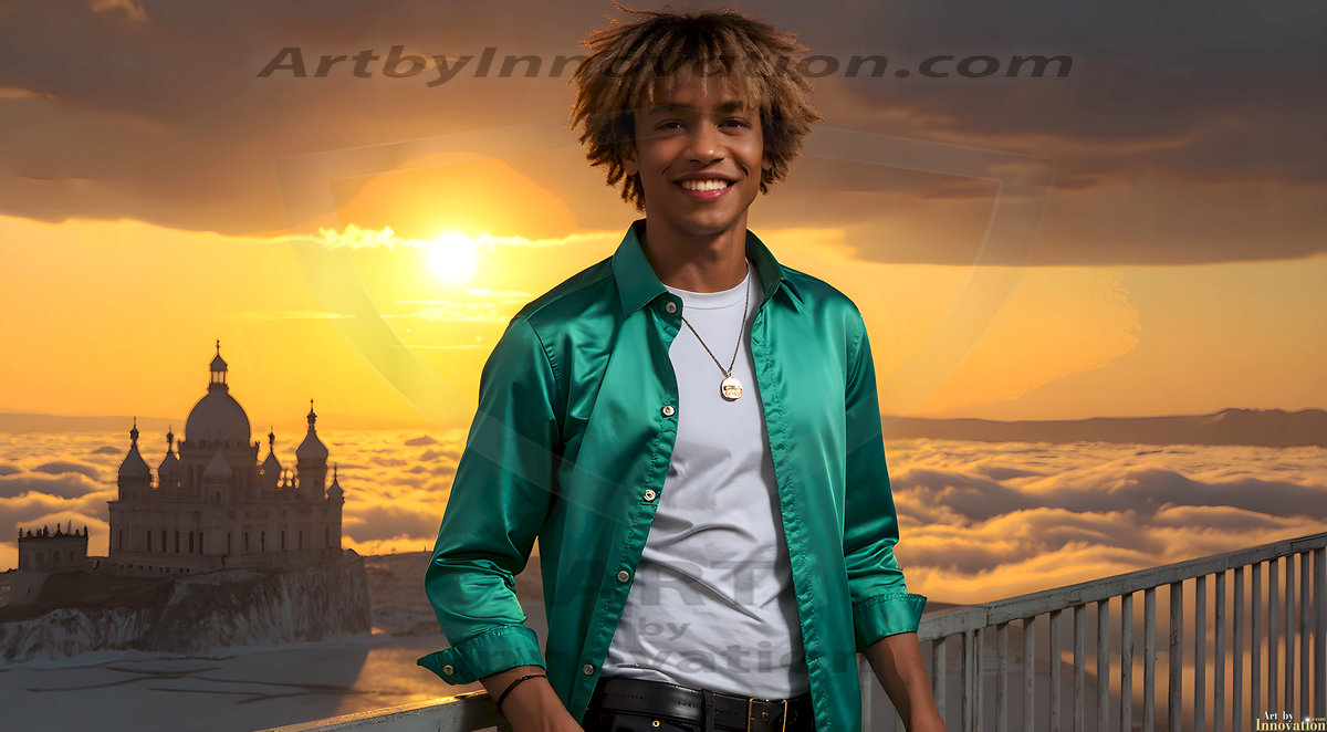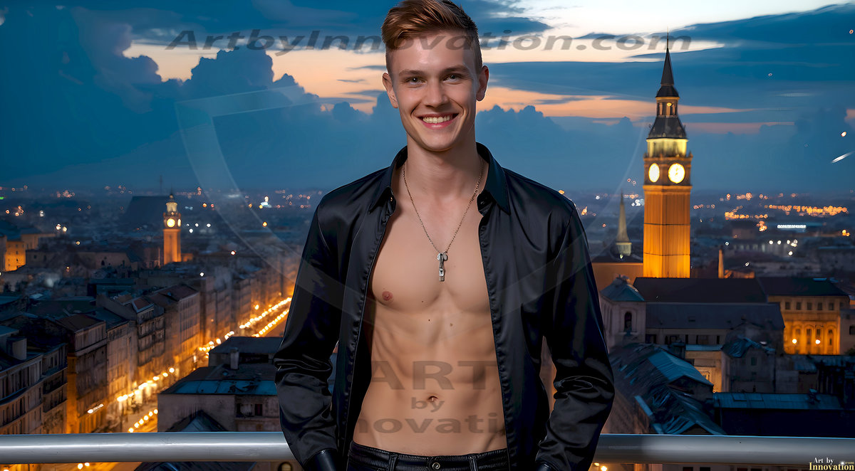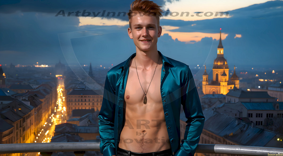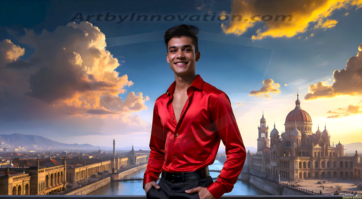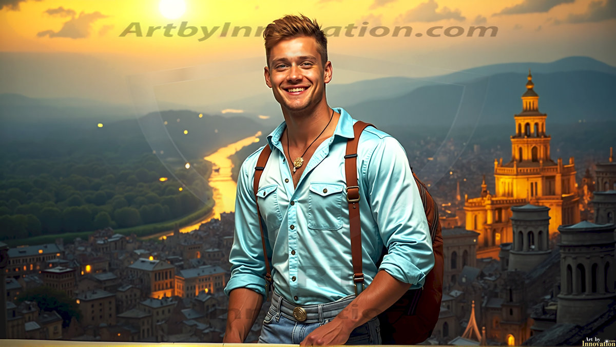 The Beautiful Young Men of the Golden City, is a collection of AI generated images of sexy, glamorous, handsome guys in the heavens. In this fantasy photograph of a young men in their late teens and 20's, overlooking a large golden city in the heavens. Generated to be as realistic as possible, in this this fantasy setting, with todays technology. Wearing jeans, an unbuttoned, vibrant, long-sleeve, button down shirt. The subject is enjoying a beautiful day outdoors. The mystical, galactic landscape, and the vibrant cosmic canopies, every detail, from the texture of the clouds, to the magnificent, majestic gothic architecture of the golden city, is crafted to create an atmosphere of reverence and divine glory. With a breathtaking scene, offering warm golden hour lighting. The heavenly landscape evokes a sense of freedom and tranquility, that is expresses through his facial features and smile, as day turns to night. The heavenly landscape evokes a sense of mysterious black space and light, with a vast galaxy that almost covers the image, the stars and constellations sparkle bright, in dark blue sky.