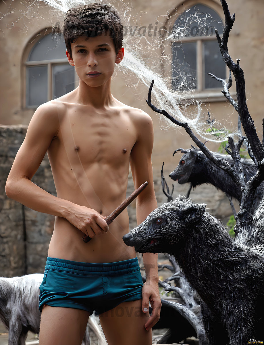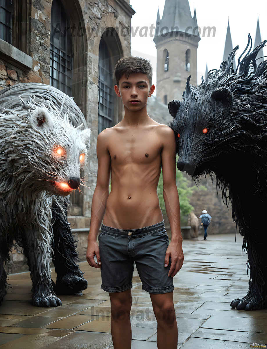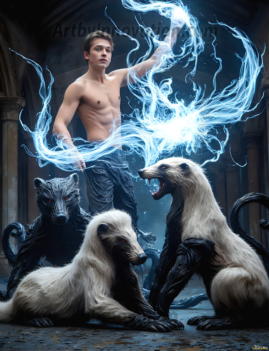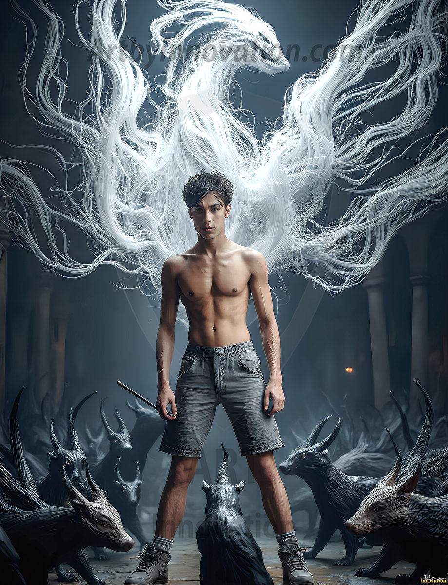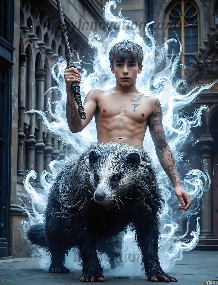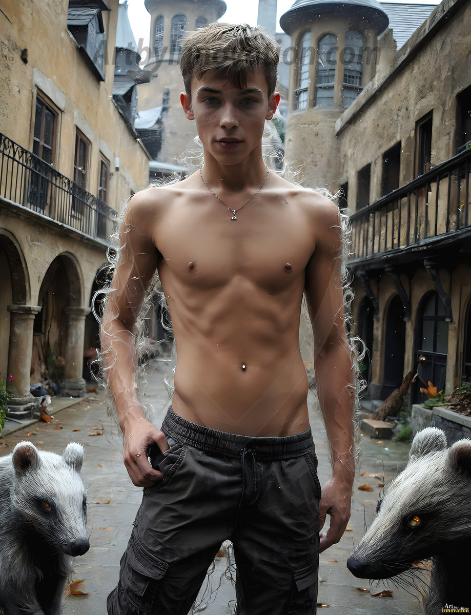 AI male art photos with a fantastical atmosphere. Imagine a Hogwarts School of Witchcraft student, from the Harry Potter series, a handsome, beautiful, and attractive, shirtless young teenage boy, standing firm against a threat. With a detailed Hogwarts castle background, casting a powerful spell, conjuring creatures based on their assigned house crest. From Demonic snakes, powerful lions, fierce badgers, or a murder of Crows. Dementors floating ominously in a cloudy sky, and sparks, shadows, and cinematic lighting, offering an otherworldly vibe.