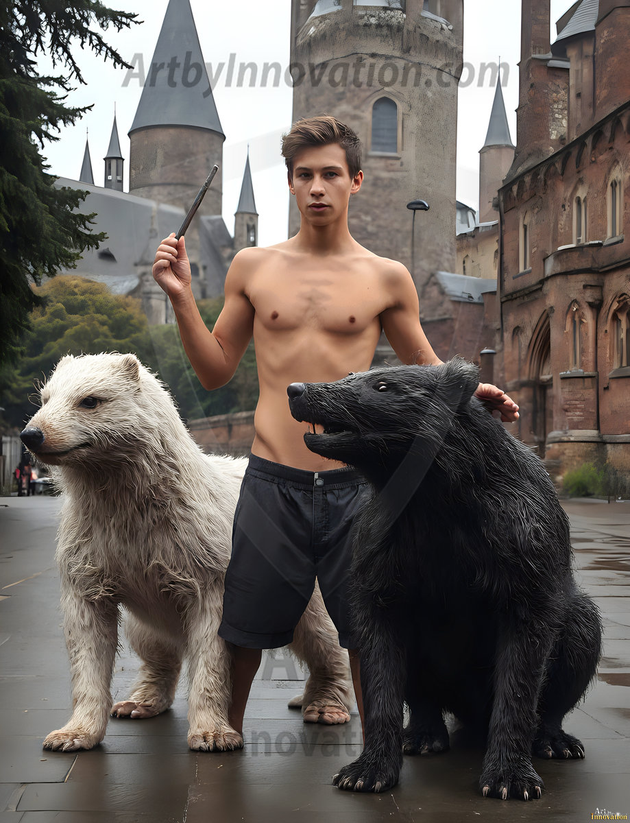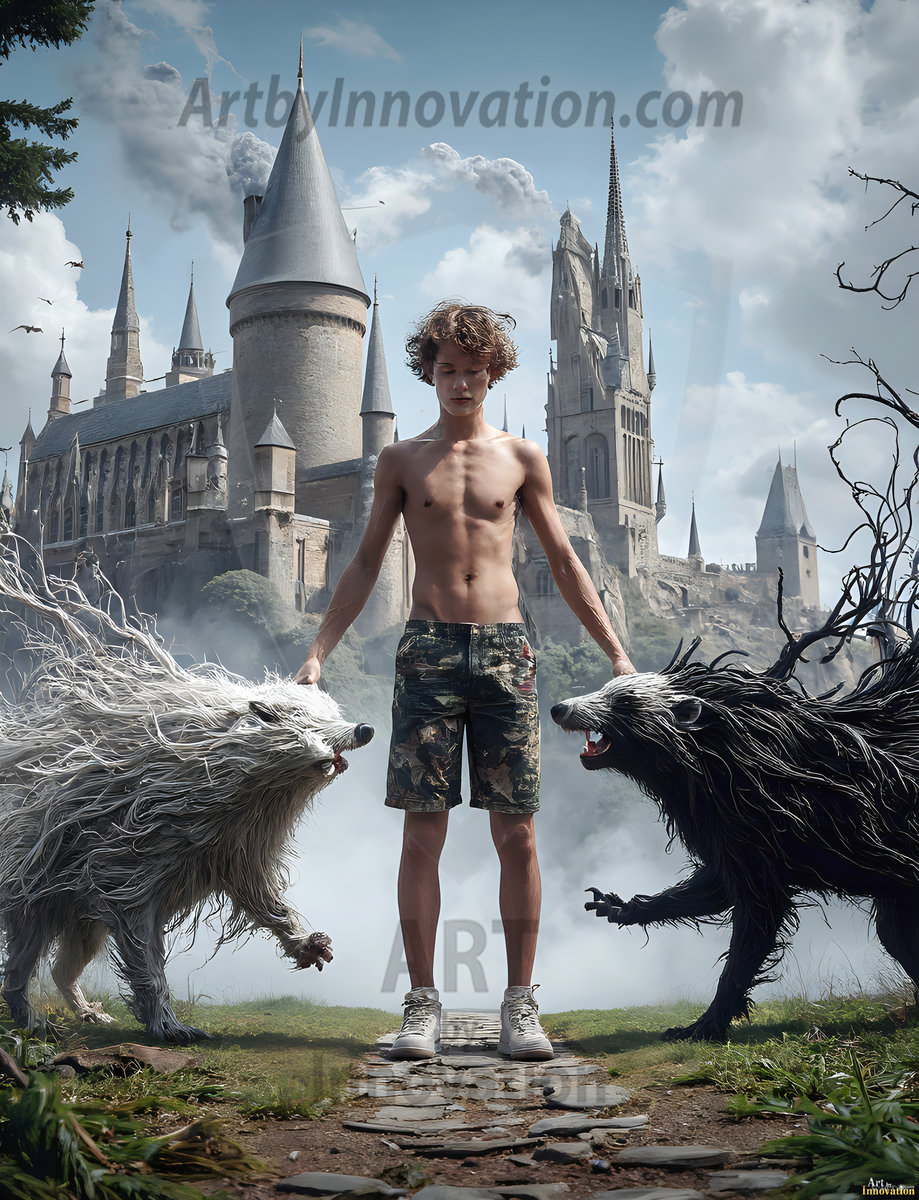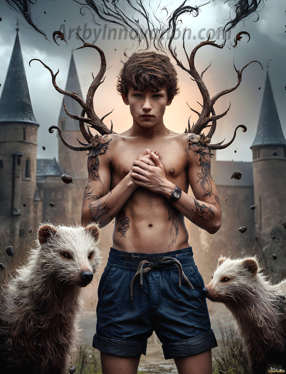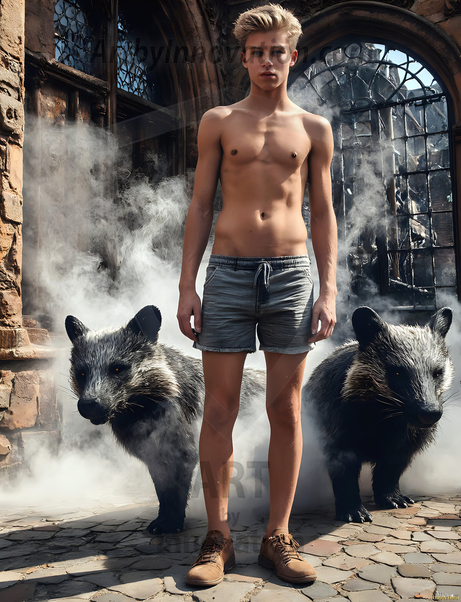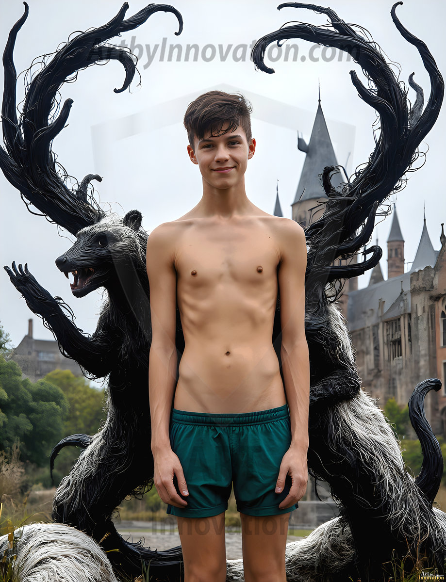 AI male art photos with a fantastical atmosphere. Imagine a Hogwarts School of Witchcraft student, from the Harry Potter series, a handsome, beautiful, and attractive, shirtless young teenage boy, standing firm against a threat. With a detailed Hogwarts castle background, casting a powerful spell, conjuring creatures based on their assigned house crest. From Demonic snakes, powerful lions, fierce badgers, or a murder of Crows. Dementors floating ominously in a cloudy sky, and sparks, shadows, and cinematic lighting, offering an otherworldly vibe.