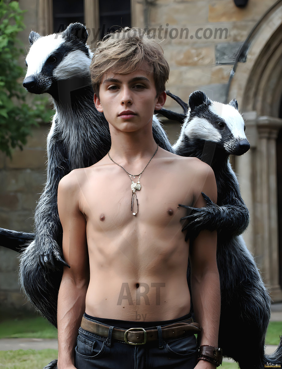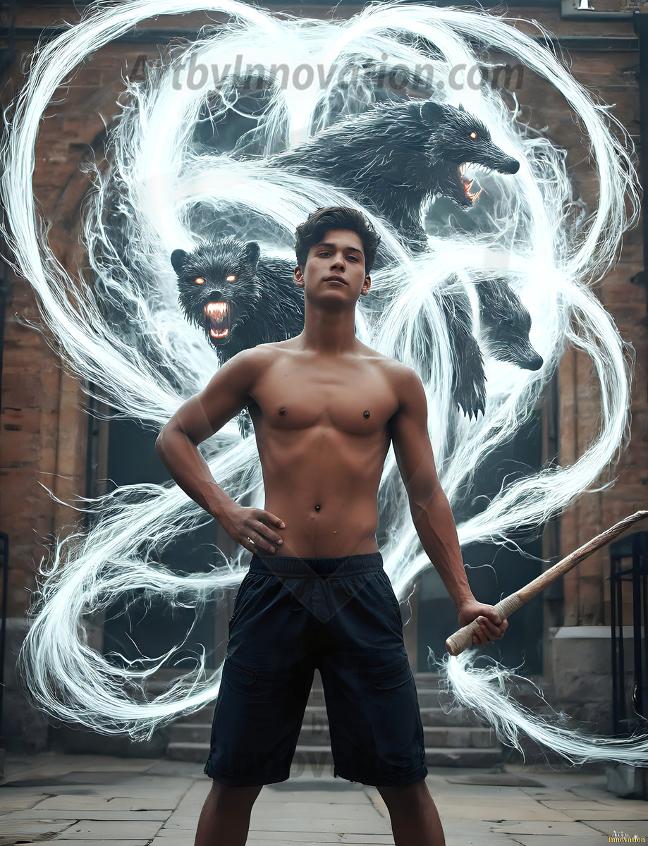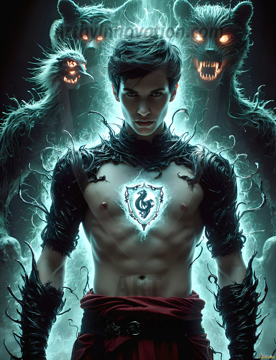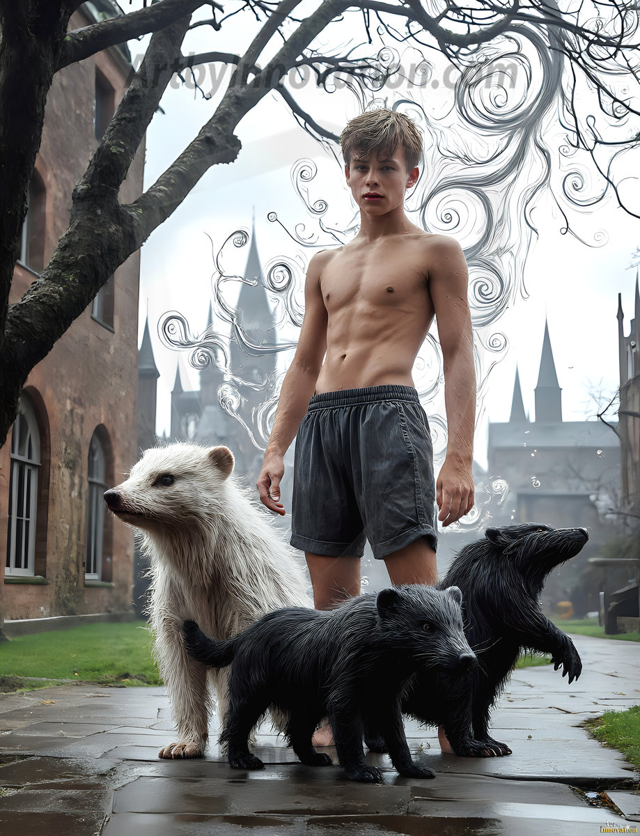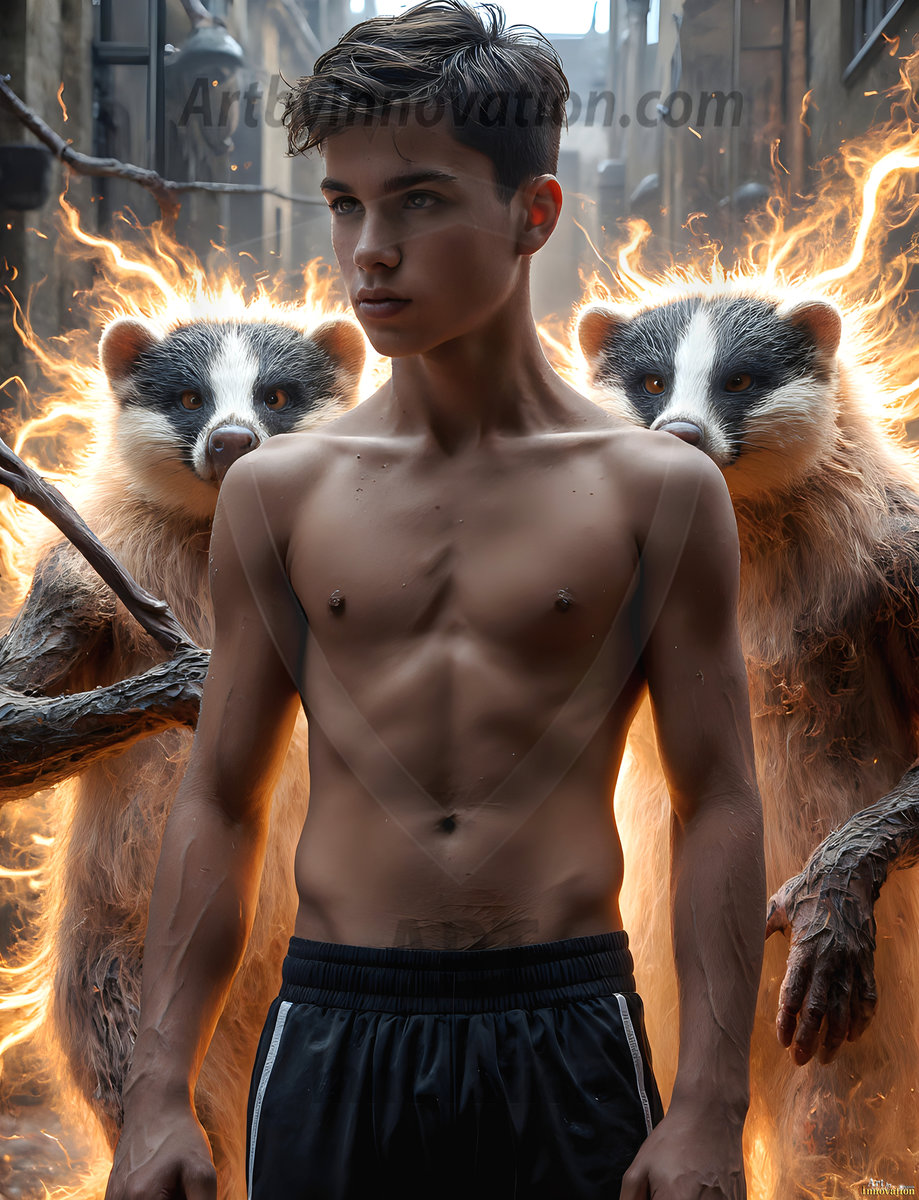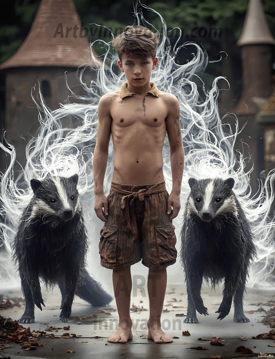 AI male art photos with a fantastical atmosphere. Imagine a Hogwarts School of Witchcraft student, from the Harry Potter series, a handsome, beautiful, and attractive, shirtless young teenage boy, standing firm against a threat. With a detailed Hogwarts castle background, casting a powerful spell, conjuring creatures based on their assigned house crest. From Demonic snakes, powerful lions, fierce badgers, or a murder of Crows. Dementors floating ominously in a cloudy sky, and sparks, shadows, and cinematic lighting, offering an otherworldly vibe.