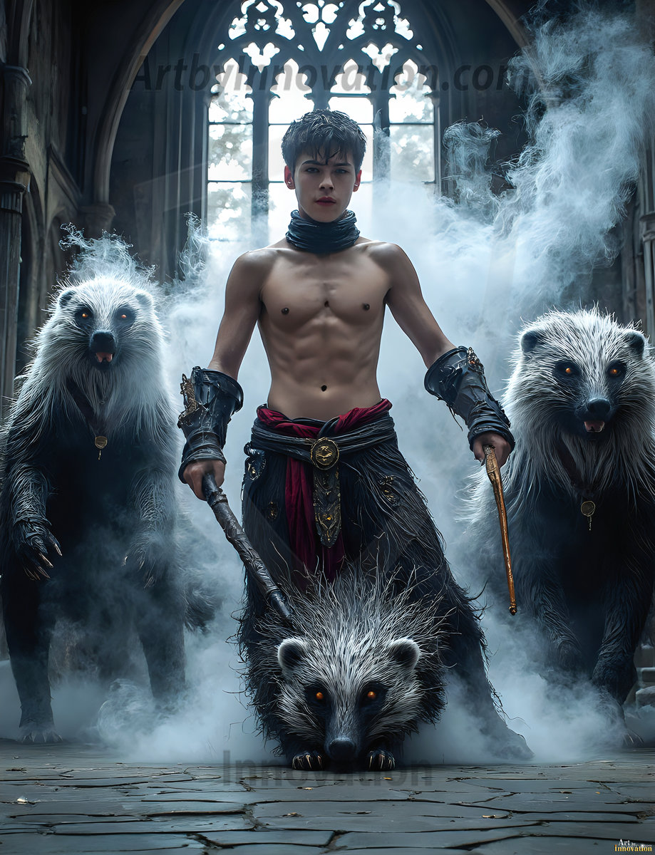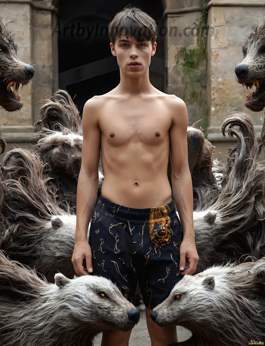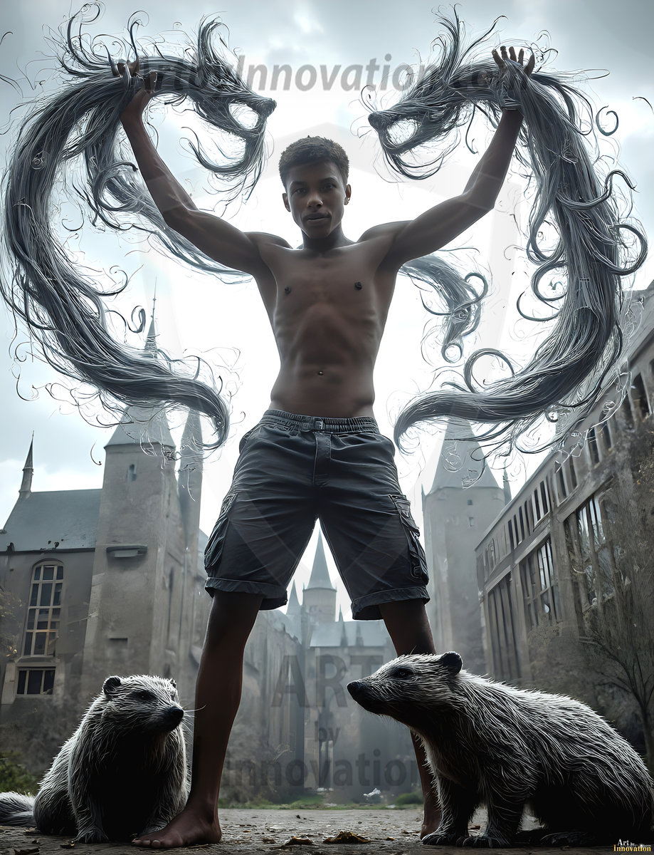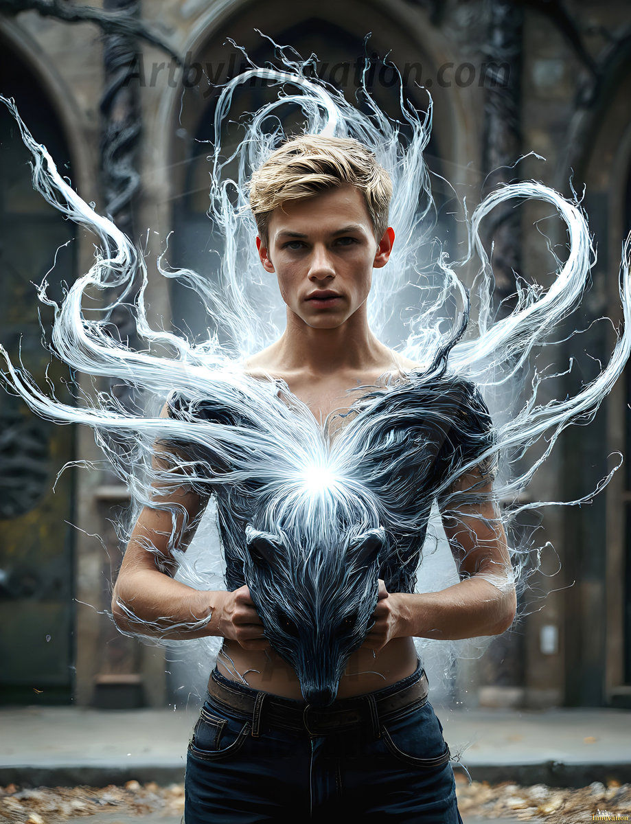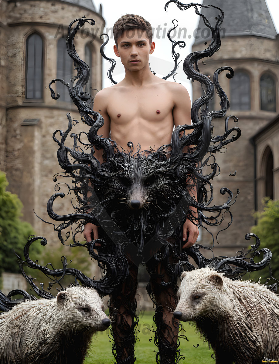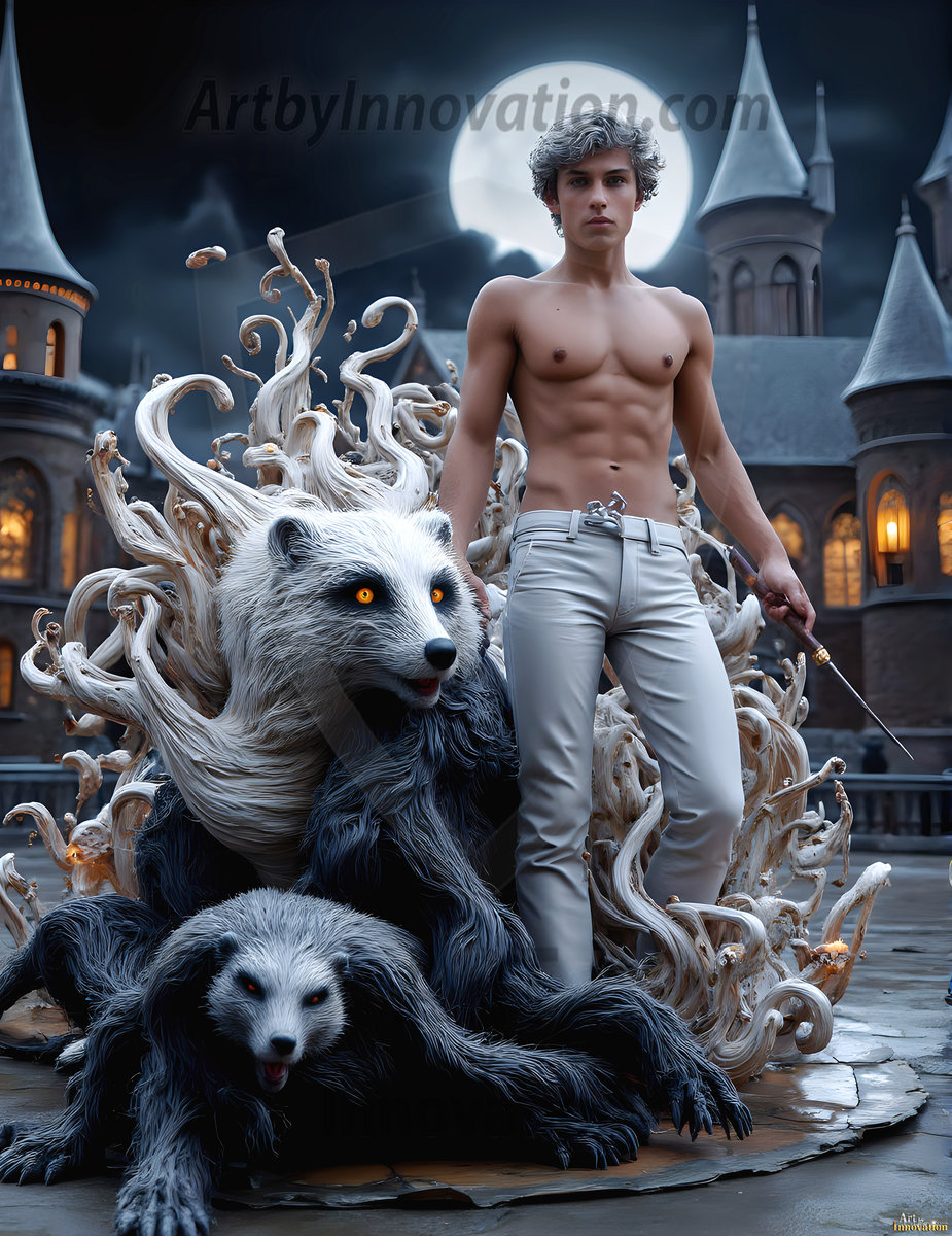 AI male art photos with a fantastical atmosphere. Imagine a Hogwarts School of Witchcraft student, from the Harry Potter series, a handsome, beautiful, and attractive, shirtless young teenage boy, standing firm against a threat. With a detailed Hogwarts castle background, casting a powerful spell, conjuring creatures based on their assigned house crest. From Demonic snakes, powerful lions, fierce badgers, or a murder of Crows. Dementors floating ominously in a cloudy sky, and sparks, shadows, and cinematic lighting, offering an otherworldly vibe.