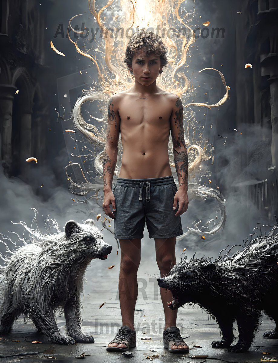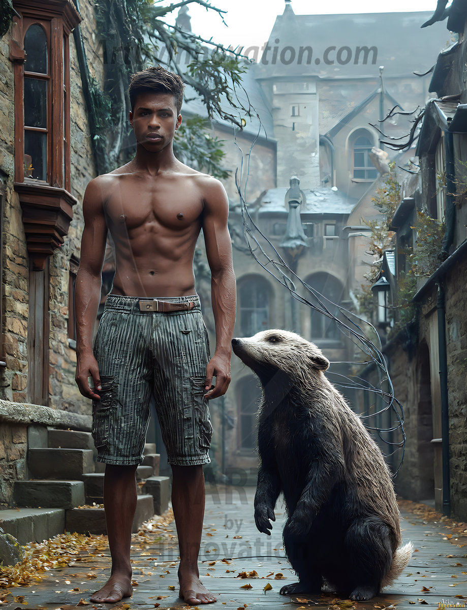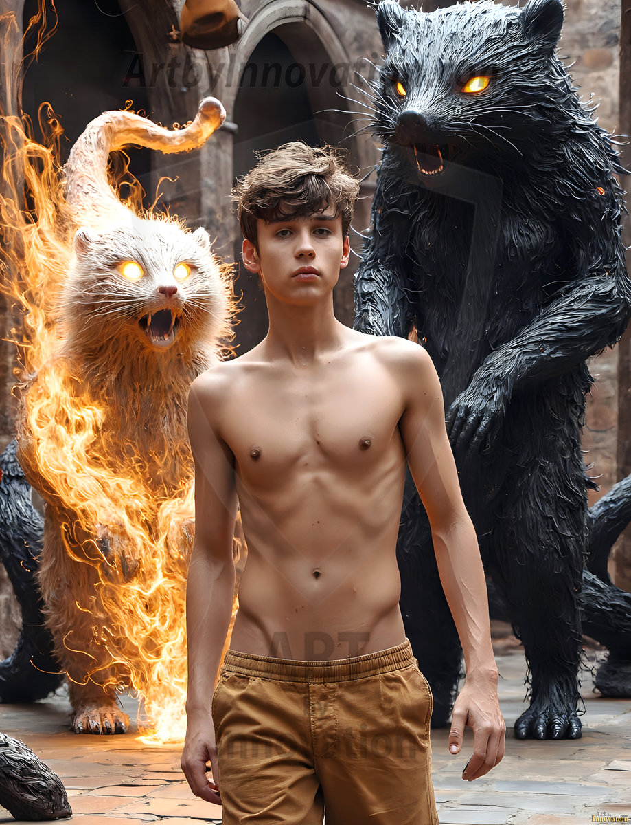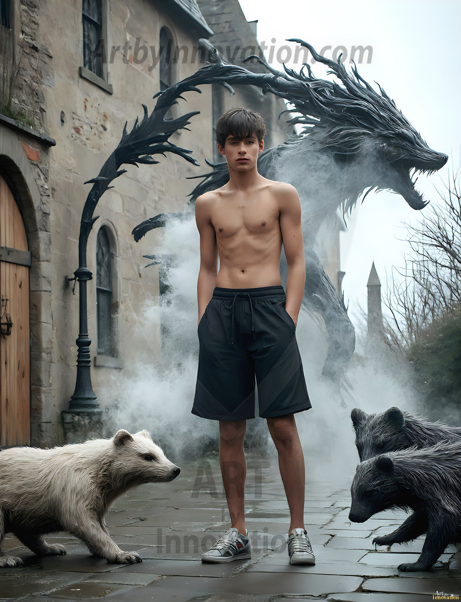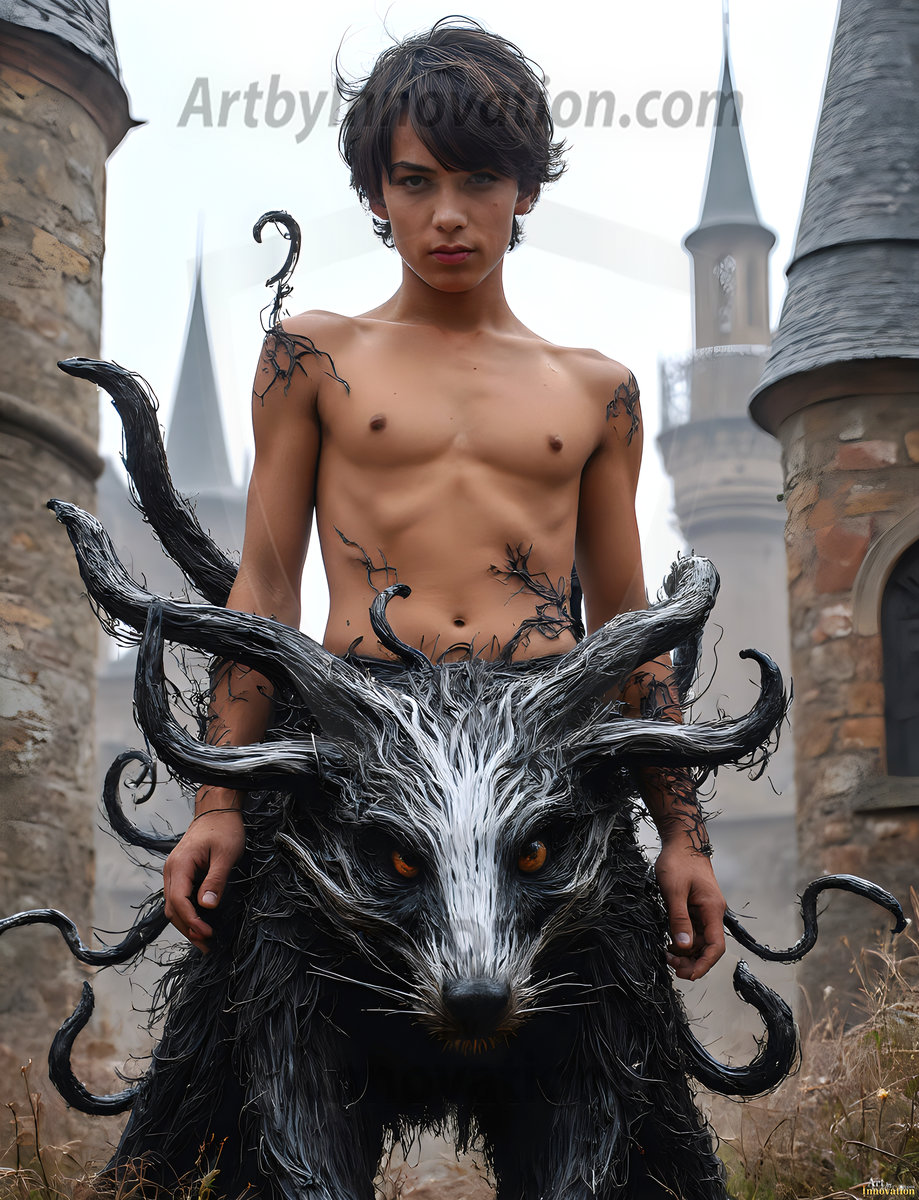 AI male art photos with a fantastical atmosphere. Imagine a Hogwarts School of Witchcraft student, from the Harry Potter series, a handsome, beautiful, and attractive, shirtless young teenage boy, standing firm against a threat. With a detailed Hogwarts castle background, casting a powerful spell, conjuring creatures based on their assigned house crest. From Demonic snakes, powerful lions, fierce badgers, or a murder of Crows. Dementors floating ominously in a cloudy sky, and sparks, shadows, and cinematic lighting, offering an otherworldly vibe.