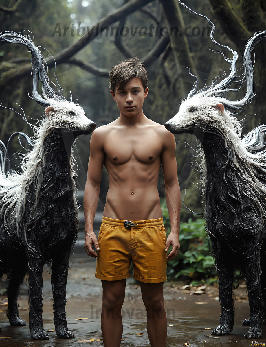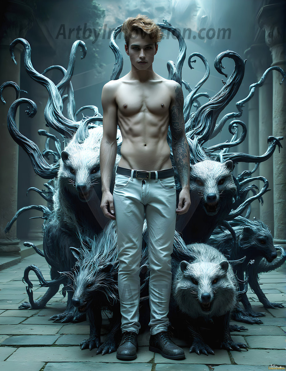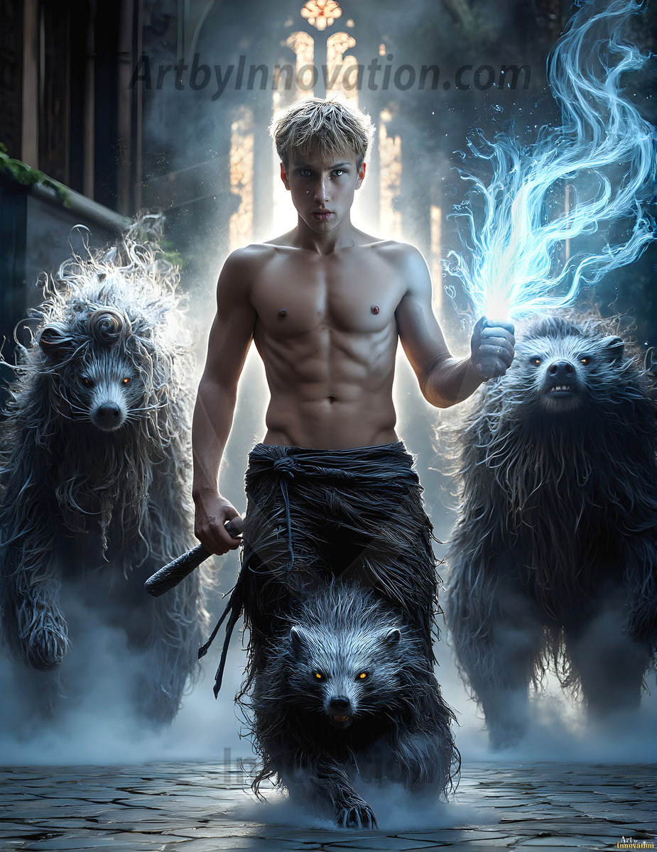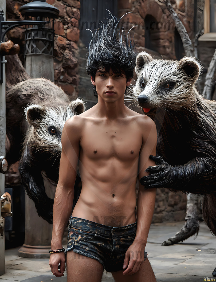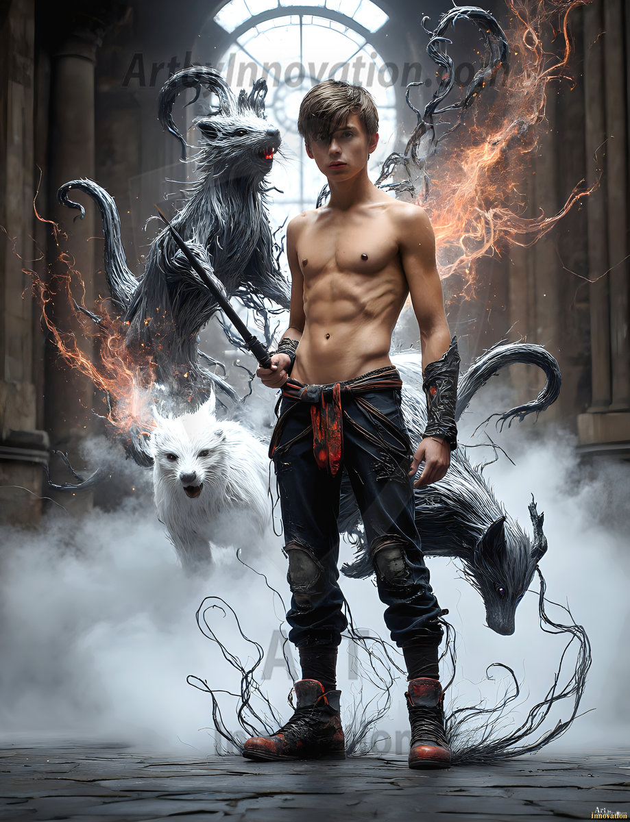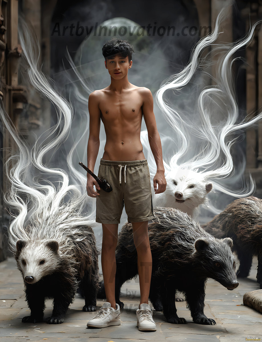 AI male art photos with a fantastical atmosphere. Imagine a Hogwarts School of Witchcraft student, from the Harry Potter series, a handsome, beautiful, and attractive, shirtless young teenage boy, standing firm against a threat. With a detailed Hogwarts castle background, casting a powerful spell, conjuring creatures based on their assigned house crest. From Demonic snakes, powerful lions, fierce badgers, or a murder of Crows. Dementors floating ominously in a cloudy sky, and sparks, shadows, and cinematic lighting, offering an otherworldly vibe.