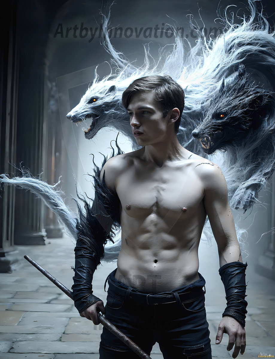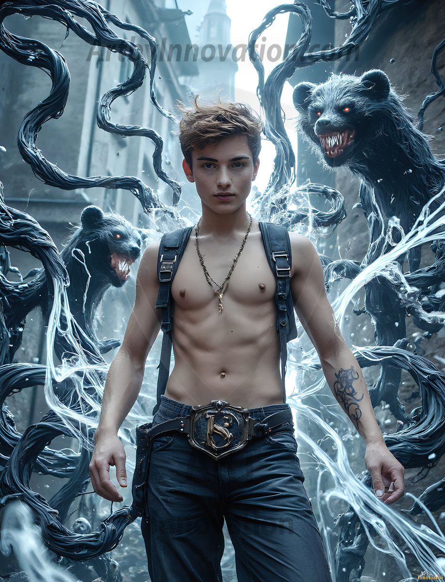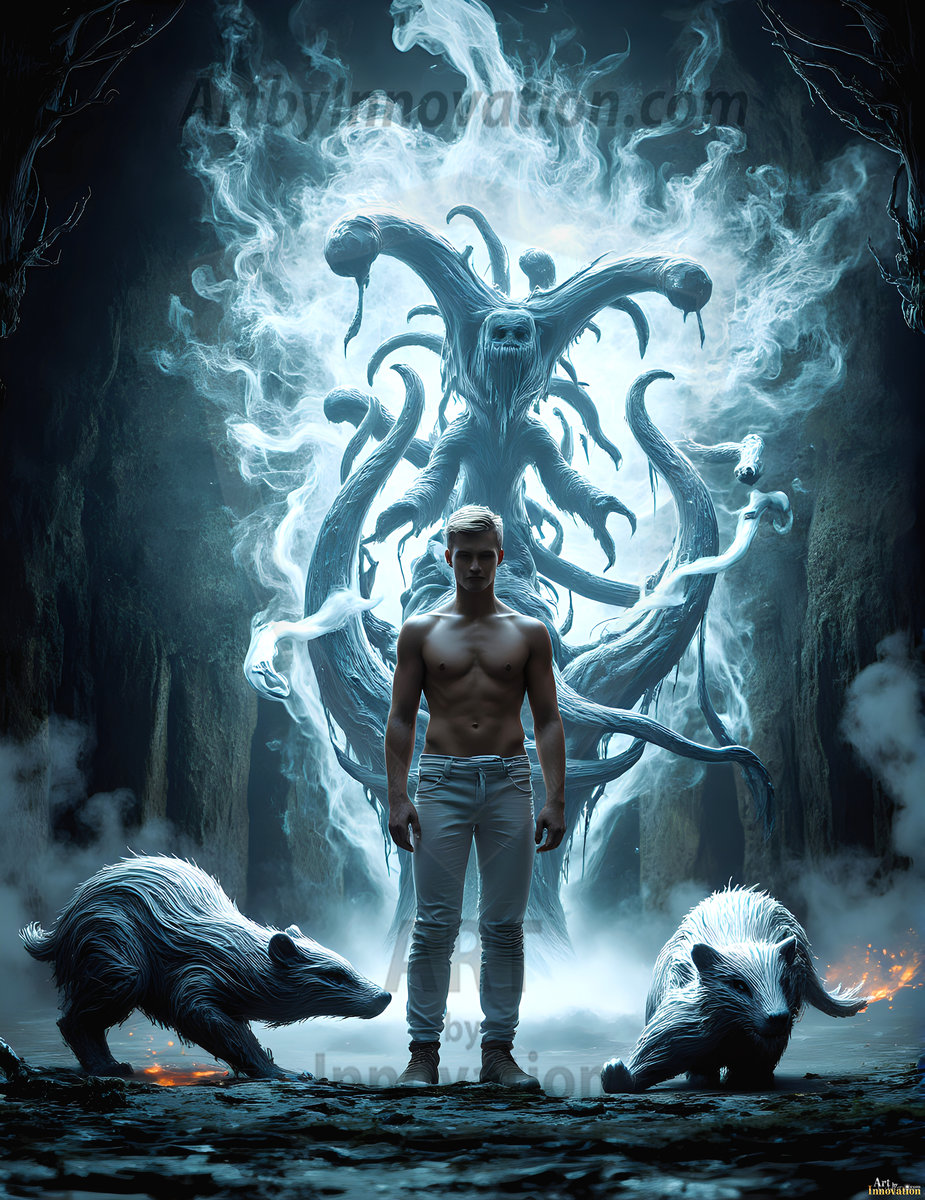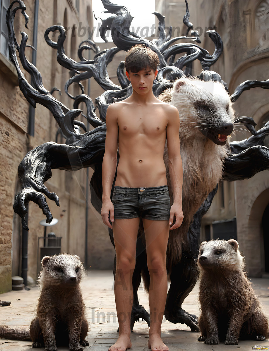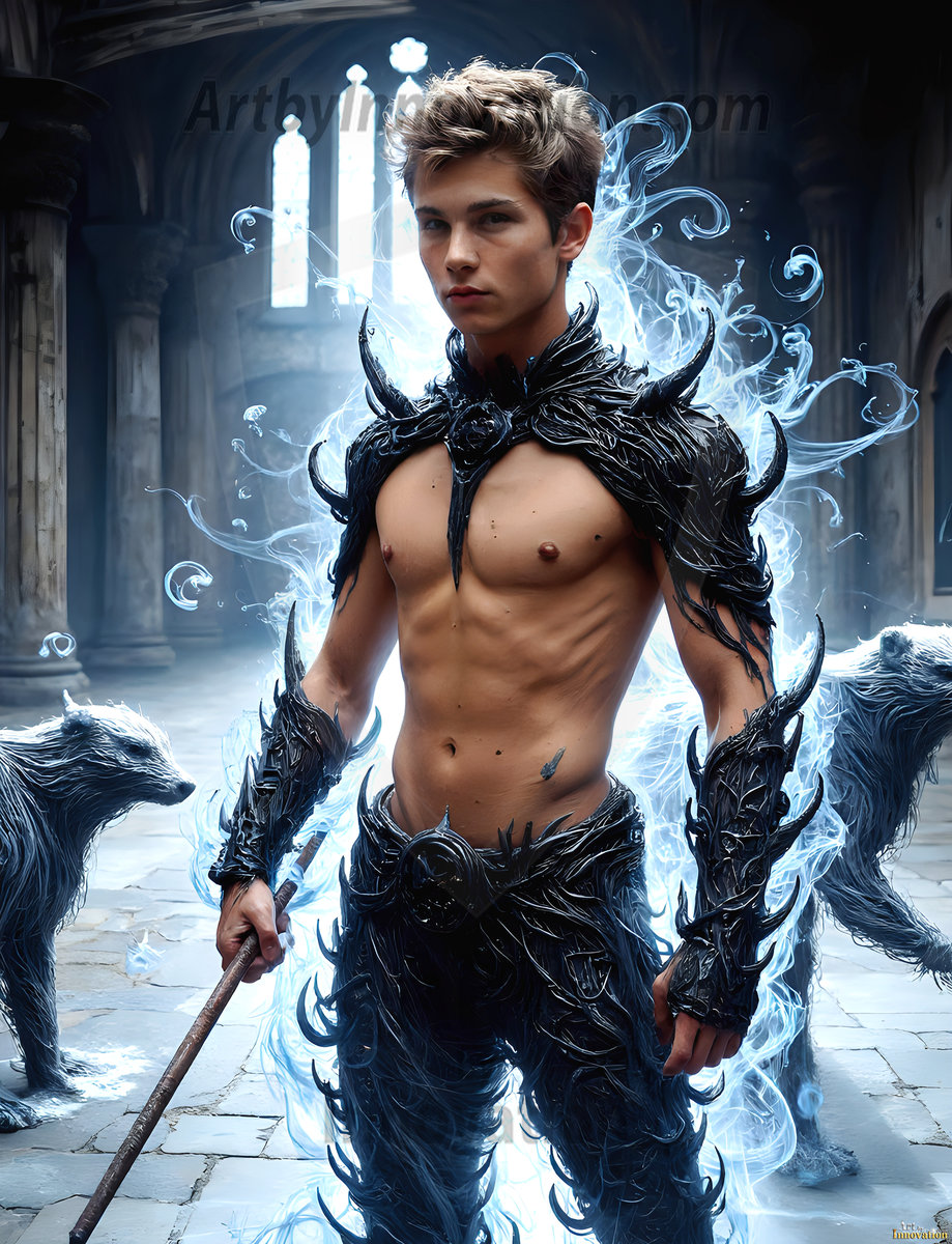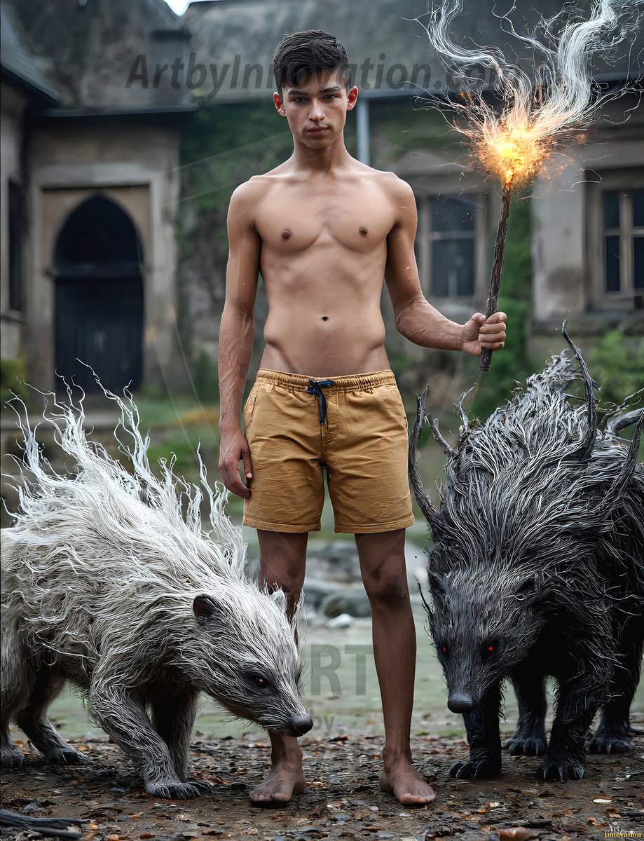 AI male art photos with a fantastical atmosphere. Imagine a Hogwarts School of Witchcraft student, from the Harry Potter series, a handsome, beautiful, and attractive, shirtless young teenage boy, standing firm against a threat. With a detailed Hogwarts castle background, casting a powerful spell, conjuring creatures based on their assigned house crest. From Demonic snakes, powerful lions, fierce badgers, or a murder of Crows. Dementors floating ominously in a cloudy sky, and sparks, shadows, and cinematic lighting, offering an otherworldly vibe.