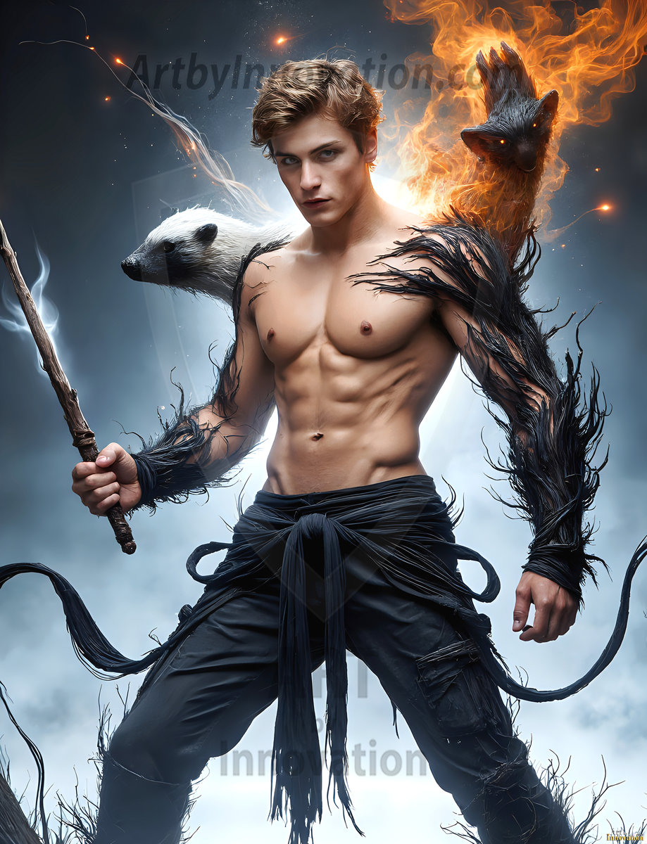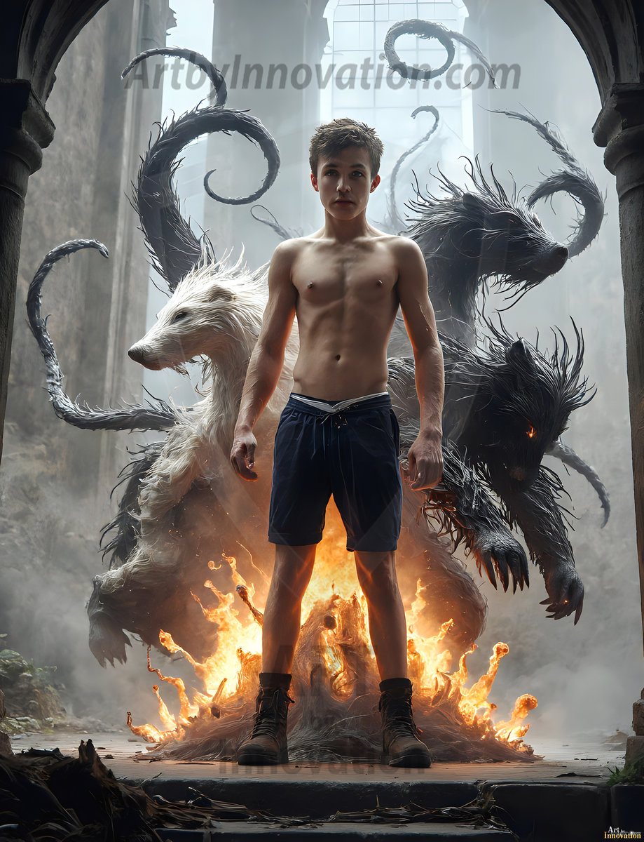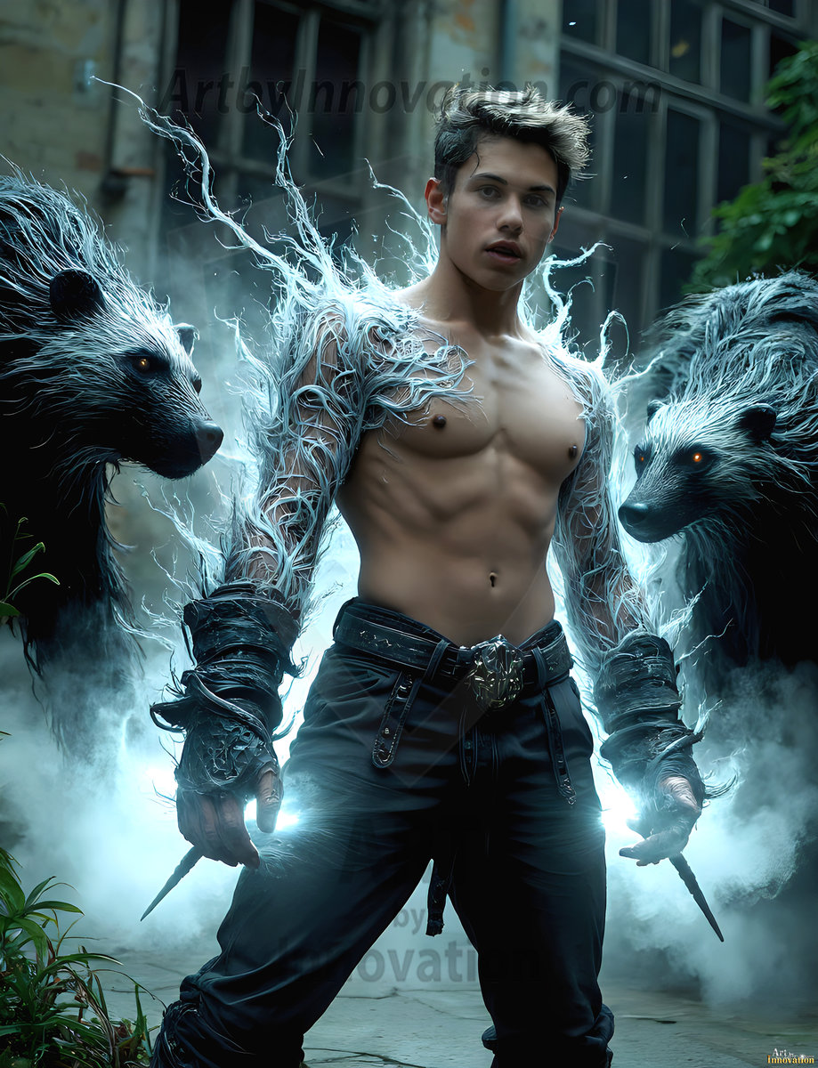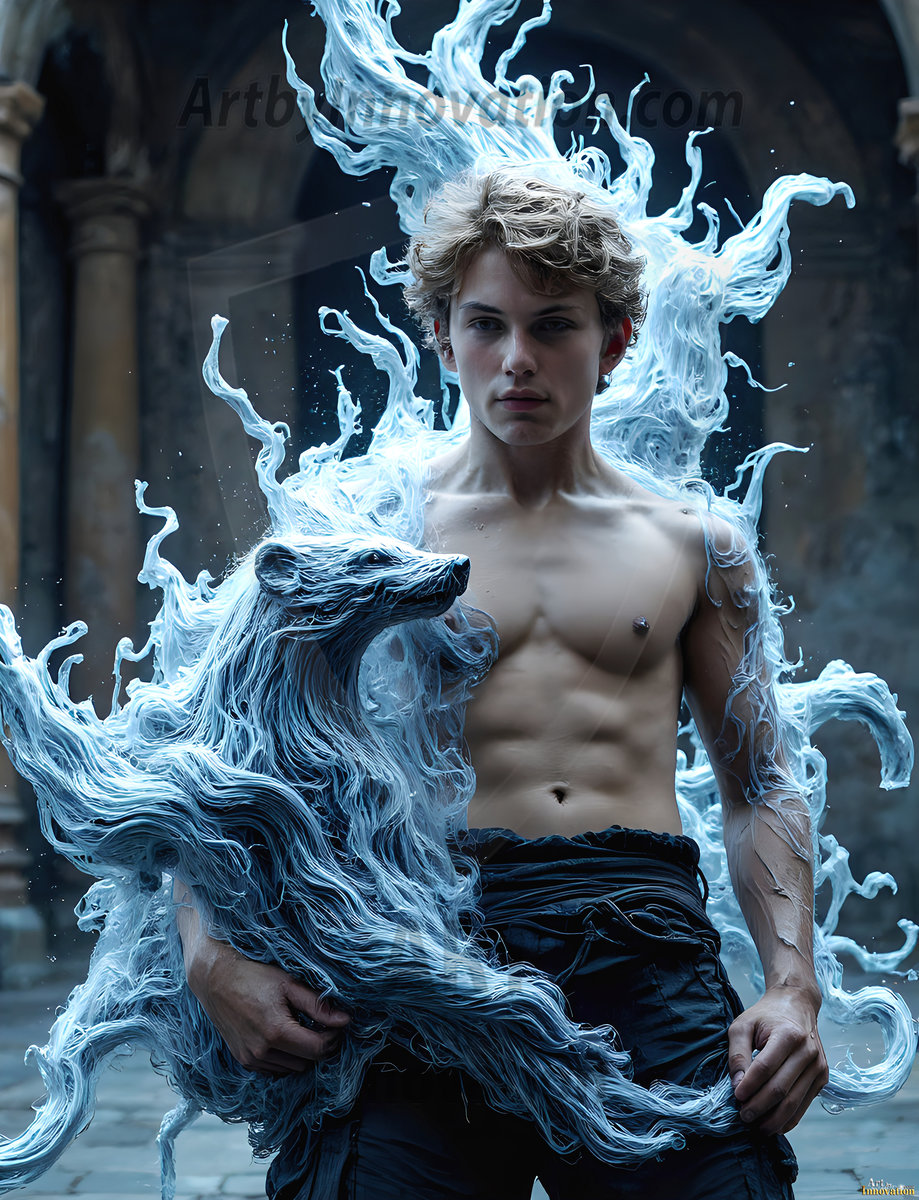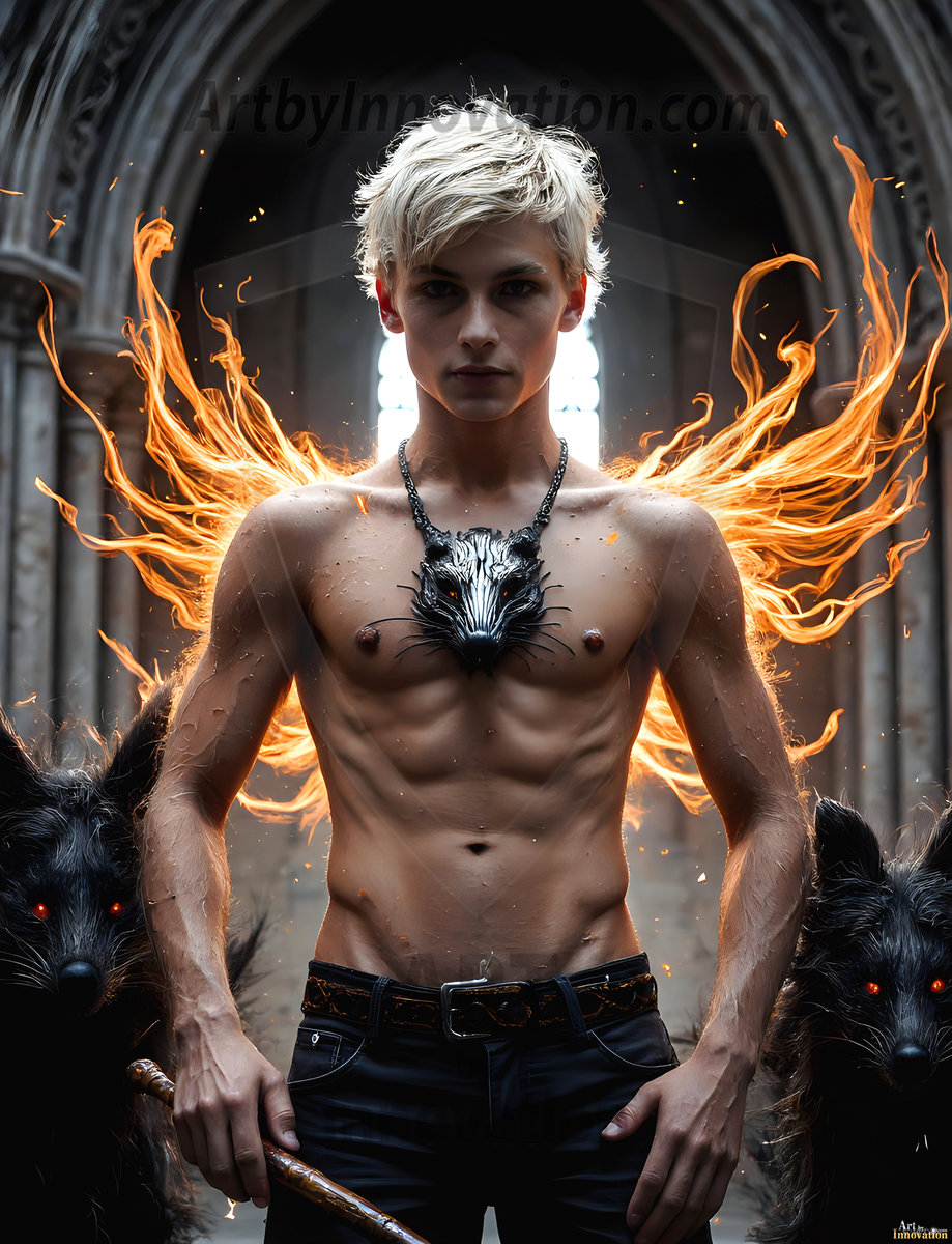 AI male art photos with a fantastical atmosphere. Imagine a Hogwarts School of Witchcraft student, from the Harry Potter series, a handsome, beautiful, and attractive, shirtless young teenage boy, standing firm against a threat. With a detailed Hogwarts castle background, casting a powerful spell, conjuring creatures based on their assigned house crest. From Demonic snakes, powerful lions, fierce badgers, or a murder of Crows. Dementors floating ominously in a cloudy sky, and sparks, shadows, and cinematic lighting, offering an otherworldly vibe.