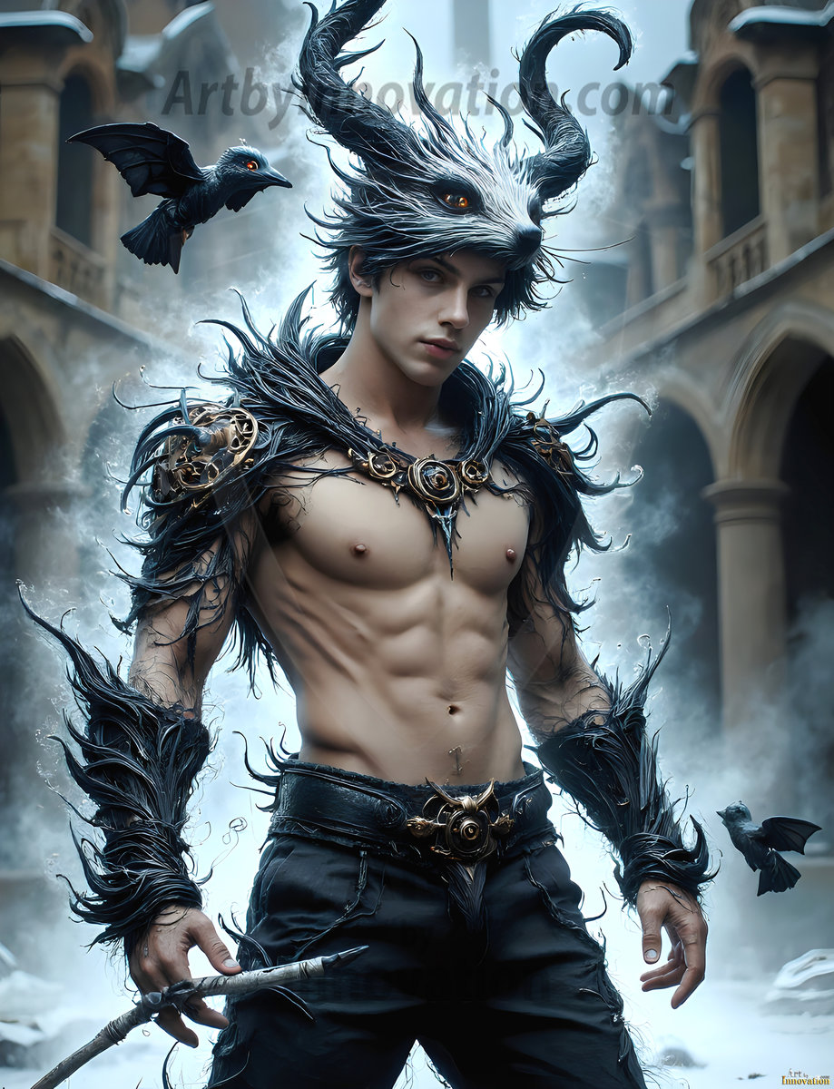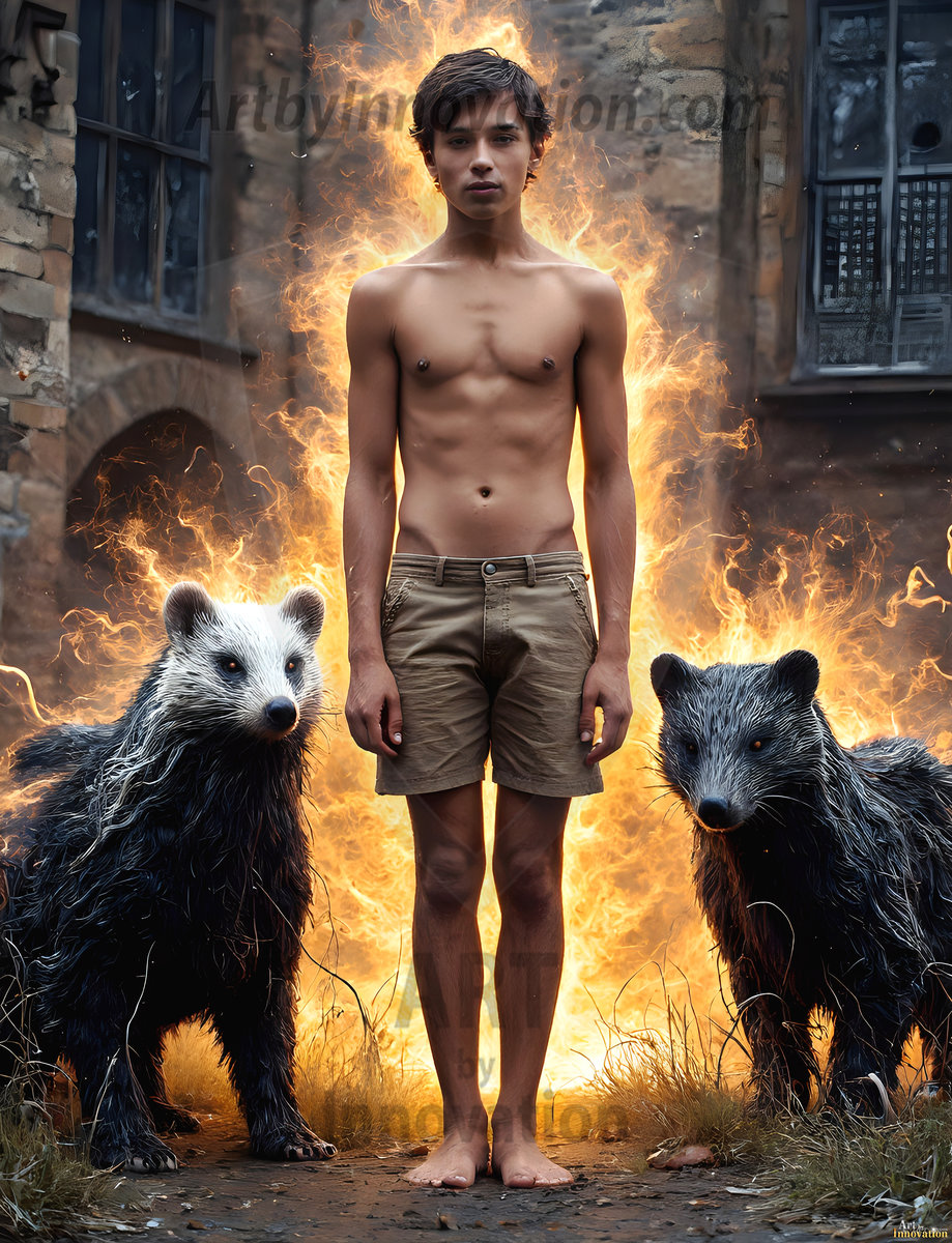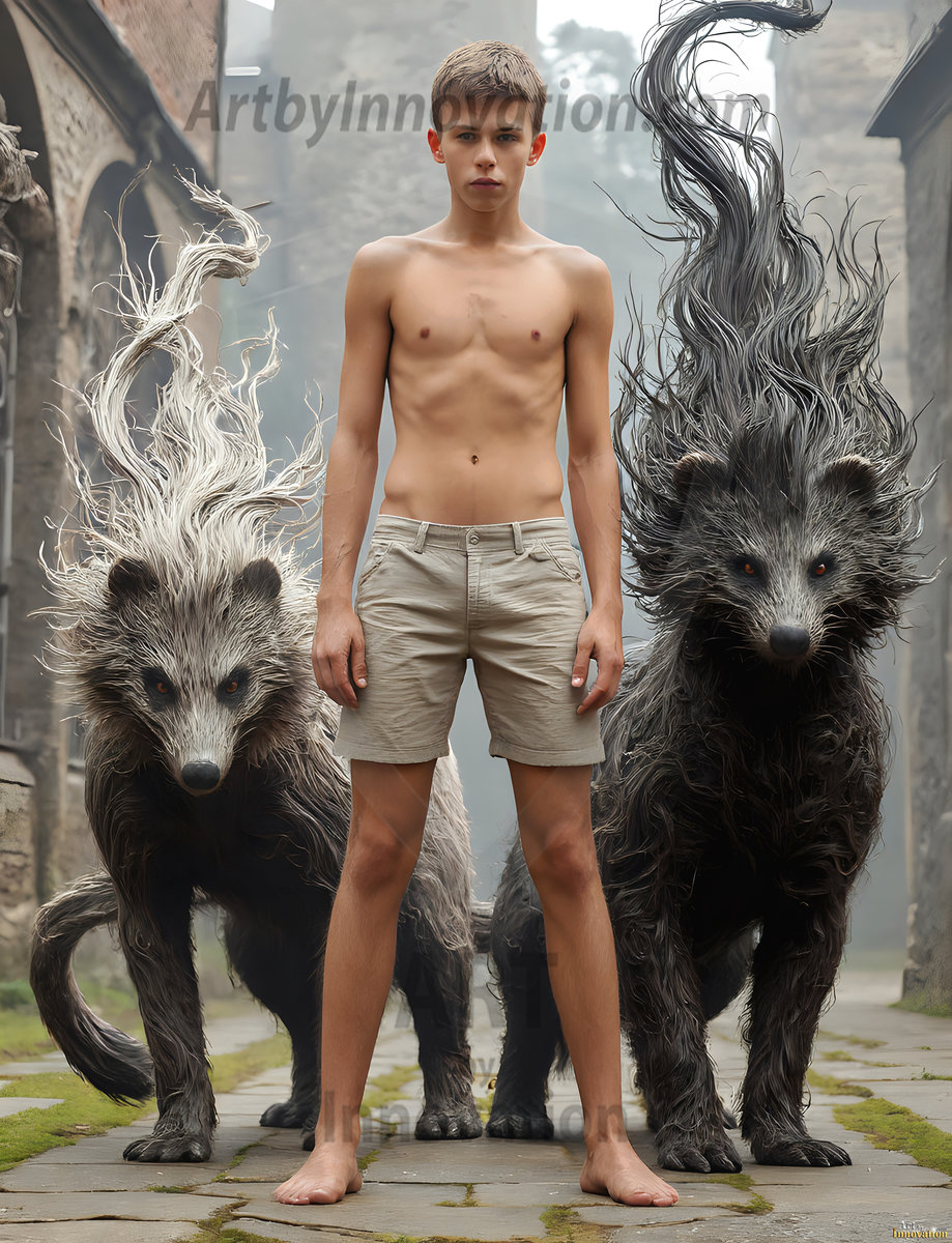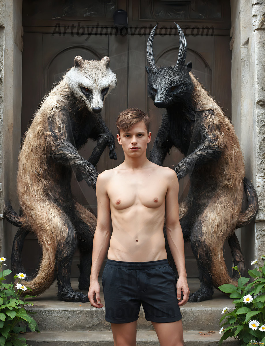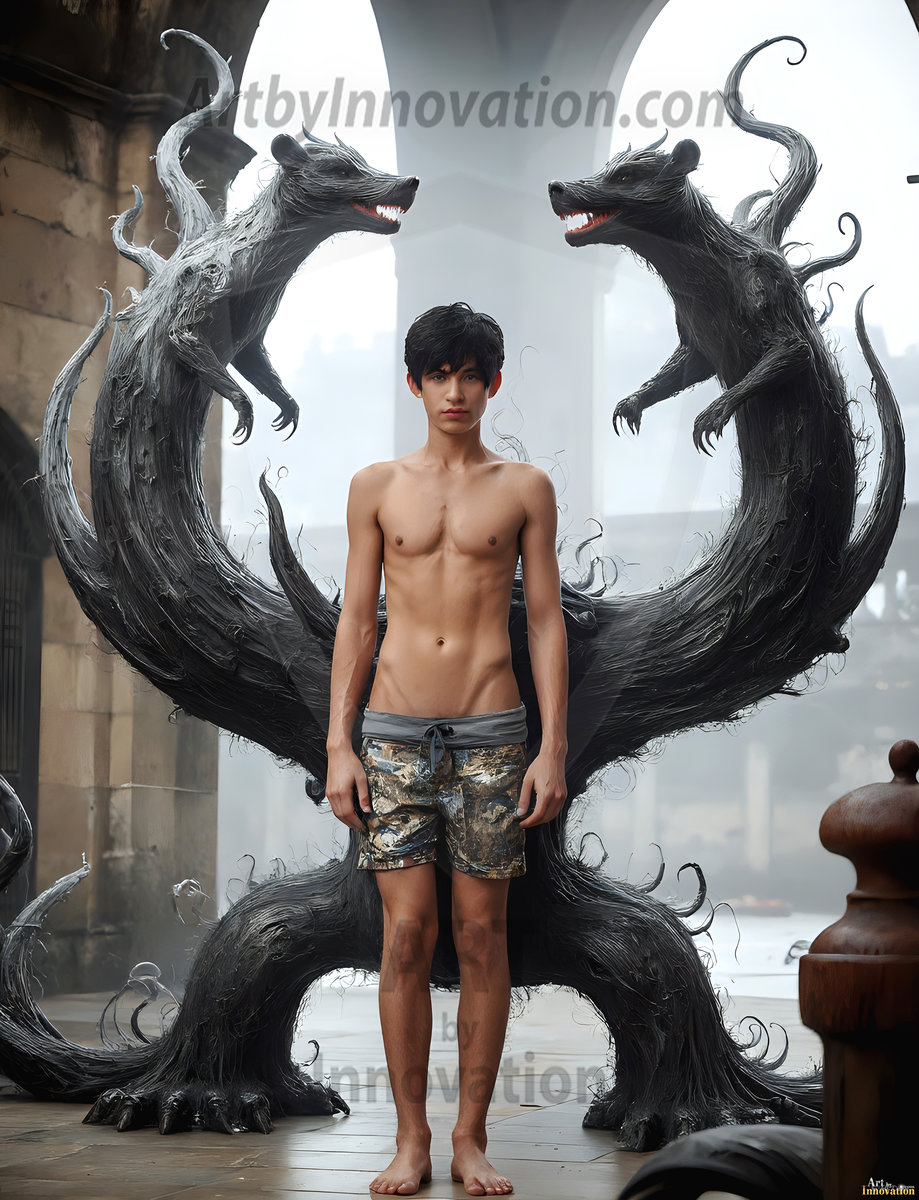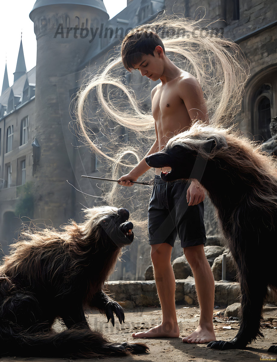 AI male art photos with a fantastical atmosphere. Imagine a Hogwarts School of Witchcraft student, from the Harry Potter series, a handsome, beautiful, and attractive, shirtless young teenage boy, standing firm against a threat. With a detailed Hogwarts castle background, casting a powerful spell, conjuring creatures based on their assigned house crest. From Demonic snakes, powerful lions, fierce badgers, or a murder of Crows. Dementors floating ominously in a cloudy sky, and sparks, shadows, and cinematic lighting, offering an otherworldly vibe.