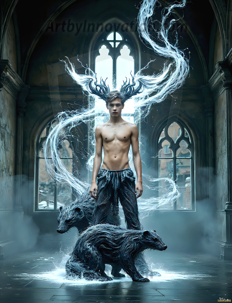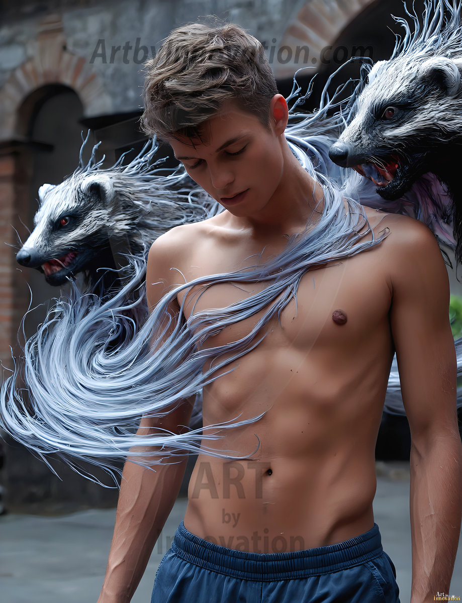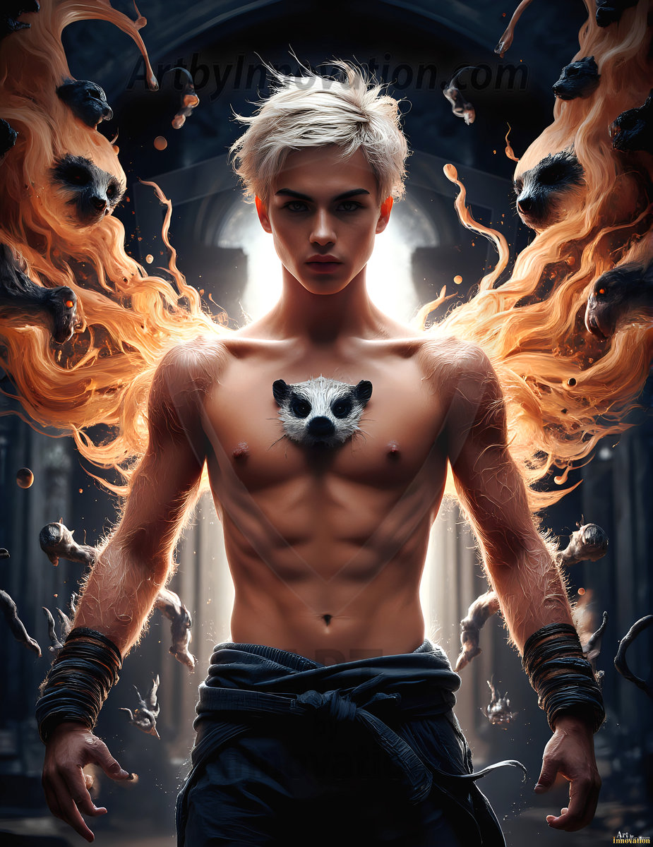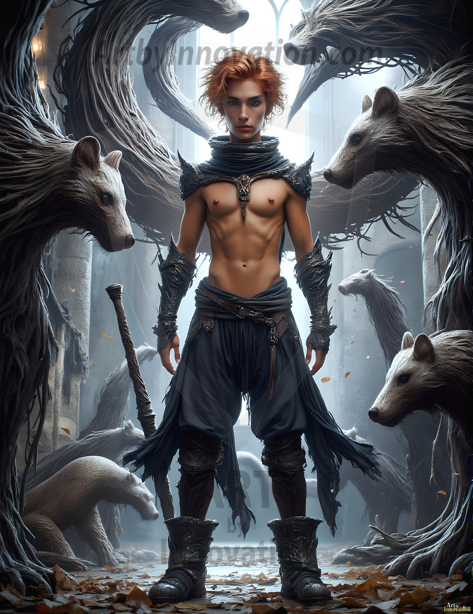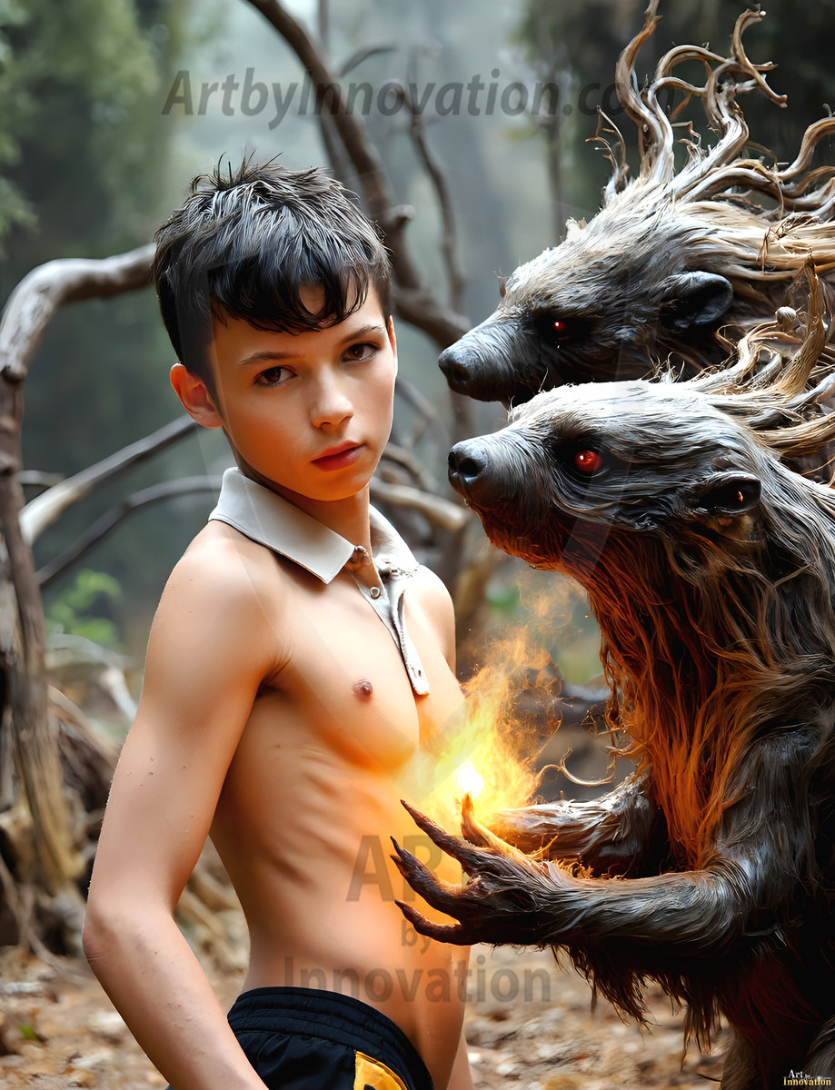 AI male art photos with a fantastical atmosphere. Imagine a Hogwarts School of Witchcraft student, from the Harry Potter series, a handsome, beautiful, and attractive, shirtless young teenage boy, standing firm against a threat. With a detailed Hogwarts castle background, casting a powerful spell, conjuring creatures based on their assigned house crest. From Demonic snakes, powerful lions, fierce badgers, or a murder of Crows. Dementors floating ominously in a cloudy sky, and sparks, shadows, and cinematic lighting, offering an otherworldly vibe.
