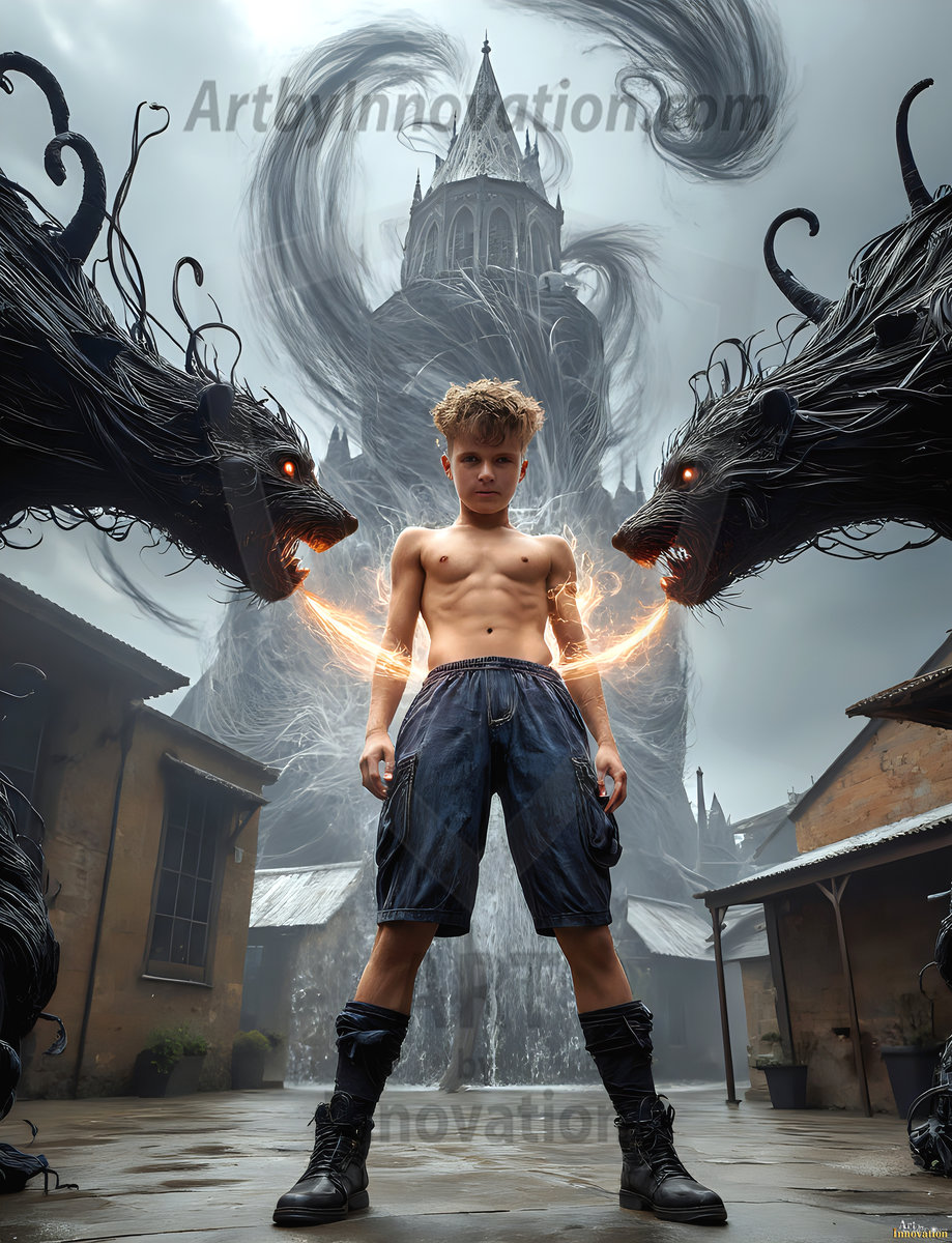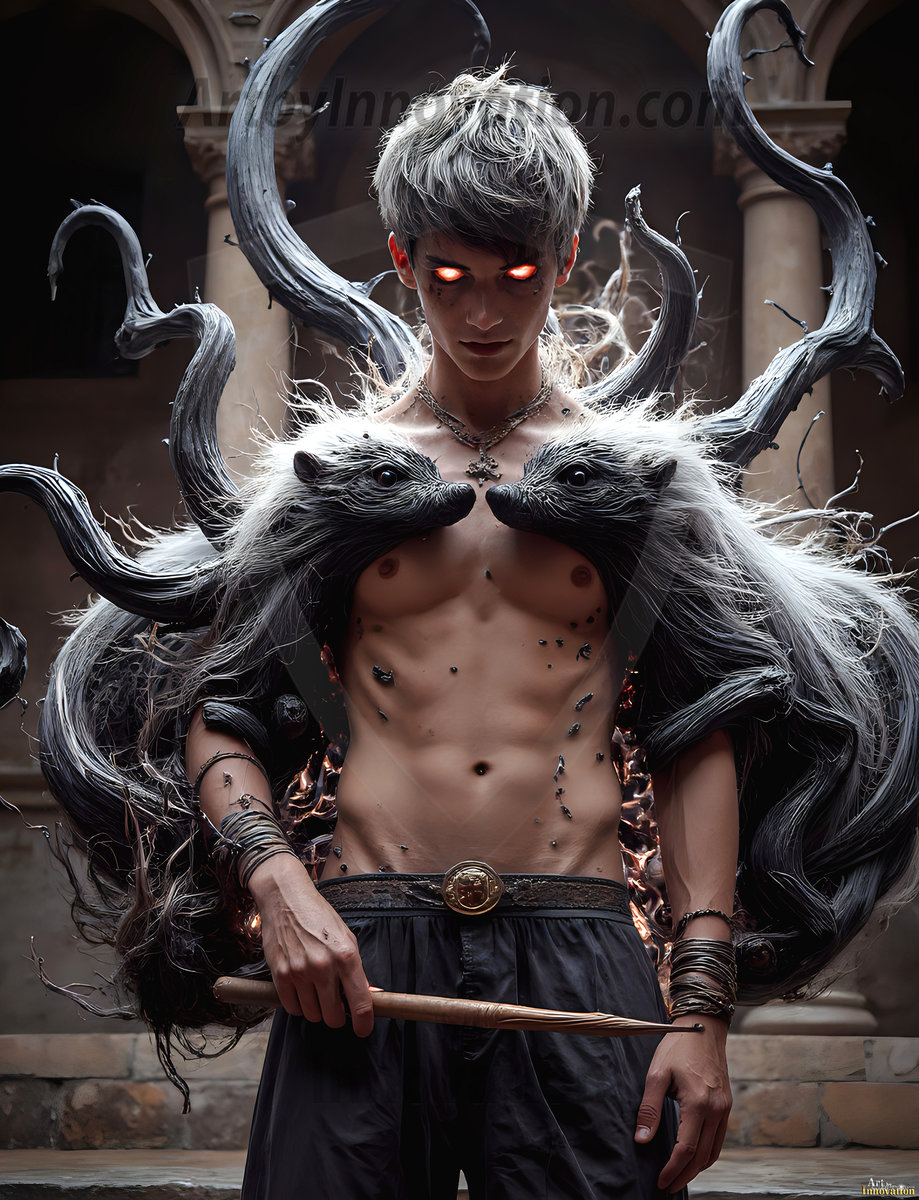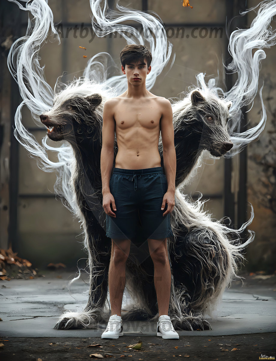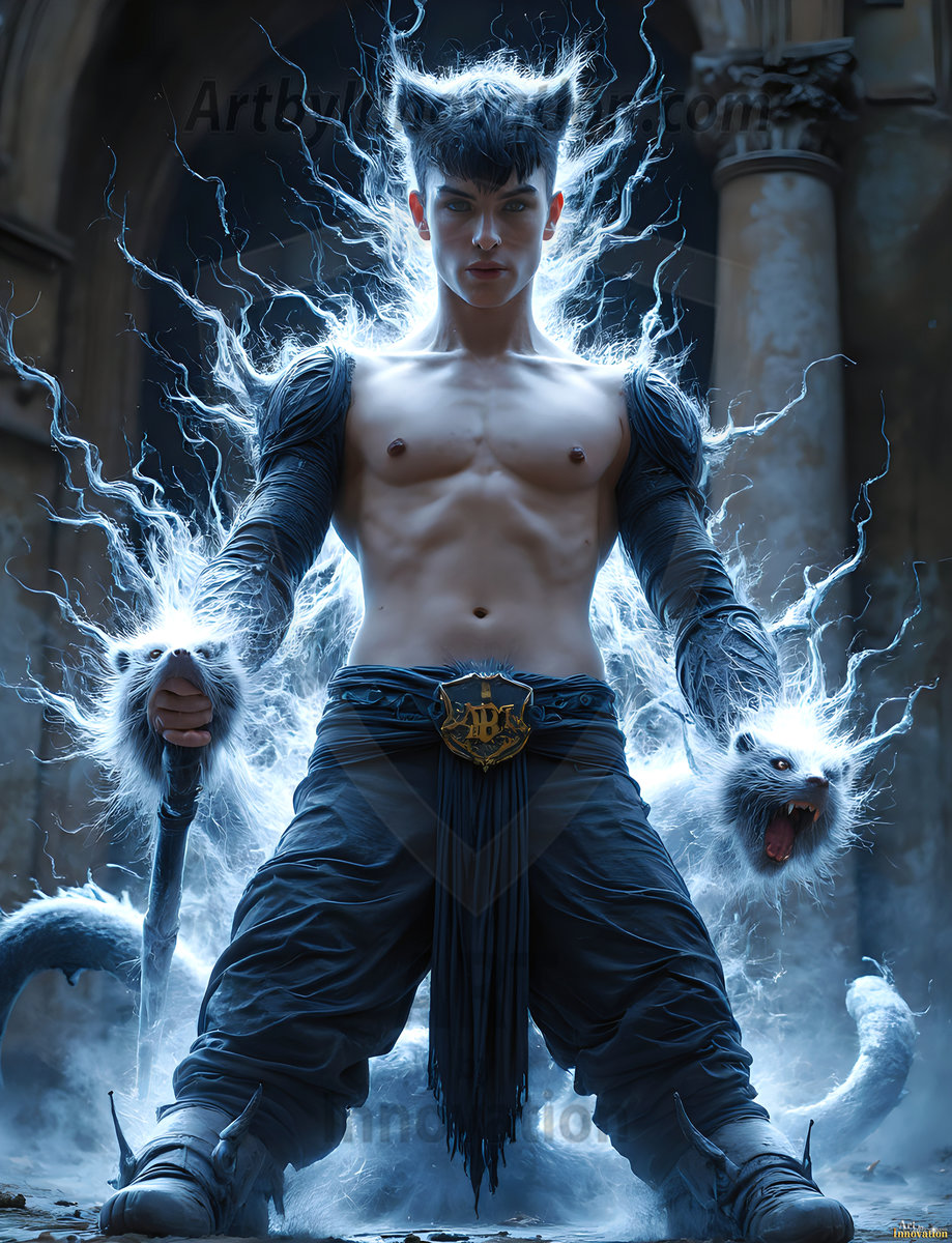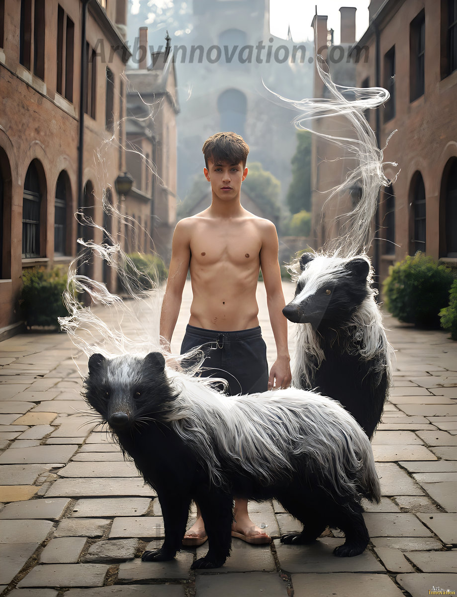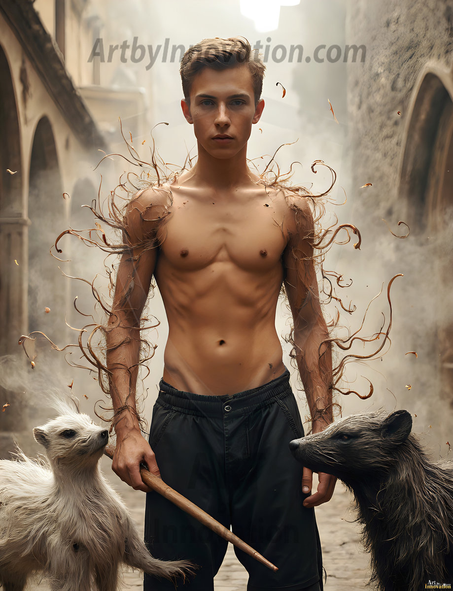 AI male art photos with a fantastical atmosphere. Imagine a Hogwarts School of Witchcraft student, from the Harry Potter series, a handsome, beautiful, and attractive, shirtless young teenage boy, standing firm against a threat. With a detailed Hogwarts castle background, casting a powerful spell, conjuring creatures based on their assigned house crest. From Demonic snakes, powerful lions, fierce badgers, or a murder of Crows. Dementors floating ominously in a cloudy sky, and sparks, shadows, and cinematic lighting, offering an otherworldly vibe.