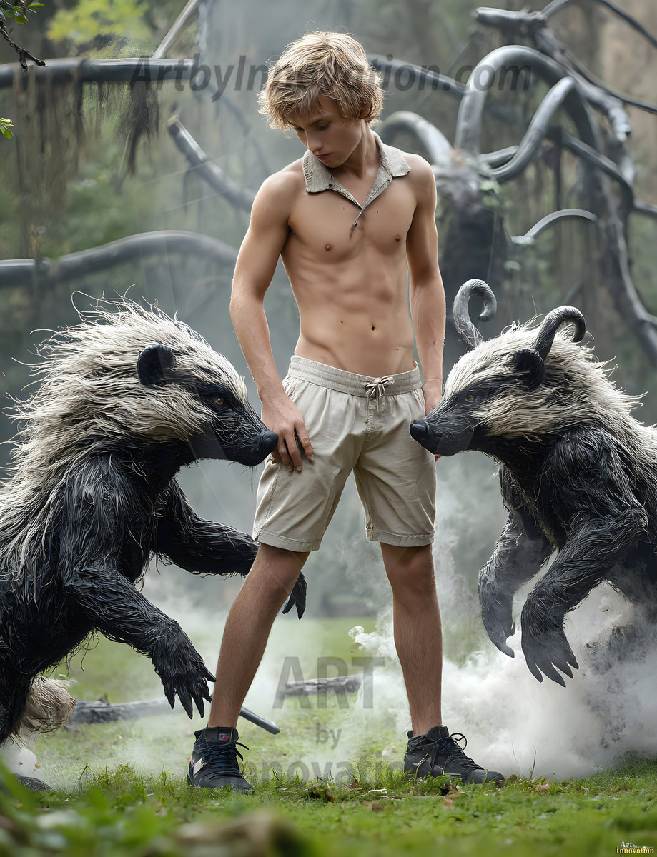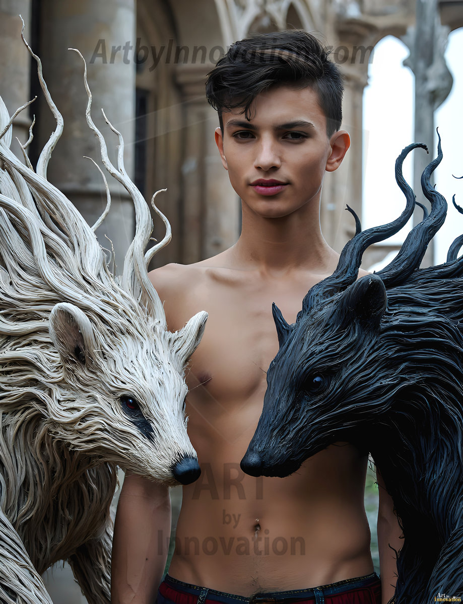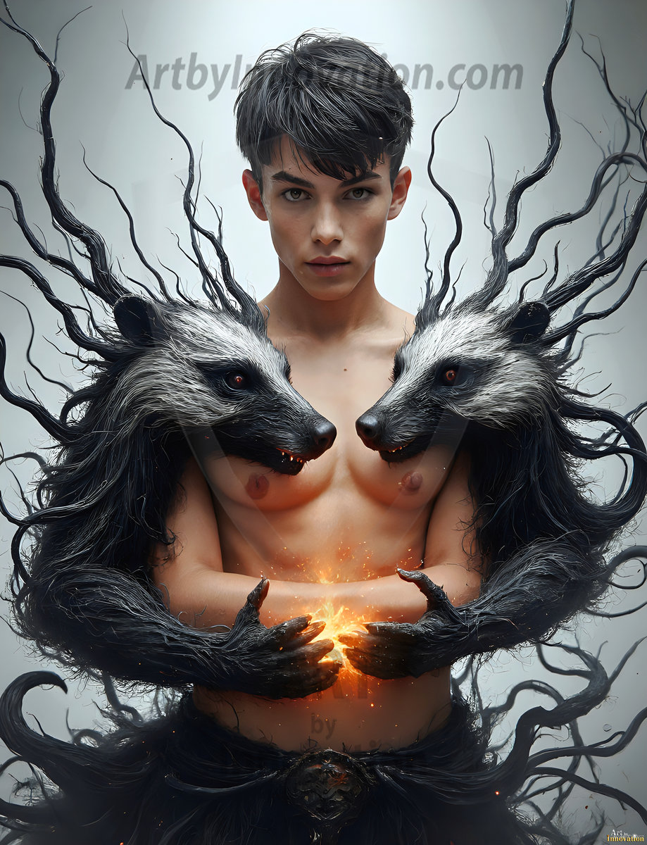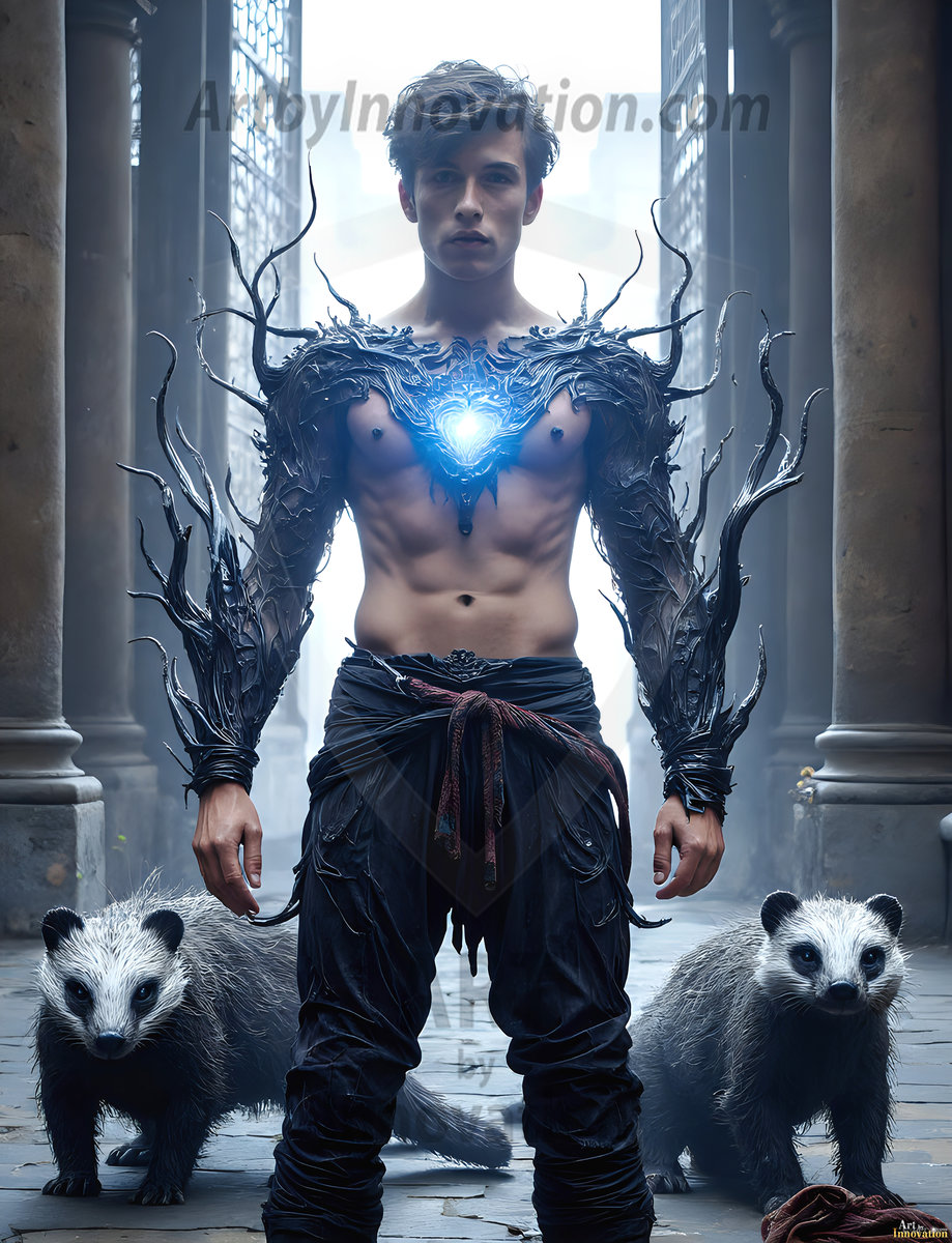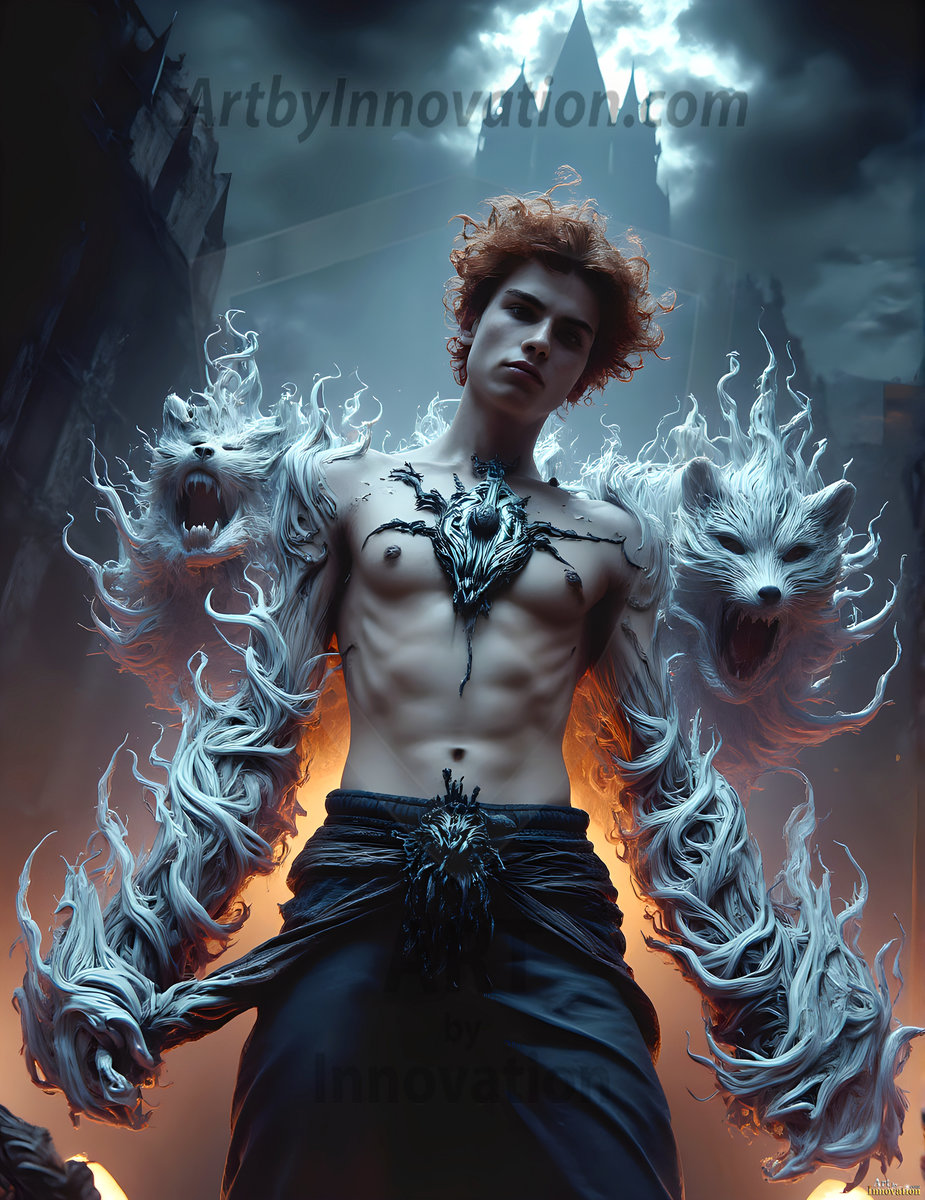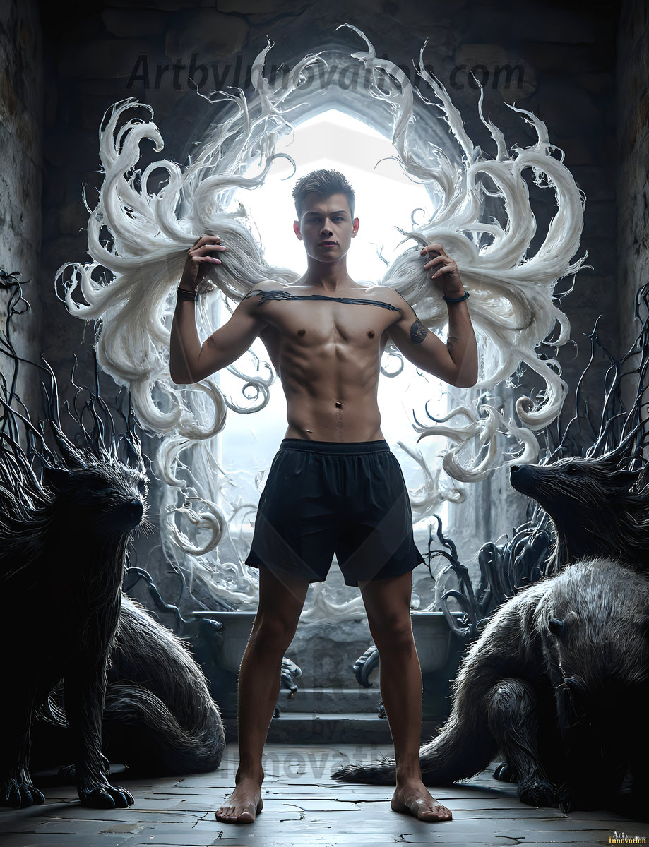 AI male art photos with a fantastical atmosphere. Imagine a Hogwarts School of Witchcraft student, from the Harry Potter series, a handsome, beautiful, and attractive, shirtless young teenage boy, standing firm against a threat. With a detailed Hogwarts castle background, casting a powerful spell, conjuring creatures based on their assigned house crest. From Demonic snakes, powerful lions, fierce badgers, or a murder of Crows. Dementors floating ominously in a cloudy sky, and sparks, shadows, and cinematic lighting, offering an otherworldly vibe.