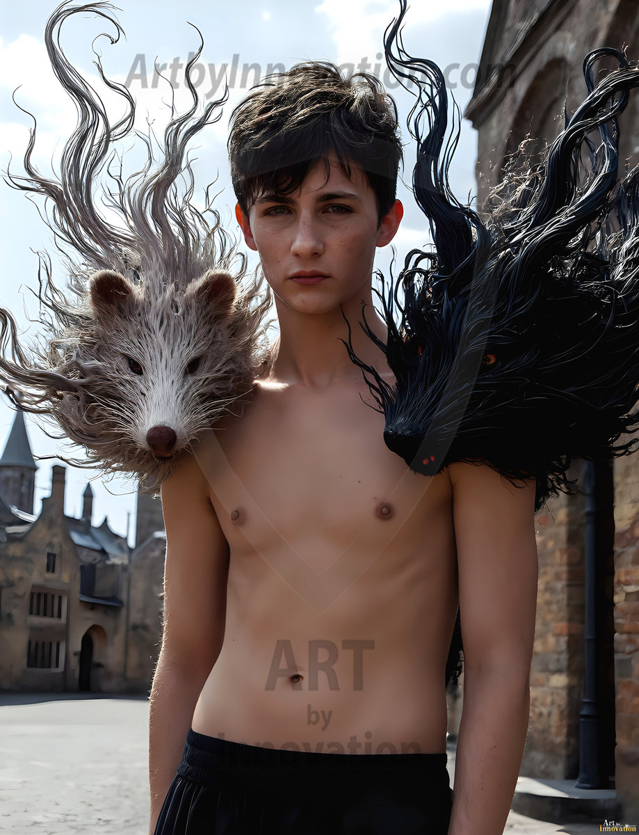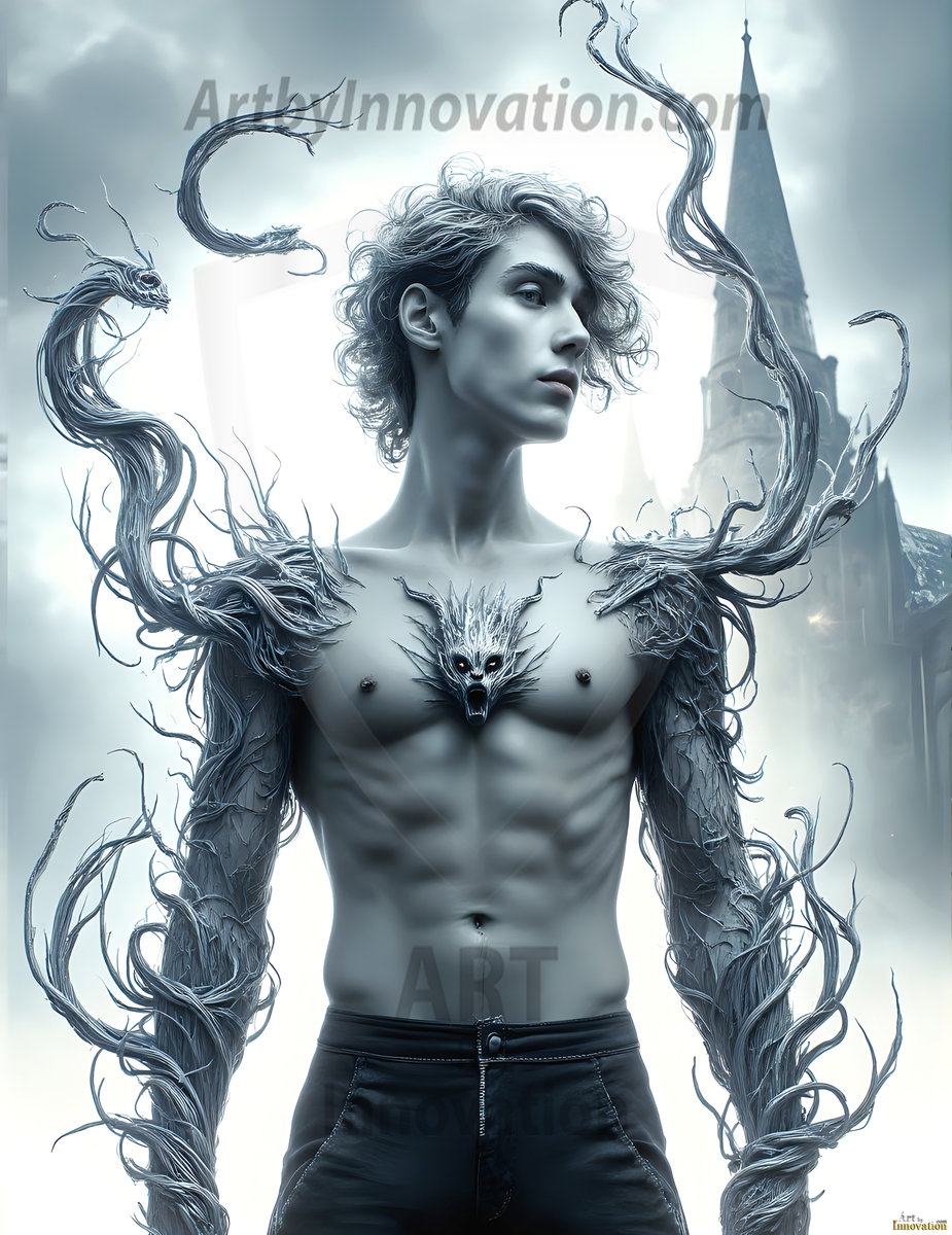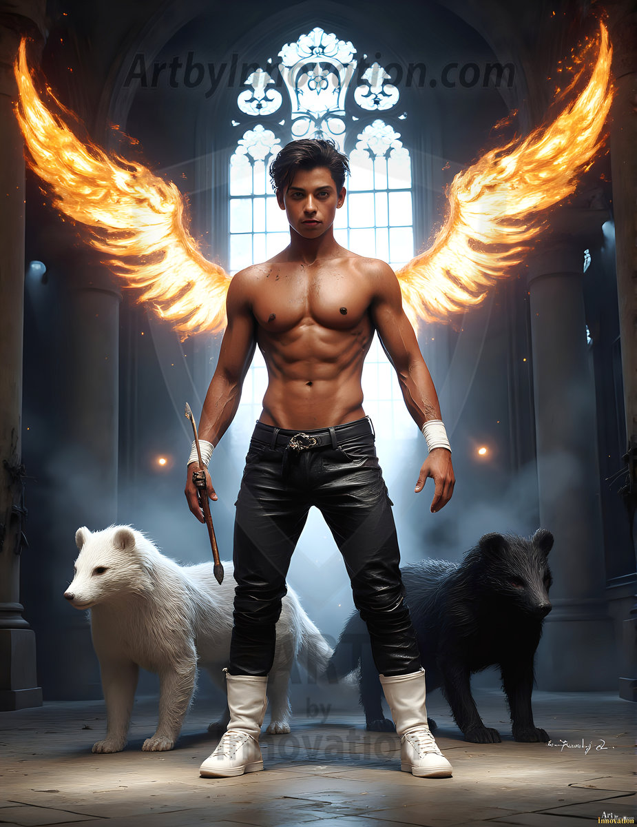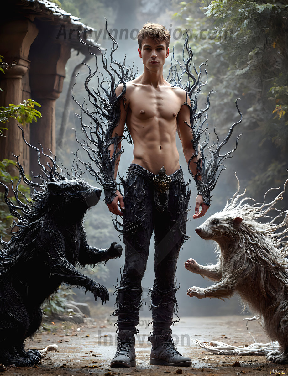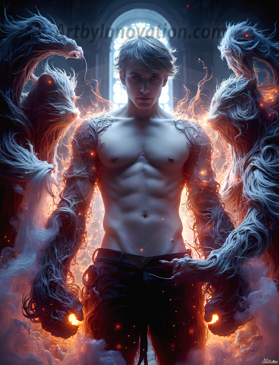 AI male art photos with a fantastical atmosphere. Imagine a Hogwarts School of Witchcraft student, from the Harry Potter series, a handsome, beautiful, and attractive, shirtless young teenage boy, standing firm against a threat. With a detailed Hogwarts castle background, casting a powerful spell, conjuring creatures based on their assigned house crest. From Demonic snakes, powerful lions, fierce badgers, or a murder of Crows. Dementors floating ominously in a cloudy sky, and sparks, shadows, and cinematic lighting, offering an otherworldly vibe.