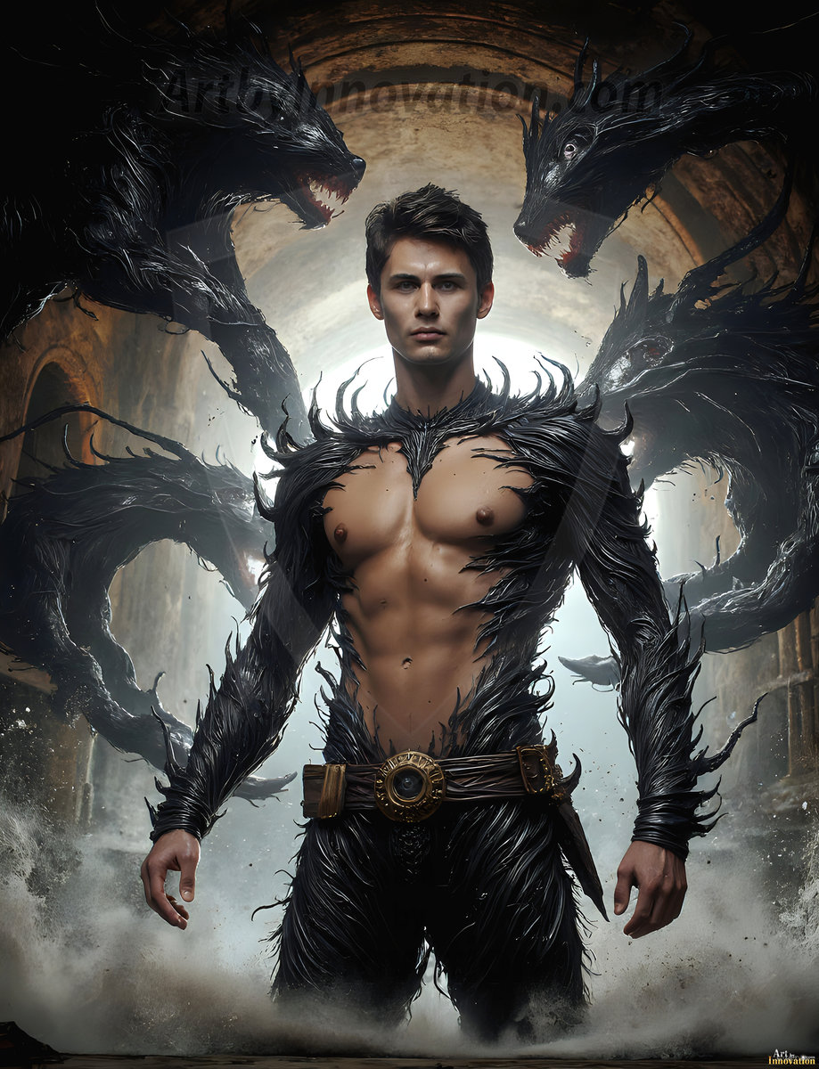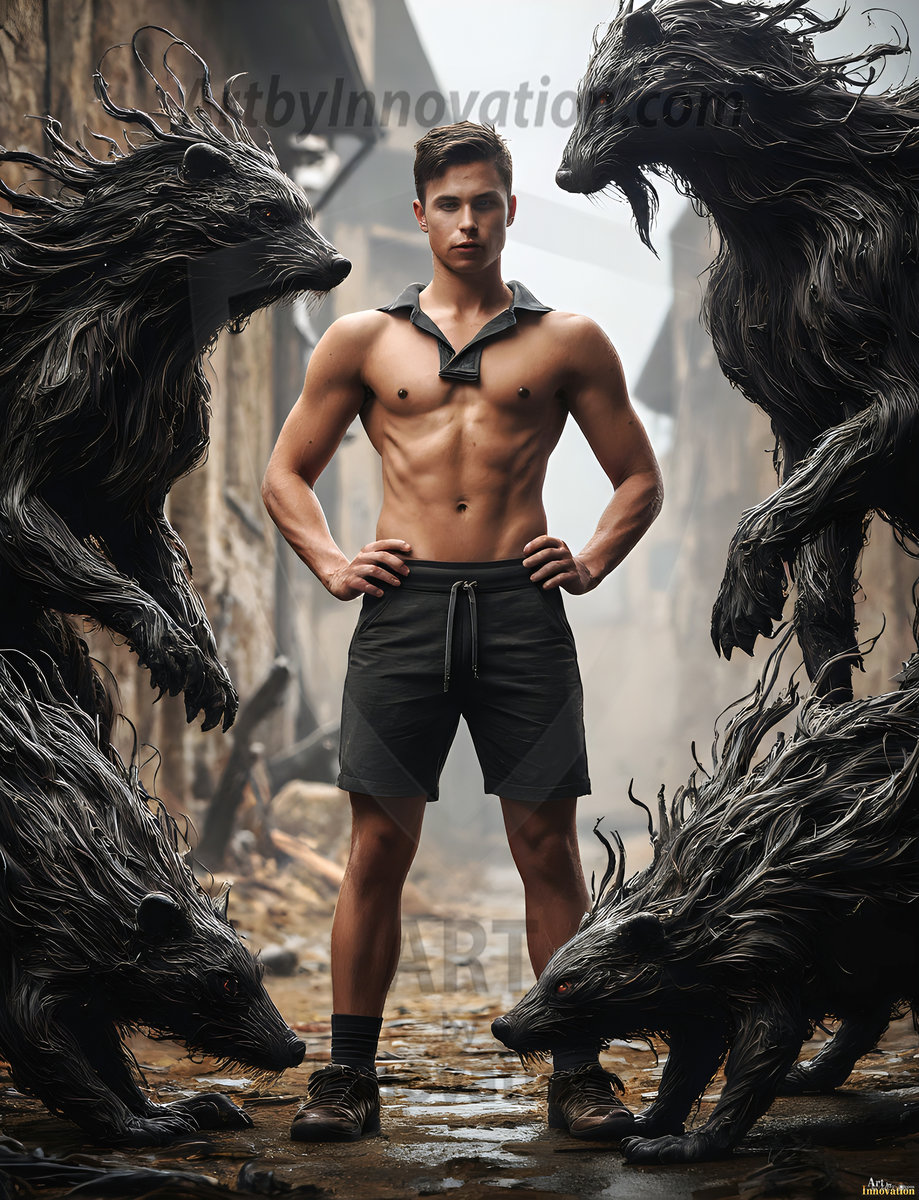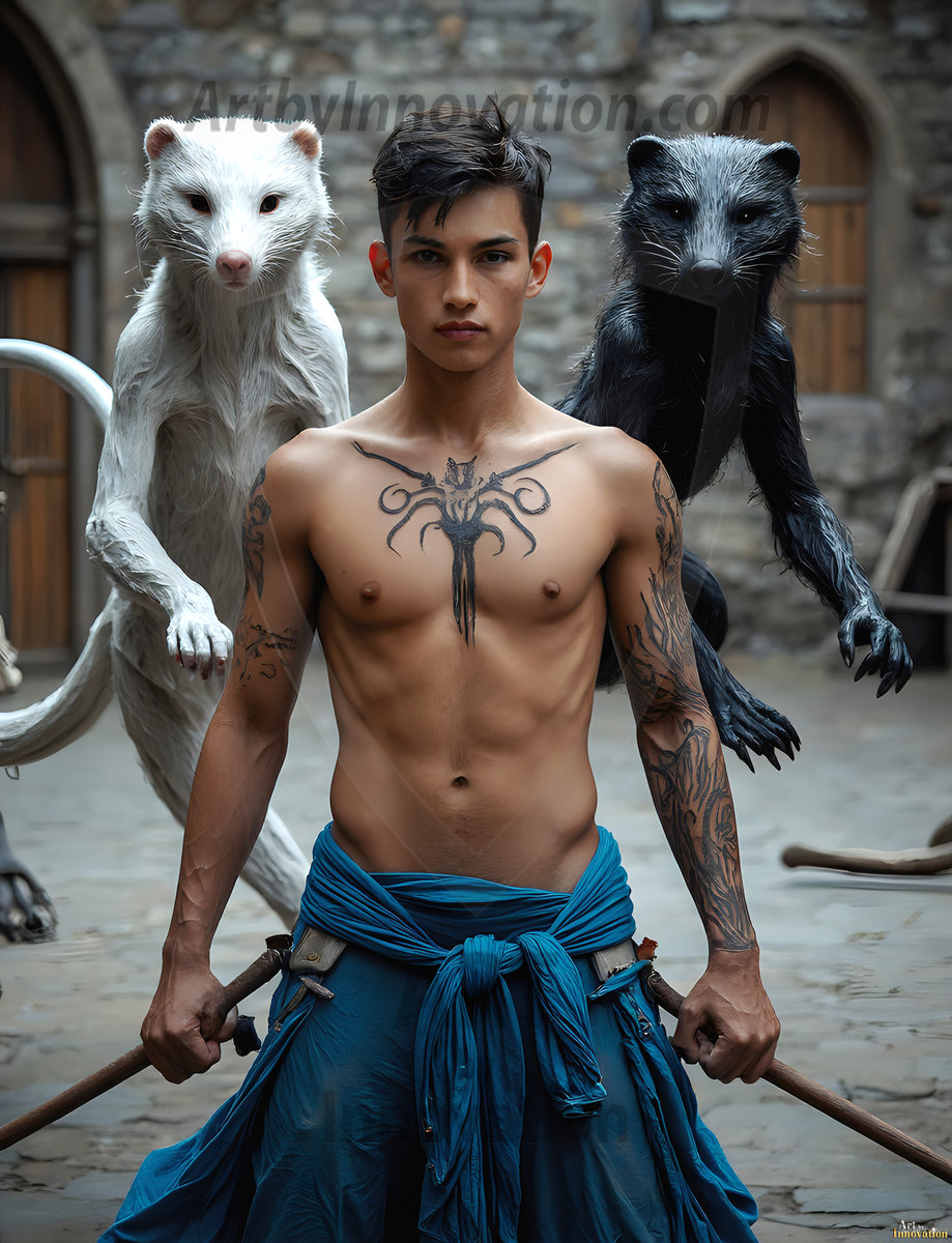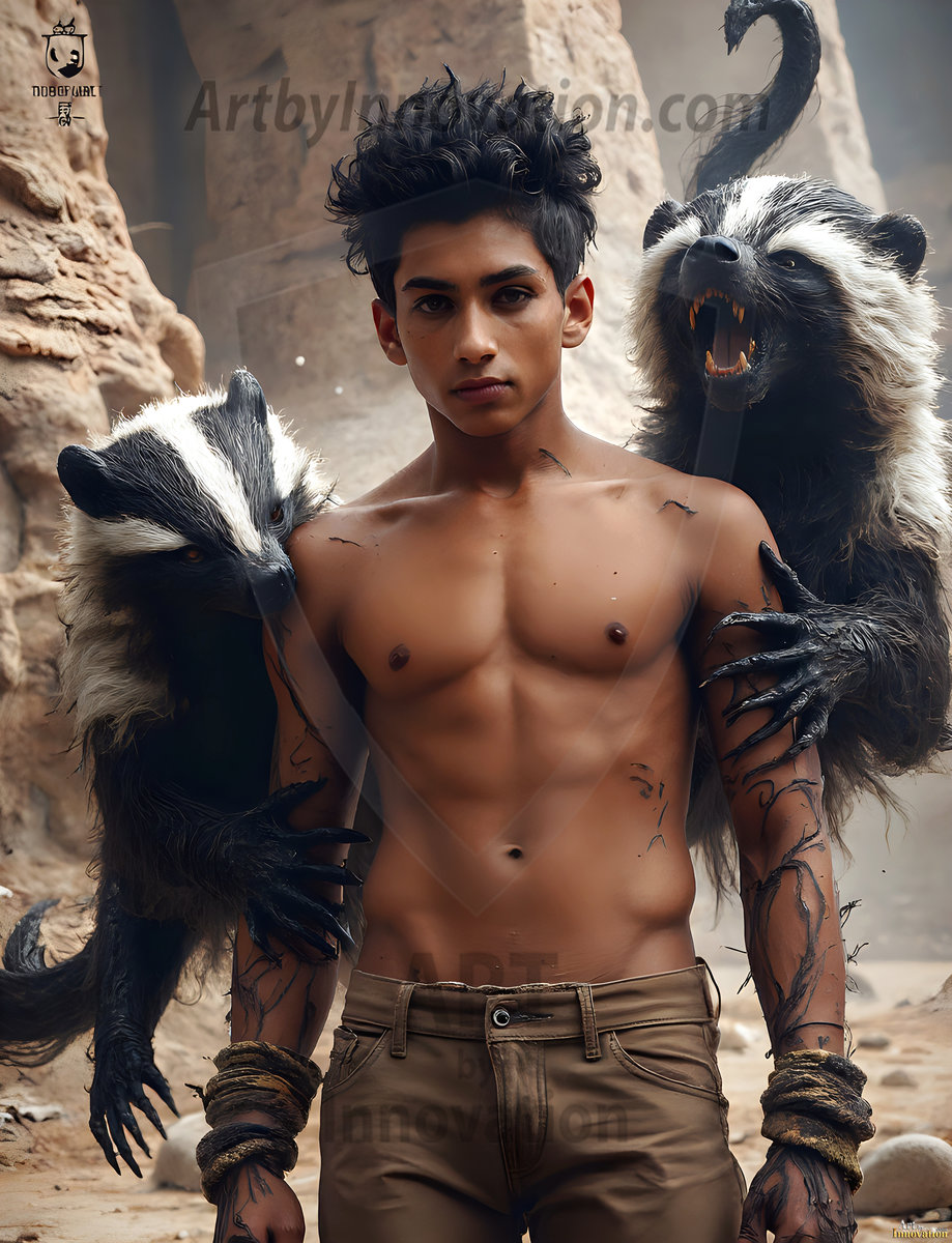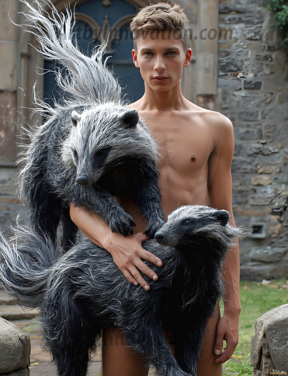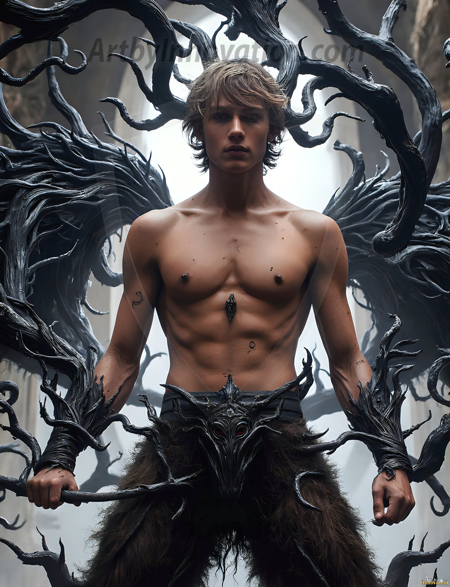 AI male art photos with a fantastical atmosphere. Imagine a Hogwarts School of Witchcraft student, from the Harry Potter series, a handsome, beautiful, and attractive, shirtless young teenage boy, standing firm against a threat. With a detailed Hogwarts castle background, casting a powerful spell, conjuring creatures based on their assigned house crest. From Demonic snakes, powerful lions, fierce badgers, or a murder of Crows. Dementors floating ominously in a cloudy sky, and sparks, shadows, and cinematic lighting, offering an otherworldly vibe.
