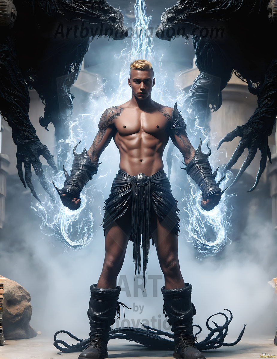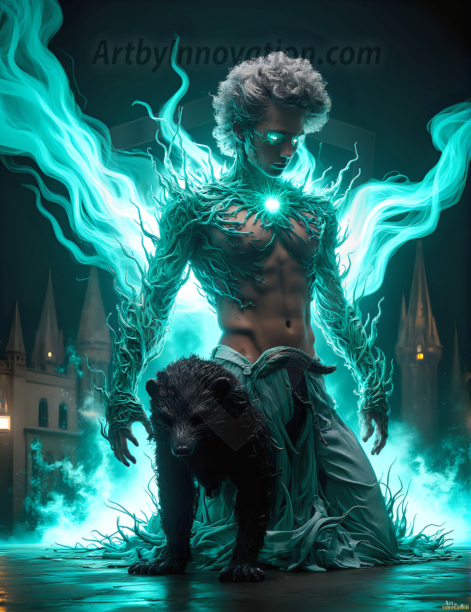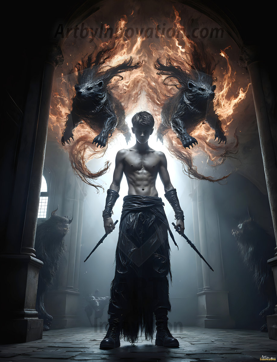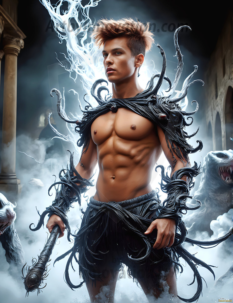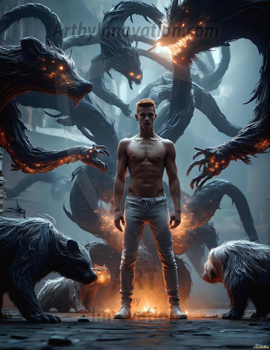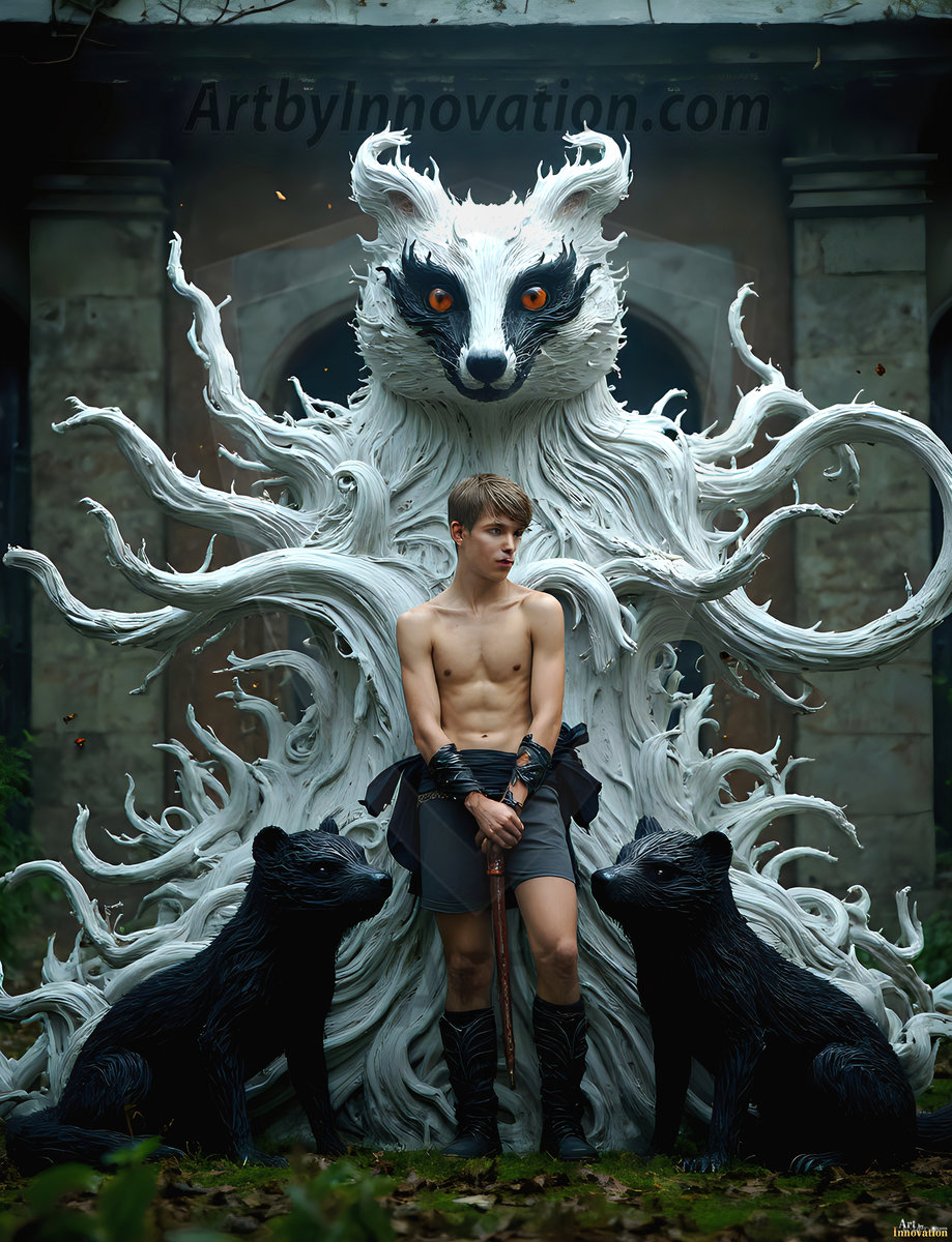 AI male art photos with a fantastical atmosphere. Imagine a Hogwarts School of Witchcraft student, from the Harry Potter series, a handsome, beautiful, and attractive, shirtless young teenage boy, standing firm against a threat. With a detailed Hogwarts castle background, casting a powerful spell, conjuring creatures based on their assigned house crest. From Demonic snakes, powerful lions, fierce badgers, or a murder of Crows. Dementors floating ominously in a cloudy sky, and sparks, shadows, and cinematic lighting, offering an otherworldly vibe.