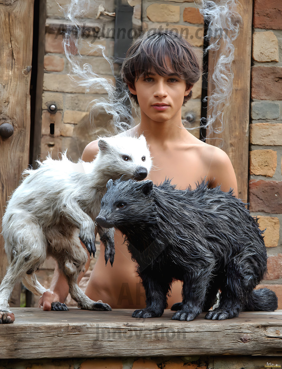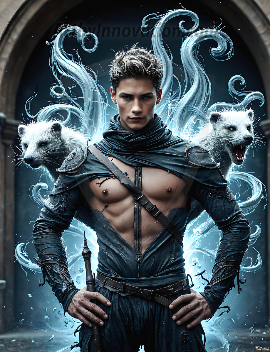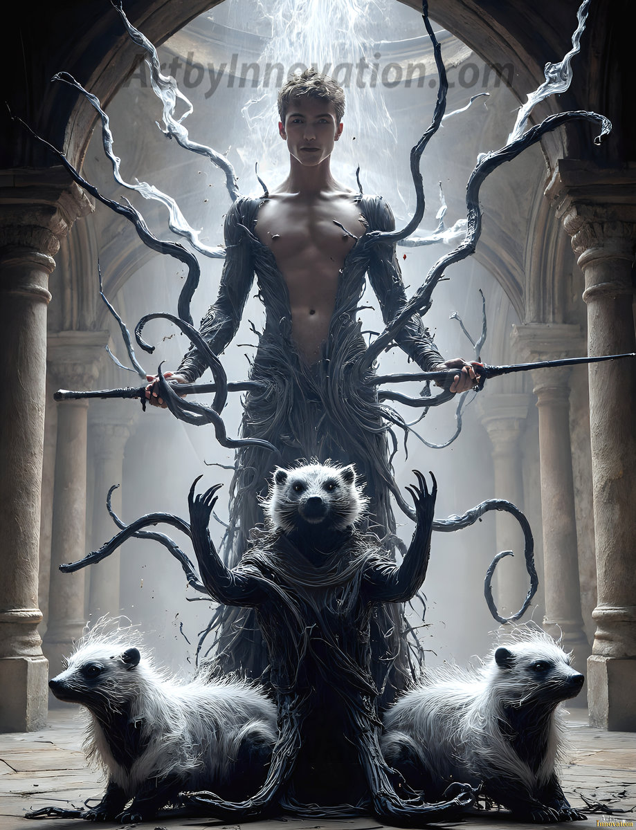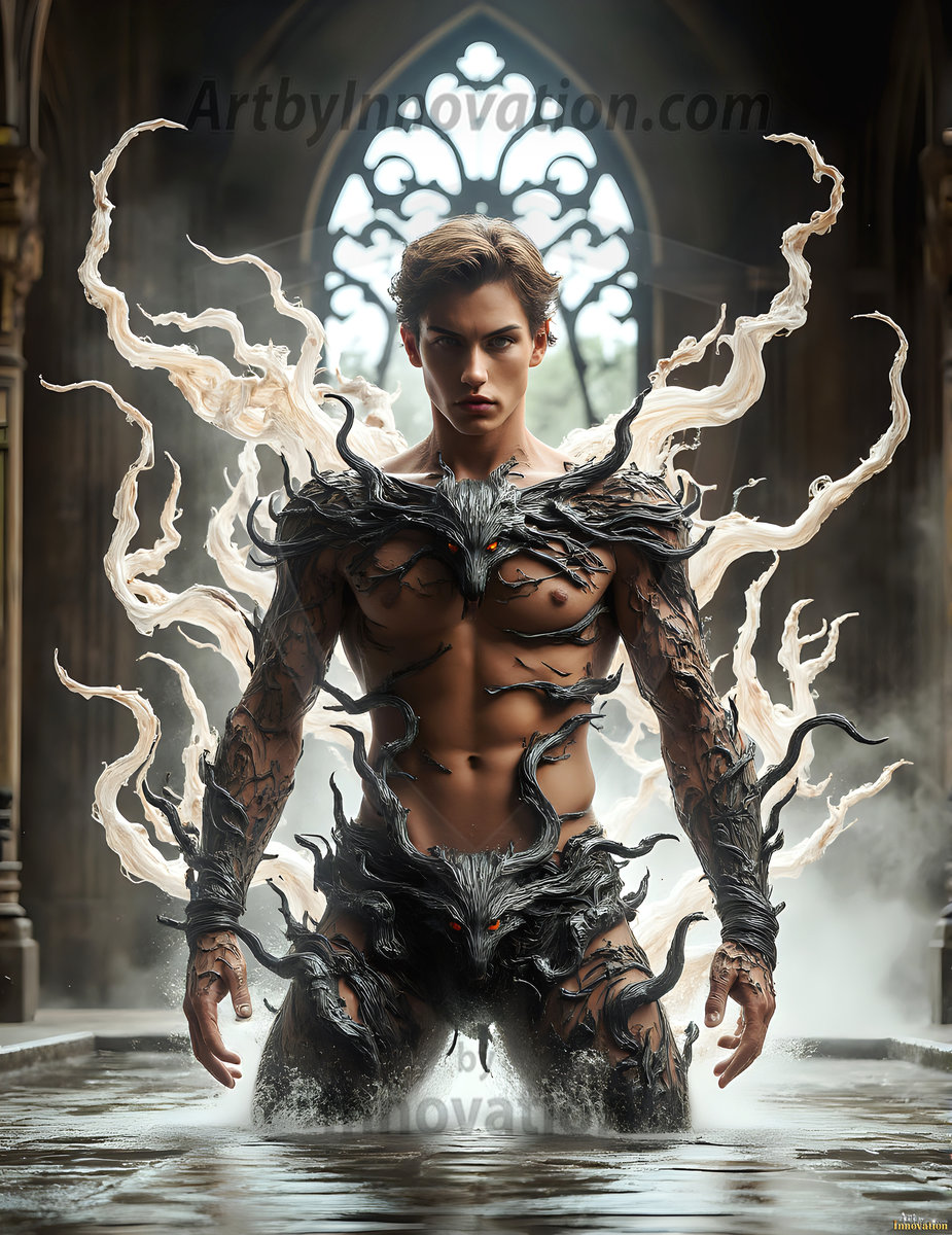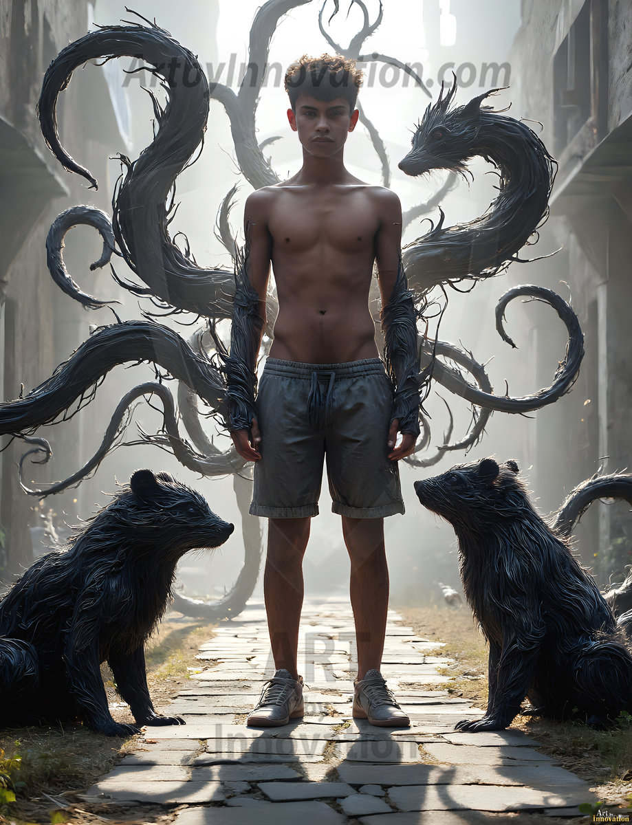 AI male art photos with a fantastical atmosphere. Imagine a Hogwarts School of Witchcraft student, from the Harry Potter series, a handsome, beautiful, and attractive, shirtless young teenage boy, standing firm against a threat. With a detailed Hogwarts castle background, casting a powerful spell, conjuring creatures based on their assigned house crest. From Demonic snakes, powerful lions, fierce badgers, or a murder of Crows. Dementors floating ominously in a cloudy sky, and sparks, shadows, and cinematic lighting, offering an otherworldly vibe.