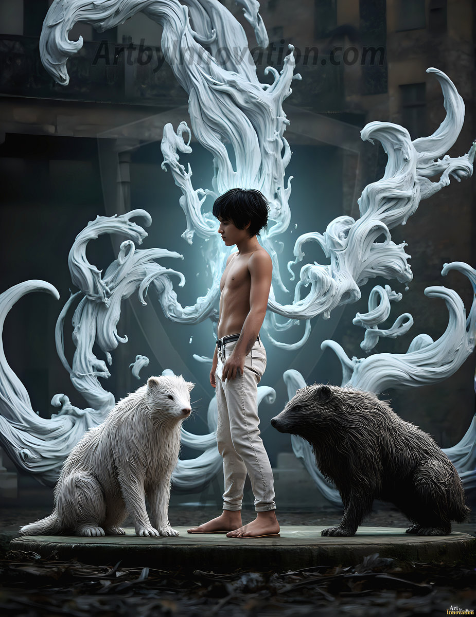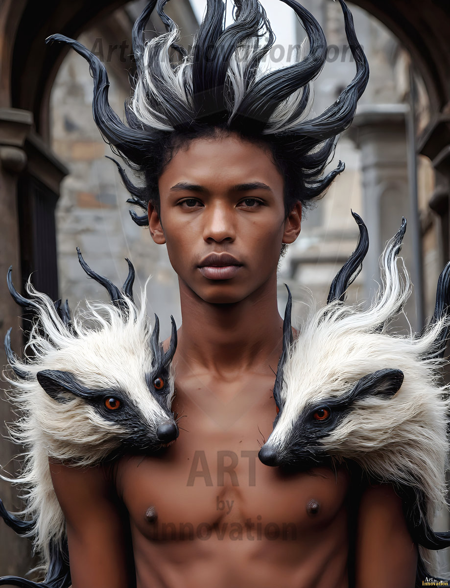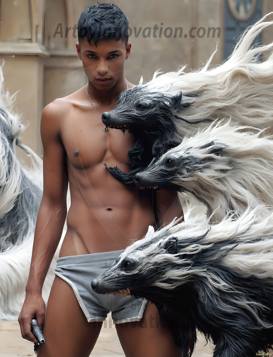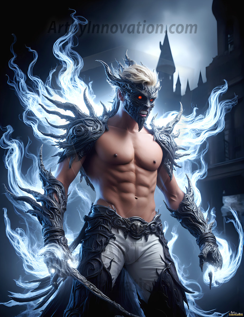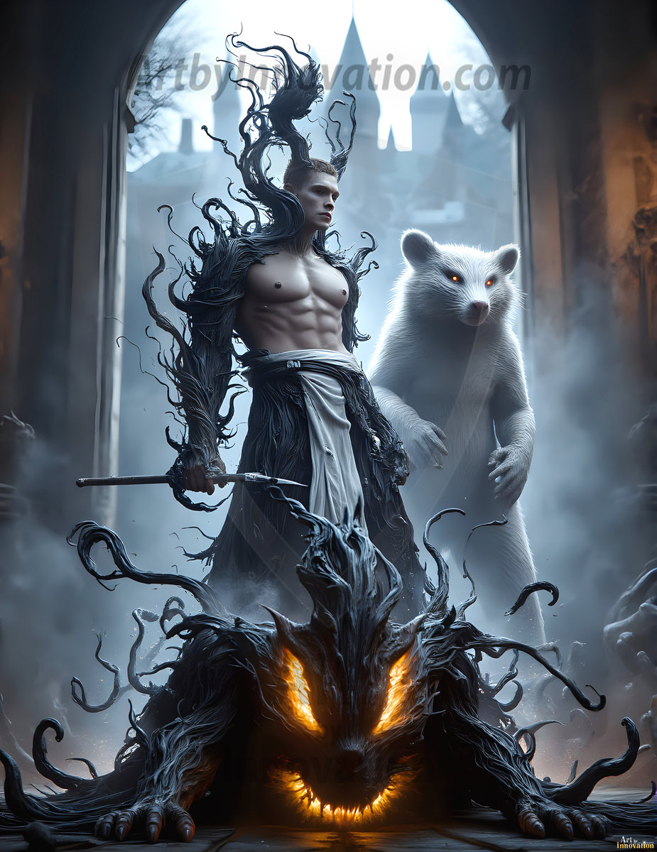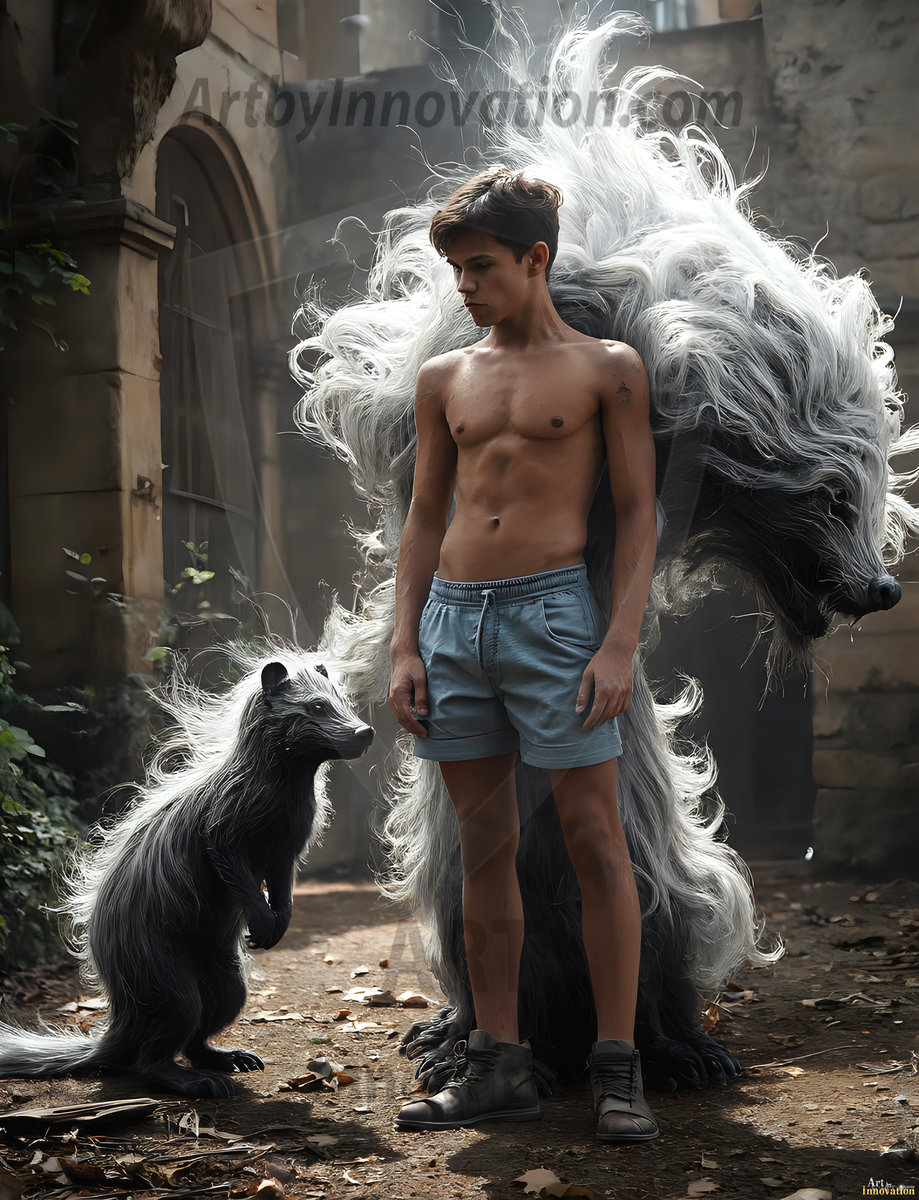 AI male art photos with a fantastical atmosphere. Imagine a Hogwarts School of Witchcraft student, from the Harry Potter series, a handsome, beautiful, and attractive, shirtless young teenage boy, standing firm against a threat. With a detailed Hogwarts castle background, casting a powerful spell, conjuring creatures based on their assigned house crest. From Demonic snakes, powerful lions, fierce badgers, or a murder of Crows. Dementors floating ominously in a cloudy sky, and sparks, shadows, and cinematic lighting, offering an otherworldly vibe.